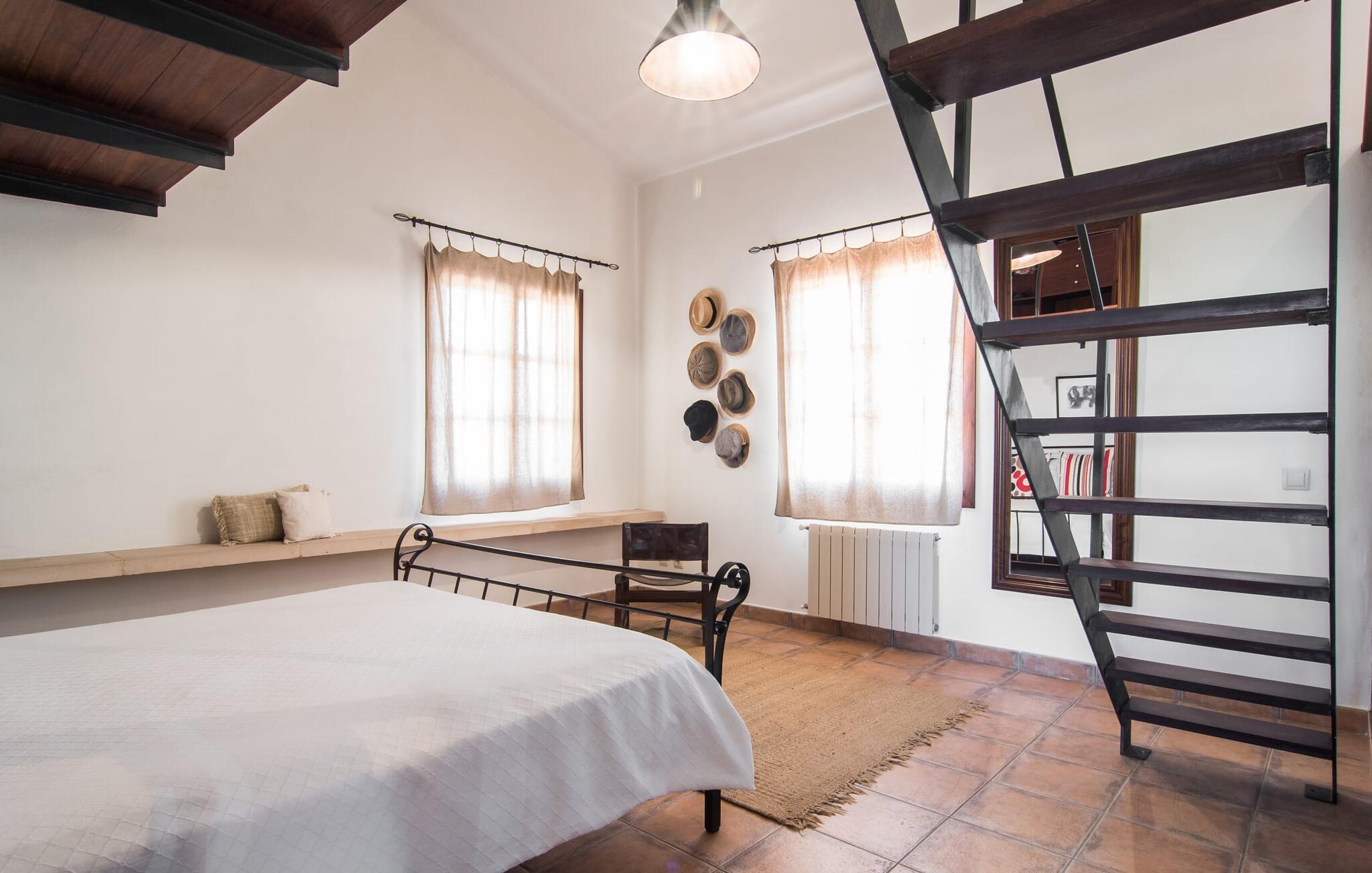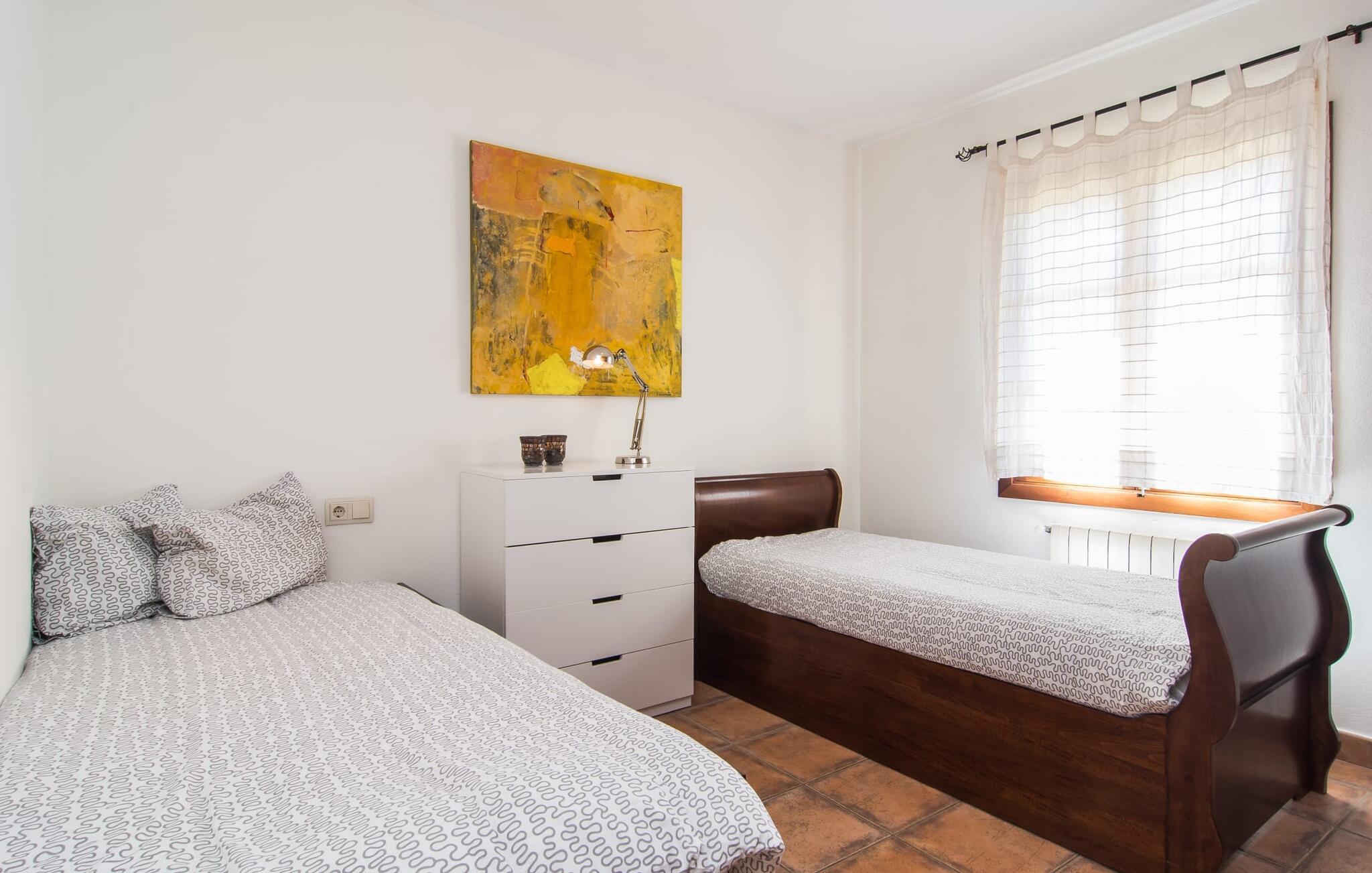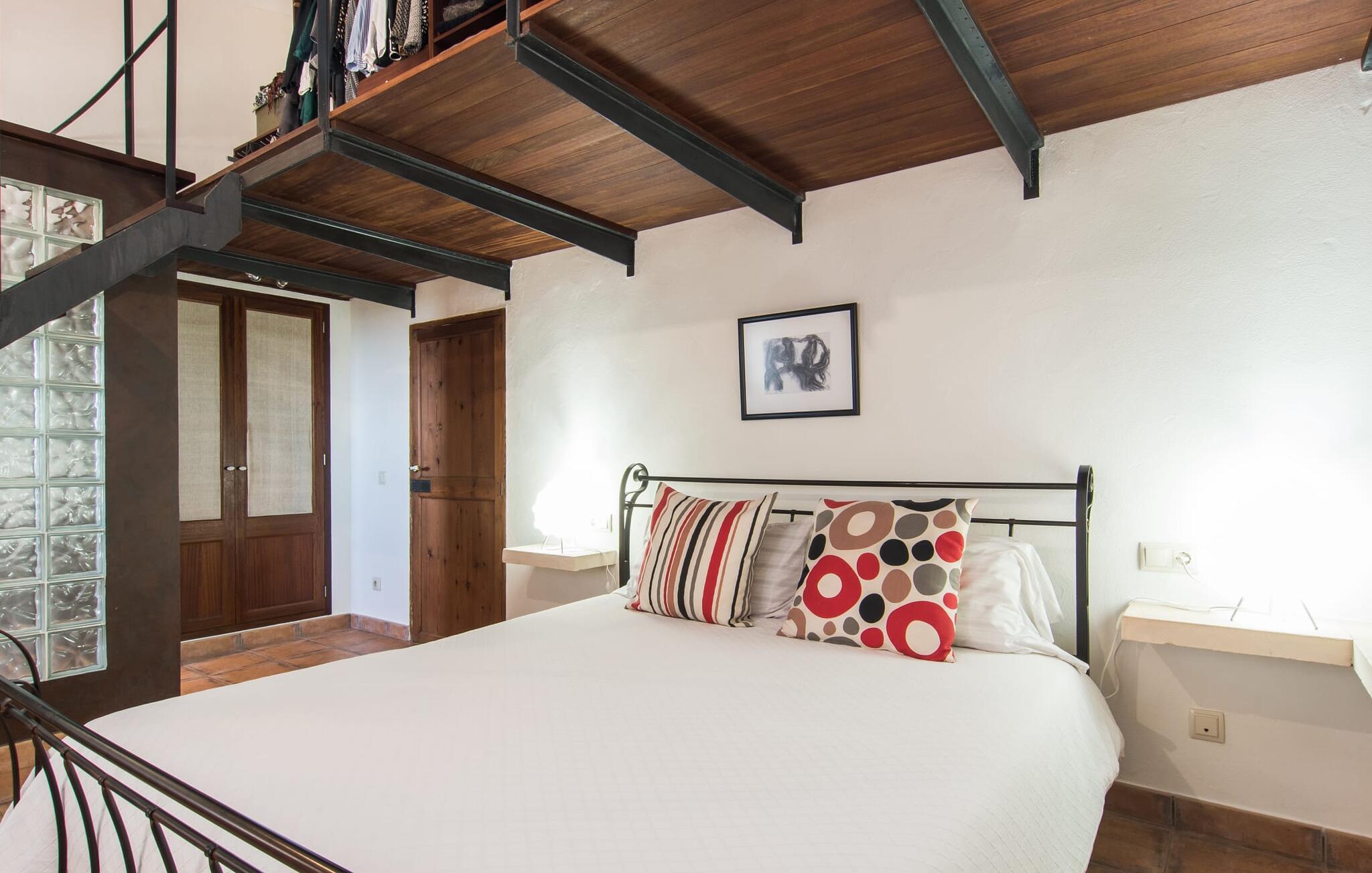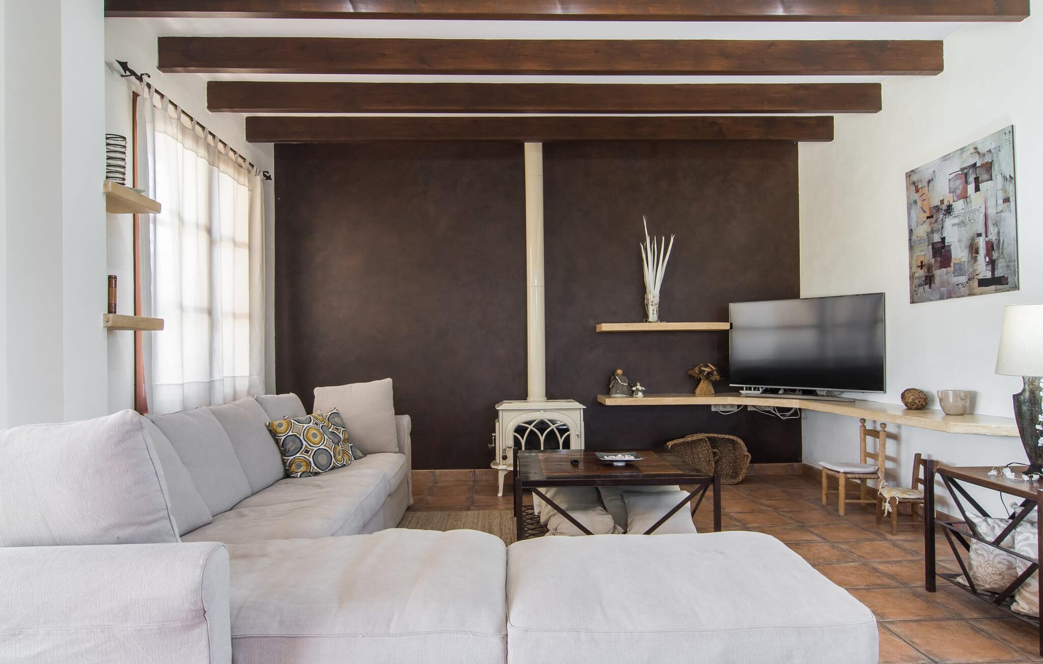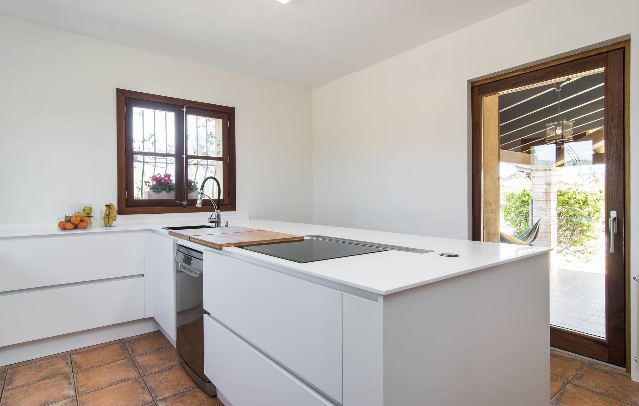 Kun en kort køretur fra Palma Lufthavn byder Finca "Es Triquet" jer velkommen gennem en automatisk port, der fører jer ned ad en asfalteret sti midt i frodige haver. Ejendommen tilbyder rigelig parkering, herunder en garage med to pladser. Omgivet af natur omfatter udendørsarealerne en swimmingpool opdelt i to områder, ideel til børn, og skyggefulde steder under et knudret johannesbrødtræ. Villaen imponerer med rustik mallorcansk arkitektur med møbler af høj kvalitet. Indenfor forbinder en stor trappe to niveauer og fører til et opholdsområde med pejs, en rummelig spisestue og et fuldt udstyret køkken. Fire komfortable soveværelser kan rumme op til otte gæster og har charmerende badeværelser. Fra det øverste niveau er der udgang til en solterrasse med en vidunderlig udsigt over Tramuntana-bjergene. Den nybyggede stenvilla "Es Triquet" er beliggende nær byen Binissalem på Pla de Mallorca. Denne landlige, smukke region er fuld af vinmarker, appelsin- og mandeltræer. I kan tage til Binissalem for at shoppe til daglige behov. Der er et ugentligt marked med regionale produkter om fredagen. Takket være dens centrale beliggenhed, tæt på en hørbar vej, kan I hurtigt nå hovedstaden Palma og strandene som Cuidad Jardin. El skal betales kontant på stedet. Bemærk venligst, at denne ejendom ikke accepterer ungdomsgrupper eller polterabender. En ungdomsgruppe på denne ejendom består af personer under 23 år. Book ikke denne ejendom, hvis I er en ungdomsgruppe eller polterabend, da jeres reservation vil blive afvist, når den er booket, hvilket kan være ved ankomsten til ejendommen eller under jeres ophold, og I vil ikke modtage en refusion.