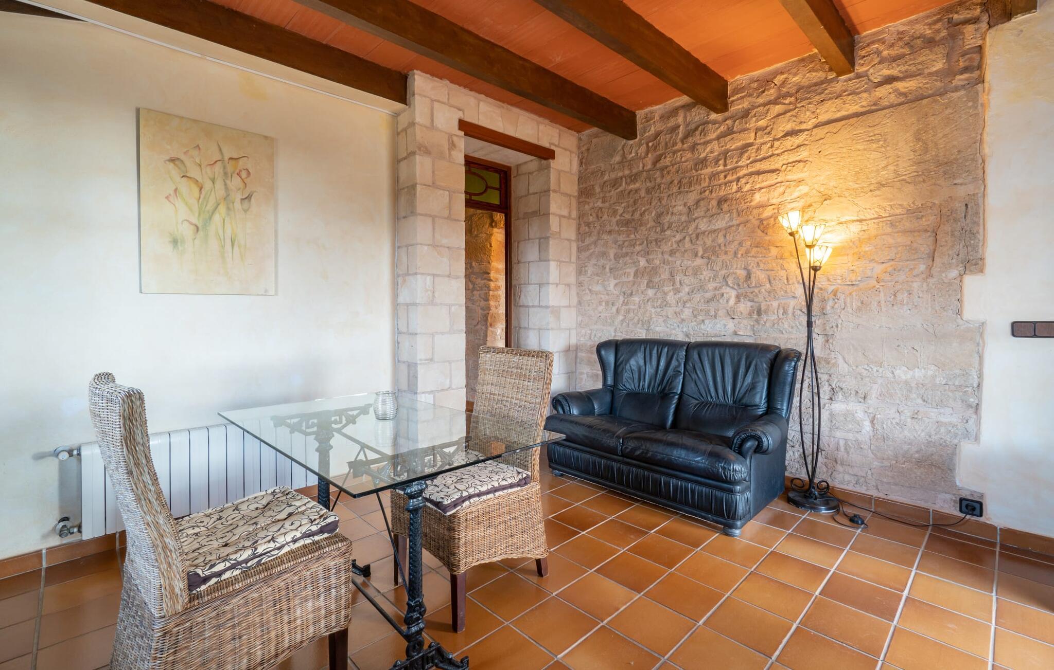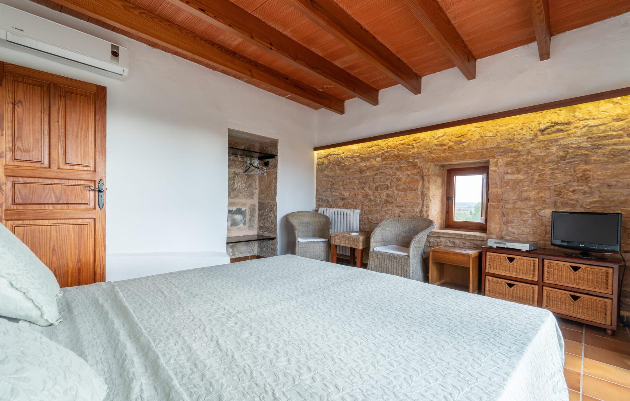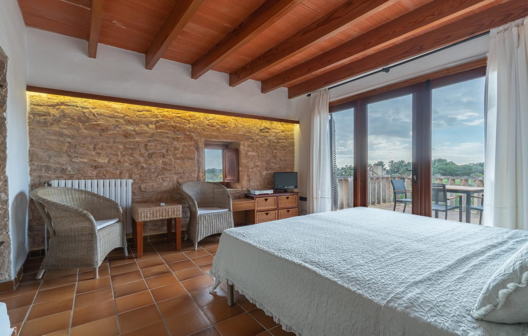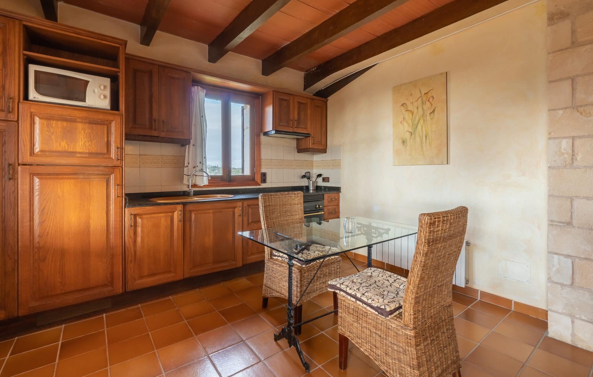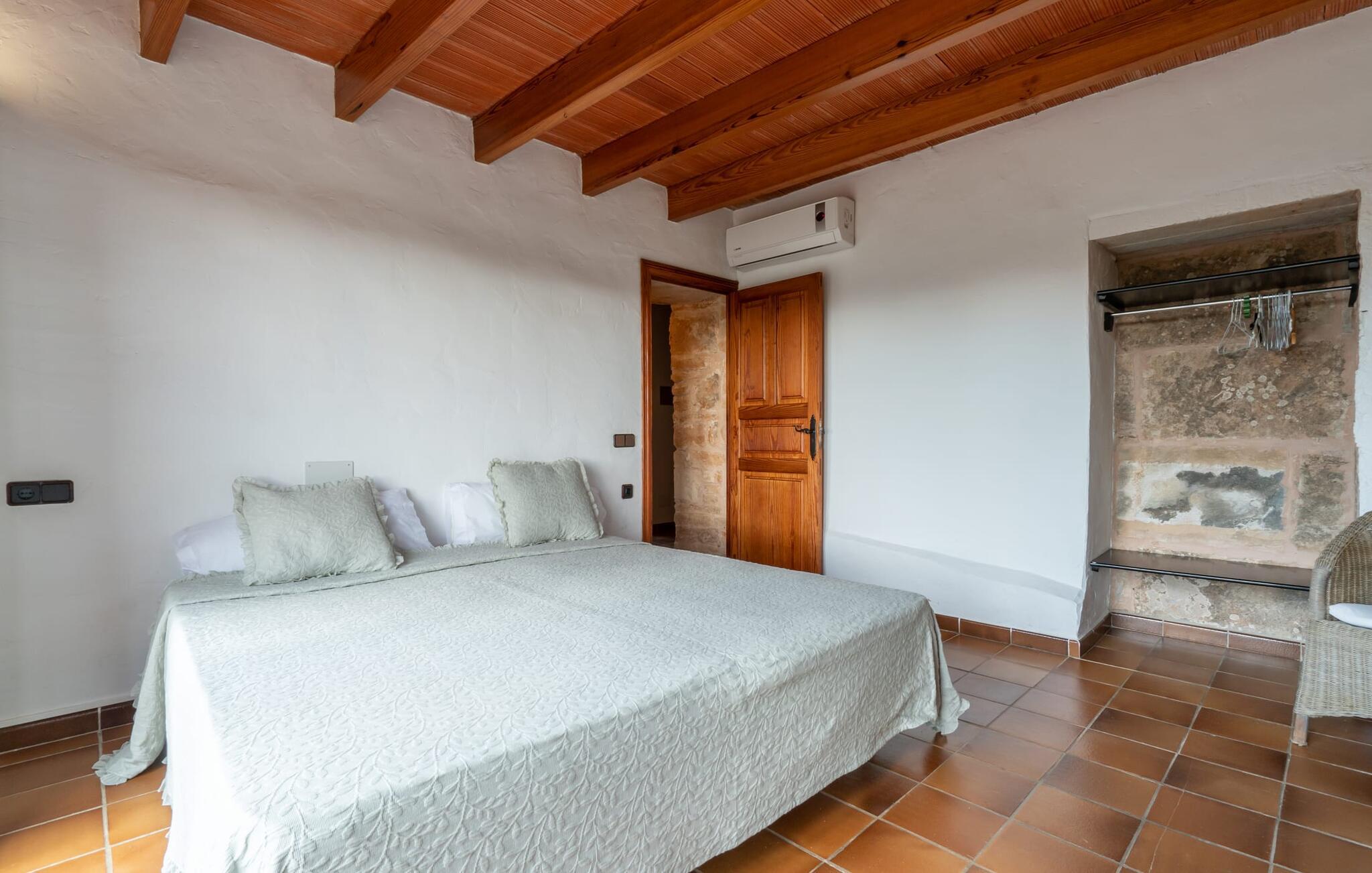Lejligheden på øverste etage imponerer med sit rustikke og hyggelige flair: lyse vægge, natursten, terracotta fliser, synlige bjælkelofter og træ skaber straks en autentisk ø-følelse. En venlig stue-spisestue med integreret køkken byder på alle mulige muligheder for et værdigt indendørs ophold og selvfølgelig også for selvforplejning på ferien. I kan slappe af i det meget hyggelige soveværelse, som er udstyret med en dobbeltseng (bestående af to enkeltmadrasser). Denne hyggelige ferierede er derfor ideel til en ferie for to. I direkte tilknytning til soveværelset ligger den skønne udsigtsterrasse. Badeværelset har naturligt lys og badekar. Meget behageligt: I kan nyde behagelige indendørstemperaturer året rundt takket være et varmt-koldt klimaanlæg. Vores konklusion: "Es Turo Formentera" har bestemt en portion original Mallorca ombord uden at ofre komforten.