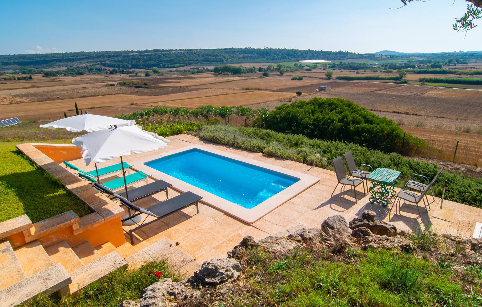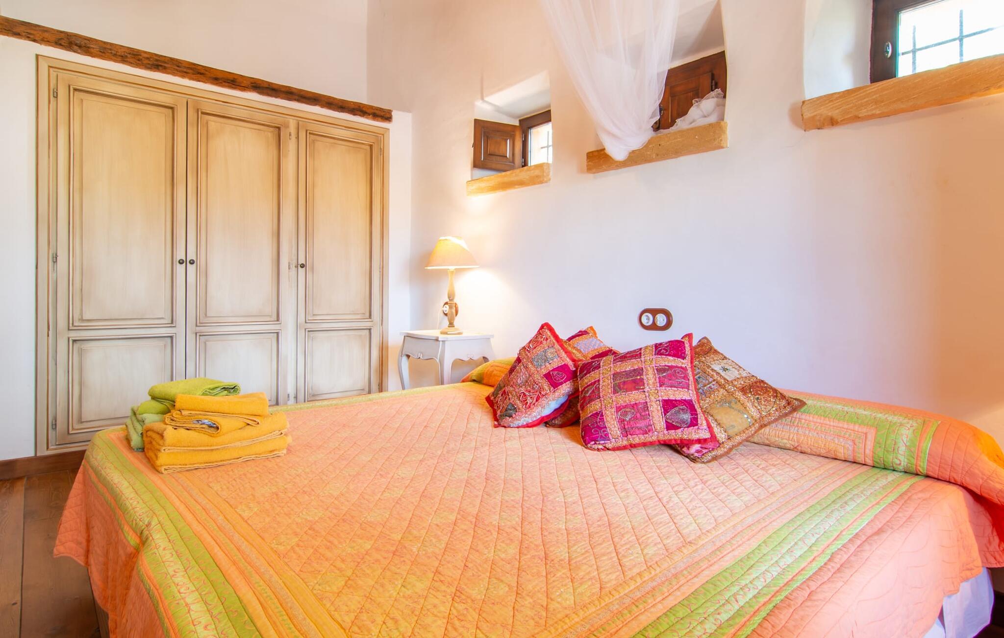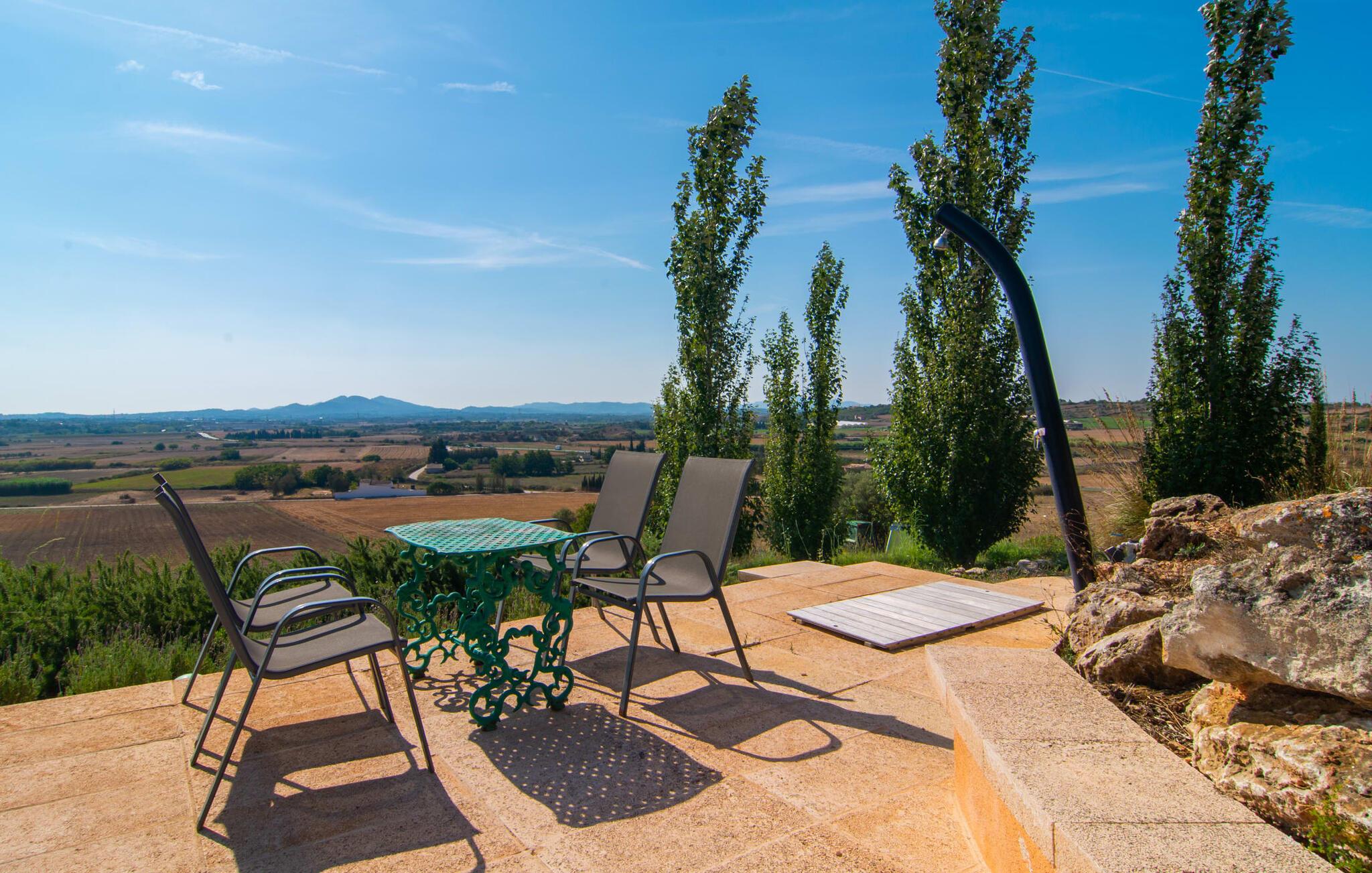 Lidt forhøjet ser "Es Turó" ud over de bølgende bakker i det smukke landskab i midten af øen. Et par trin fører ned fra den charmerende naturstensvilla til den lille poolterrasse. Mens I plasker rundt, solbader på liggestolene eller spiser morgenmad ved det lille bord - kan I til enhver tid nyde den uvurderlige udsigt i det fjerne. Omgivet af palmer og cypresser opstår automatisk den behagelige middelhavsatmosfære, som I ønsker på ferien. En anden fantastisk funktion er det rustikke udekøkken, omgivet af brosten og en smuk pergola. Med et par friske ingredienser fra det nærliggende marked, har I alle de kulinariske lækkerier, I har brug for. På den overdækkede terrasse - indrettet i indbydende grønne og lilla nuancer - kan I nyde en kølig drink på flet- eller gyngestole og den muntre blå sofa eller blot nyde de fredelige omgivelser. De små detaljer og den kærlige indretning gør villaens indretning ganske enkelt hyggelig. I den store, åbne stue/spisestue kan I finde jer godt tilpas på en af de blå lænestole eller krølle jer sammen på stenbænken ved vinduet med perfekt panoramaudsigt. En bog i hånden, musik i ørerne – hvad vil du? På koldere dage kan I tænde pejsen og nyde et festmåltid sammen ved det store shabby-chic stilbord. Bekvemt finder I det åbne, fuldt udstyrede køkken med ekstra siddepladser lige ved siden af. Huset rummer to flotte, stilfuldt indrettede dobbeltværelser og et badeværelse med bruser. Et lille højdepunkt for større børn: I et af soveværelserne er der også et lille galleri med en hyggelig madras. Petra, den søvnige landsby med sine gyldenbrune stenhuse på den ene side, Manacor med sit livlige ugentlige marked og den livlige gågade på den anden - der er helt sikkert masser af udflugtsmål i området. I kan tilbringe stranddage i en af de smukke naturlige bugter omkring 30 minutter væk, i livlige Porto Cristo eller i idylliske Sa Coma. Aktive feriegæster får også noget for pengene i dette område - cykel- og vandrestier så langt øjet rækker. Golfspillere vil sandsynligvis tage til La Reserva Rotana Golf Course, cirka 11 km væk. Godt at vide: Palma Lufthavn ligger omkring 45 minutter væk. Den charmerende villa "Es Turó" er beliggende i centrum af Mallorca, omkring 4 km sydøst for Petra. I vinbyen finder I flere hyggelige restauranter og barer samt supermarkeder. På grund af sin beliggenhed nær Ma-3320-vejen kan mange udflugtsmål let nås. Smukke naturlige bugter som Cala Varques eller Cala d'Es Serral er ca. 18 km væk og inviterer jer til at tilbringe lange dage på stranden. Hvis I leder efter lidt mere travlhed, finder I det hele i Porto Cristo eller Sa Coma.