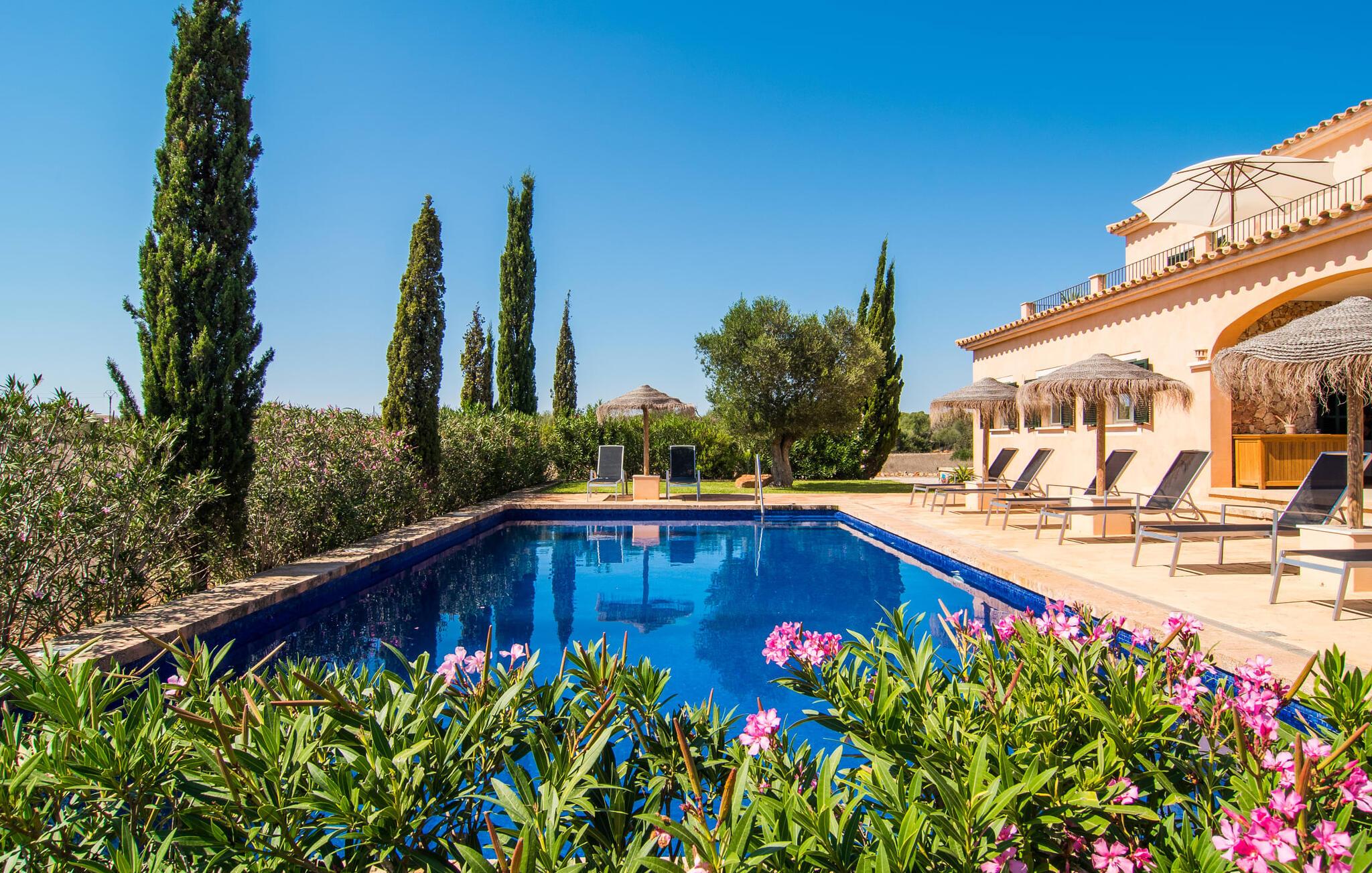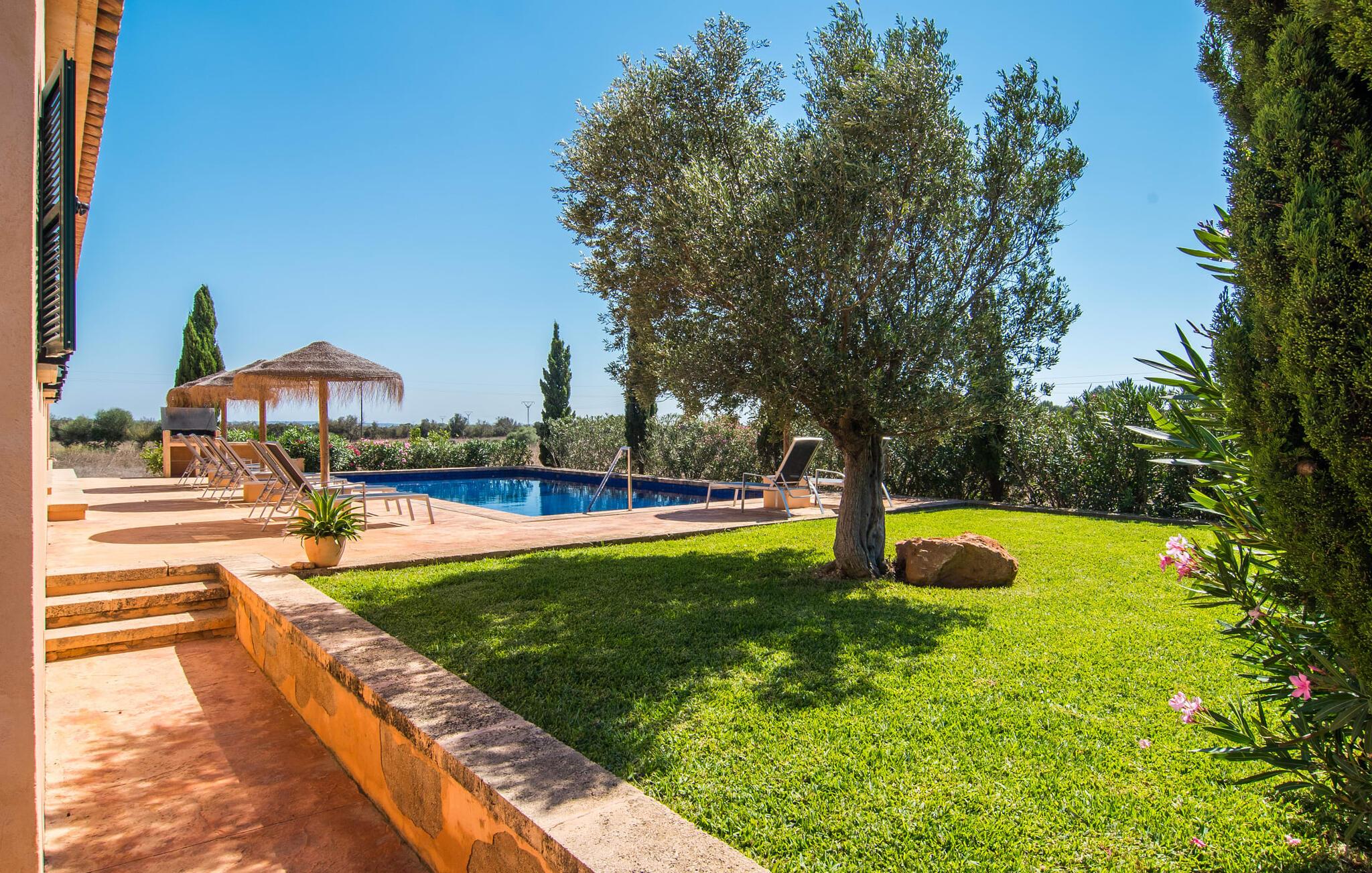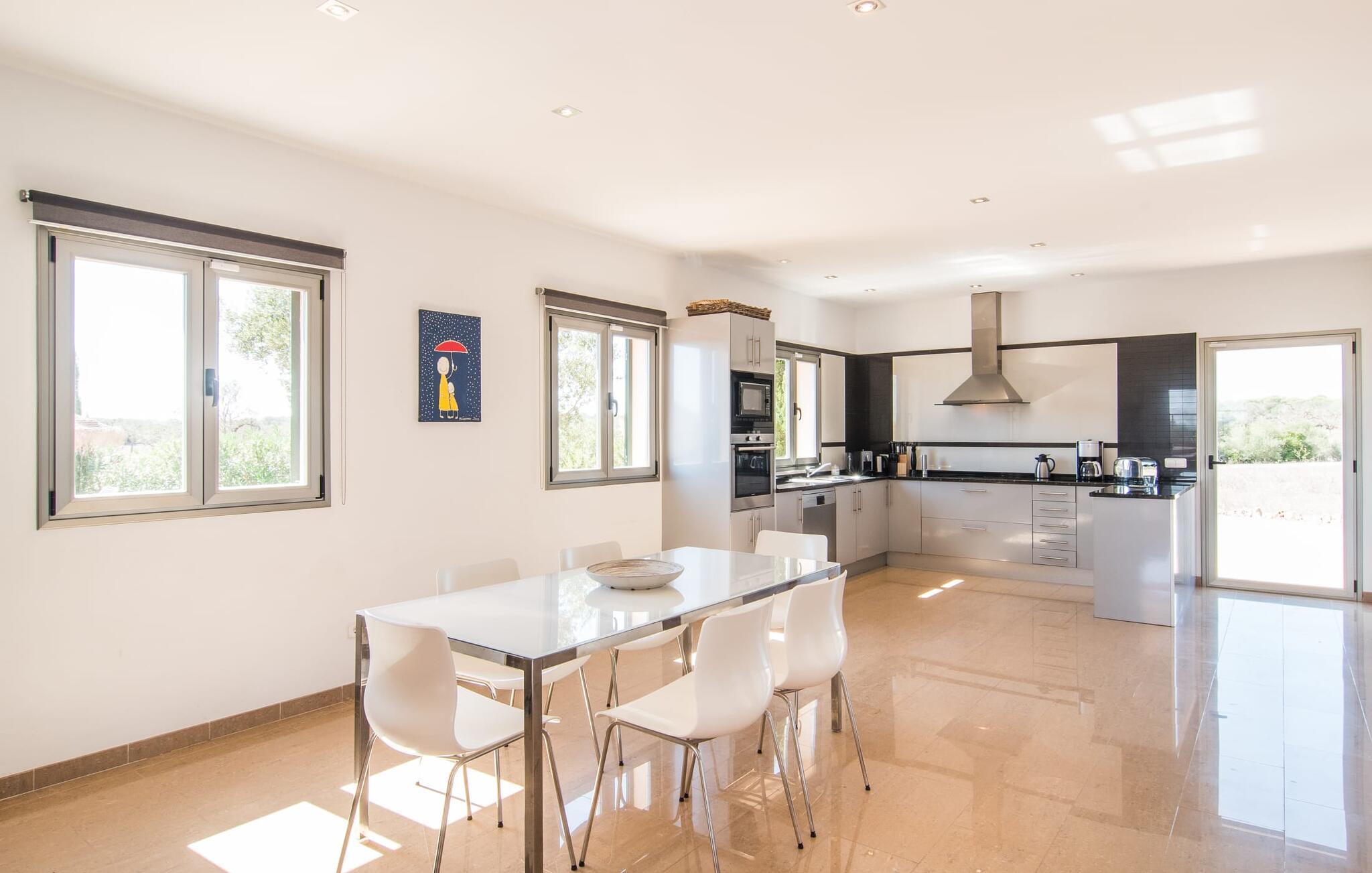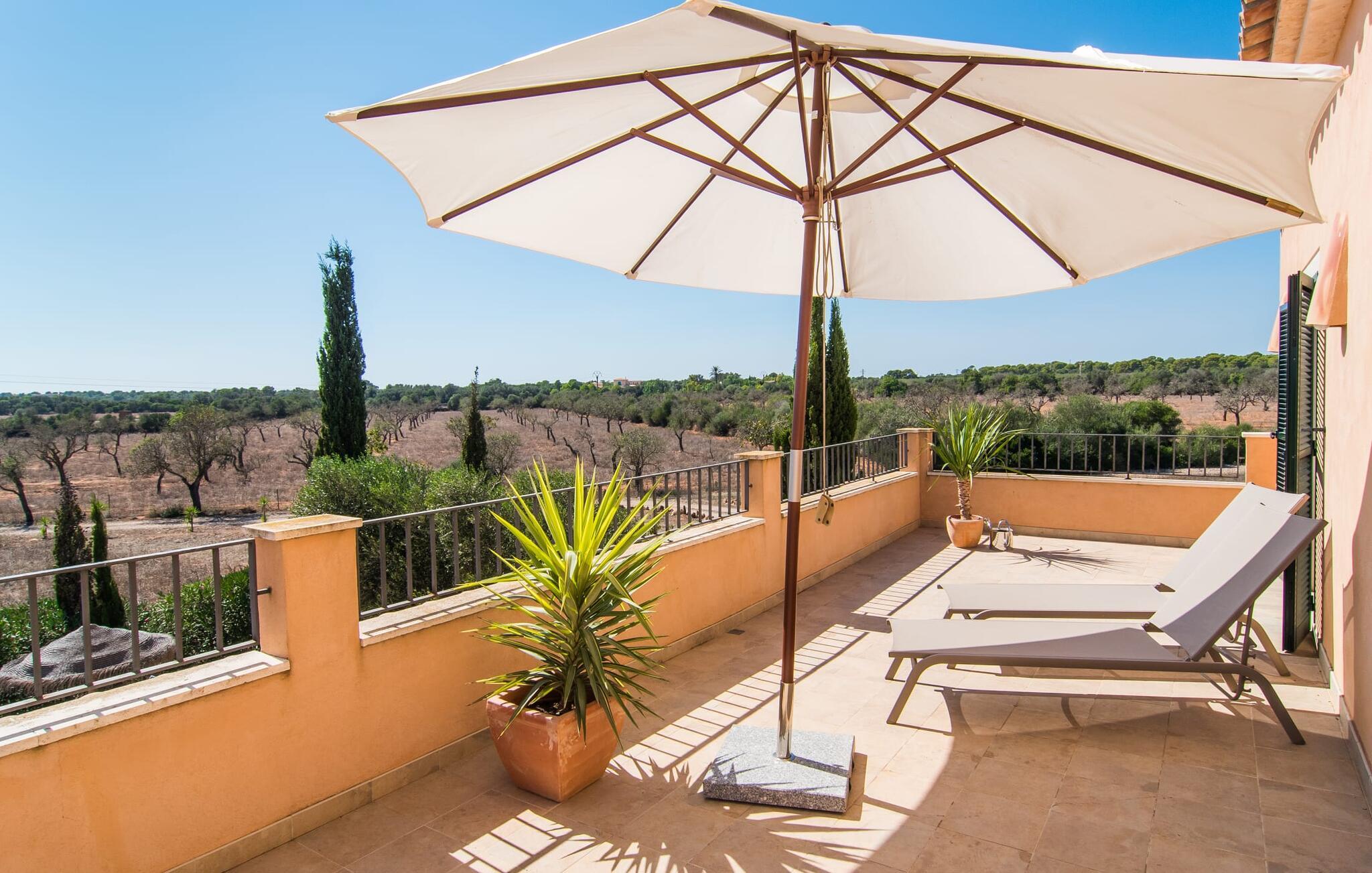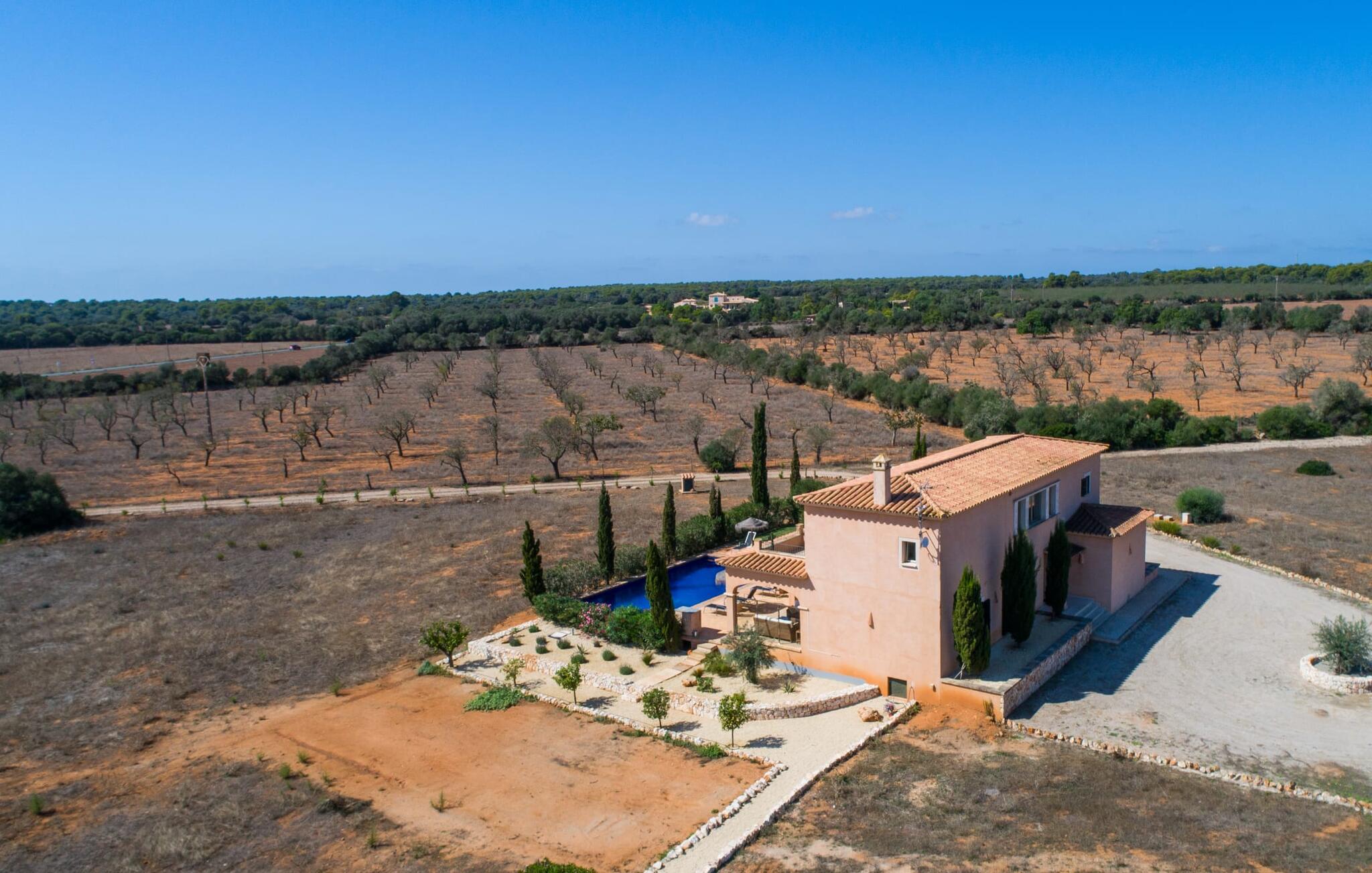 Den statelige "Es Vinyolet de Campos" er en af de få villaer, der ligger midt på marker i en stille blind vej. Cypresser og en lille stenhave omgiver huset. Landejendommene er så store, at kvarteret er nogenlunde spredt. Det betyder, at ingen kan se ud over hækken, mens I svømmer længder i jeres 12 m pool og slapper af under kokosparasollerne, mens I serverer jeres grillretter på den overdækkede terrasse eller forkæler jer selv med en espresso eller en mandelcroissant på de komfortable rattanmøbler. Den lange balkon løber udvendigt til soveværelserne på første sal, hvilket giver endnu mere privatliv, giver rigelig plads til liggestole og beroliger øjet med en klar udsigt over den oliventræbesatte slette. Her forvandler selv urbane neurotikere sig uventet til lidenskabelige campesinoer, der selv opdager den rolige, landlige region. De nye ejere har pudset det indre af villaen op og indrettet den med enestående smag og komfort: stilen er lys og minimalistisk, men har lyse farveaccenter på væggene, møblerne er elegante og komfortable, det store fladskærms-tv er et ægte blikfang, køkkenet er en skinnende verden for kokke med side-by-side køleskabe og high-end apparater. Loftslys sørger for, at de smukke lokaler bliver diskret oplyst overalt. Overetagen er udelukkende forbeholdt feriedrømme, og disse må kun være lyserøde: Alle fire dobbeltværelser (med senge på 1,80 eller 1,60 x 2 m) har eget badeværelse med bruseniche og direkte udgang til den solrige altan. Gulvvarme og aircondition bringer rummet til jeres personlige behagelige temperatur, hvilket gør villaen ideel til en pause både sommer og vinter. Oplev et overraskende anderledes Mallorca med Campos! I denne venlige by (med et historisk centrum) finder I alt, hvad I behøver til jeres feriehverdag, samt nogle specialiteter som sobrasada og pirisost, som vil berige villaens køkken. Hvis I tager en rundtur på ostefabrikken Formatges Burguera, kan I prøve mange quesos; Og I kan også forkæle jeres smagsløg på den udsøgte Moli de Vent, en vindmølle, der er blevet nænsomt restaureret og omdannet til en restaurant. Alt, hvad I mangler, kan helt sikkert findes i Llucmajor eller Palma - og I kan også kombinere jeres rejse med et besøg på en café eller en spadseretur gennem butikkerne. Med den nærliggende, lejlighedsvis hørbare MA-6014, kan den sydøstlige del af øen udforskes uden den store indsats: her finder I nogle af de bedste strande og ture til den nærliggende kunstnerby Cas Concos de Cavaller eller til saltpanderne i Ses Saltvand er umagen værd mere end én gang. Beliggende mellem Campos (8 km) og strandene mod syd, skiller den landlige skønhed "Es Vinyolet" sig ud fra det åbne landskab med sin 12 m lange pool badet i middelhavssolen. Den større by Llucmajor, 18 km fra Palma, er kendt for at have en af øens smukkeste markedspladser, og I kan nå Palmas gamle bydel på omkring 35 minutter. Havet ligger også kun et stenkast væk i bil; Es Trenc, Platja de Sa Ràpita og Ses Covetes anbefales især til afslappende timer på og i vandet.