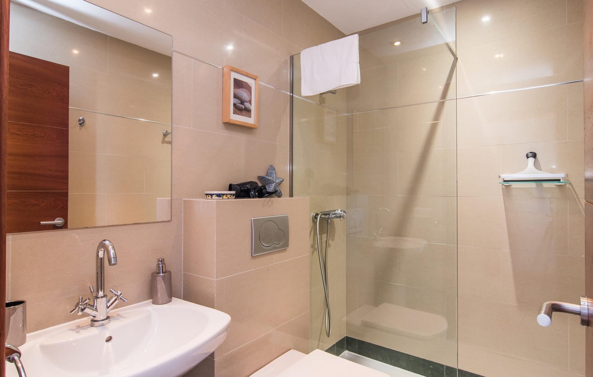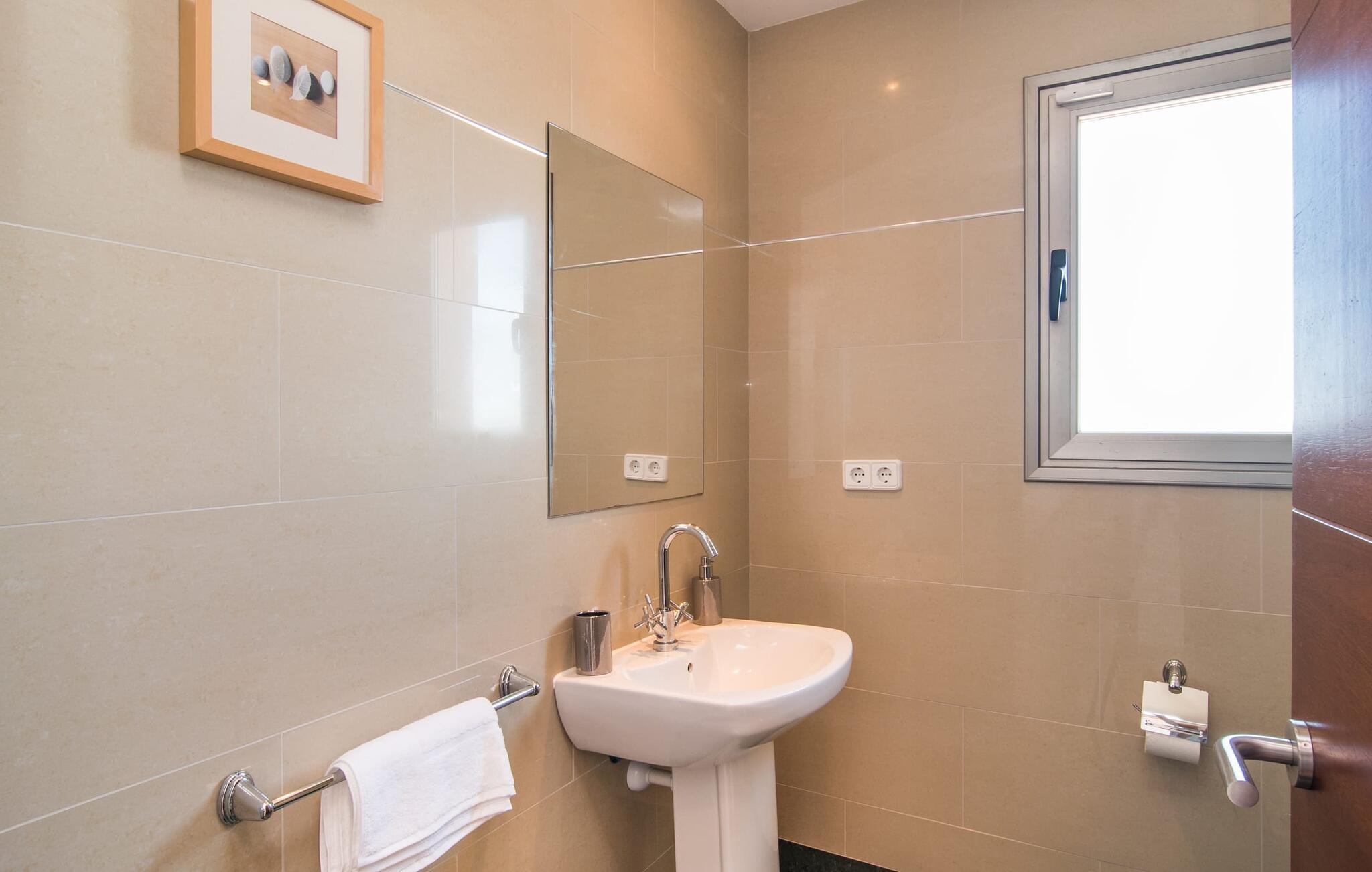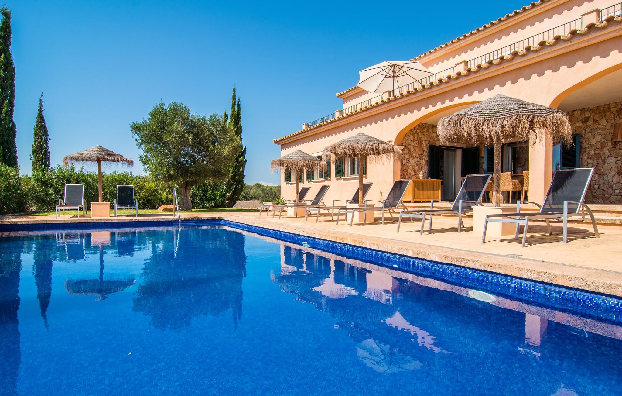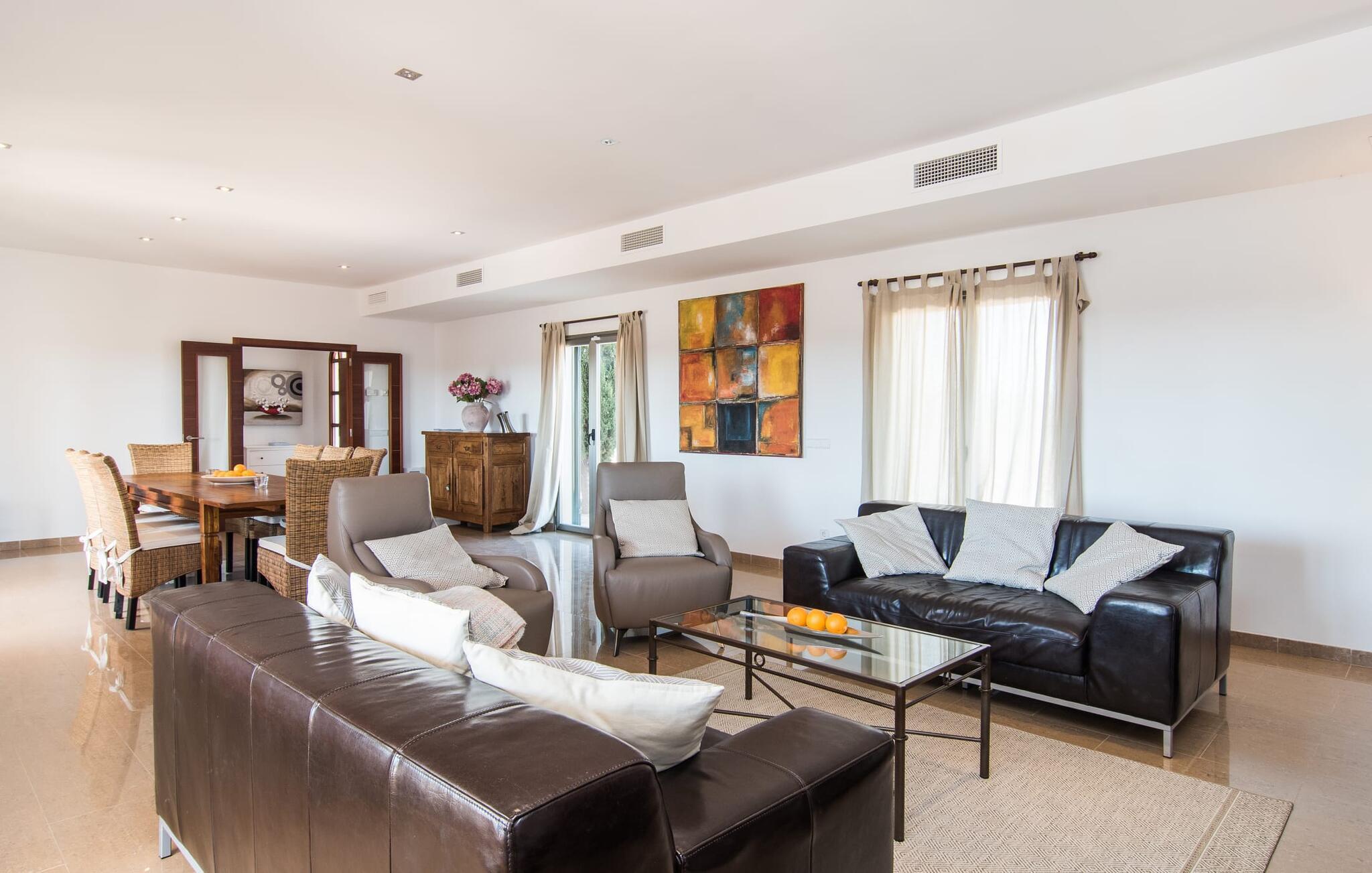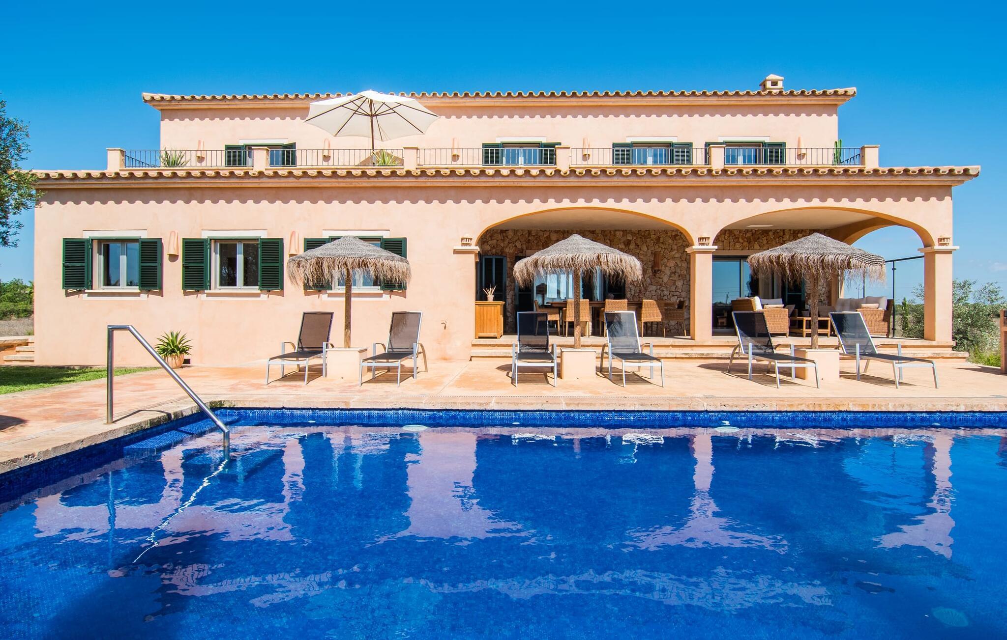 Den statelige "Es Vinyolet de Campos" er en af de få villaer, der ligger midt på marker i en stille blind vej. Cypresser og en lille stenhave omgiver huset. Landejendommene er så store, at kvarteret er nogenlunde spredt. Det betyder, at ingen kan se ud over hækken, mens I svømmer længder i jeres 12 m pool og slapper af under kokosparasollerne, mens I serverer jeres grillretter på den overdækkede terrasse eller forkæler jer selv med en espresso eller en mandelcroissant på de komfortable rattanmøbler. Den lange balkon løber udvendigt til soveværelserne på første sal, hvilket giver endnu mere privatliv, giver rigelig plads til liggestole og beroliger øjet med en klar udsigt over den oliventræbesatte slette. Her forvandler selv urbane neurotikere sig uventet til lidenskabelige campesinoer, der selv opdager den rolige, landlige region. De nye ejere har pudset det indre af villaen op og indrettet den med enestående smag og komfort: stilen er lys og minimalistisk, men har lyse farveaccenter på væggene, møblerne er elegante og komfortable, det store fladskærms-tv er et ægte blikfang, køkkenet er en skinnende verden for kokke med side-by-side køleskabe og high-end apparater. Loftslys sørger for, at de smukke lokaler bliver diskret oplyst overalt. Overetagen er udelukkende forbeholdt feriedrømme, og disse må kun være lyserøde: Alle fire dobbeltværelser (med senge på 1,80 eller 1,60 x 2 m) har eget badeværelse med bruseniche og direkte udgang til den solrige altan. Gulvvarme og aircondition bringer rummet til jeres personlige behagelige temperatur, hvilket gør villaen ideel til en pause både sommer og vinter. Oplev et overraskende anderledes Mallorca med Campos! I denne venlige by (med et historisk centrum) finder I alt, hvad I behøver til jeres feriehverdag, samt nogle specialiteter som sobrasada og pirisost, som vil berige villaens køkken. Hvis I tager en rundtur på ostefabrikken Formatges Burguera, kan I prøve mange quesos; Og I kan også forkæle jeres smagsløg på den udsøgte Moli de Vent, en vindmølle, der er blevet nænsomt restaureret og omdannet til en restaurant. Alt, hvad I mangler, kan helt sikkert findes i Llucmajor eller Palma - og I kan også kombinere jeres rejse med et besøg på en café eller en spadseretur gennem butikkerne. Med den nærliggende, lejlighedsvis hørbare MA-6014, kan den sydøstlige del af øen udforskes uden den store indsats: her finder I nogle af de bedste strande og ture til den nærliggende kunstnerby Cas Concos de Cavaller eller til saltpanderne i Ses Saltvand er umagen værd mere end én gang. Beliggende mellem Campos (8 km) og strandene mod syd, skiller den landlige skønhed "Es Vinyolet" sig ud fra det åbne landskab med sin 12 m lange pool badet i middelhavssolen. Den større by Llucmajor, 18 km fra Palma, er kendt for at have en af øens smukkeste markedspladser, og I kan nå Palmas gamle bydel på omkring 35 minutter. Havet ligger også kun et stenkast væk i bil; Es Trenc, Platja de Sa Ràpita og Ses Covetes anbefales især til afslappende timer på og i vandet.