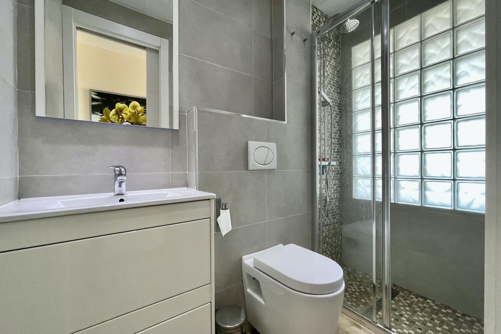 Denne moderne lejlighed ved stranden i Estartit tilbyder et behageligt ophold med to velindrettede soveværelser, der kan rumme op til fem gæster. Det smagfuldt indrettede rum på 55 m² har en hyggelig indretning, ideel til familier eller små grupper. Gæsterne kan nyde en afslappende søvn i de komfortable senge, og selvom kæledyr ikke er tilladt, sikrer indkvarteringen et afslappende miljø med aircondition og gratis Wi-Fi. Lejligheden har en privat 9 m² stor terrasse med udendørsmøbler, perfekt til at slappe af med en fantastisk udsigt over vandet. En elevator giver nem adgang, og der er udendørs parkering på stedet i bygningen. Der er også vaskemaskine og strygejern for ekstra bekvemmelighed. Beliggende kun 25 m fra sandstranden, tilbyder lejligheden direkte adgang til kysten, hvilket gør det til et perfekt sted for strandelskere. Byens centrum, som ligger 300 m væk, byder på charmerende butikker, caféer og restauranter, så gæsterne nemt kan udforske lokale smagsoplevelser og kultur. Et supermarked kun 200 m væk sikrer, at de daglige ting er inden for rækkevidde, mens golfentusiaster kan besøge Empordà Golf Club, 9 km fra ejendommen. Togstationen i Flaçà ligger 35 km derfra og tilbyder forbindelser til nærliggende byer, og Girona-Costa Brava Lufthavn ligger 55 km derfra, hvilket gør det nemt at rejse. Det åbne køkken har moderne apparater såsom køleskab, ovn, opvaskemaskine og essentielt køkkengrej til hjemmelavede måltider. Et velholdt toilet sikrer et behageligt ophold i dette afslappende kysttilflugtssted.