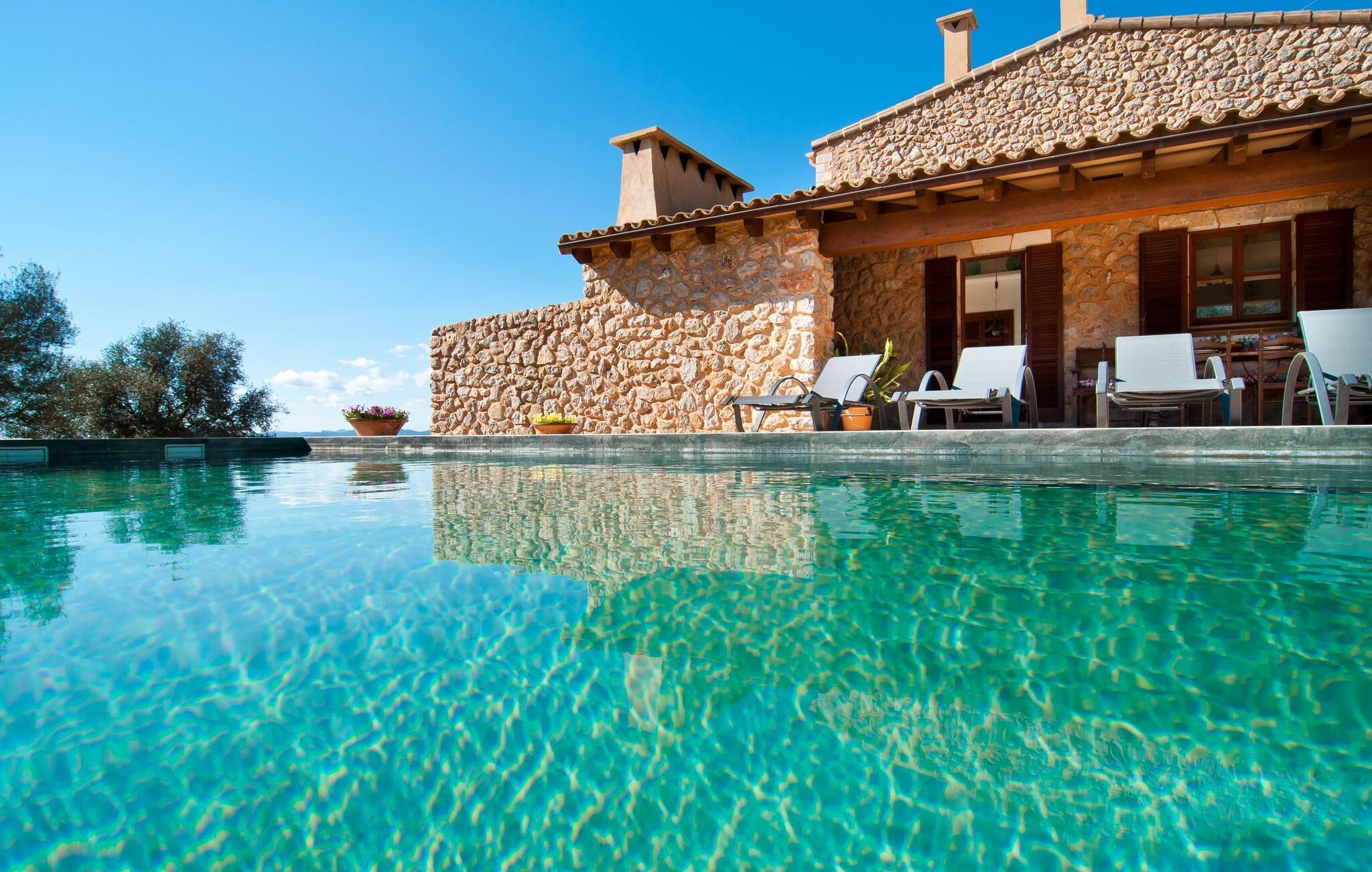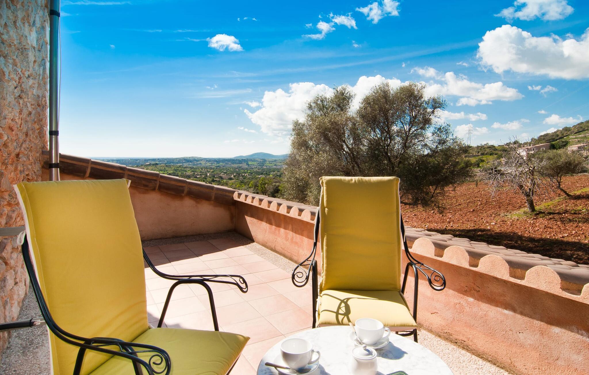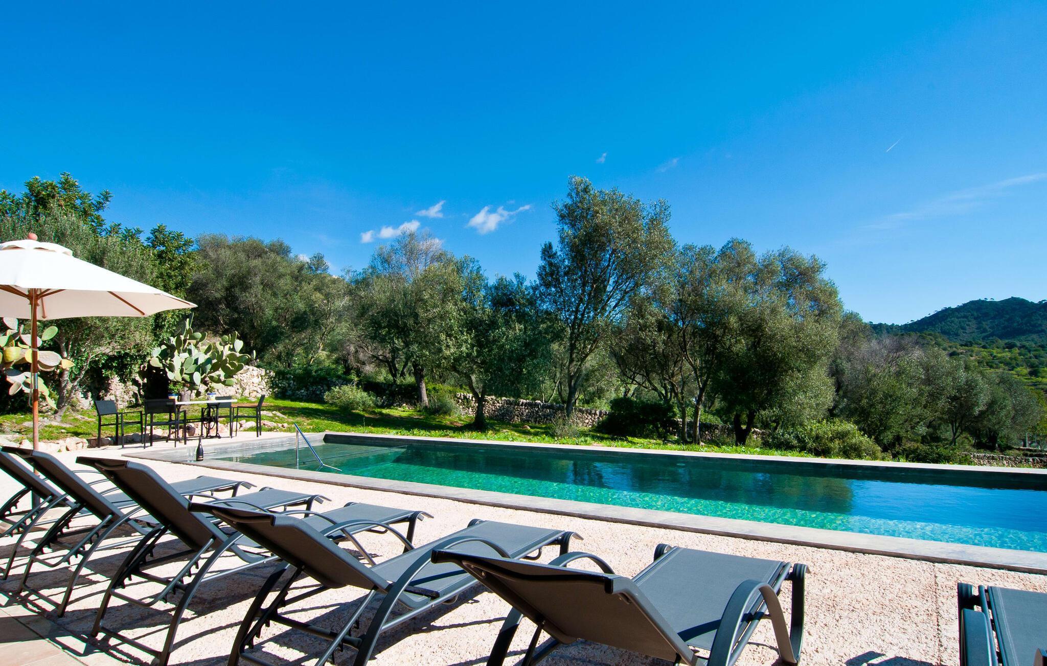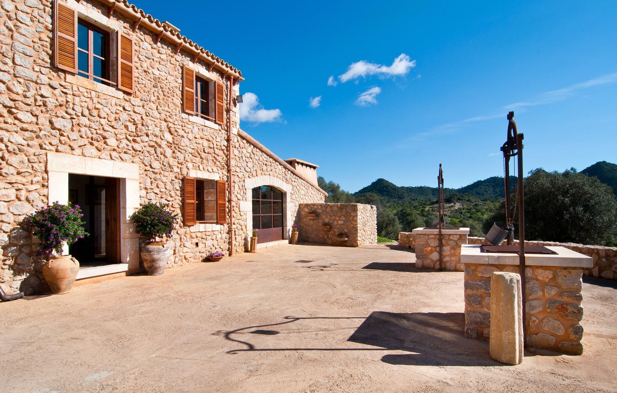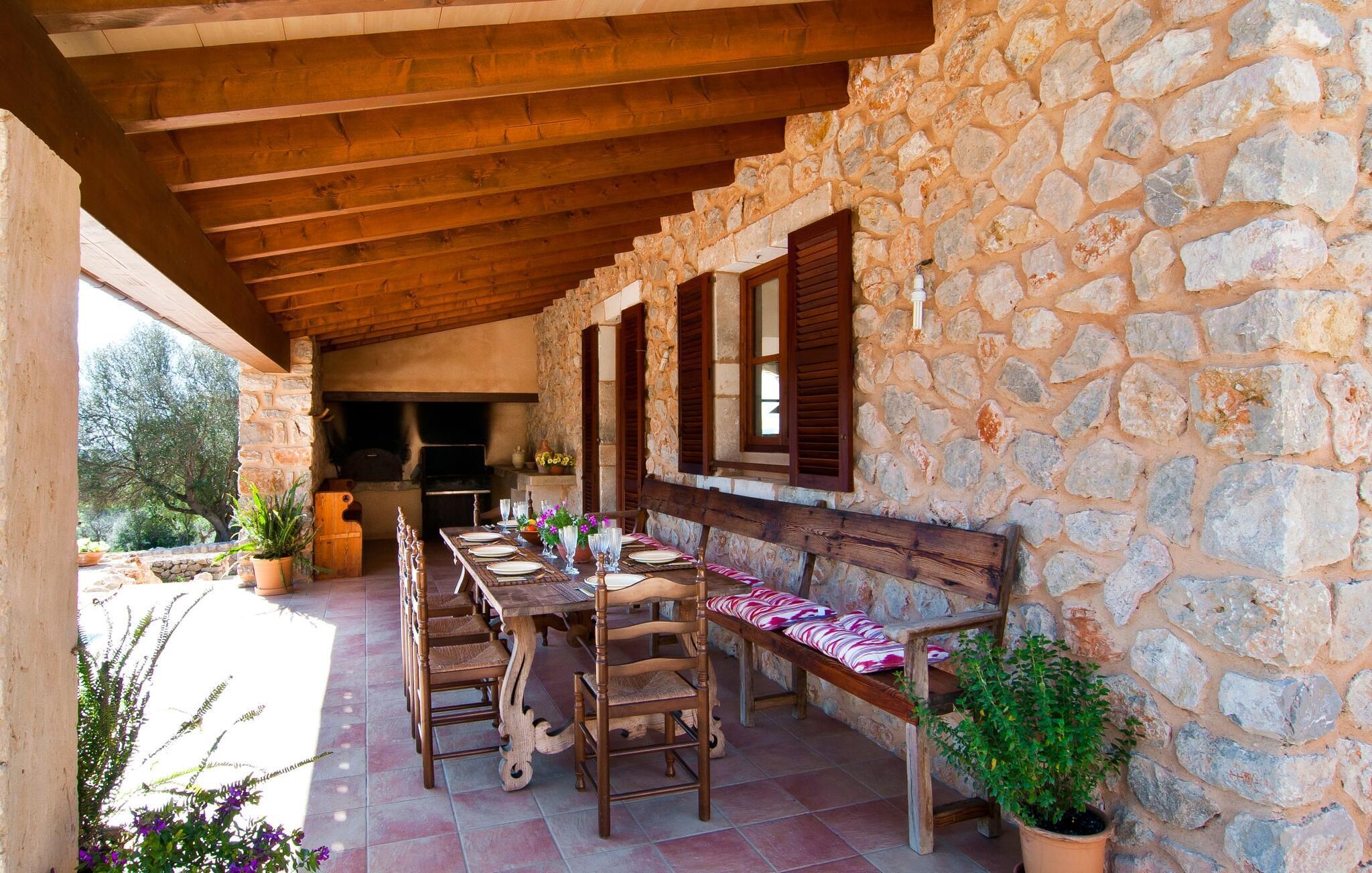 Så snart du træder ind i villaen "Esteparo", er husets typiske mallorcanske arkitektur - natursten, brede vægge, træskodder - behageligt mærkbar for den besøgende. Ejendommen har en enestående størrelse på 175.000 m², er delvist udformet som et dekorativt atrium og en smuk have og er smukt indlejret i de bakkede omgivelser. Indgangsfacaden og forpladsområdet byder gæster velkommen i en meget velholdt og smagfuld atmosfære. Det giver straks lyst til at gå ind og se på interiøret. Men lad os blive udenfor for nu, for her er meget at opdage. At gå med uret rundt om huset fører dig til det meget indbydende overdækkede terrasseområde, hvor du kan sidde i den blæsende skygge og nyde en smuk udsigt over poolen, den smukke grønne have og langt videre. Dette er det ideelle sted at hilse dagen velkommen med en forfriskende morgenmad om morgenen og lægge planer for den kommende spændende dag. Et nostalgisk, stort træbord med bænk og stole, kombineret med de imponerende træbjælker i loftet, giver dette område en helt særlig flair. Dette kan også fejres med fornøjelse om aftenen. Den permanente grill, der er installeret lige ved siden af, vil helt sikkert tjene dig godt og tilberede friske, regionale delikatesser. Du kan forfriske dig selv til dit hjertes lyst i den overdimensionerede pool. Poolen har en særdeles behagelig indgang og støder op til loungeterrassen, hvor du kan slappe af under middelhavshimlen. Bliver sollyset for stærkt, kan og bør en parasol bruges. Der er i alt 10 komfortable liggestole til din rådighed, og yderligere dejlige siddepladser venter nær poolindgangen.