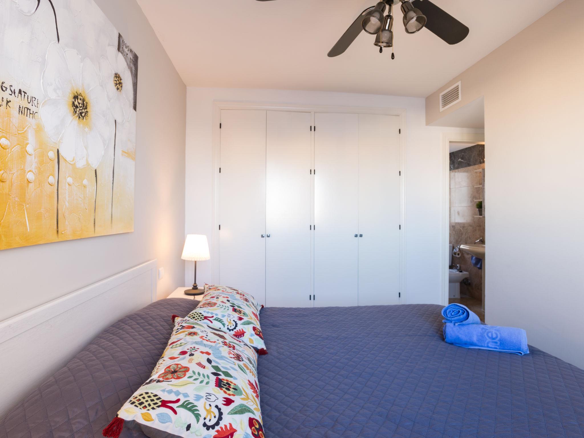 "Reina Sofia II", 3-room apartment 85 m2 on 4th floor, south-east facing position. Renovated, comfortable and tasteful furnishings: living/dining room with digital TV, air conditioning and forced-air heating. Exit to the terrace. 1 room with 1 french bed (150 cm, length 200 cm) (2 pers.), bath/WC. 1 room with 1 double bed (150 cm, length 200 cm). Kitchen (oven, dishwasher, 4 ceramic glass hob hotplates, toaster, kettle, freezer, electric coffee machine). Exit to the terrace. Shower/WC. Forced-air heating. Natural stone floors. Terrace 10 m2. Very beautiful view of the ocean and the city. Facilities: washing machine, children's high chair, baby cot for up to 2 year olds. Internet (WiFi, free). Garage space n 57. Please note: non-smokers only. The property is in a residential complex where you have to respect the rules of coexistence. No noise should be made after midnight. VUT/MA/13580 // Reg. Nr.: ESFCTU0000290360004831420000000000000000VUT/MA/135804
