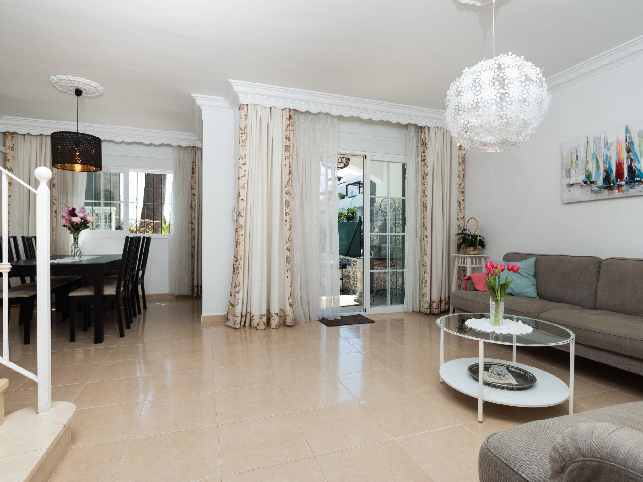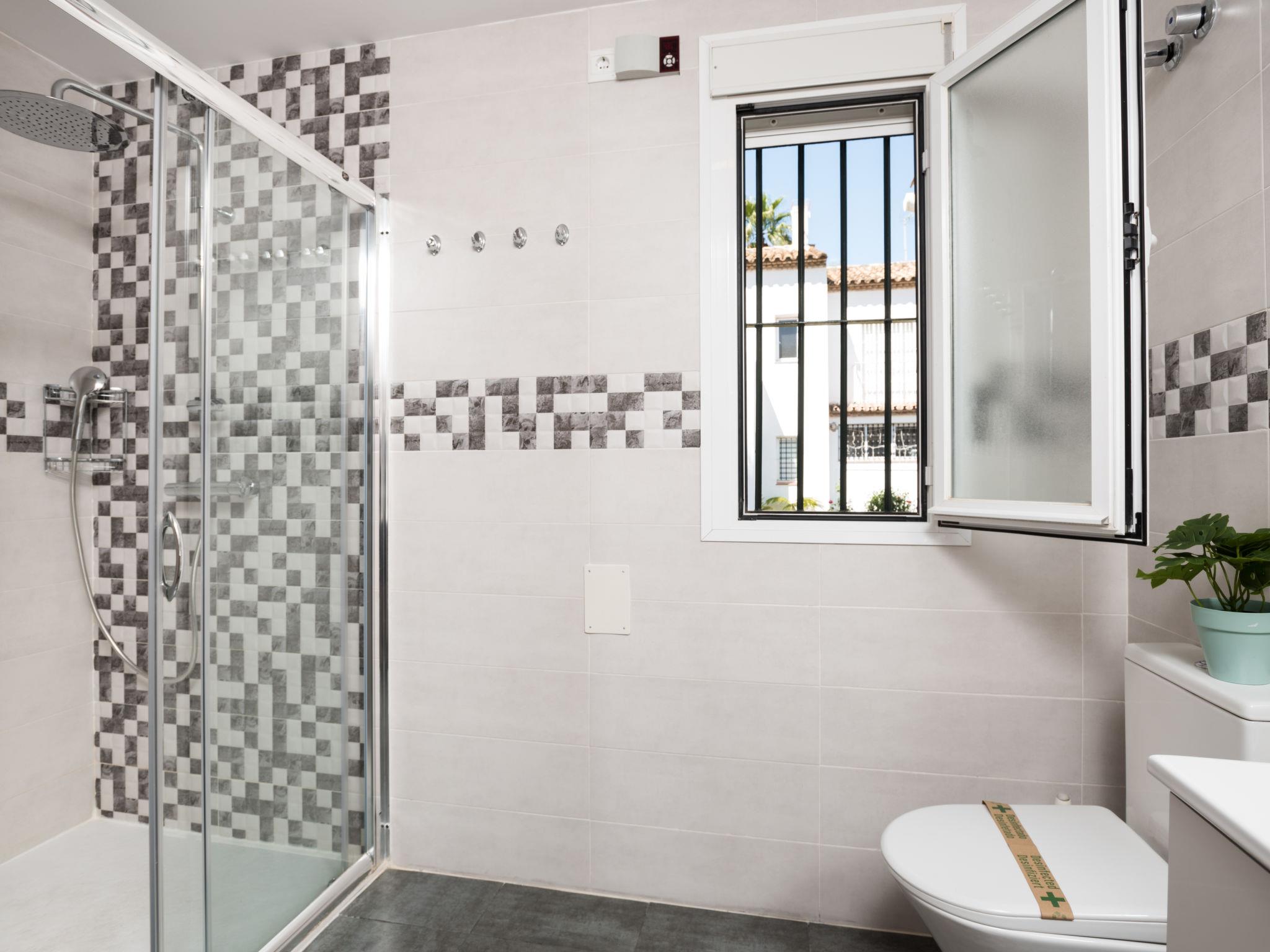 Beautiful, cosy terraced house "Villas de Madrid", 2 storeys. In the district of Bel Air 16 km from the centre of Marbella, 9 km from the centre of Puerto Banús, 10 km from the centre of Estepona, in a quiet, sunny position, 1.7 km from the sea, 1.7 km from the beach. For shared use: garden with lawn and flowers, swimming pool (seasonal availability: 01.Jun. - 15.Sep. pool opening hours: 11:00-21:00). Outdoor shower, public parking on the road. Supermarket, restaurant 650 m, bus stop "Flamingos Golf" 650 m, pebble beach 1.7 km. Golf course (18 hole) 500 m. Object suitable for 6 adults. The owner does not accept any groups. The owner does not accept any youth groups.