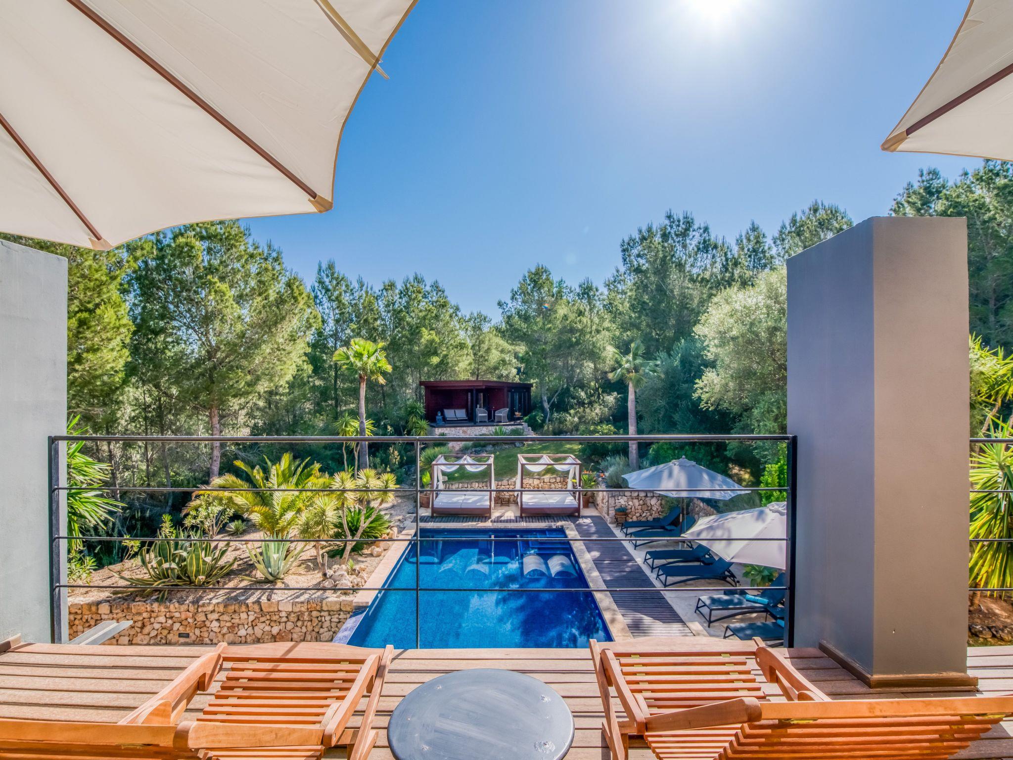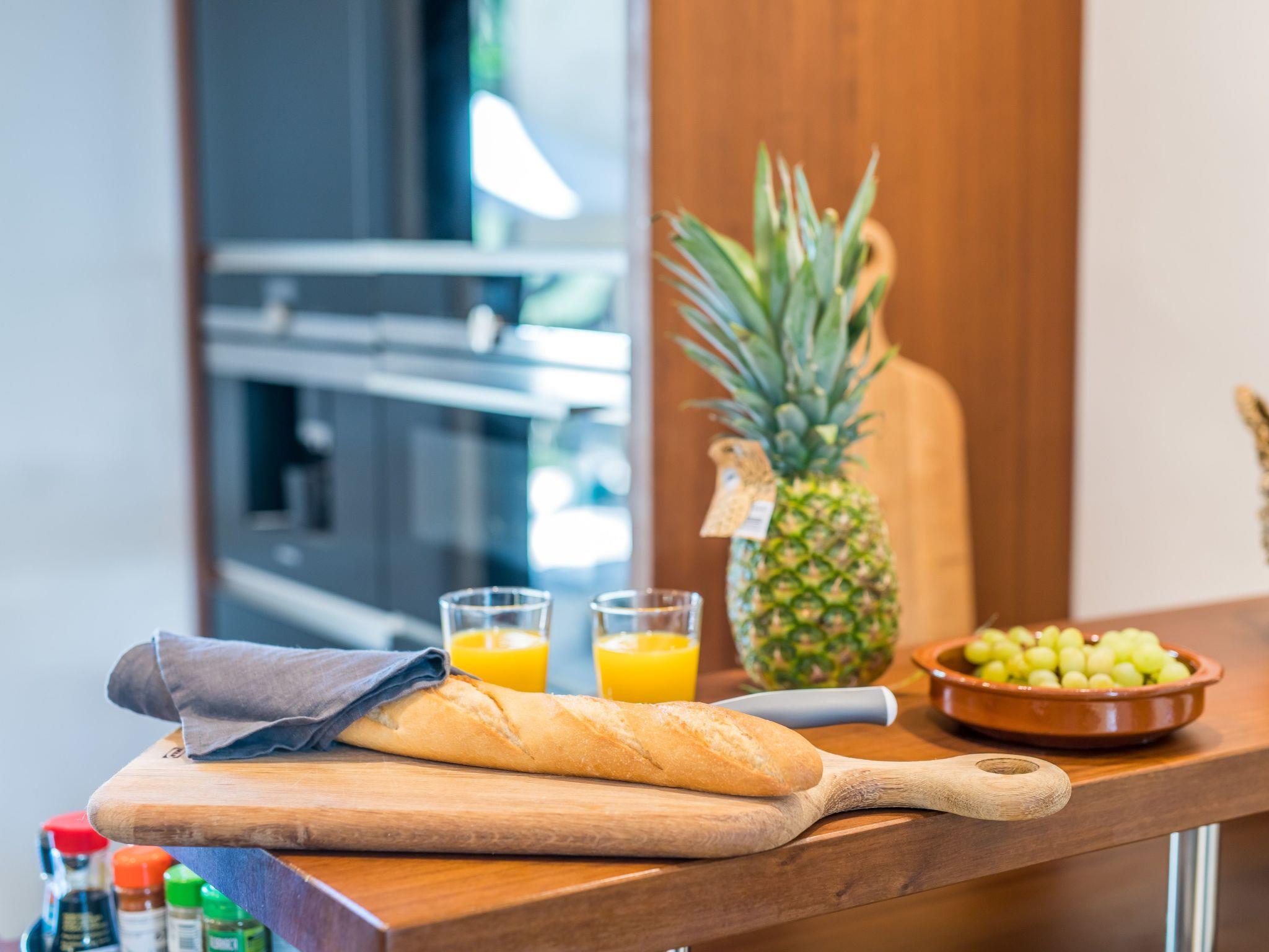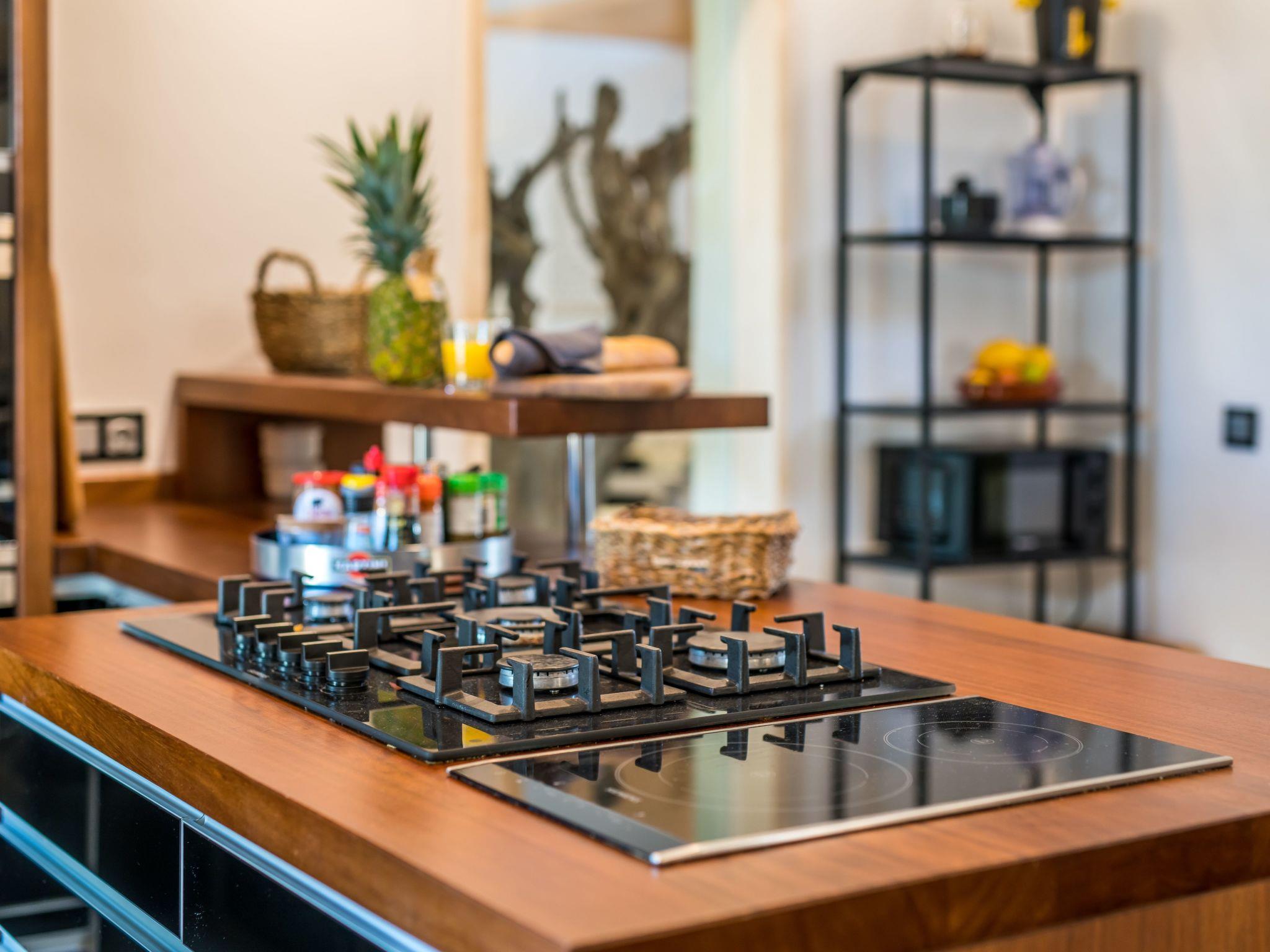 The furnishings match the modern style of the finca, the colour scheme is calm and the style is minimalist. A mixture of warm wood tones, large-format, light-coloured tiles - combined with glass and steel. Beautiful, unique pieces that we have found stand alongside design classics that are pleasing to the eye, calming and refreshing at the same time.