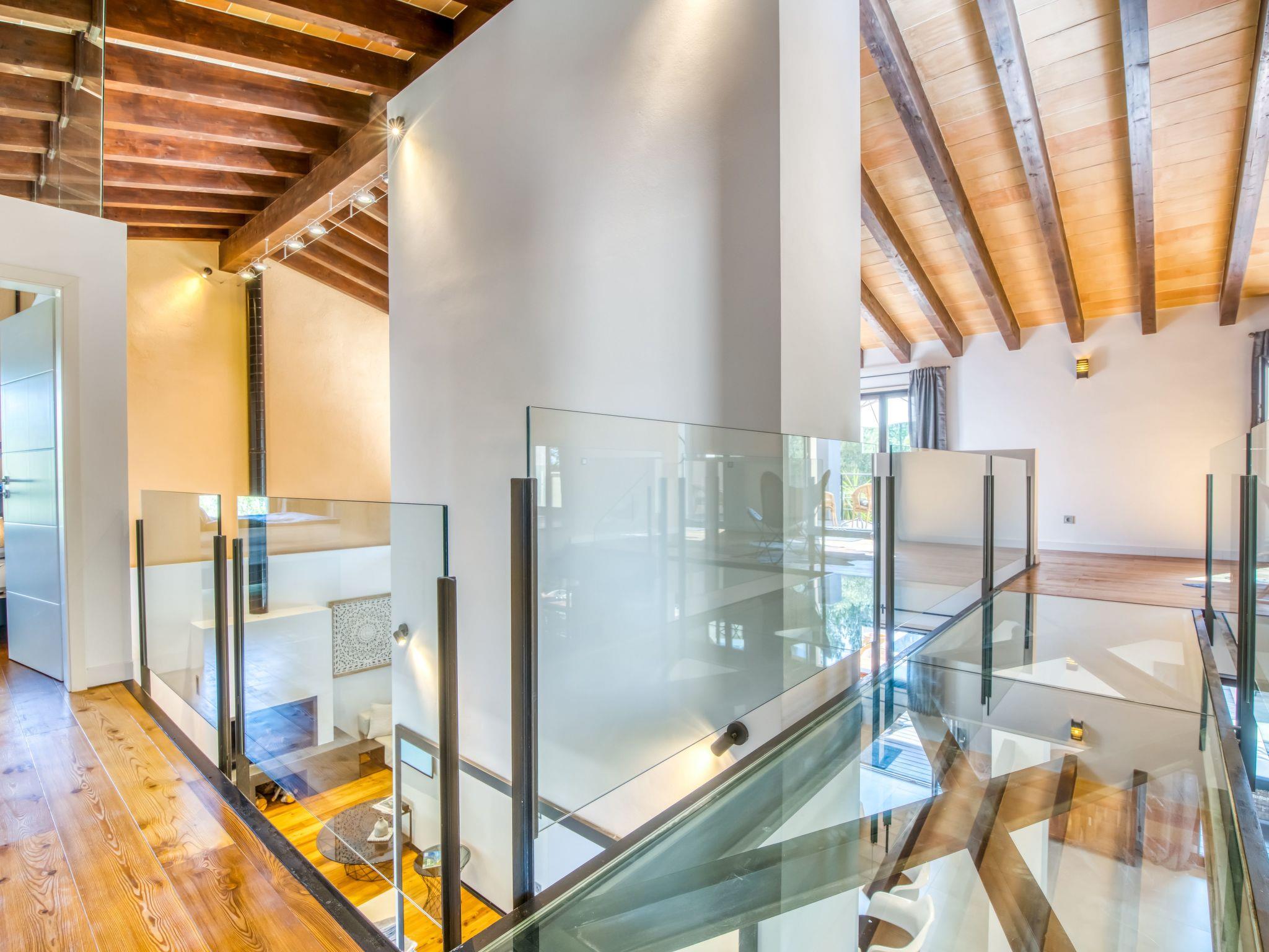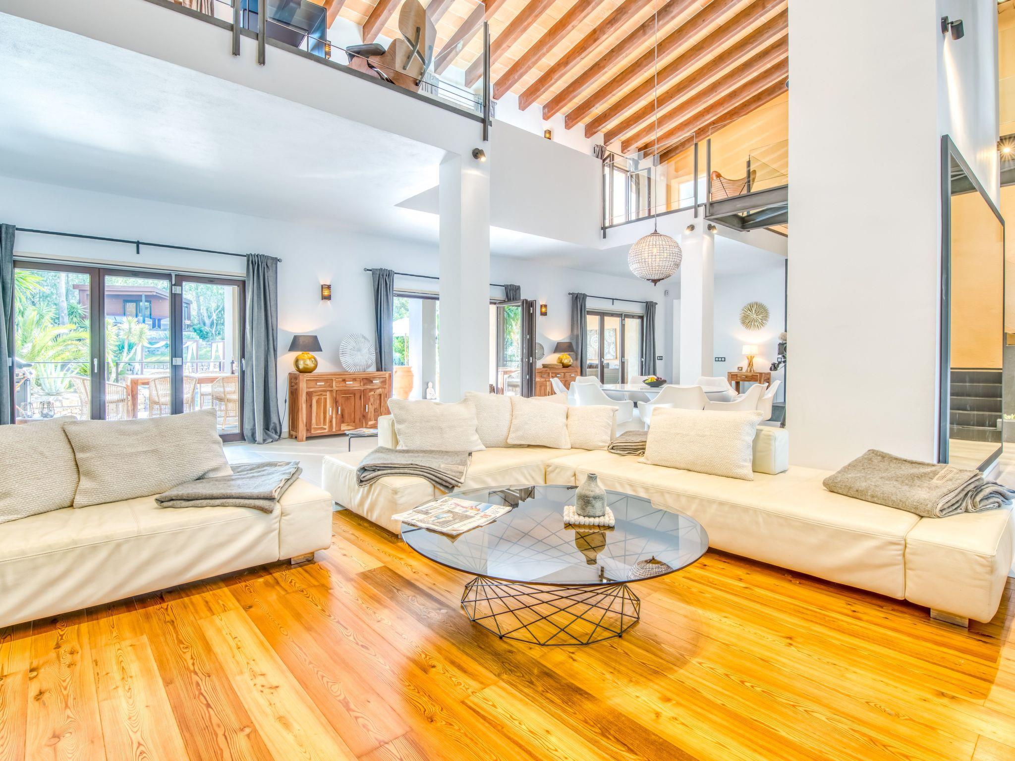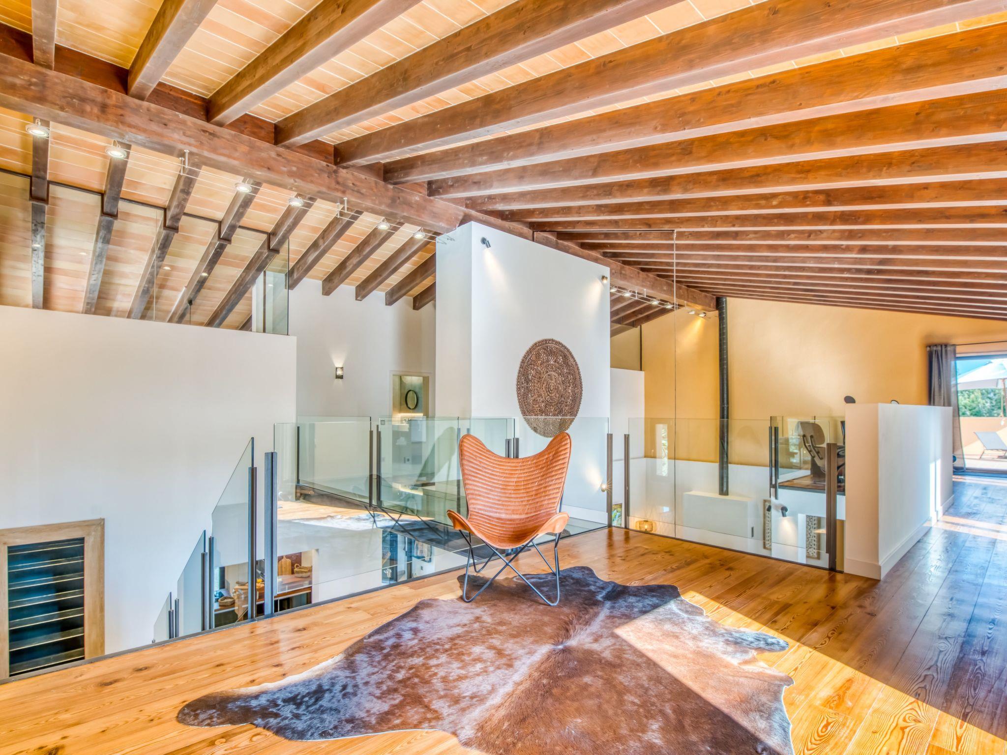 Other living room facilities : The living/dining/lounge area has approx. 150m2 on 2 levels, with an open gallery on the upper floor with a further seating area and exits to 2 terraces of approx. 100m2. On the ground floor there is a dining area with 2 large wooden tables that offer seating for up to 12 people. A spacious and elegant lounge area with an exclusive designer leather sofa landscape rounds off the living area. The unique architecture with ceilings up to 7.50 metres high and a view into the beams of the house, a steel bridge with a glass floor as a connection between the two galleries and a large planting zone with live cacti ensure a special spatial experience.