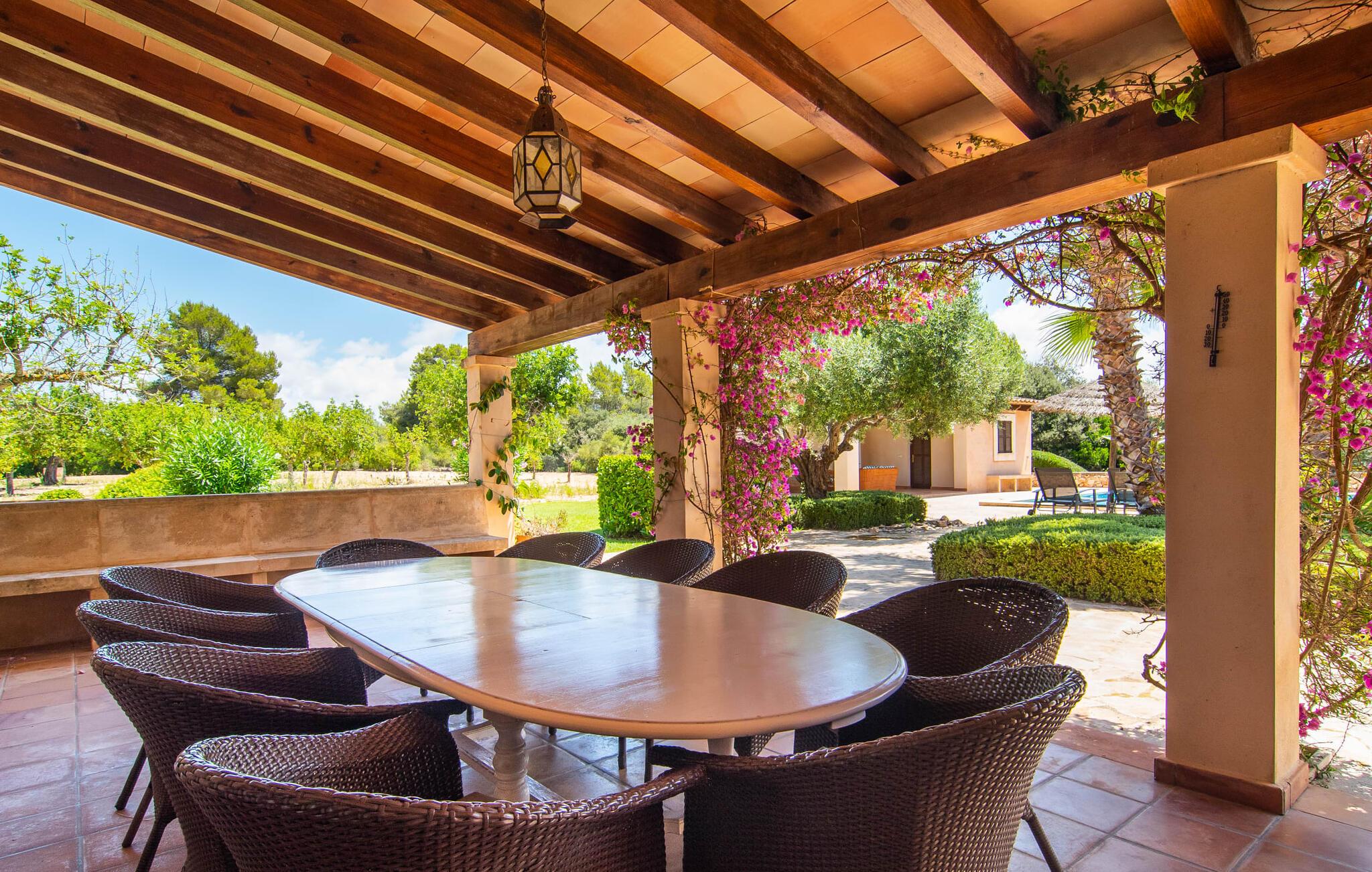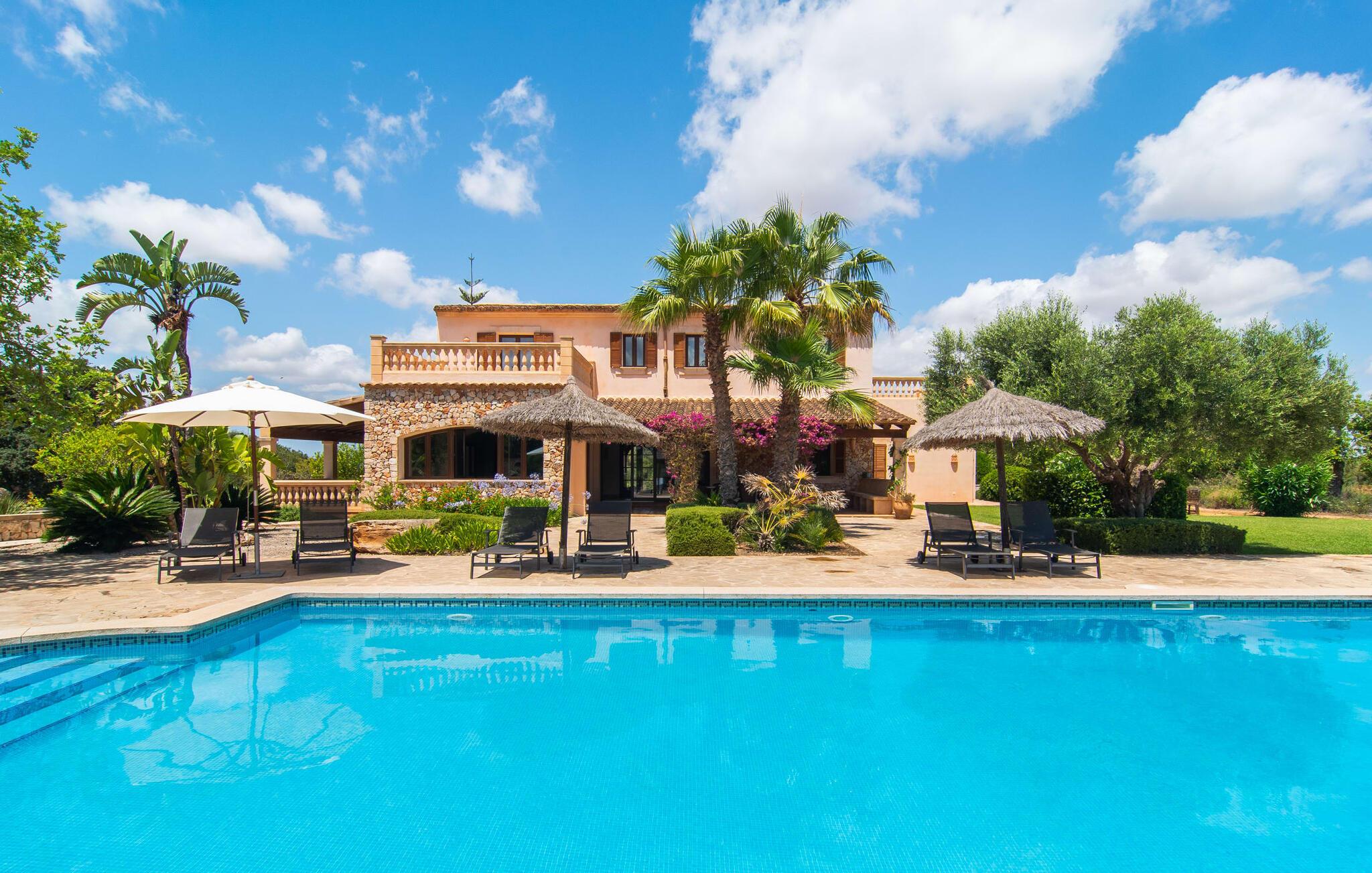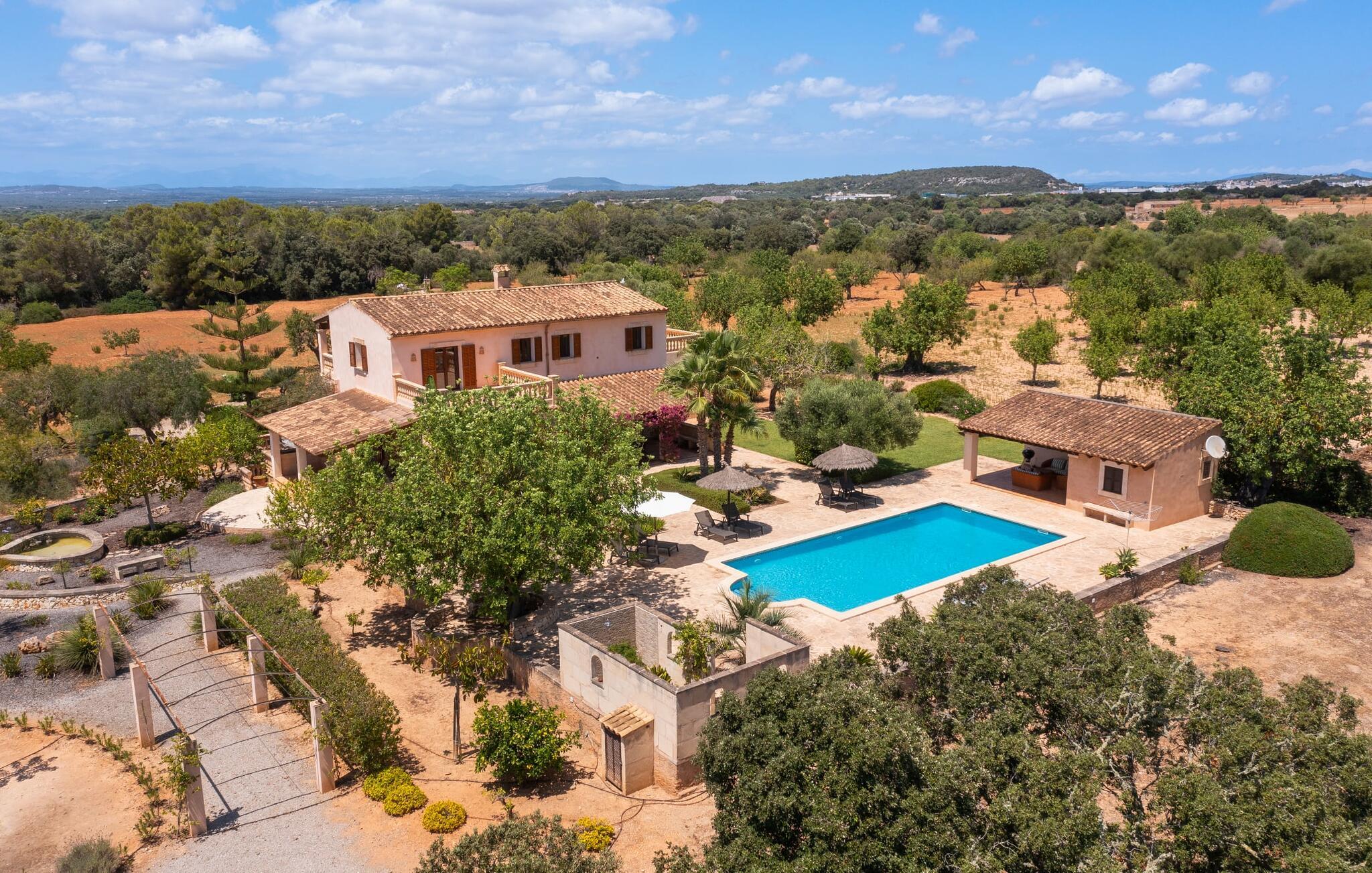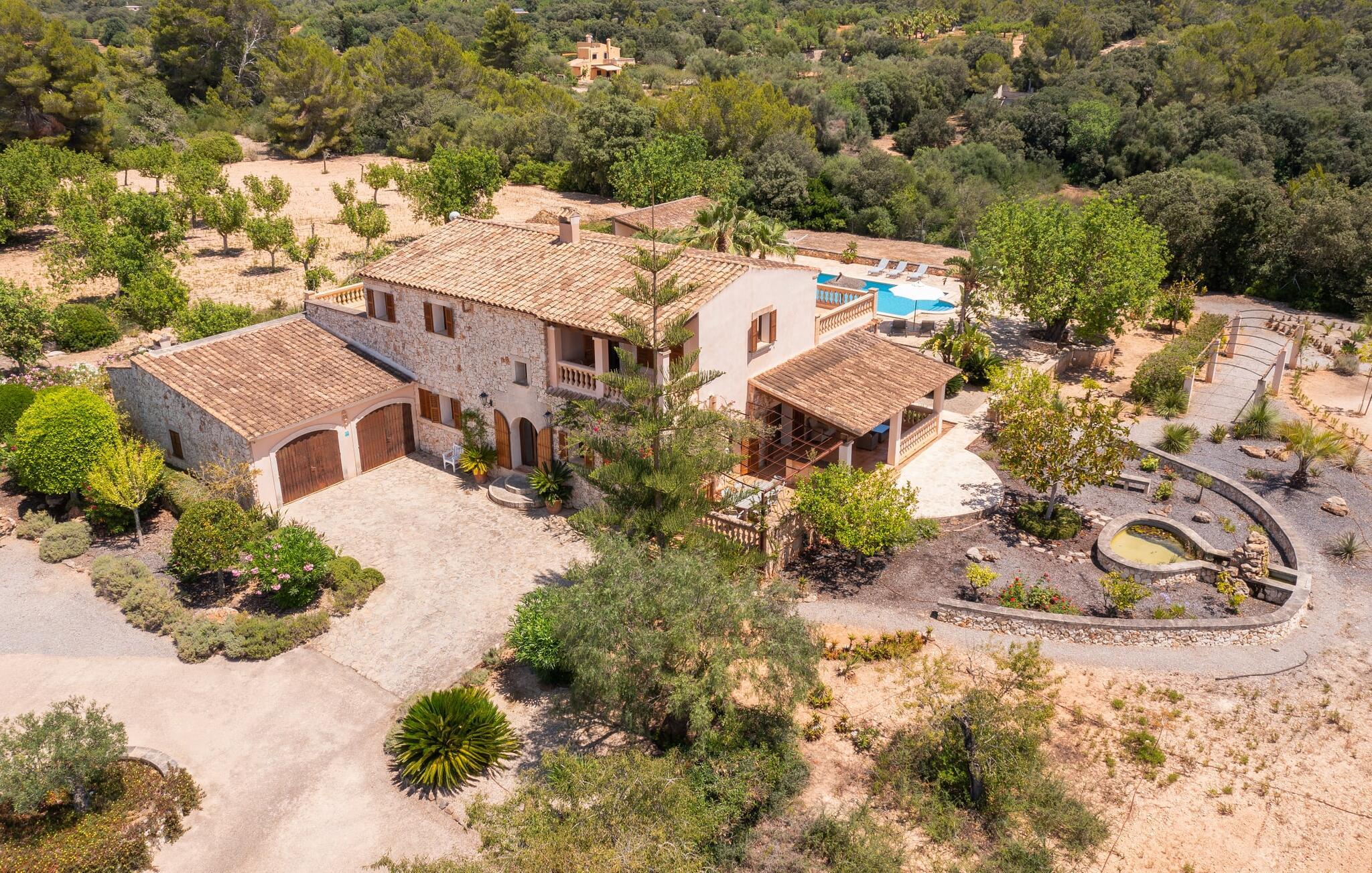 Feriehuset "Feliz" på den sydøstlige del af Mallorca tilbyder komfortabel indkvartering for op til 10 personer. Det er indlejret i smukt anlagte grunde og tilbyder en masse fred og privatliv takket være sin afsondrede beliggenhed. Der er flere overdækkede terrasser rundt om huset til hyggelig spisning på ethvert tidspunkt af dagen. En mobil grill er også tilgængelig. Det rummelige poolområde har en stor solterrasse med forskellige skyggefulde områder. Lige ved siden af poolen er der et lille hus med endnu et hyggeligt opholdsområde i skyggen. Landhusets øverste etage har to store altanterrasser. Herfra har I udsigt til poolen, middelhavshaven og de idylliske omgivelser. Indvendigt er sommerhuset lige så rummeligt som udearealerne. Stueetagen er domineret af en åben opholdsstue. Den består af en central spiseplads, et rummeligt køkken og to forskellige stuer med komfortable sofaer. Der er også et lille skrivebord til hjemmekontoret - huset har en stabil internetforbindelse. Denne opdeling sikrer, at alle gæster kan finde flere behagelige steder at trække sig tilbage, selv når huset har maksimal belægning. Det moderne køkken er fuldt udstyret og tilbyder en ekstra spiseplads til 6 personer. Den tilstødende overdækkede terrasse med udsigt over poolen er let tilgængelig fra opholdsstuen. Derudover er der i stueplan to soveværelser med dobbeltsenge, et gæstetoilet, et badeværelse og et vaskerum. På øverste etage er der yderligere tre dobbeltværelser, hvoraf to har udgang til deres egen store altan. Et af soveområderne har desuden eget badeværelse. Der er også et individuelt badeværelse på denne etage. Forresten: Landstedet er også ideelt udstyret til ferie i den køligere sæson. Stueetagen er udstyret med gulvvarme; Der er radiatorer i det øverste område. Feriehuset "Feliz" på den sydøstlige del af Mallorca ligger på en stor, isoleret landlig ejendom 10 minutter i bil fra Felanitx. Felanitx byder på gode indkøbsmuligheder. De smukke badebugter Cala Sa Nau og Cala Mitjana ligger 26 minutters kørsel derfra. Den maleriske havn Portocolom ligger 18 km derfra.