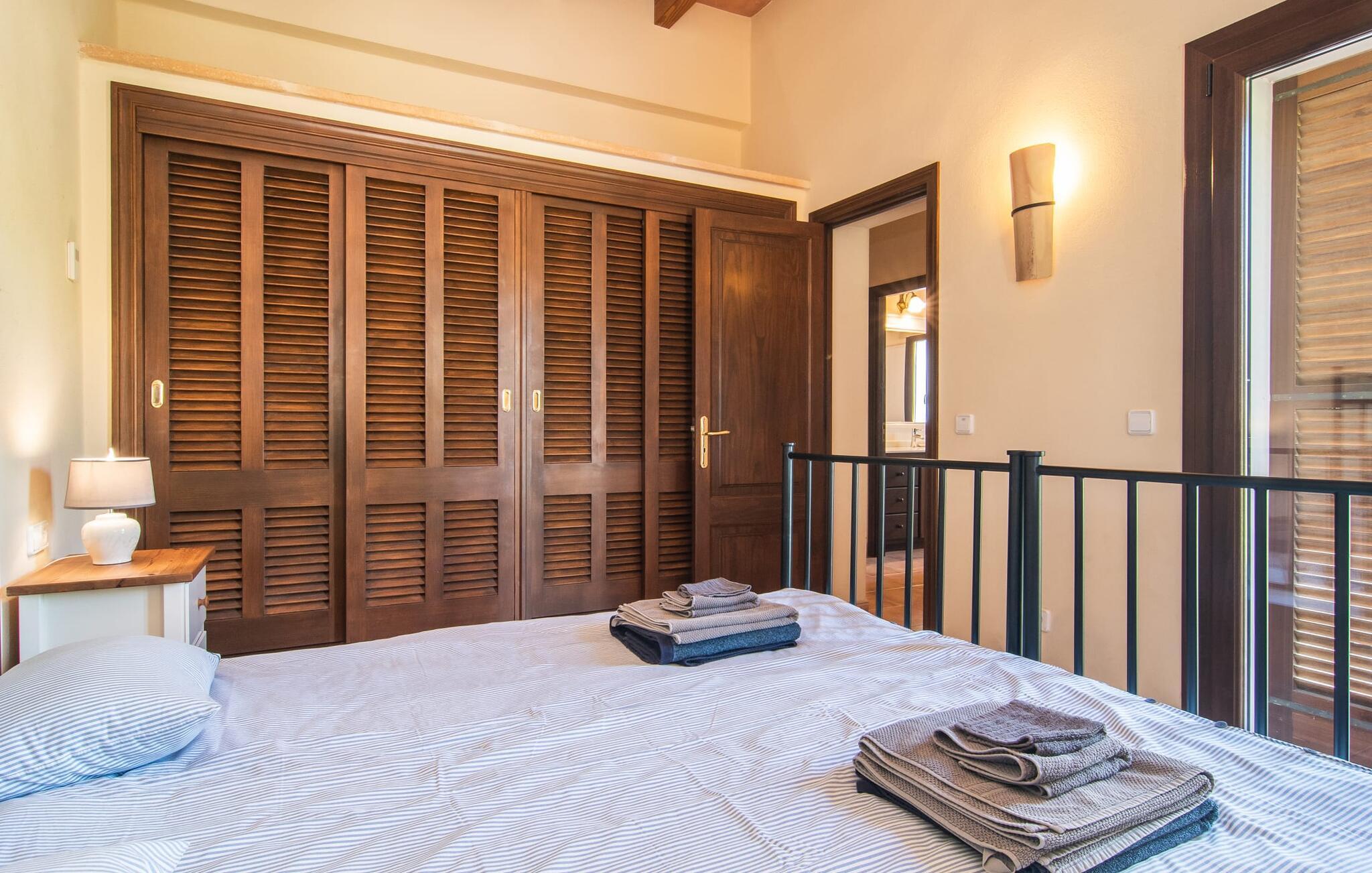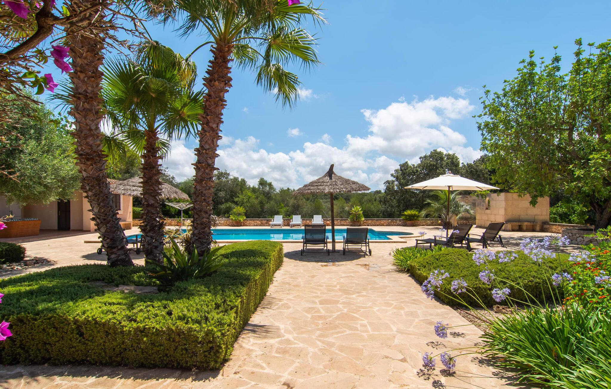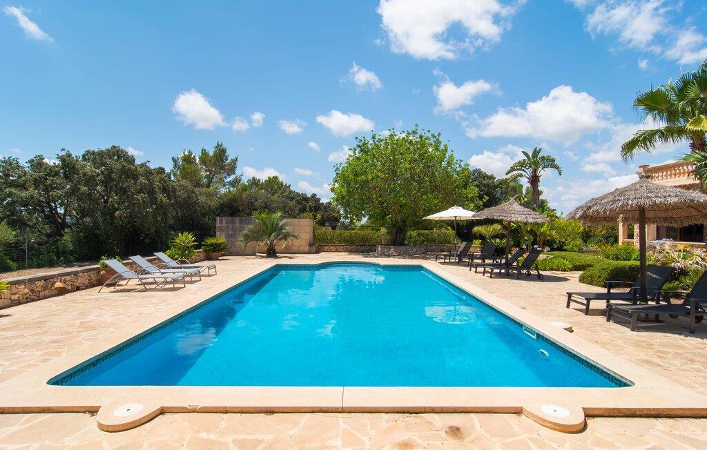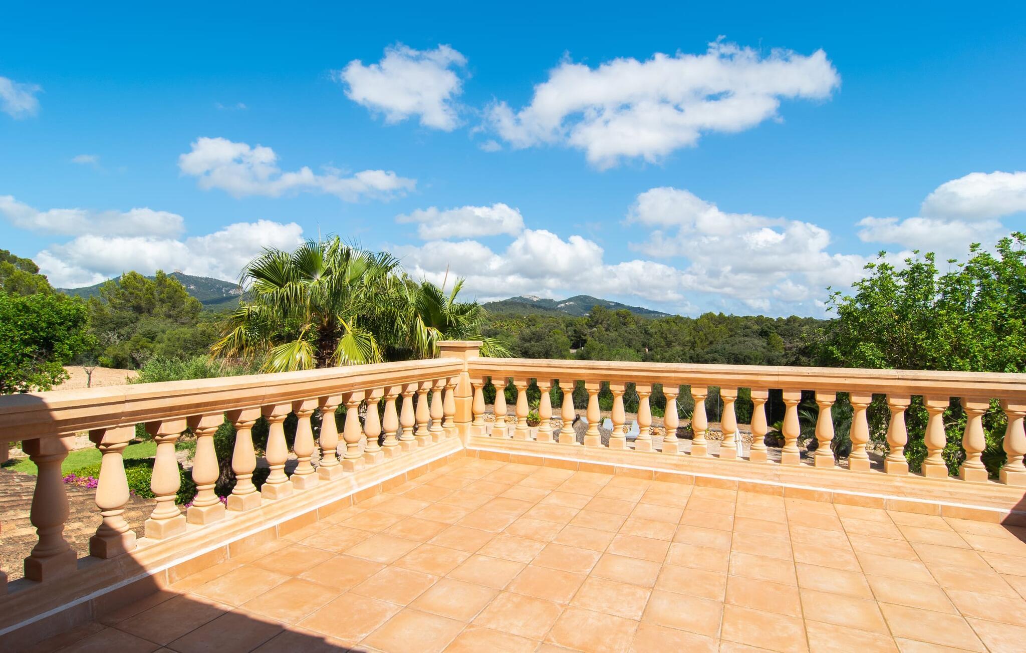 Feriehuset "Feliz" på den sydøstlige del af Mallorca tilbyder komfortabel indkvartering for op til 10 personer. Det er indlejret i smukt anlagte grunde og tilbyder en masse fred og privatliv takket være sin afsondrede beliggenhed. Der er flere overdækkede terrasser rundt om huset til hyggelig spisning på ethvert tidspunkt af dagen. En mobil grill er også tilgængelig. Det rummelige poolområde har en stor solterrasse med forskellige skyggefulde områder. Lige ved siden af poolen er der et lille hus med endnu et hyggeligt opholdsområde i skyggen. Landhusets øverste etage har to store altanterrasser. Herfra har I udsigt til poolen, middelhavshaven og de idylliske omgivelser. Indvendigt er sommerhuset lige så rummeligt som udearealerne. Stueetagen er domineret af en åben opholdsstue. Den består af en central spiseplads, et rummeligt køkken og to forskellige stuer med komfortable sofaer. Der er også et lille skrivebord til hjemmekontoret - huset har en stabil internetforbindelse. Denne opdeling sikrer, at alle gæster kan finde flere behagelige steder at trække sig tilbage, selv når huset har maksimal belægning. Det moderne køkken er fuldt udstyret og tilbyder en ekstra spiseplads til 6 personer. Den tilstødende overdækkede terrasse med udsigt over poolen er let tilgængelig fra opholdsstuen. Derudover er der i stueplan to soveværelser med dobbeltsenge, et gæstetoilet, et badeværelse og et vaskerum. På øverste etage er der yderligere tre dobbeltværelser, hvoraf to har udgang til deres egen store altan. Et af soveområderne har desuden eget badeværelse. Der er også et individuelt badeværelse på denne etage. Forresten: Landstedet er også ideelt udstyret til ferie i den køligere sæson. Stueetagen er udstyret med gulvvarme; Der er radiatorer i det øverste område. Feriehuset "Feliz" på den sydøstlige del af Mallorca ligger på en stor, isoleret landlig ejendom 10 minutter i bil fra Felanitx. Felanitx byder på gode indkøbsmuligheder. De smukke badebugter Cala Sa Nau og Cala Mitjana ligger 26 minutters kørsel derfra. Den maleriske havn Portocolom ligger 18 km derfra.