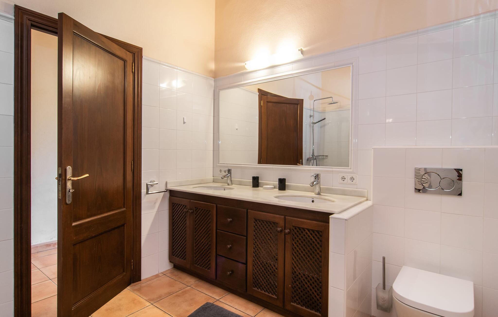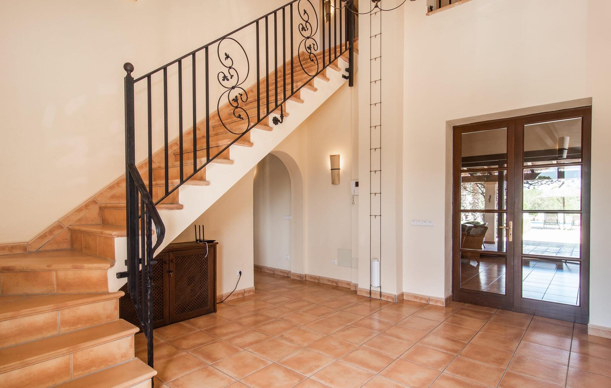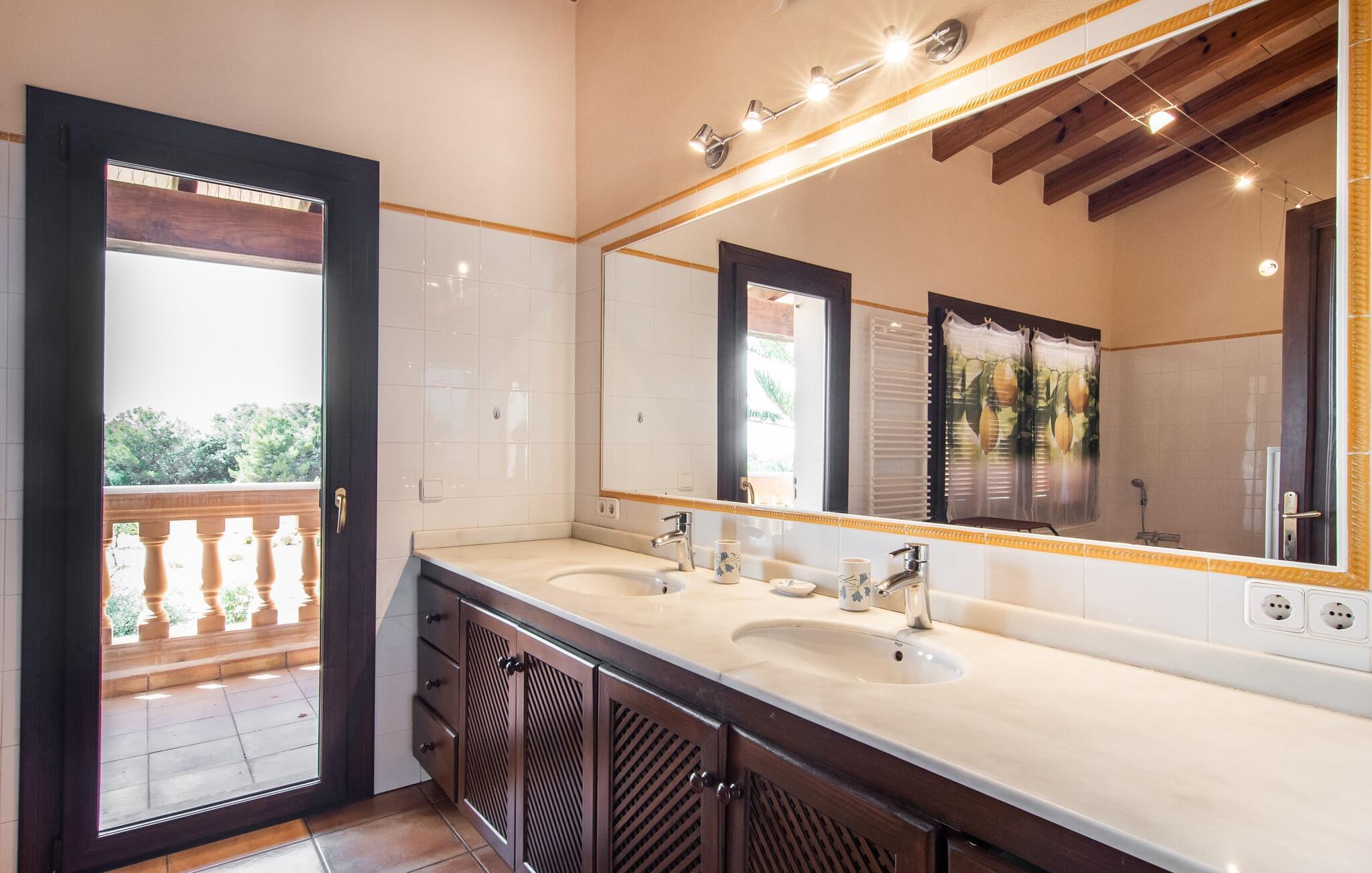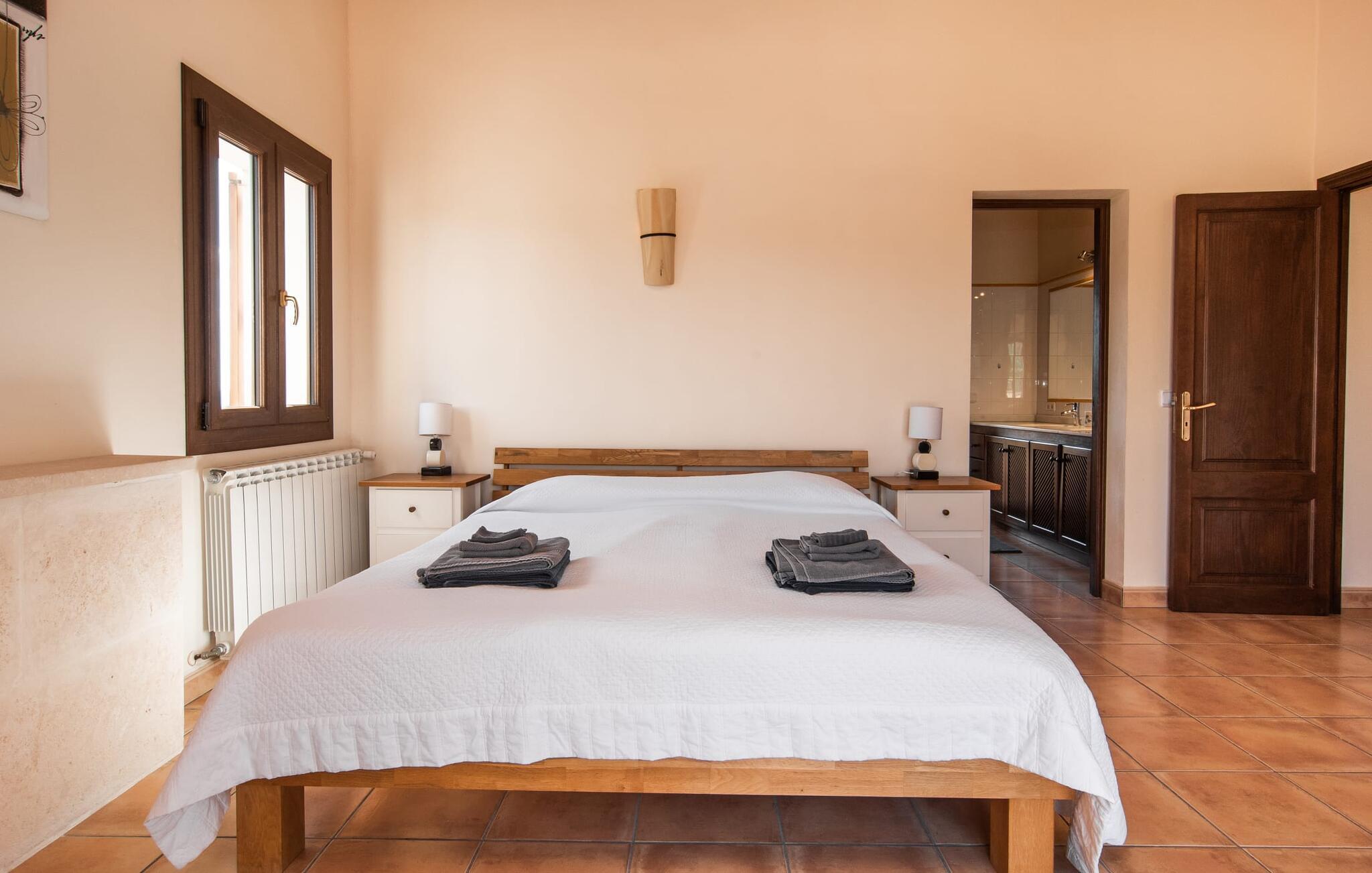 Feriehuset "Feliz" på den sydøstlige del af Mallorca tilbyder komfortabel indkvartering for op til 10 personer. Det er indlejret i smukt anlagte grunde og tilbyder en masse fred og privatliv takket være sin afsondrede beliggenhed. Der er flere overdækkede terrasser rundt om huset til hyggelig spisning på ethvert tidspunkt af dagen. En mobil grill er også tilgængelig. Det rummelige poolområde har en stor solterrasse med forskellige skyggefulde områder. Lige ved siden af poolen er der et lille hus med endnu et hyggeligt opholdsområde i skyggen. Landhusets øverste etage har to store altanterrasser. Herfra har I udsigt til poolen, middelhavshaven og de idylliske omgivelser. Indvendigt er sommerhuset lige så rummeligt som udearealerne. Stueetagen er domineret af en åben opholdsstue. Den består af en central spiseplads, et rummeligt køkken og to forskellige stuer med komfortable sofaer. Der er også et lille skrivebord til hjemmekontoret - huset har en stabil internetforbindelse. Denne opdeling sikrer, at alle gæster kan finde flere behagelige steder at trække sig tilbage, selv når huset har maksimal belægning. Det moderne køkken er fuldt udstyret og tilbyder en ekstra spiseplads til 6 personer. Den tilstødende overdækkede terrasse med udsigt over poolen er let tilgængelig fra opholdsstuen. Derudover er der i stueplan to soveværelser med dobbeltsenge, et gæstetoilet, et badeværelse og et vaskerum. På øverste etage er der yderligere tre dobbeltværelser, hvoraf to har udgang til deres egen store altan. Et af soveområderne har desuden eget badeværelse. Der er også et individuelt badeværelse på denne etage. Forresten: Landstedet er også ideelt udstyret til ferie i den køligere sæson. Stueetagen er udstyret med gulvvarme; Der er radiatorer i det øverste område. Feriehuset "Feliz" på den sydøstlige del af Mallorca ligger på en stor, isoleret landlig ejendom 10 minutter i bil fra Felanitx. Felanitx byder på gode indkøbsmuligheder. De smukke badebugter Cala Sa Nau og Cala Mitjana ligger 26 minutters kørsel derfra. Den maleriske havn Portocolom ligger 18 km derfra.