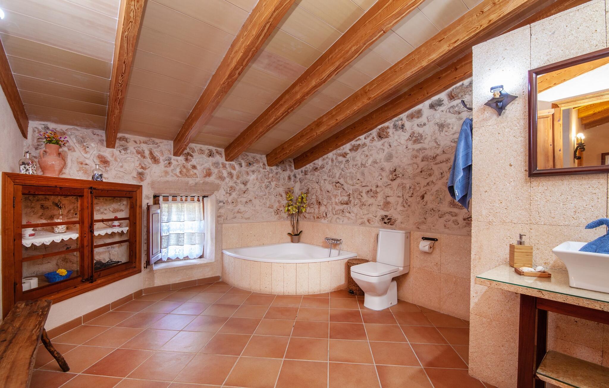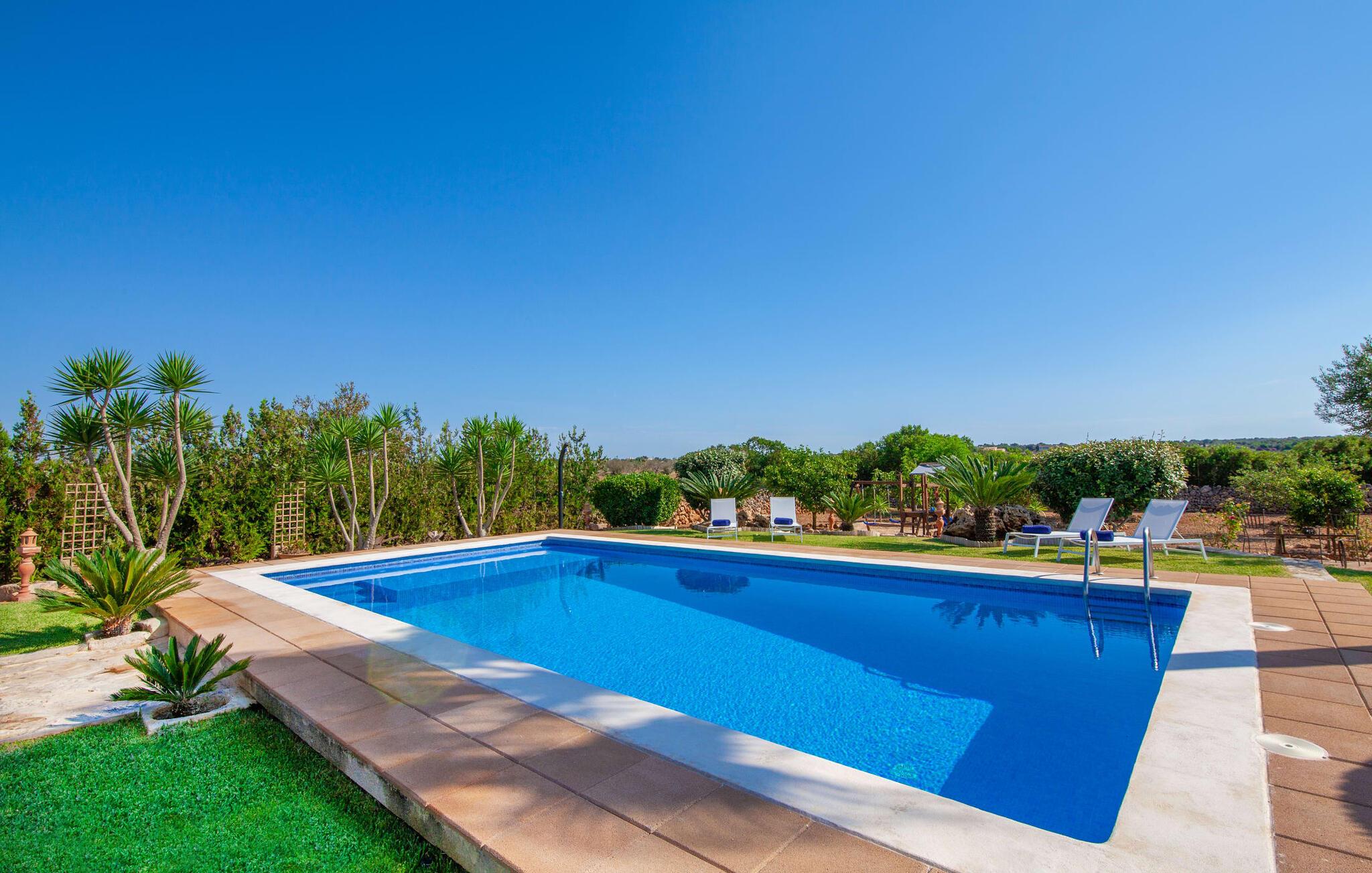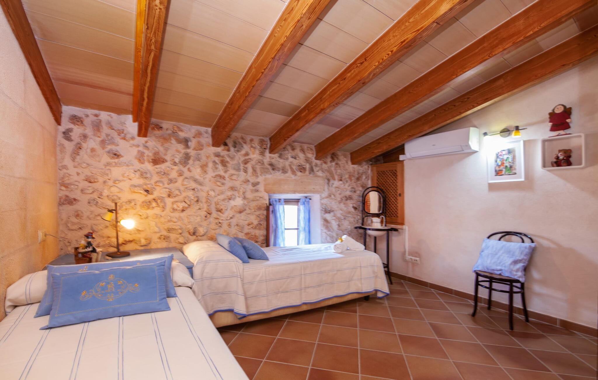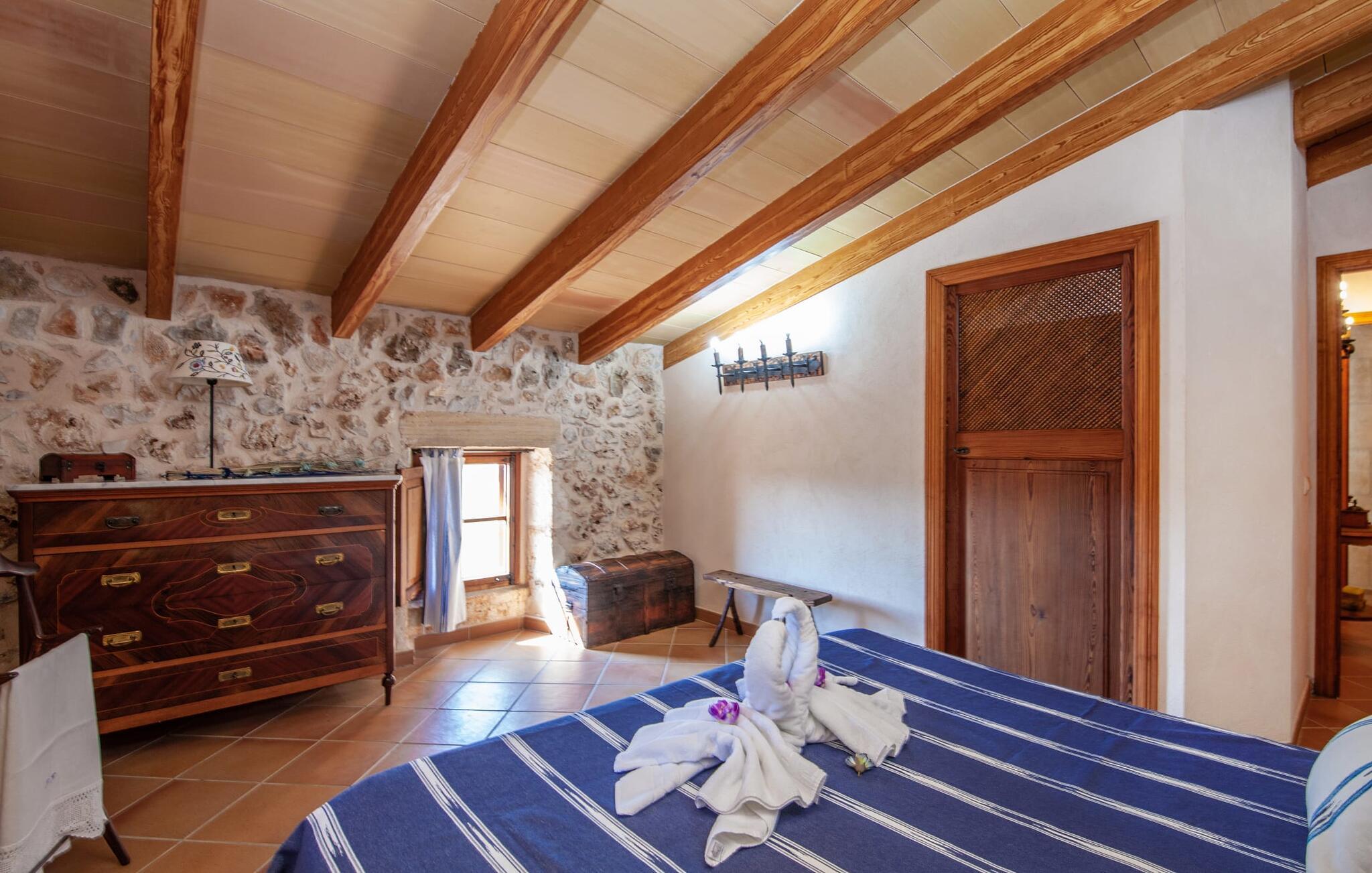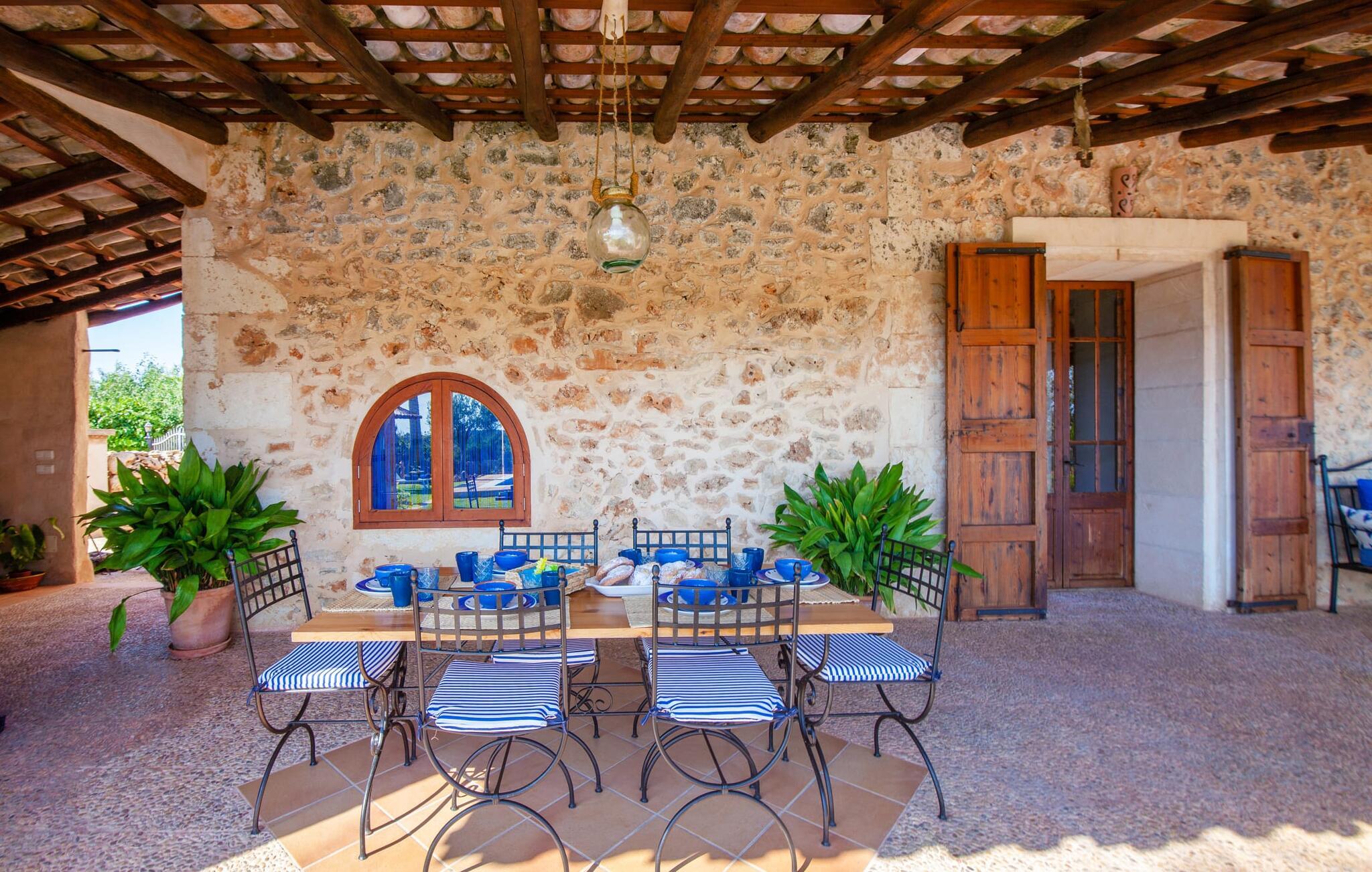 Fincaen "Fonoll", indlejret i et betagende landskab, var engang en landlig ejendom, der har bevaret sin traditionelle middelhavskarakter den dag i dag. Den rummelige private pool og legepladsen lover en uforglemmelig familieferie, mens den velholdte have, dekoreret med en række middelhavsplanter og høje palmer, skaber en attraktiv og æstetisk atmosfære. I kan nyde hyggelige aftener på den overdækkede terrasse, mens den murede grill og det fuldt udstyrede udekøkken gør udelivet til en skøn oplevelse. Det gennemtænkte udformede udendørs opholdsområde er et dejligt sted at slappe af og nyde omgivelserne. Indvendigt sikrer historiske detaljer som naturstensmurværk og dekorative buer en autentisk booplevelse. Træbjælkelofterne afspejler traditionel mallorcansk arkitektur. Fincaen imponerer med sit charmerende interiør, som kunstfærdigt kombinerer antikviteter, klassiske møbler og moderne elementer for at skabe en unik atmosfære. I stueetagen finder I indgangspartiet, en stue, der åbner ud til spisepladsen, samt køkkenet (en pejs giver hyggelig varme på køligere dage) og et badeværelse. På øverste etage er der tre stilfuldt indrettede dobbeltværelser - to med dobbeltsenge og et med to enkeltsenge - samt et ekstra badeværelse. Denne finca er det perfekte tilflugtssted for en uforglemmelig ferie. Den fantastiske finca "Fonoll" er roligt beliggende kun 10 minutter i bil fra den smukke sandstrand i Alcúdia. Den maleriske landsby Santa Margalida er kun omkring 3,5 km væk, hvor I også vil finde to supermarkeder til daglige behov og et ugentligt marked.