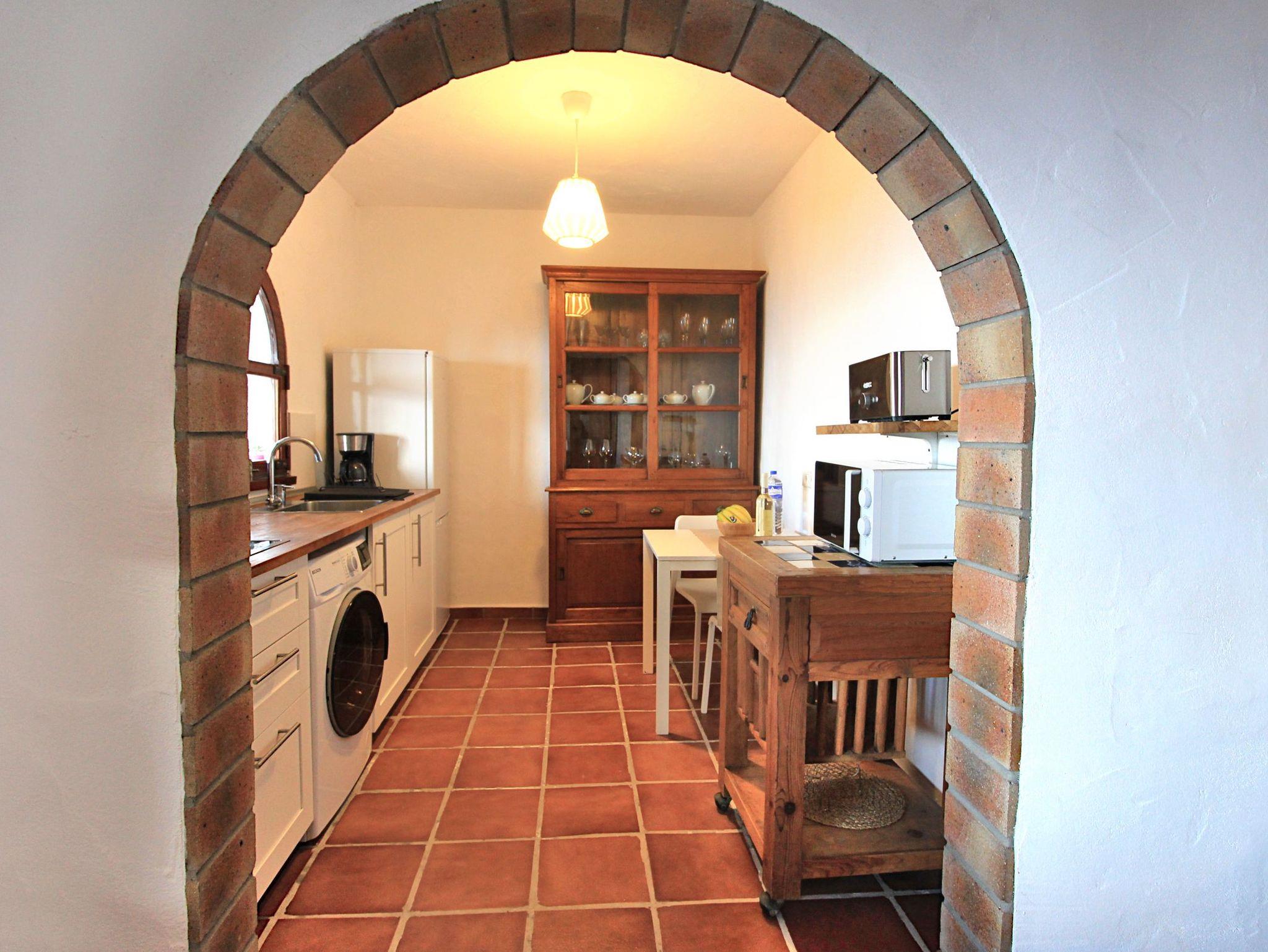Die separate Küche hat ebenfalls einen offenen bogenförmigen Zugang und ist komplett ausgestattet mit allem, was man benötigt, wie z. B. einer Waschmaschine oder einer Mikrowelle (außer einem Geschirrspüler).