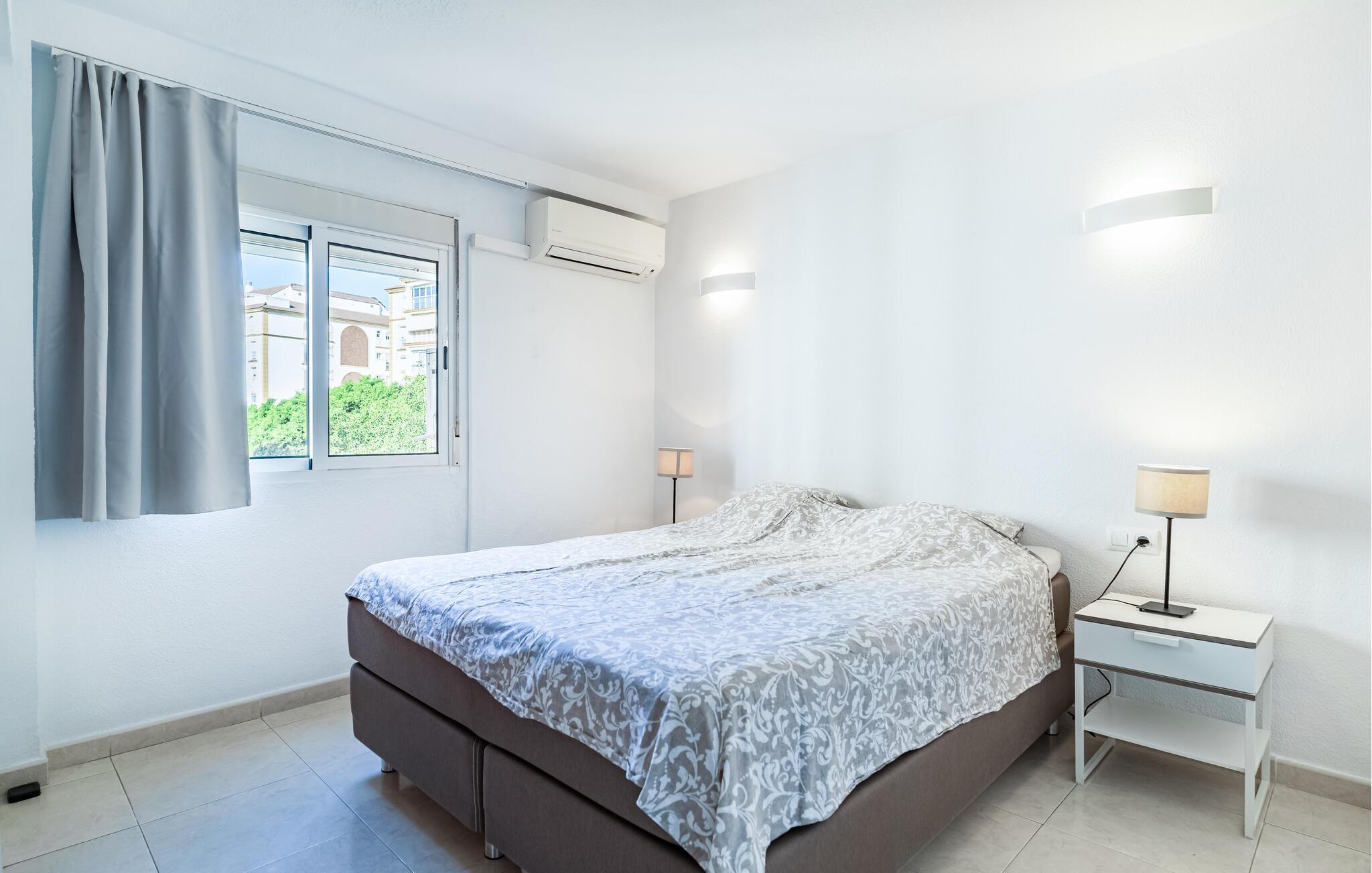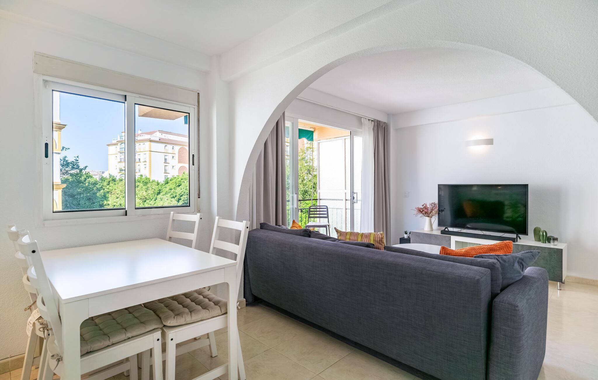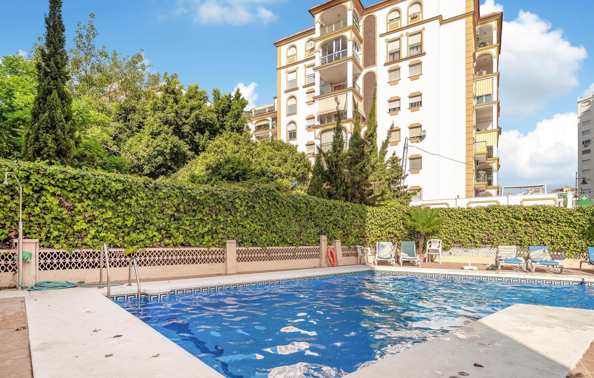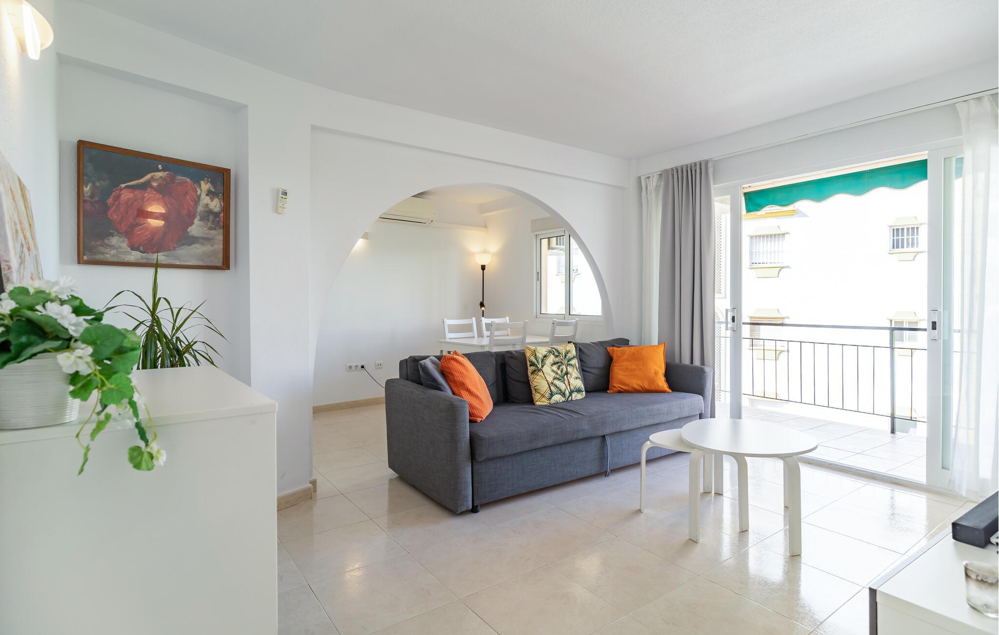 Velkommen til denne smukke og lyse ferielejlighed i Fuengirola. Denne hyggelige bolig tilbyder jer ikke kun en indbydende opholdsstue med en stilfuld indretning, men også en balkon, hvor I kan slappe af og nyde de varme solstråler. Den åbne grundplan skaber en luftig atmosfære, ideel til hyggelige aftener. Det fuldt udstyrede køkken gør det muligt for jer at tilberede lækre måltider, mens I nyder udsigten over omgivelserne. Adgang til den fælles swimmingpool giver jer en forfriskende afkøling på varme dage.