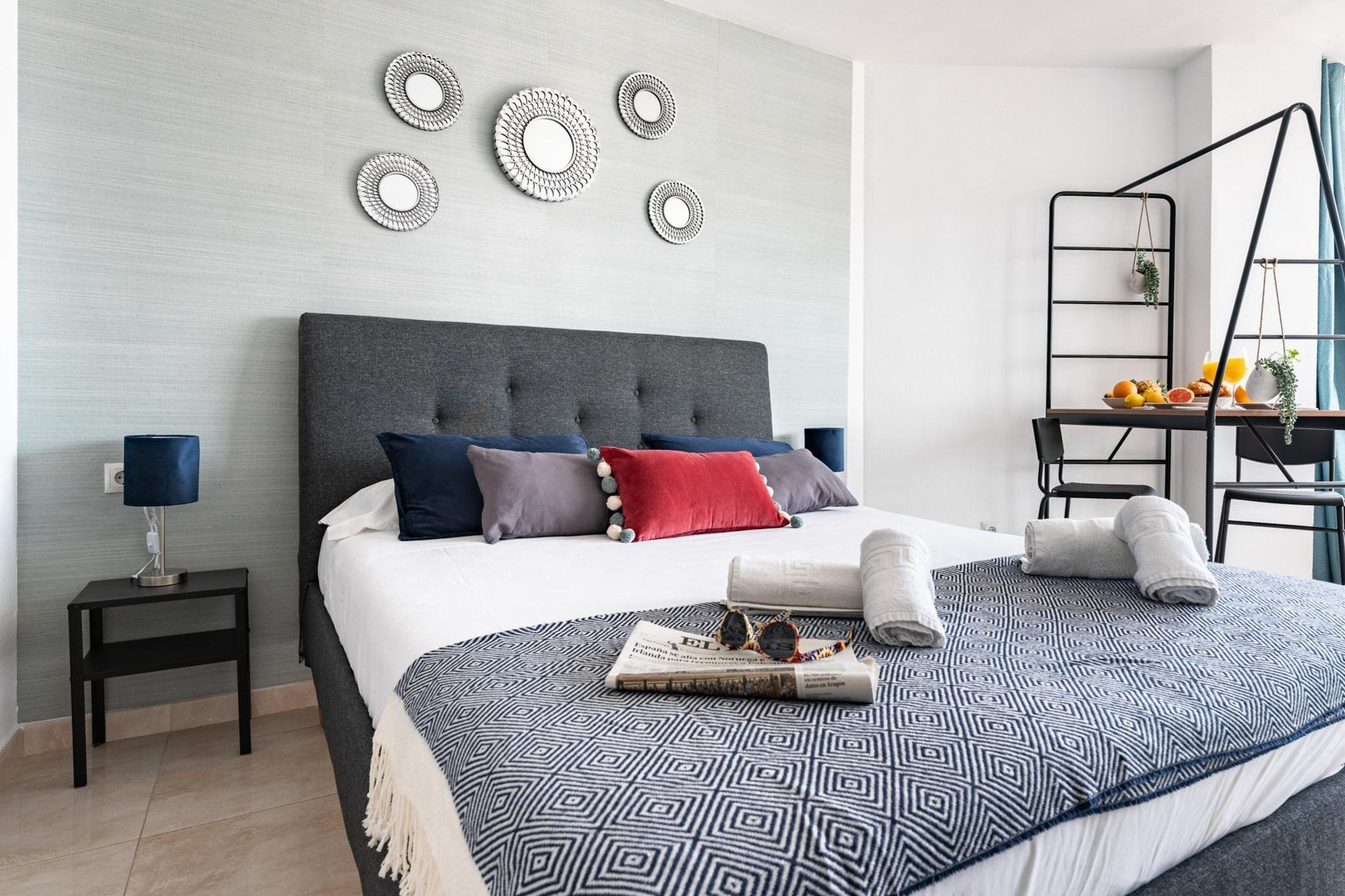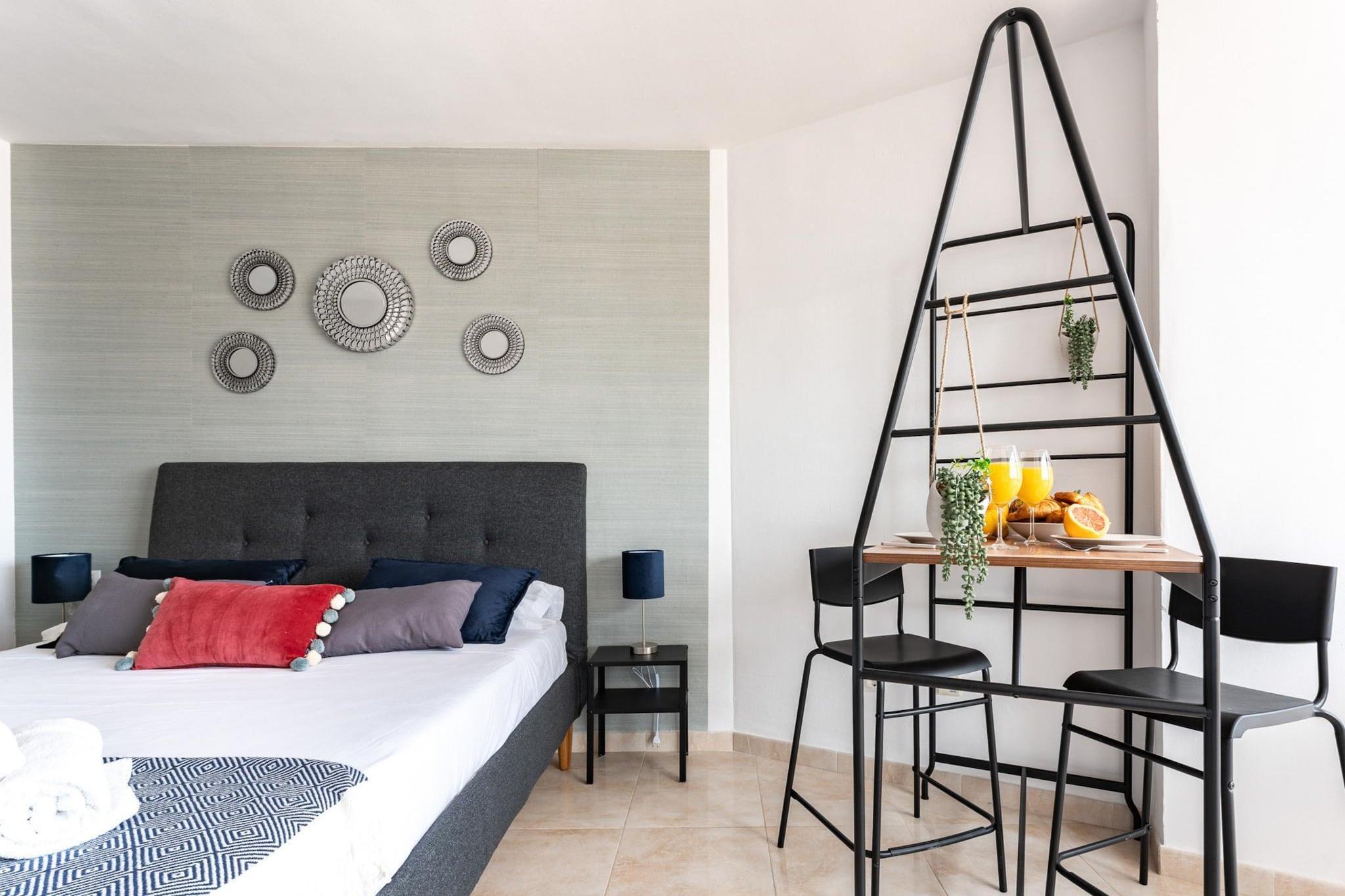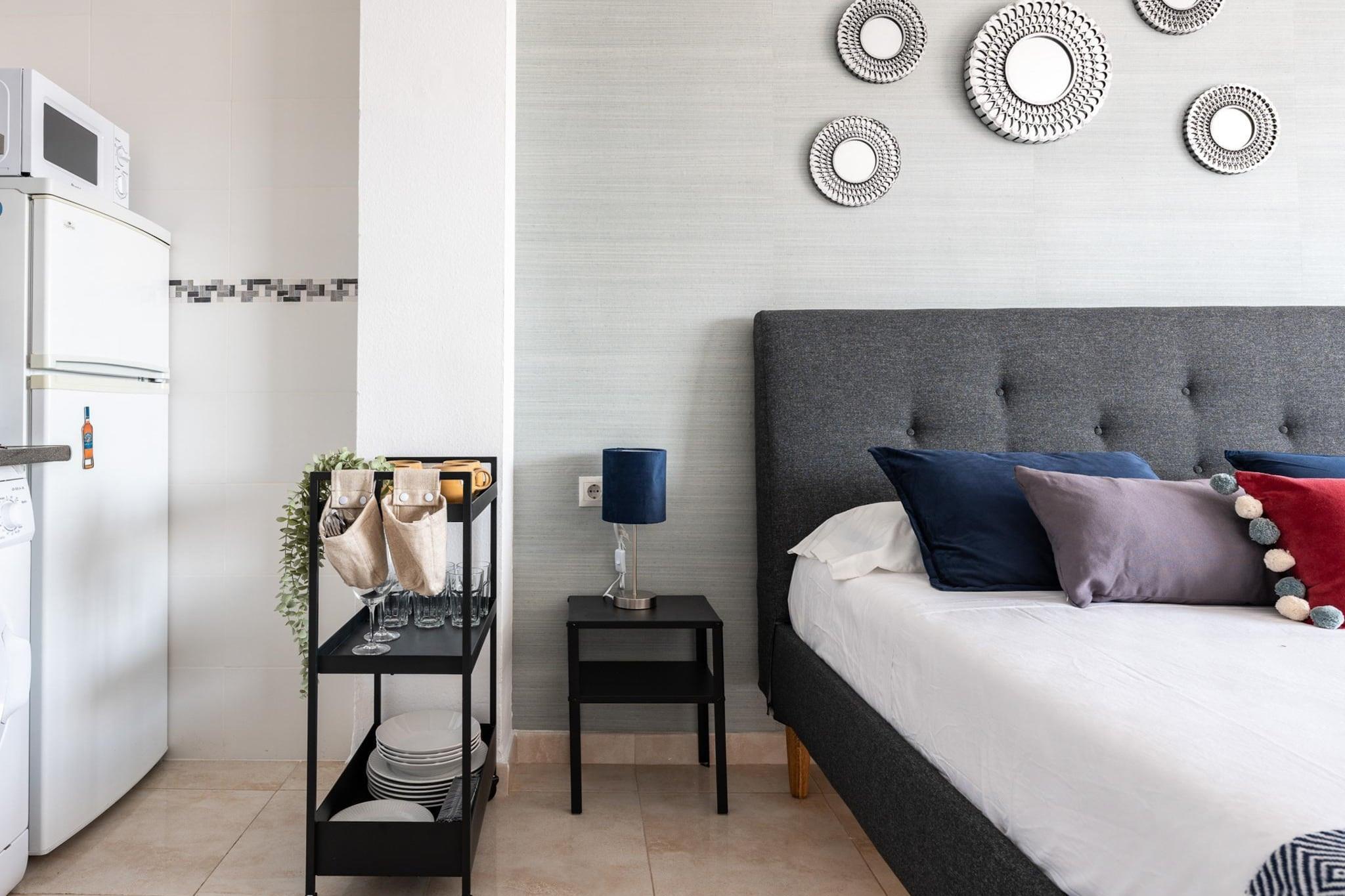 Velkommen til vores charmerende studie i Fuengirola! Beliggende kun 400 meter fra stranden, er dette hyggelige rum perfekt til at nyde en uforglemmelig ferie på Costa del Sol. Studiet er designet med en funktionel og moderne fordeling. Når du kommer ind, vil du finde et lille køkken åbent til stuen, der har en komfortabel dobbeltseng, ideel til at slappe af efter en dag på stranden eller udforske. Derudover har den et badeværelse med bruser og en indvendig terrasse, der byder på udsigt over byen og et lille glimt af havet. Blot 4 minutters gang fra lejligheden kan du nå de smukke strande i Fuengirola. De nærmeste strande er Playa de San Francisco og Playa de Los Boliches, kendt for deres krystalklare vand og gyldne sand. Perfekt til solbadning, svømning eller vandsport. Fuengirola er en pulserende destination med en bred vifte af aktiviteter for enhver smag. Du kan slentre langs strandpromenaden, besøge Bioparc, en zoologisk have med fokus på bevaring, eller udforske det historiske Sohail Slot. For golfelskere er der flere golfbaner af høj kvalitet i nærheden. Derudover ligger byens centrum kun få minutter fra studiet, hvor du kan nyde et bredt udvalg af butikker, barer og restauranter, der tilbyder lækre lokale retter. Gå ikke glip af muligheden for at prøve typiske retter såsom stegt fisk, sardinspyd og frisk fisk og skaldyr. Fuengirola er også et glimrende udgangspunkt for at besøge andre fascinerende byer i regionen. Et kort stykke væk ligger Malaga, kendt for sin rige historie, museer og det imponerende Alcazaba; Marbella, berømt for sin luksushavn, Puerto Banús, og sin charmerende gamle bydel; og Benalmádena, med sin smukke lystbådehavn og Tivoli World forlystelsespark. Hver af disse byer byder på unikke oplevelser og forskelligartede aktiviteter, fra kulturelle besøg til underholdning og