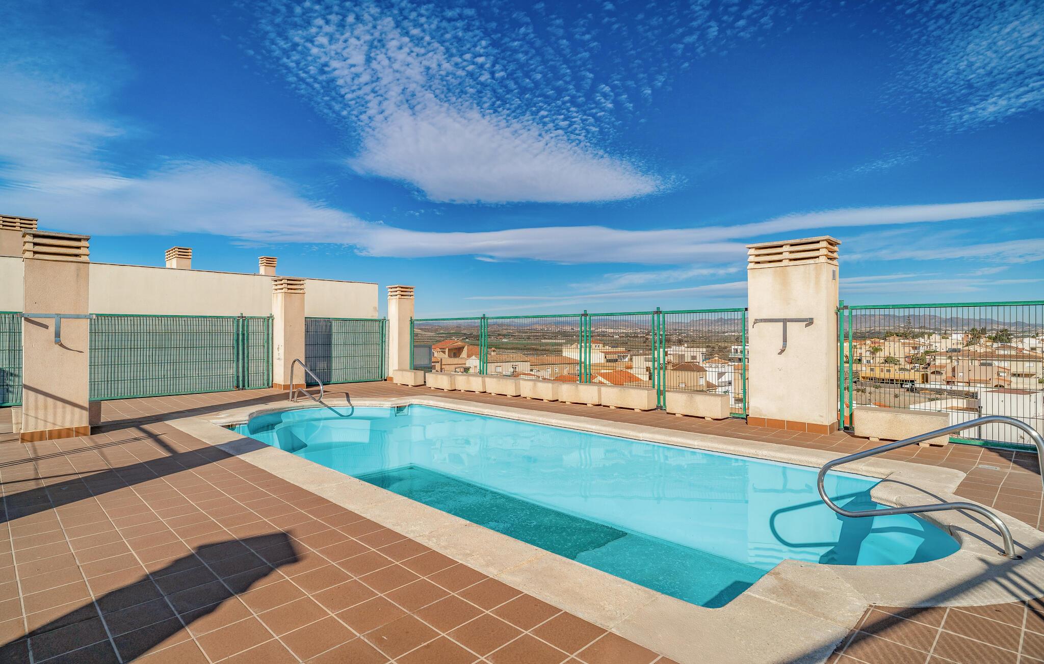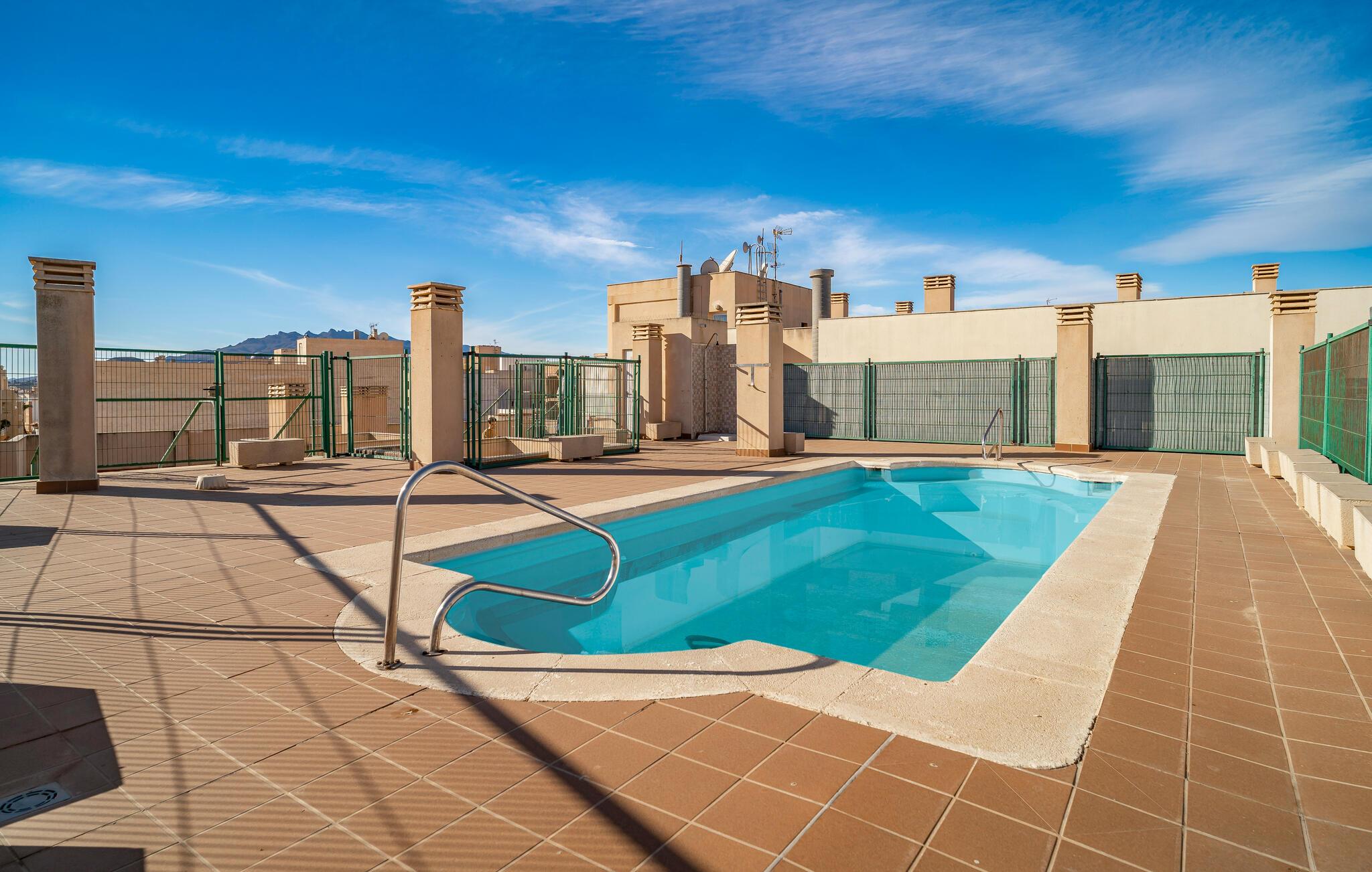 Højdepunktet i komplekset er den store fælles pool på tagterrassen, som byder på en spektakulær udsigt over Garrucha og havet. Svøm et par omgange eller nyd solen på liggestolene, mens I mærker den friske havbrise.