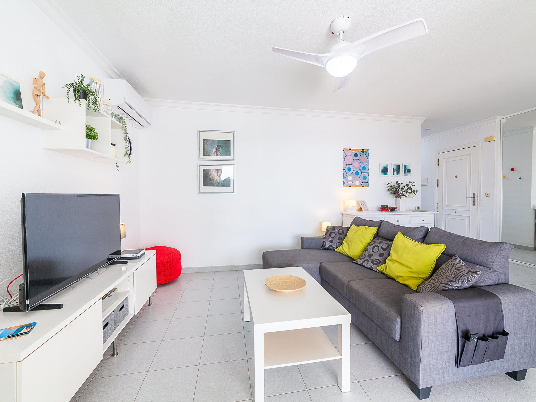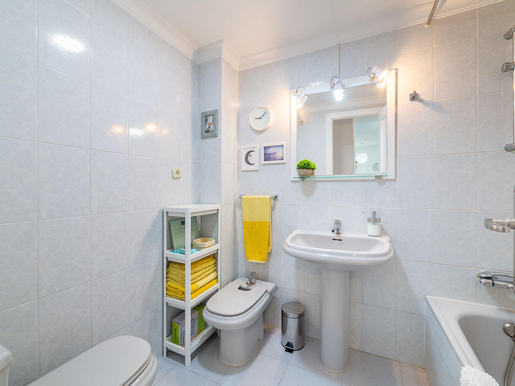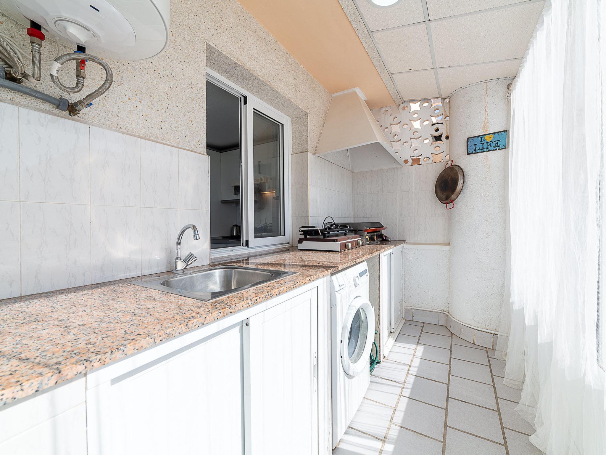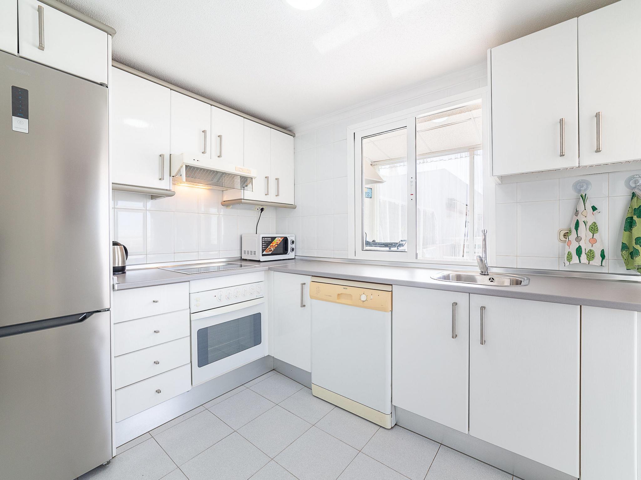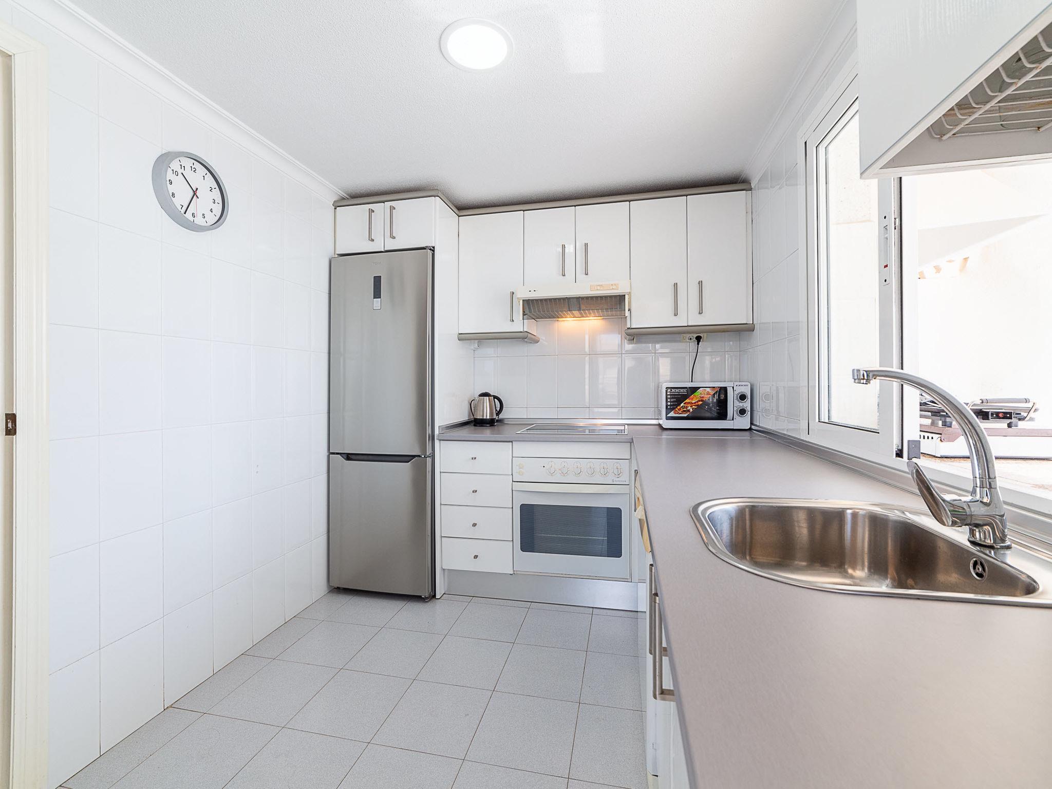 "Terrazas V", 3-room apartment 120 m2 on 4th floor. Practical and comfortable furnishings: living/dining room with dining table, digital TV, flat screen, air conditioning, fan and forced-air heating. Exit to the terrace. 1 room with 1 french bed (135 cm, length 190 cm), air conditioning, fan and forced-air heating. Exit to the terrace. 1 room with 1 bed (90 cm, length 190 cm), 1 pull-out bed (2 x 90 cm, length 190 cm), air conditioning and fan. Kitchen (oven, dishwasher, 4 ceramic glass hob hotplates, toaster, kettle, microwave, freezer, electric coffee machine). Bath/bidet/WC, sep. WC. Large terrace 60 m2 partly roofed. Terrace furniture, barbecue. View of the sea and the port. Facilities: washing machine, iron, hair dryer. Internet (WiFi, free). Garage at the house. Please note: non-smokers only. Maximum 1 pet/ dog allowed. VUT/AL/11778 // Reg. Nr.: ESFCTU0000040100002830190000000000000000VUT/AL/117782