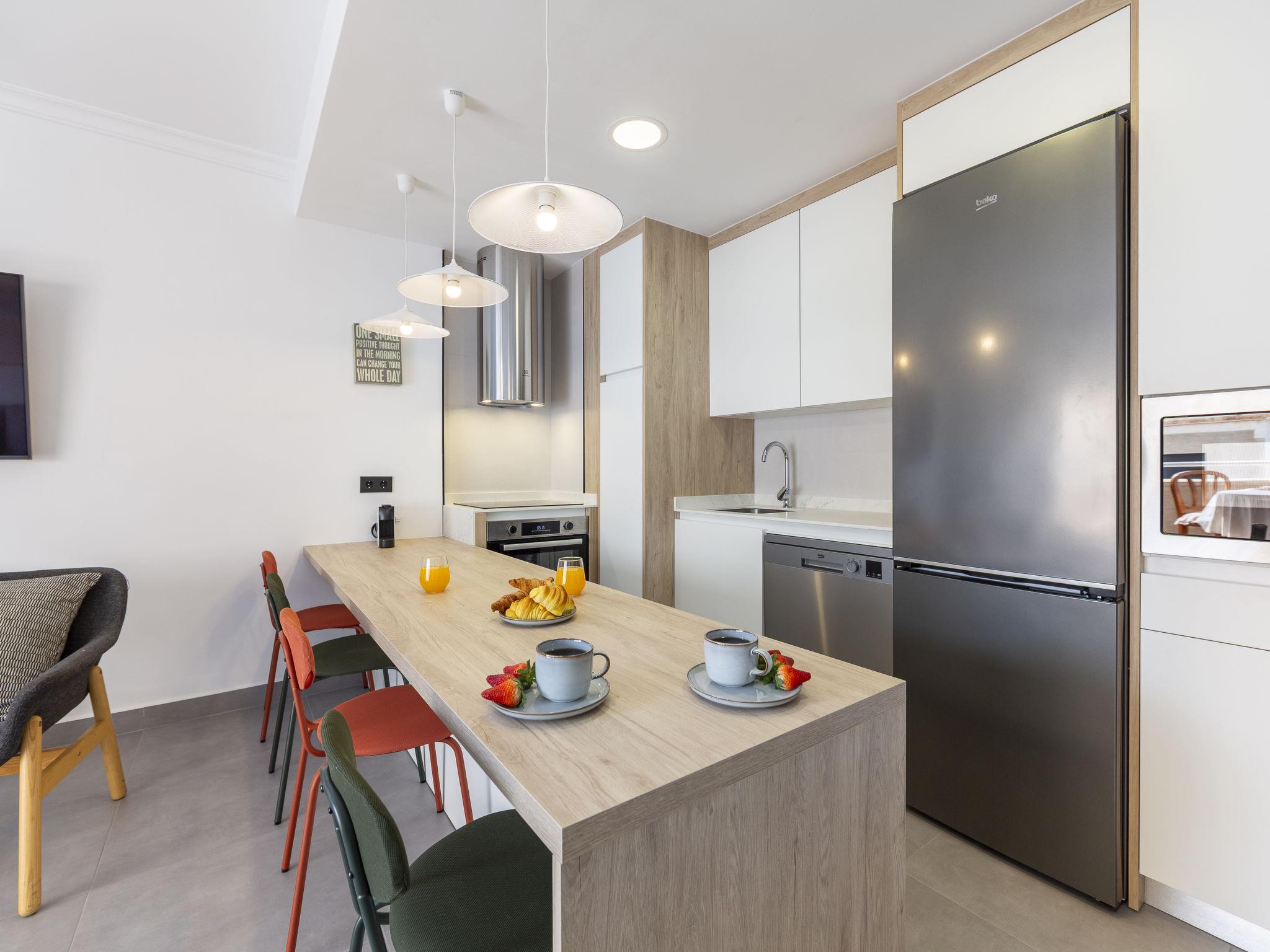 "Infinite Viewpoint", 3-room apartment 100 m2 on 2nd floor. Practical and comfortable furnishings: living/dining room with dining table, digital TV, flat screen, air conditioning, fan and forced-air heating. Exit to the terrace. 1 room with 1 french bed (150 cm, length 190 cm), fan. 1 room with 1 bed (90 cm, length 200 cm), 1 french bed (140 cm, length 200 cm), fan. Open kitchen (oven, dishwasher, 4 ceramic glass hob hotplates, toaster, kettle, microwave, freezer, electric coffee machine). Bath/bidet/WC. Terrace. Terrace furniture. View of the resort. Facilities: washing machine, iron, baby cot, hair dryer. Internet (WiFi, free). Parking (roofed) at the house. Please note: suitable for families. Non-smokers only. Maximum 1 pet/ dog allowed. VUT/AL/12507 // Reg. Nr.: ESFCTU0000040100002766910000000000000000VUT/AL/125075
