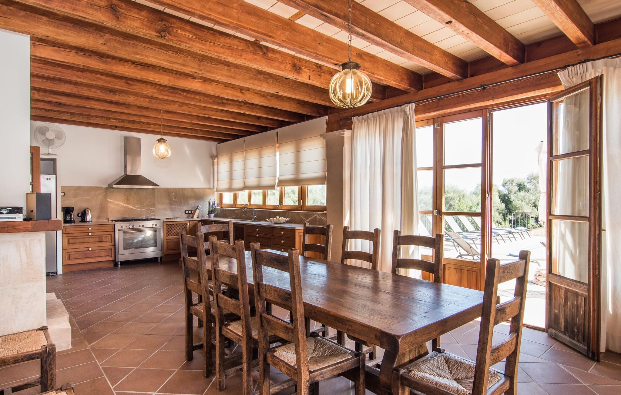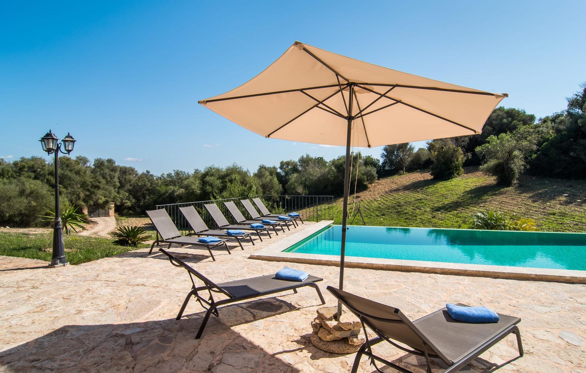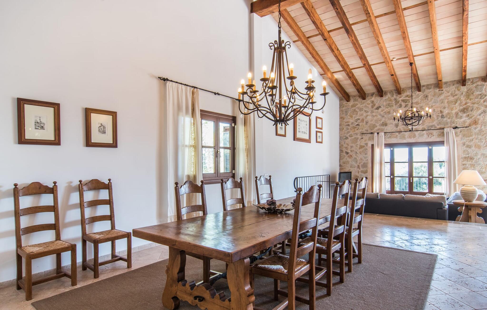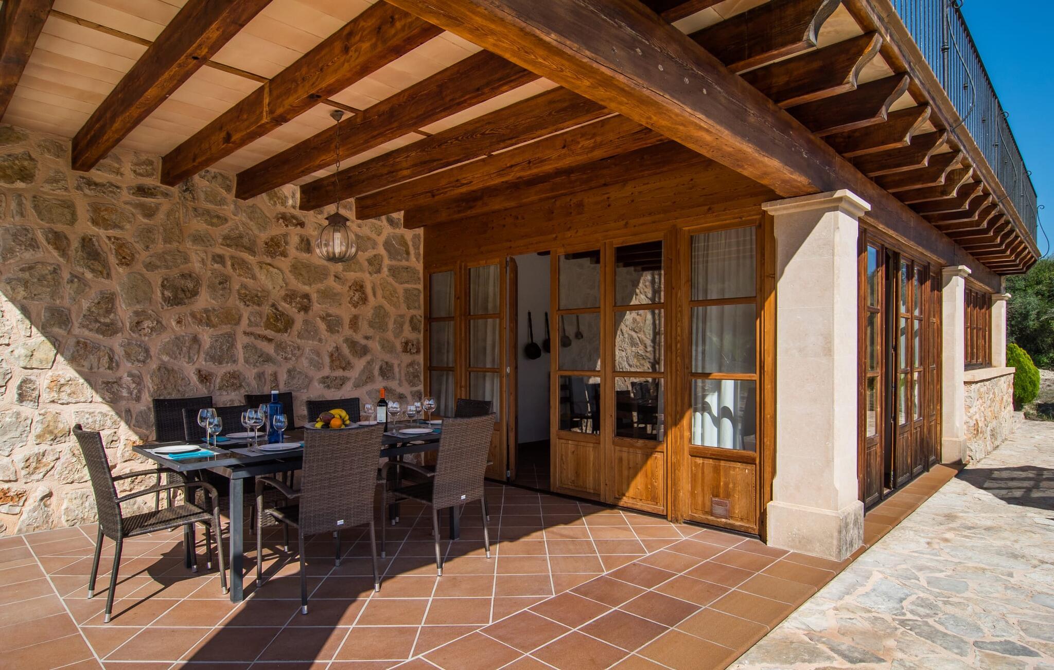 Den statelige naturstensvilla "Horlandis" ligger på en rummelig ejendom midt i de idylliske mallorcanske vidder. Omgivet af skove og marker er det det perfekte sted at slappe af og nyde freden og roen. Ejendommen kan slet ikke overses og tilbyder derfor ubegrænset privatliv. Beliggende i den rummelige naturstensterrasse lover den indbydende infinity-pool at køle af på varme dage og er samtidig stor nok til at svømme et par længder. Efter et hop i det forfriskende vand kan I finde jer tilpas på en af liggestolene omkring poolen og nyde jeres helt idylliske ferie. Hvis det bliver for varmt, finder I masser af skyggefulde pletter på den overdækkede terrasse lige ved siden af huset. Det er også et godt sted at starte dagen med en lækker morgenmad ved det store bord med udsigt over poolen og ejendommen, eller at nyde en skøn grillmiddag om aftenen med et lækkert glas vin og frisklavede delikatesser. Udendørsbelysningen skaber en varm atmosfære, selv når solen er gået ned. Udefra emmer villaen charmen af en rustik sommerhusejendom, som fortsætter inde i huset. Terrassen fører jer direkte til husets køkken. Ligesom mange værelser i villaen er den ekstremt rummelig og kombinerer mallorcansk tradition og moderne bekvemmeligheder. Udover en stor gaskomfur er der også et rummeligt køleskab med fryser og en opvaskemaskine, mens køkkenet i det hele taget er meget praktisk. Et rustikt spisebord og masser af siddepladser inviterer jer til at blive hængende. På samme etage finder I et badeværelse med bruser og toilet. En trappe fører til hjertet af villaen: en kæmpe stue-spisestue med meterhøjt til loftet. Villaens hovedindgang er også placeret her. De synlige tagbjælker i træ samt den rustikke indretning af høj kvalitet skaber en hyggelig atmosfære. Tilbring aftenen på sofaen eller spis ved langbordet med jeres familie og venner. Panoramaudsigten fra den enorme tagterrasse er simpelthen storslået. Tre af de fire soveværelser er også placeret på denne etage, alle med et helt igennem rustikt mallorcansk design. To af værelserne har klassiske himmelsenge i træ, der minder om svundne tider, men er nye og af højeste kvalitet. Et andet soveværelse huser to enkeltsenge. Den klassiske, elegante stil fortsætter også på badeværelserne. Der er to af dem på denne etage - hvoraf den ene er direkte tilgængelig fra et af dobbeltværelserne. På første sal er der endnu et soveværelse med eget badeværelse og stort badekar. Bag huset kan I se Ermita de Bonany hermitage, der ligger på toppen af Puig de Bonany - en 331 hektar stor naturpark. På grund af sin vidunderlige beliggenhed og udseende kaldes kirken også "Bjergkatedralen". Hvis I foretrækker at gå til stranden frem for kirken, er de nærmeste bugter cirka 23 km væk. Der er ingen cafeer eller restauranter på den hvide sandstrand i Torrent des Revellar, men der er uberørt natur. Takket være dens centrale beliggenhed i centrum af øen kan I nå adskillige byer og attraktioner på tværs af Mallorca på mindre end en time. Nabobyen Petra, som er bedst kendt for sine kvalitetsvine, kan nås i bil på kun 15 minutter. Derfra er der kun 15 minutter til smukke Sineu. Det siges at have det bedste farmers market på øen. Det finder sted hver onsdag i Den Gamle By og tiltrækker både lokale og turister i hobetal. Den statelige landvilla “Horlandis” med en kæmpe ejendom ligger helt stille og idyllisk i hjertet af øen. Herfra kan I nyde en vidunderlig panoramaudsigt over det mallorcanske landskab. I kan hurtigt gøre jeres indkøb i de nærliggende feriesteder Petra eller Vilafranca de Bonany, som ligger cirka 15 minutters kørsel fra ejendommen. Den hvide sandstrand Torrent des Revellar med dets utroligt klare vand ligger cirka 23 km væk.