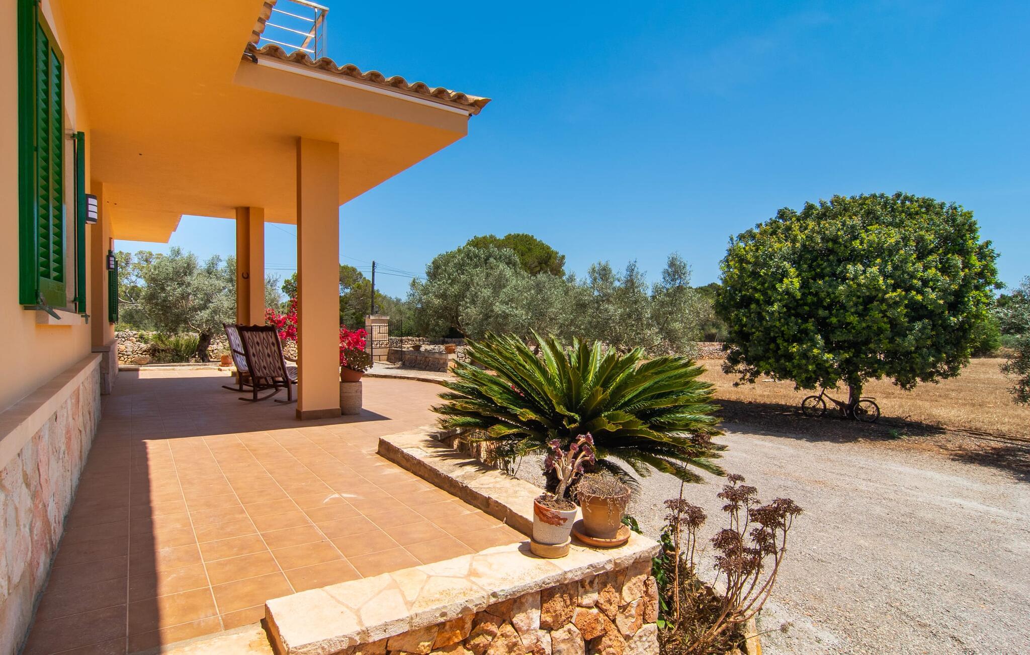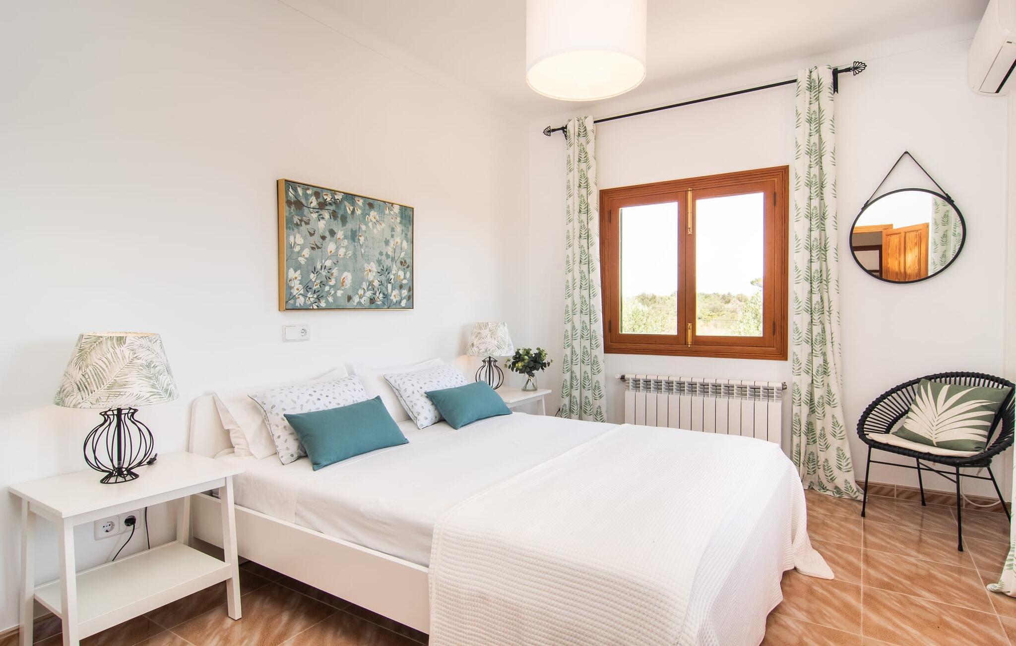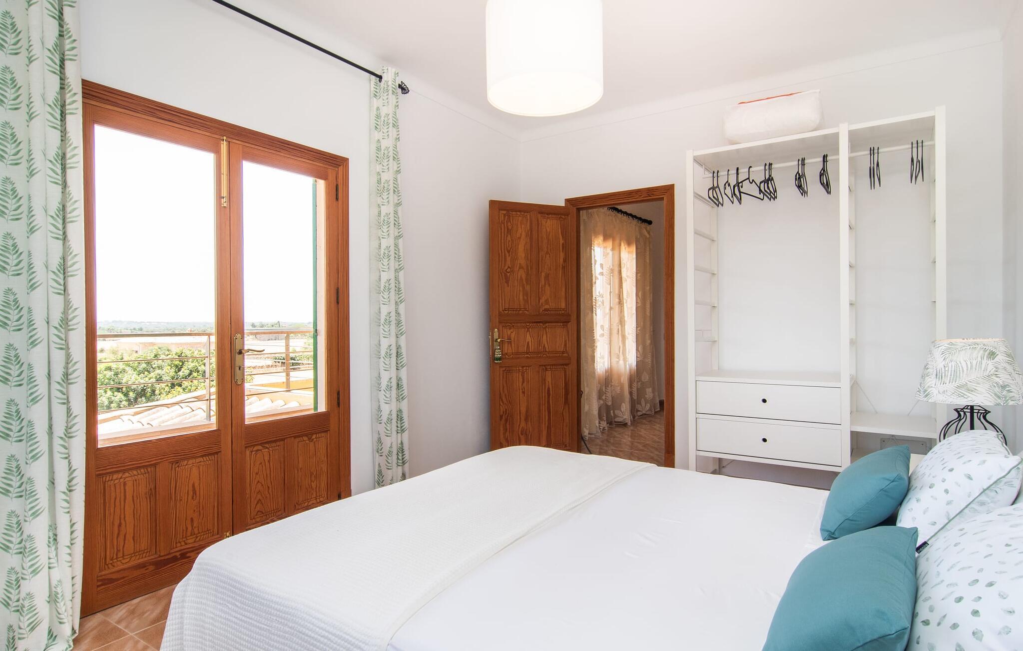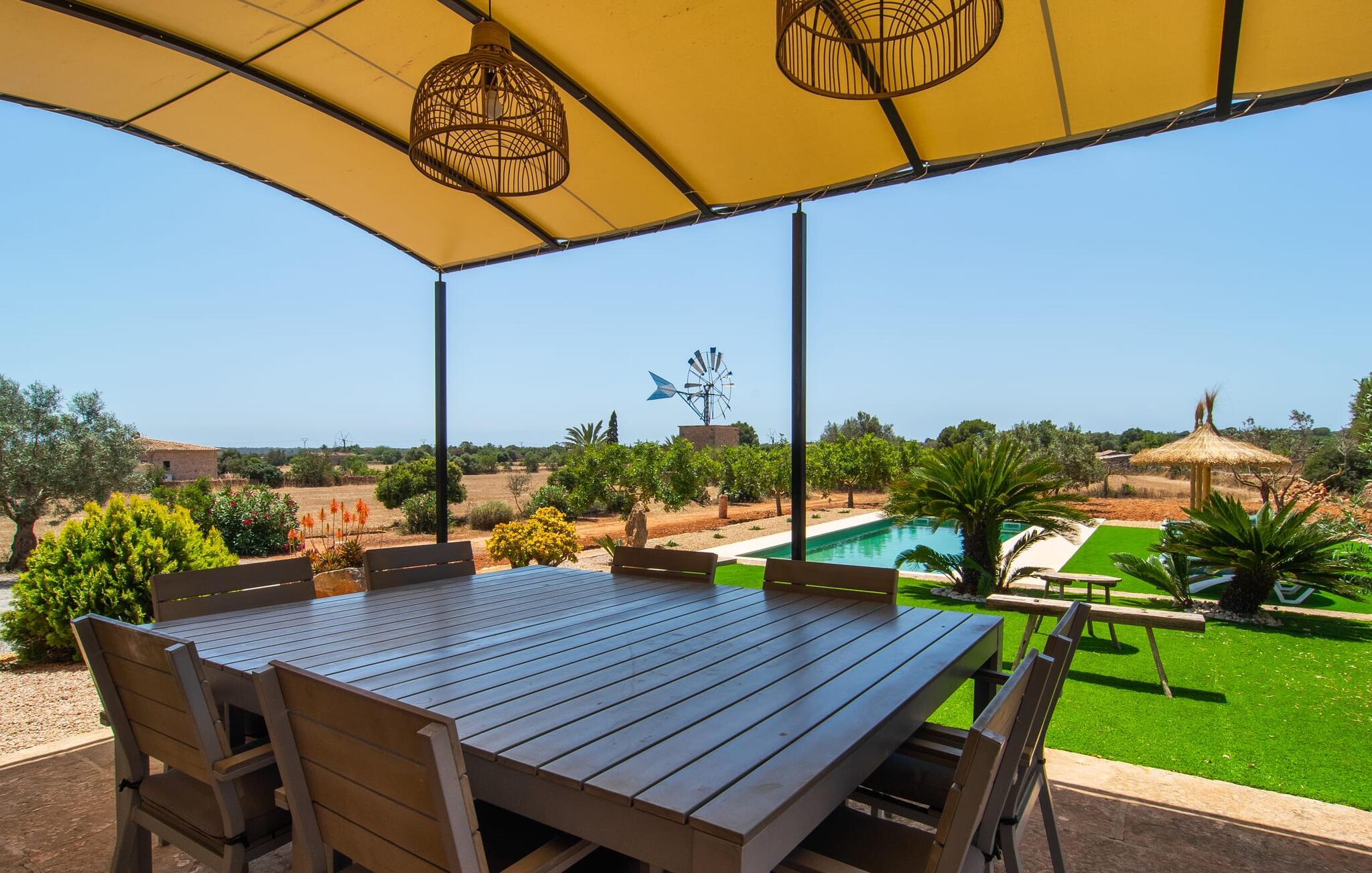 Hvis I værdsætter stort set uberørt og mangfoldig natur, men samtidig ikke vil gå glip af en badeferie, så er den familievenlige bondegård "Hort de Can Rafalet" lige noget for jer. På ejendommen omgivet af middelhavsflora vil I opleve absolut fred. Grønt så langt øjet rækker, med de imponerende saltmarker og megastranden Es Trenc ikke langt væk. Ferieejendommen byder på masser af udendørs plads, herunder en smuk mosaikbeklædt pool med tilhørende solterrasse. Her generer I ingen naboer, og I vil være fuldstændig uovervåget. Nyd aftenen på terrassen i skyggen af Toldo med dens rummelige spiseplads. Uanset om I er tidligt op eller sent op – den runde, delvist overdækkede veranda foran huset med traditionelle gyngestole inviterer jer til fuldt ud at nyde det hyggelige og indbydende feriehus på det sydlige Mallorca og lade blikket vandre. I kan også finde denne afslapning inde i den majestætiske feriegård. Kombinationen af mallorcansk landhusstil med moderne indretningsdetaljer kan betegnes som yderst vellykket. Et rummeligt indgangsparti med middelhavskarakter inviterer jer til at gå på opdagelse i huset. I stueplan finder I den hyggelige tv-stue, det dejligt store køkken-alrum med hyggelig spiseplads og et af de klimatiserede afslapningsrum. Et trendy badeværelse med brusekabine fuldender denne etage. Attraktivt boligtilbehør i landhusstil sætter også dygtige accenter på øverste etage. Det vidner de øvrige tre soveværelser også om, hvoraf to har direkte udgang til solbeskinnede altaner med fortryllende udsigt. To ekstra komfortable badeværelser (med bruser eller badekar) er en del af de forkælende grundfaciliteter i dette smukt beliggende feriehus. Den indvendige indretning af det rummelige feriehus er ideel til flere konstellationer med op til otte rejsende - altså to familier eller flere vennepar. Alle er velkomne på Hort de Can Rafalet! Den indbydende poolgård "Hort de Can Rafalet" imponerer med sin landlige ro mellem oliventræer og en historisk vindmølle, kombineret med den mest moderne komfort. Ejendommen har en førsteklasses beliggenhed i det sydlige Mallorca mellem den lille by Ses Salines og kystbyen Colònia de Sant Jordi. Stedets tiltrækningskraft ligger ikke kun i naturlige vidundere som saltmarkerne, men også i dets nærhed til drømmestranden Es Trenc. Dette er kun 10 minutter væk i bil. Aircondition er tilgængeligt i denne ejendom, men dets brug er begrænset til kl. 21.00 til 09.00. Ellers afregnes gebyret kontant på stedet.
