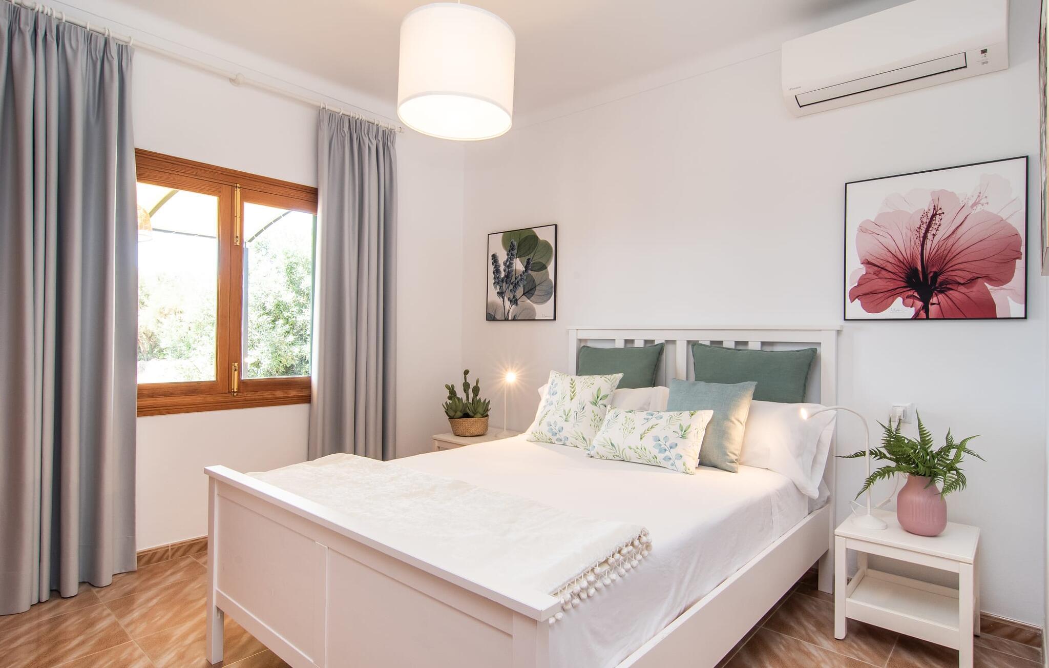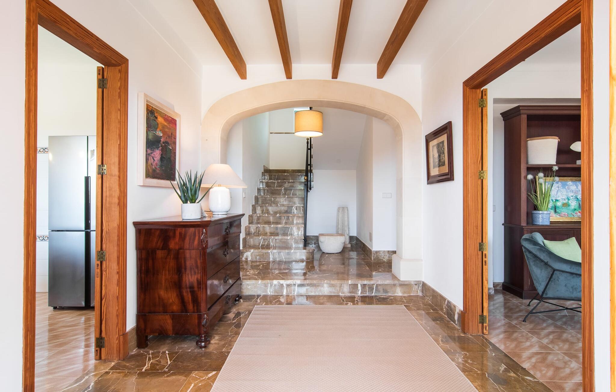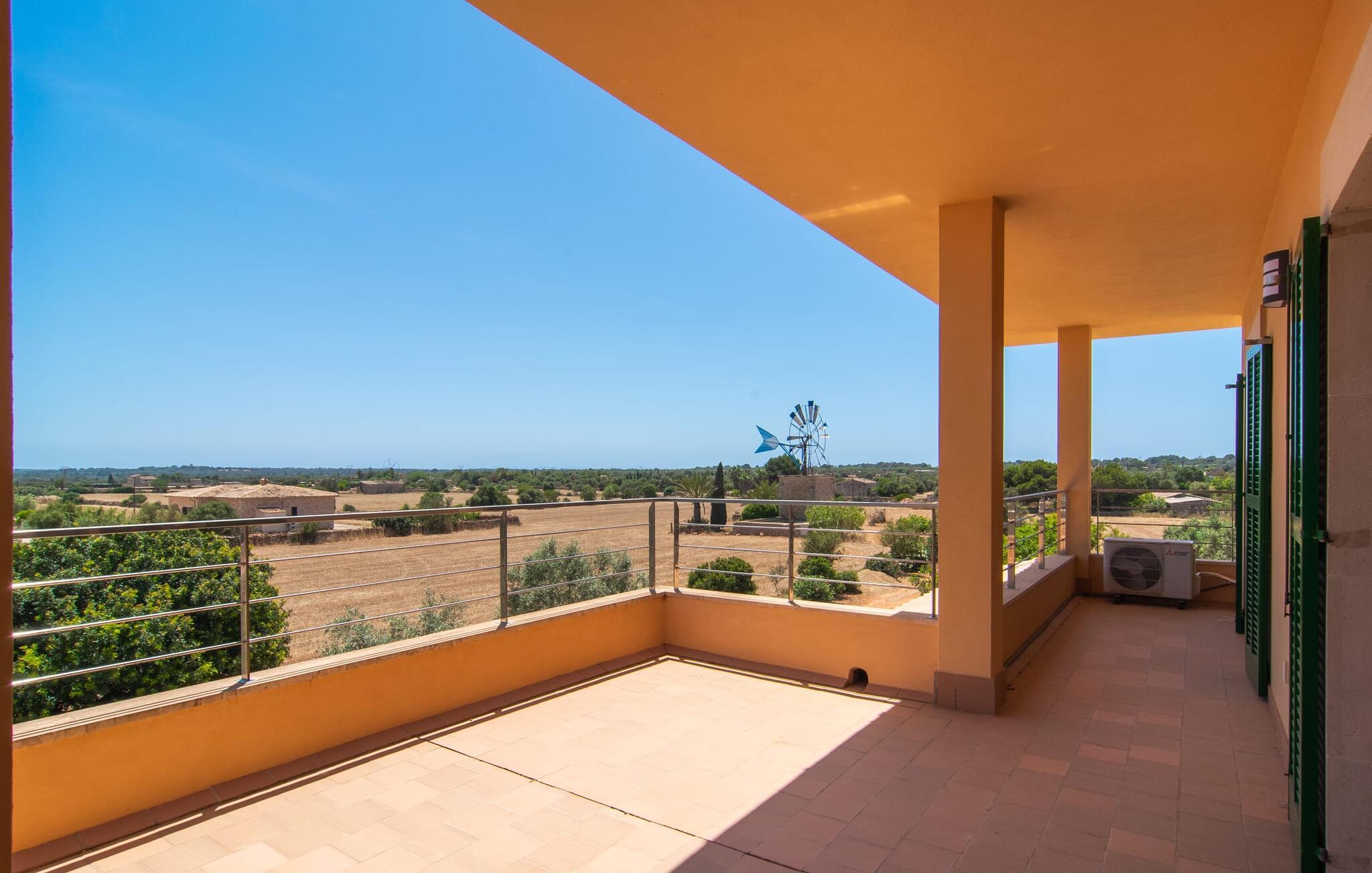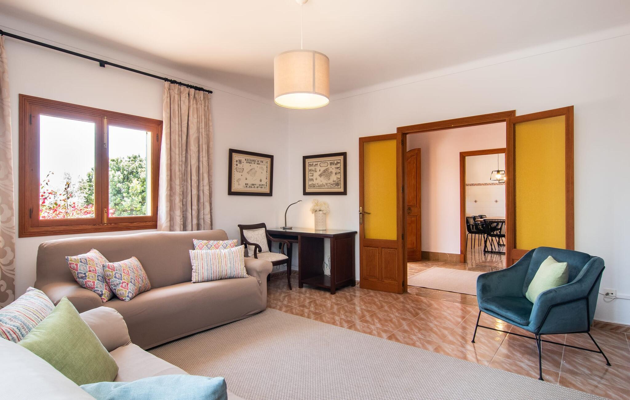 Hvis I værdsætter stort set uberørt og mangfoldig natur, men samtidig ikke vil gå glip af en badeferie, så er den familievenlige bondegård "Hort de Can Rafalet" lige noget for jer. På ejendommen omgivet af middelhavsflora vil I opleve absolut fred. Grønt så langt øjet rækker, med de imponerende saltmarker og megastranden Es Trenc ikke langt væk. Ferieejendommen byder på masser af udendørs plads, herunder en smuk mosaikbeklædt pool med tilhørende solterrasse. Her generer I ingen naboer, og I vil være fuldstændig uovervåget. Nyd aftenen på terrassen i skyggen af Toldo med dens rummelige spiseplads. Uanset om I er tidligt op eller sent op – den runde, delvist overdækkede veranda foran huset med traditionelle gyngestole inviterer jer til fuldt ud at nyde det hyggelige og indbydende feriehus på det sydlige Mallorca og lade blikket vandre. I kan også finde denne afslapning inde i den majestætiske feriegård. Kombinationen af mallorcansk landhusstil med moderne indretningsdetaljer kan betegnes som yderst vellykket. Et rummeligt indgangsparti med middelhavskarakter inviterer jer til at gå på opdagelse i huset. I stueplan finder I den hyggelige tv-stue, det dejligt store køkken-alrum med hyggelig spiseplads og et af de klimatiserede afslapningsrum. Et trendy badeværelse med brusekabine fuldender denne etage. Attraktivt boligtilbehør i landhusstil sætter også dygtige accenter på øverste etage. Det vidner de øvrige tre soveværelser også om, hvoraf to har direkte udgang til solbeskinnede altaner med fortryllende udsigt. To ekstra komfortable badeværelser (med bruser eller badekar) er en del af de forkælende grundfaciliteter i dette smukt beliggende feriehus. Den indvendige indretning af det rummelige feriehus er ideel til flere konstellationer med op til otte rejsende - altså to familier eller flere vennepar. Alle er velkomne på Hort de Can Rafalet! Den indbydende poolgård "Hort de Can Rafalet" imponerer med sin landlige ro mellem oliventræer og en historisk vindmølle, kombineret med den mest moderne komfort. Ejendommen har en førsteklasses beliggenhed i det sydlige Mallorca mellem den lille by Ses Salines og kystbyen Colònia de Sant Jordi. Stedets tiltrækningskraft ligger ikke kun i naturlige vidundere som saltmarkerne, men også i dets nærhed til drømmestranden Es Trenc. Dette er kun 10 minutter væk i bil. Aircondition er tilgængeligt i denne ejendom, men dets brug er begrænset til kl. 21.00 til 09.00. Ellers afregnes gebyret kontant på stedet.