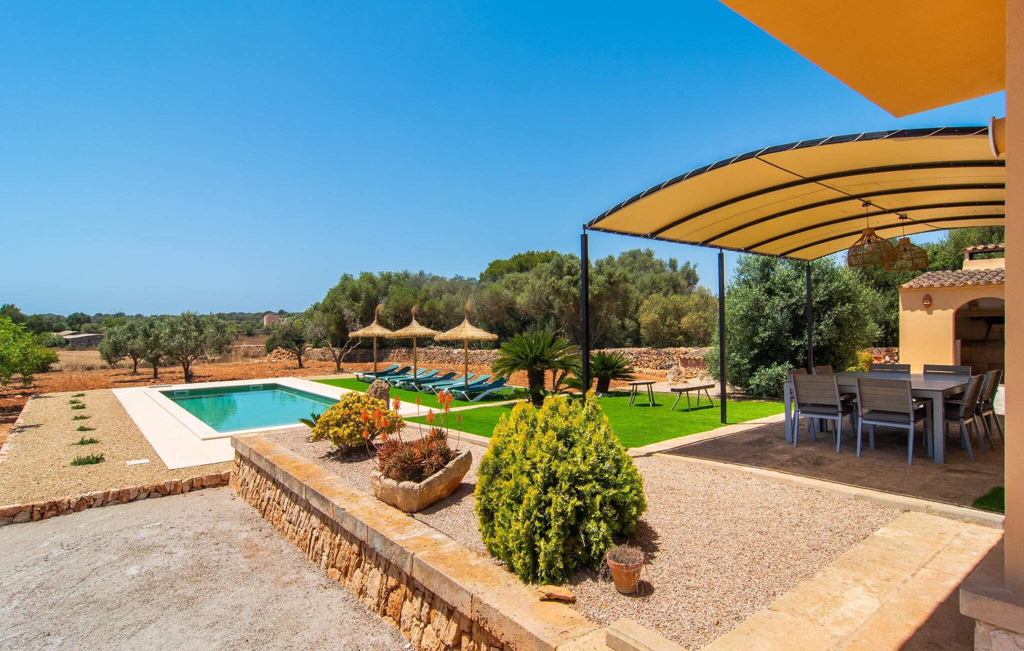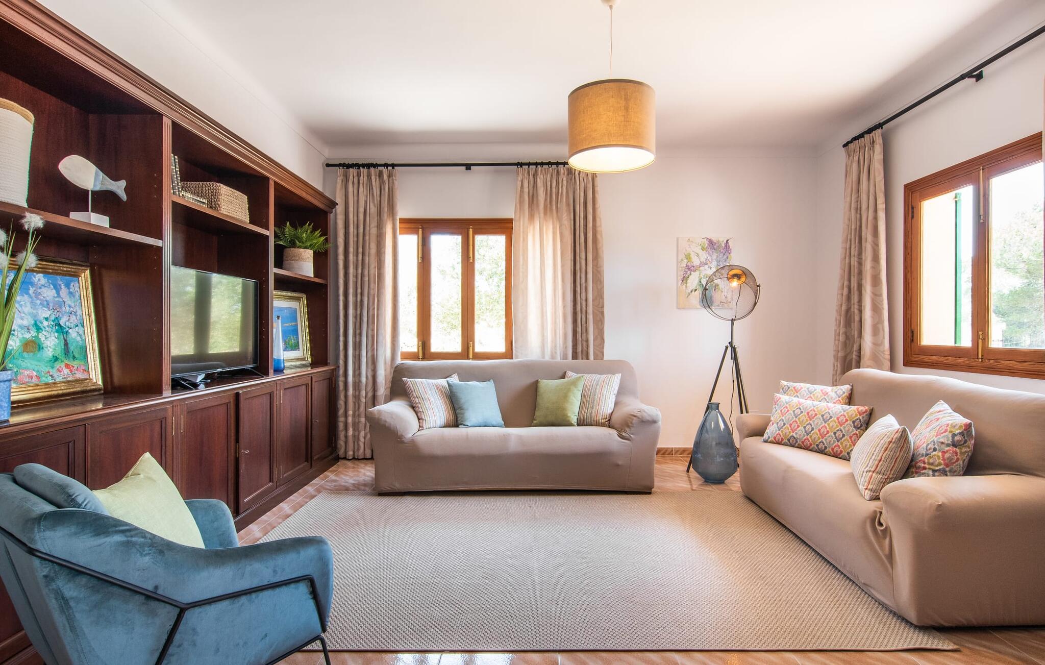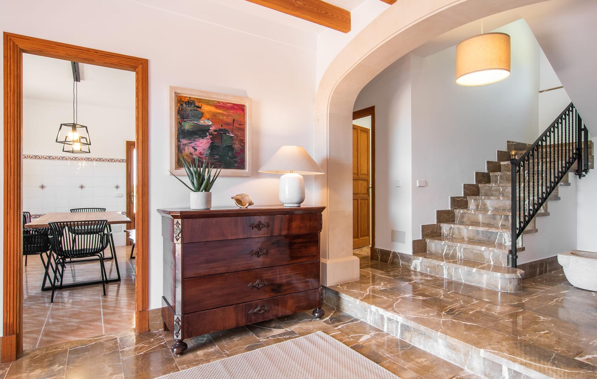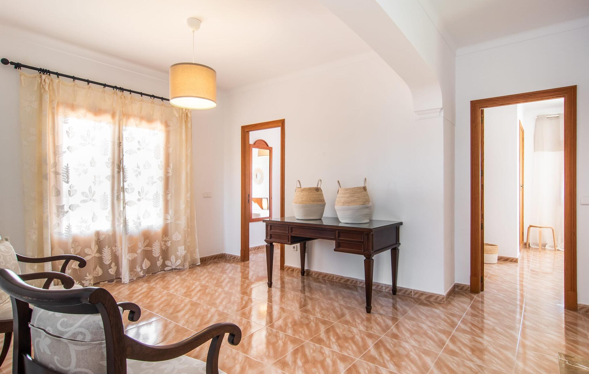 Hvis I værdsætter stort set uberørt og mangfoldig natur, men samtidig ikke vil gå glip af en badeferie, så er den familievenlige bondegård "Hort de Can Rafalet" lige noget for jer. På ejendommen omgivet af middelhavsflora vil I opleve absolut fred. Grønt så langt øjet rækker, med de imponerende saltmarker og megastranden Es Trenc ikke langt væk. Ferieejendommen byder på masser af udendørs plads, herunder en smuk mosaikbeklædt pool med tilhørende solterrasse. Her generer I ingen naboer, og I vil være fuldstændig uovervåget. Nyd aftenen på terrassen i skyggen af Toldo med dens rummelige spiseplads. Uanset om I er tidligt op eller sent op – den runde, delvist overdækkede veranda foran huset med traditionelle gyngestole inviterer jer til fuldt ud at nyde det hyggelige og indbydende feriehus på det sydlige Mallorca og lade blikket vandre. I kan også finde denne afslapning inde i den majestætiske feriegård. Kombinationen af mallorcansk landhusstil med moderne indretningsdetaljer kan betegnes som yderst vellykket. Et rummeligt indgangsparti med middelhavskarakter inviterer jer til at gå på opdagelse i huset. I stueplan finder I den hyggelige tv-stue, det dejligt store køkken-alrum med hyggelig spiseplads og et af de klimatiserede afslapningsrum. Et trendy badeværelse med brusekabine fuldender denne etage. Attraktivt boligtilbehør i landhusstil sætter også dygtige accenter på øverste etage. Det vidner de øvrige tre soveværelser også om, hvoraf to har direkte udgang til solbeskinnede altaner med fortryllende udsigt. To ekstra komfortable badeværelser (med bruser eller badekar) er en del af de forkælende grundfaciliteter i dette smukt beliggende feriehus. Den indvendige indretning af det rummelige feriehus er ideel til flere konstellationer med op til otte rejsende - altså to familier eller flere vennepar. Alle er velkomne på Hort de Can Rafalet! Den indbydende poolgård "Hort de Can Rafalet" imponerer med sin landlige ro mellem oliventræer og en historisk vindmølle, kombineret med den mest moderne komfort. Ejendommen har en førsteklasses beliggenhed i det sydlige Mallorca mellem den lille by Ses Salines og kystbyen Colònia de Sant Jordi. Stedets tiltrækningskraft ligger ikke kun i naturlige vidundere som saltmarkerne, men også i dets nærhed til drømmestranden Es Trenc. Dette er kun 10 minutter væk i bil. Aircondition er tilgængeligt i denne ejendom, men dets brug er begrænset til kl. 21.00 til 09.00. Ellers afregnes gebyret kontant på stedet.