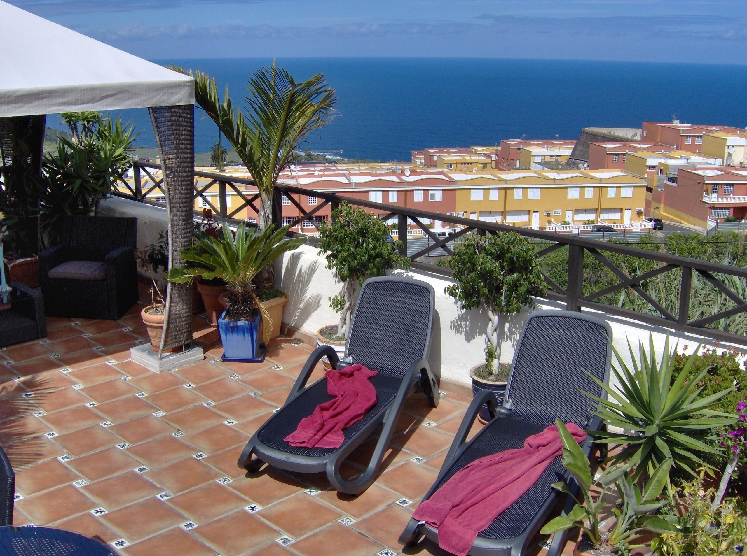 Modernes Wohnen im rustikalen Ambiente. Unsere Ferienwohnung im obersten Stockwerk bietet einen herrlichen Blick auf den Atlantik. Die im modernen Stil eingerichtete Ferienwohnung hat ein großzügig gestaltetes Wohnzimmer, eine gut ausgestattete direkt ans Wohnzimmer anschließende Küche, ein Schlafzimmer mit französichem Bett (150 cm) sowie ein Bad mit Toilette, Waschbecken, Bidet und Zwei-Personen-Sitzdusche. Vom privaten Balkon bietet sich ein freier Blick auf das Meer und das nahe gelegene Gebirge (kein Teide-Blick). Natürlich kann auch die große Gemeinschafts-Dachterrasse genutzt werden. Der Flachbildfernseher verfügt über Satellitenempfang mit ca. 450 internationalen Sendern- darunter alle frei empfangbaren deutschen Kanäle - sowie durch Umschalten auf der Fernbedienung über DVB-T-Empfang mit den gängigen spanischen Fernsehsendern. Zudem kann auf Anfrage kostenlos Netflix bereitgestellt werden. Unser Haus verfügt über Internetanschluss per Glasfaser und in allen Unterkünften sowie auf der Dachterrasse steht sehr gut funktionierendes W-LAN zur kostenlosen Verfügung.