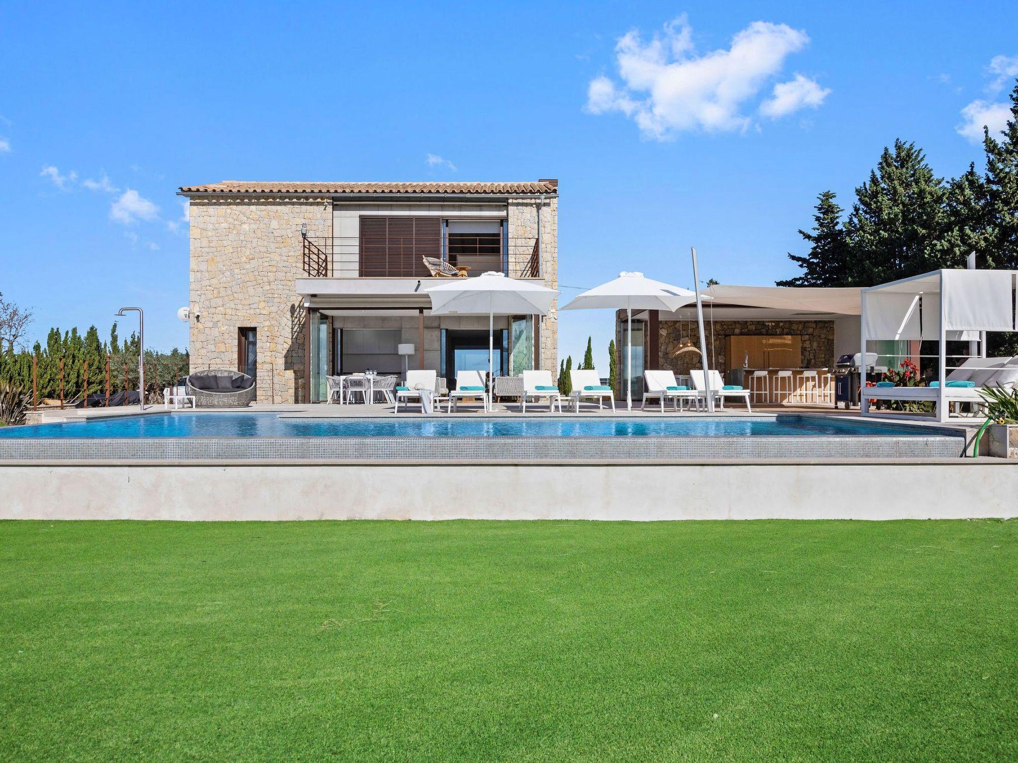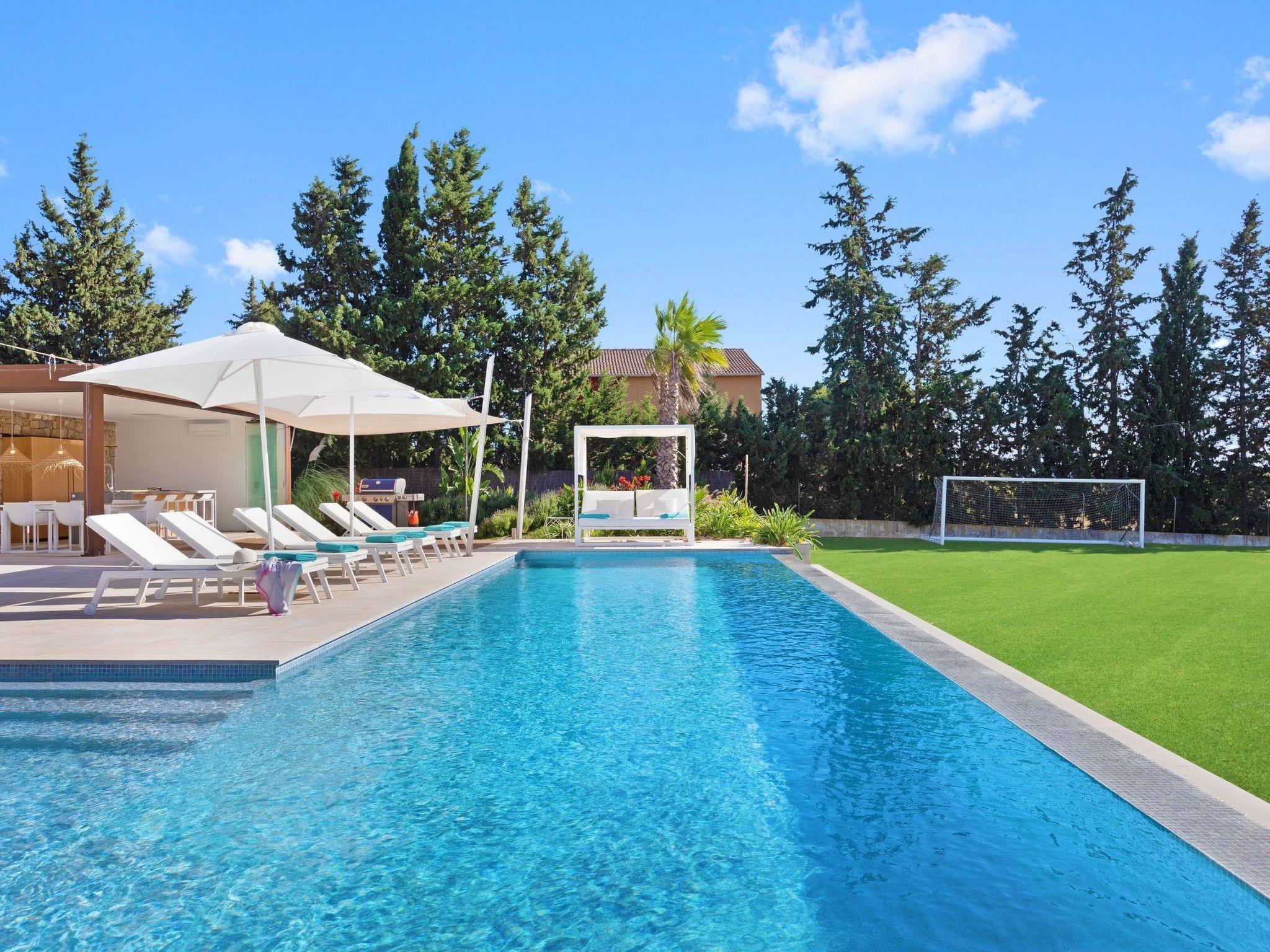 Outdoors, the property opens up to a world of leisure and relaxation. The spacious terrace invites you to soak up sunny days with its luxurious sun loungers, chill-out area and outdoor dining area perfect for al fresco dining. The outdoor kitchen, complemented by a bar and barbecue bar, promises memorable evenings under the Mallorcan sky. The heated swimming pool and children's football pitch add further entertainment and fun options to your stay.