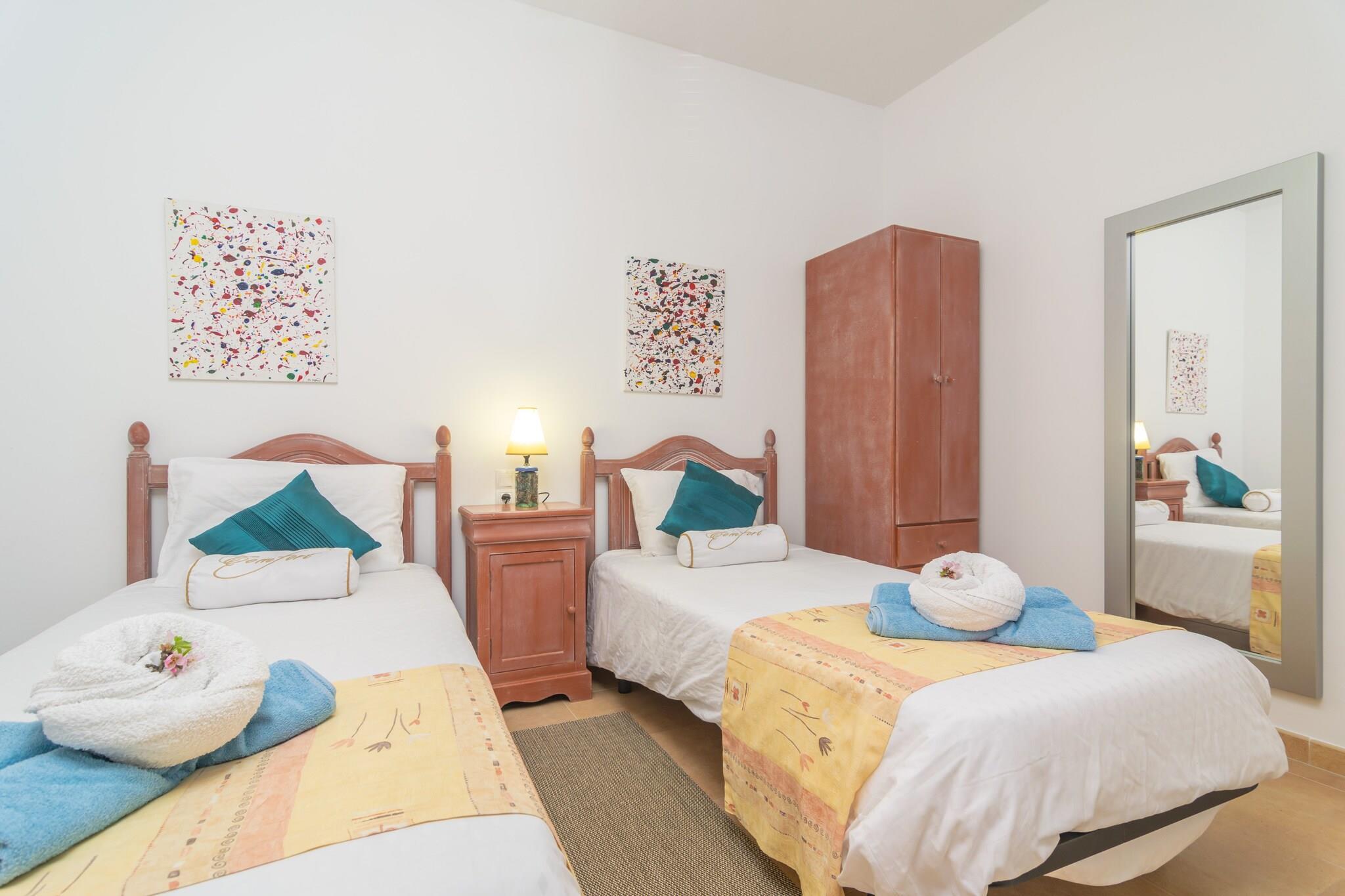 Stue, Stue, Køkken(kaffemaskine, ovn), soveværelse(2x enkeltseng), soveværelse(dobbeltseng), badeværelse, badeværelse, komfur, mikrobølgeovn, opvaskemaskine , køle-fryseskab, bruser, håndvask, håndvask, toilet, toilet, klimaanlæg, grill, swimmingpool, barneseng, barnestol