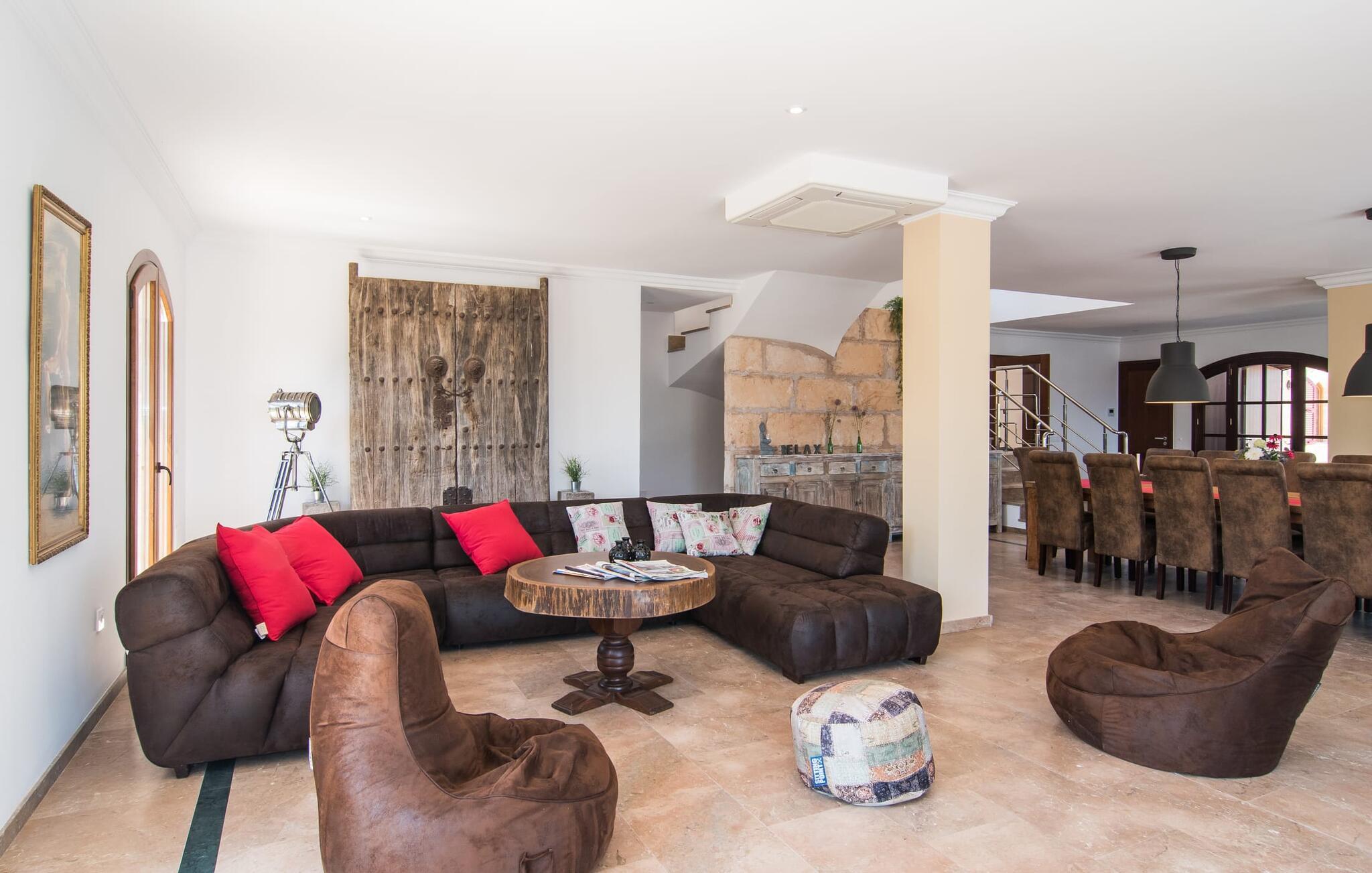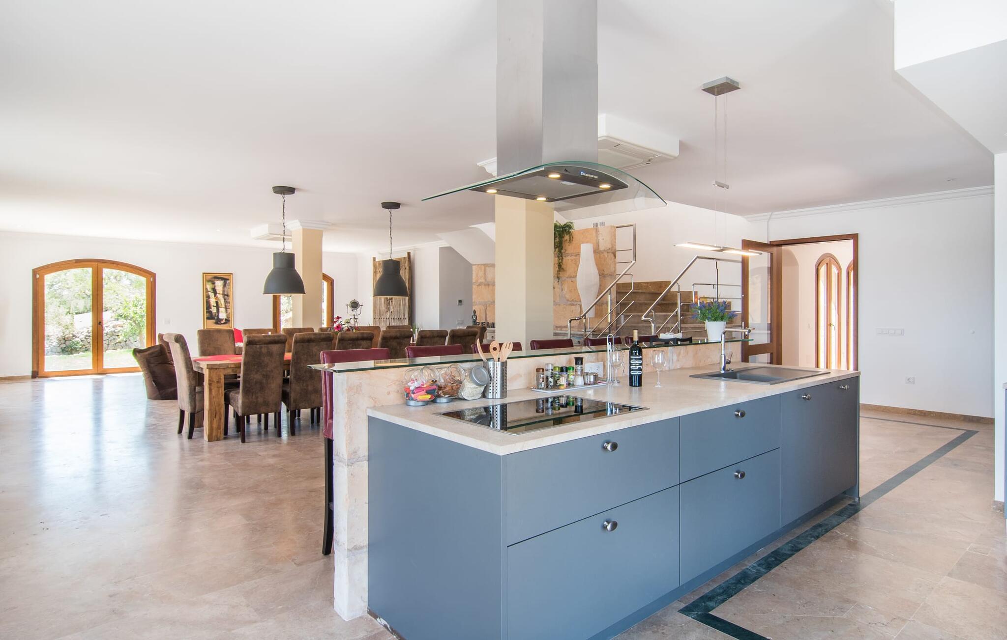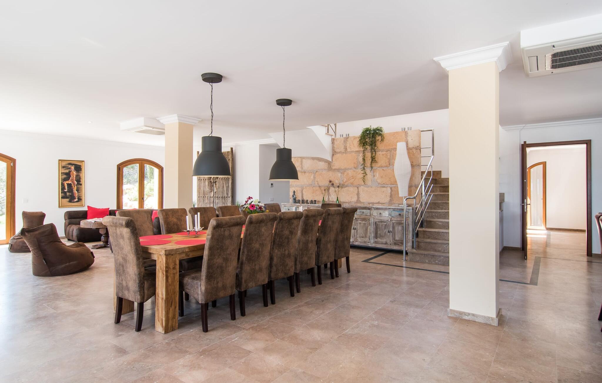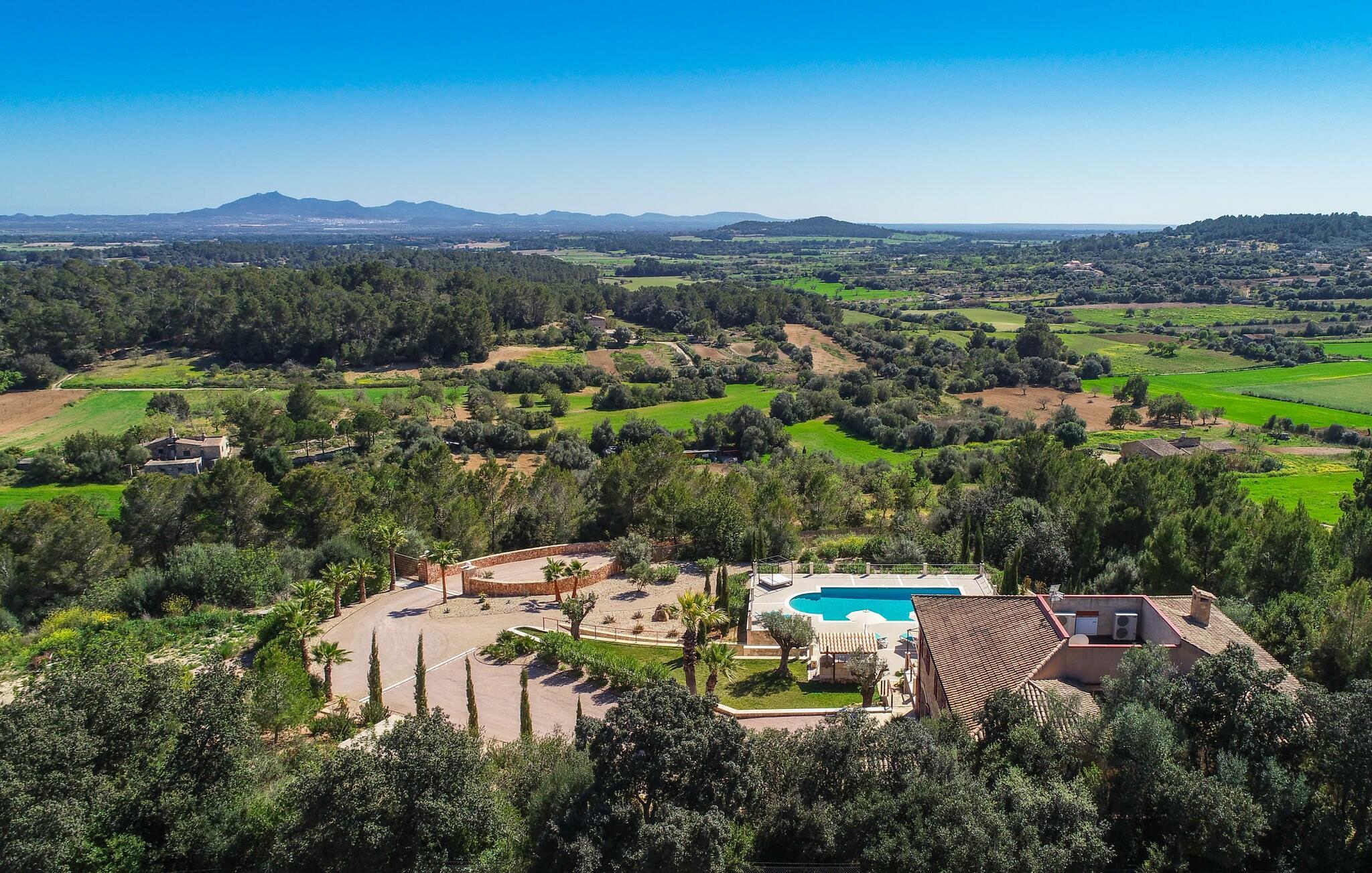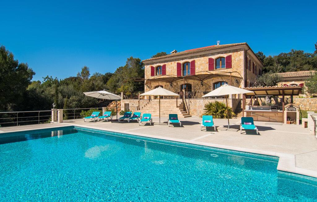 Velkommen til jeres udsøgte feriehus, Villa "Inka" - beliggende på det sydlige Mallorca i den lille kommune Porreres. Denne sublime, okkerfarvede juvel rejser sig over 28.000 m² af næsten uberørt natur, som var den hugget i sten. Den rummelige ejendom med en parklignende have byder på plads nok til store familier og rejsegrupper. En stærk træbestand, frodige palmer og store grønne græsplæner pryder ejendommen - Moder Natur var meget generøs her. At kigge ind i den tilsyneladende uendelige afstand tillader jeres tanker at vandre, og I glemmer alt, jeg mener alt, omkring jer - tro modtoet: fri hverdag, ferie på! I krydser indgangen til villaen via en landevej typisk for Mallorca og parkerer på grusparkeringspladsen, som har ti parkeringspladser. Nu er det tid til at komme ind! Når I er ankommet, giver den overdækkede terrasse med en enestående udsigt over poolen skygge til jeres daglige samvær og grill - og der er endda en pizzaovn i udekøkkenet! Få skridt fra den smukke villa tager jer direkte til den azurblå pool med panoramaudsigt, som allerede venter jer under den mallorcanske sol. Omkring poolen inviterer komfortable liggestole og en udendørs dagseng af høj kvalitet jer til at tage en eftermiddagslur eller læse jeres yndlingsbog. Majestætisk boligareal på utrolige 600 m². De store vinduer, nogle med smukke røde skodder, tjener som privatliv og solafskærmning og dekorerer den detaljerede udvendige facade. Den harmonisk koordinerede farvepalet fra sand til røde toner løber gennem villaens elegante interiør. På øverste etage er der fem lyse og klimatiserede soveoaser, hver med en dobbeltseng. Elegante stoffer omslutter jeres himmelske soveområde og garanterer søde drømme og afslappende søvn. Udover tv, loftsventilatorer og luksuriøse badeværelser kan I nyde komfort i topklasse. Det sjette soveværelse med en luksuriøs dobbeltseng (1,40 x 1,90 m) og et tilstødende badeværelse er i stueetagen. Hvert soveværelse har nok opbevaringsplads til jeres ejendele, og I kan trygt opbevare jeres værdigenstande i pengeskabet. Den storslåede og førsteklasses stue-spisestue udgør hjertet i drømmevillaen. Det er her I mødes og har sjove stunder som en stor gruppe eller familie. Det rustikke chikke i det luksuriøse lædersofa- og lænestollandskab af høj kvalitet er bevis på perfekt smag med en garanteret behagelig atmosfære. Det kolde-varme klimaanlæg garanterer en perfekt rumtemperatur. Det åbne luksuskøkken med kogeø byder på scene til show cooking. Alle kan frit vælge deres plads på de elegante barstole eller ved det lange spisebord. Villaen "Inka" har endnu flere ekstraudstyr i vente til dig: Det absolutte højdepunkt er det separate, moderne billardrum. Elsker I lidt mere action? Hvert spil ved bordfodboldbordet gør jer i godt humør og har en masse sjov. Hvis I kan lide at holde jer i form med fitnessudstyr, kan I gøre det i fitnessrummet. Om tirsdagen kan I køre til det ugentlige marked i den rolige by Porreres via den nærliggende landevej, som let kan høres afhængig af vindforholdene. I kan finde alt her: solmodnet frugt og grønt, god vin, men også husholdningsartikler og tøj. Oplev markedets travlhed i de små gader og nyd de lokales varme gæstfrihed på de mange restauranter og caféer. Turistattraktioner, der er værd at se, omfatter sognekirken Senyora de Cosolació, bygget i 1600-tallet, og Santuari di Monti-Sion-klosteret, omkring 4 km væk. I kan nå klosteret til fods eller i bil. Der kan I få en uforglemmelig udsigt over øen. Og vi har også noget at byde på til alle dem, der elsker havet – nemlig en anbefaling til en forlænget strandtur. I vil hurtigt finde lettelse: mange smukke strande kan nås på cirka 10 minutter. 20 minutter i bil. Den fantastiske villa "Inka" med pool er beliggende i den sydlige del af Mallorca - i den rolige kommune Porreres. Ejendommen strækker sig over hele 28.000 m² med panoramaudsigt over det idylliske landskab. Landevejen fører jer direkte til det ugentlige marked i Porreres, supermarkeder er i umiddelbar nærhed og de smukkeste strande på denne populære ø kan nås på cirka 10 minutter. 20 minutter i bil.