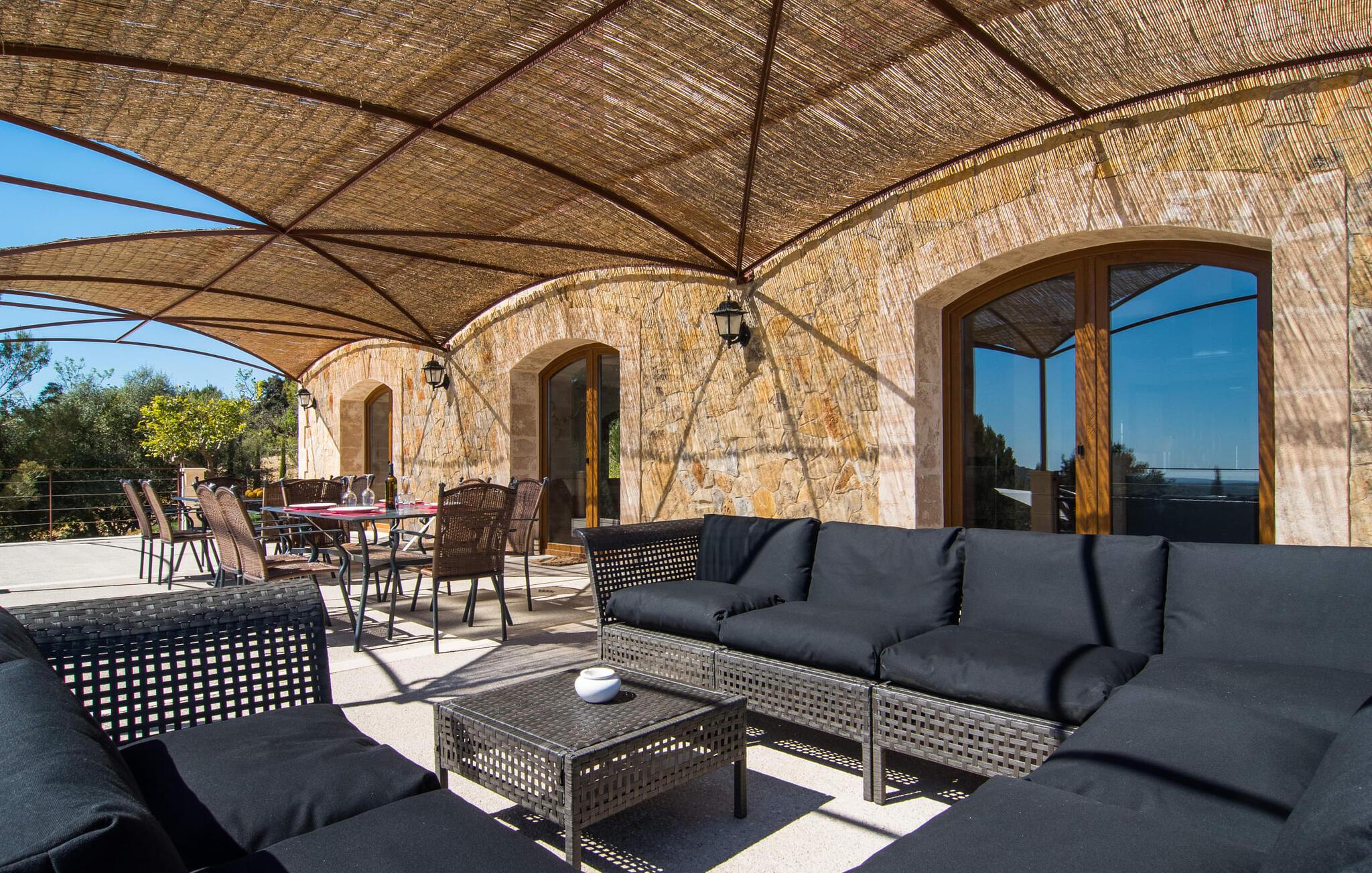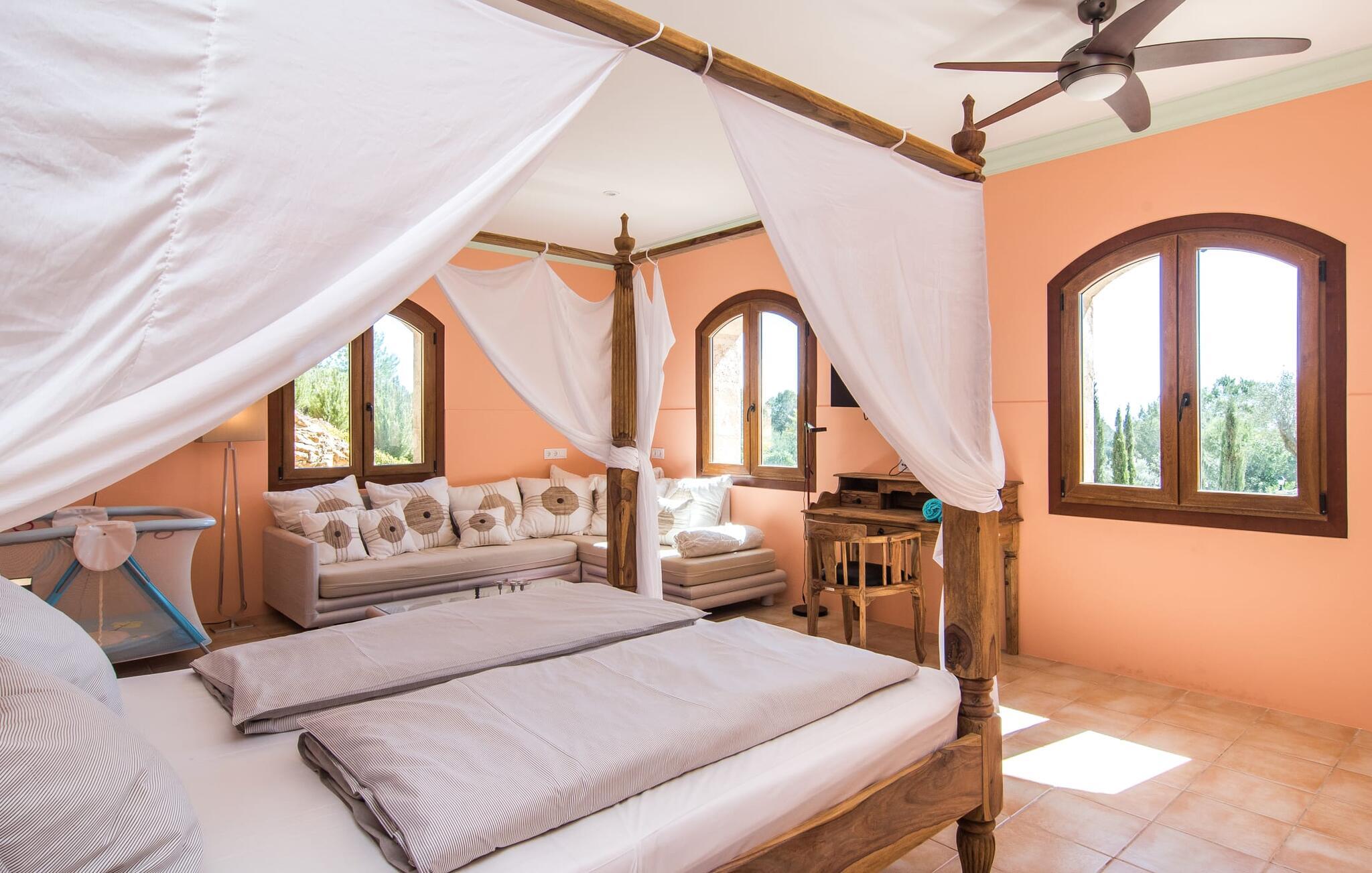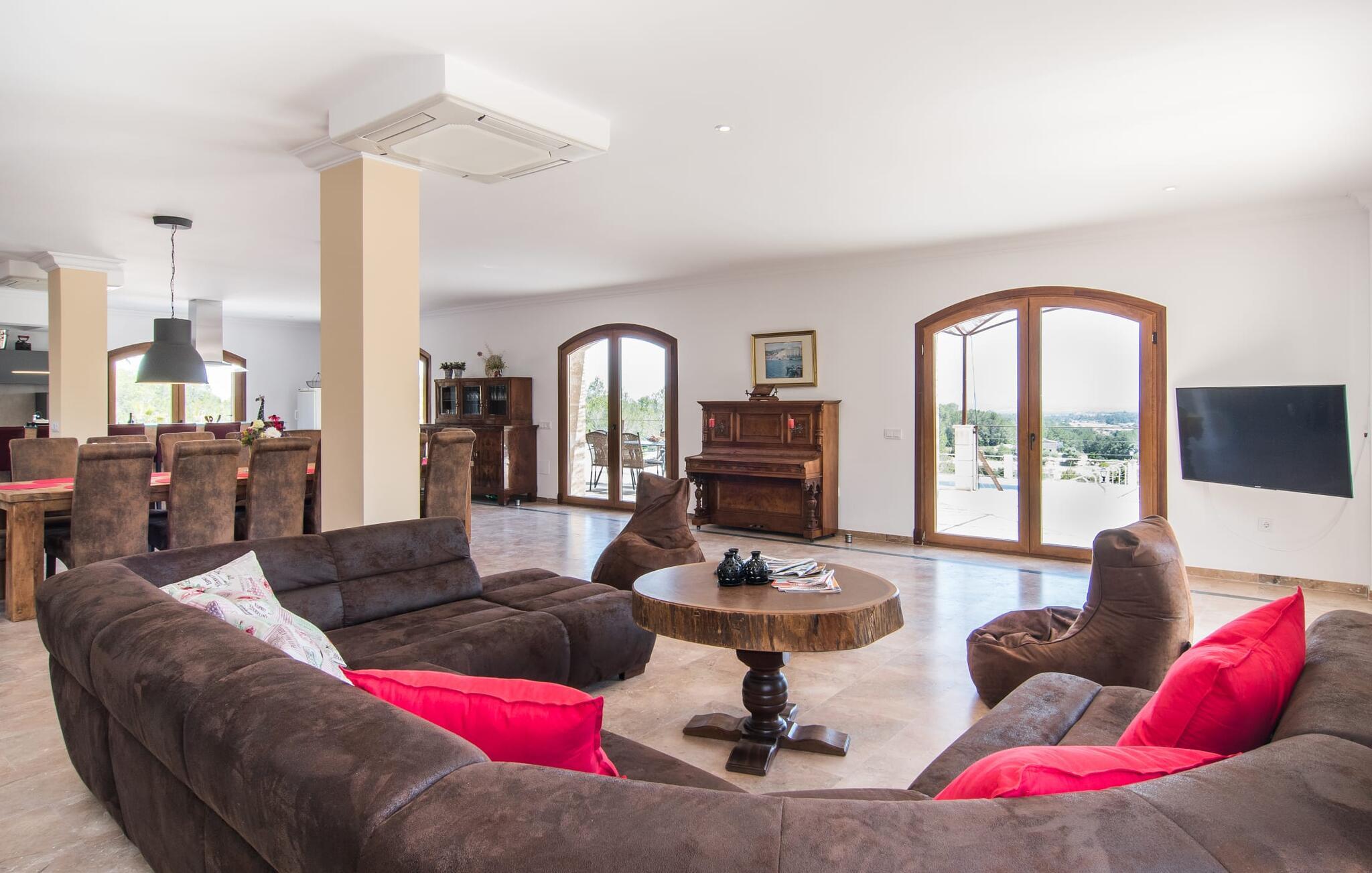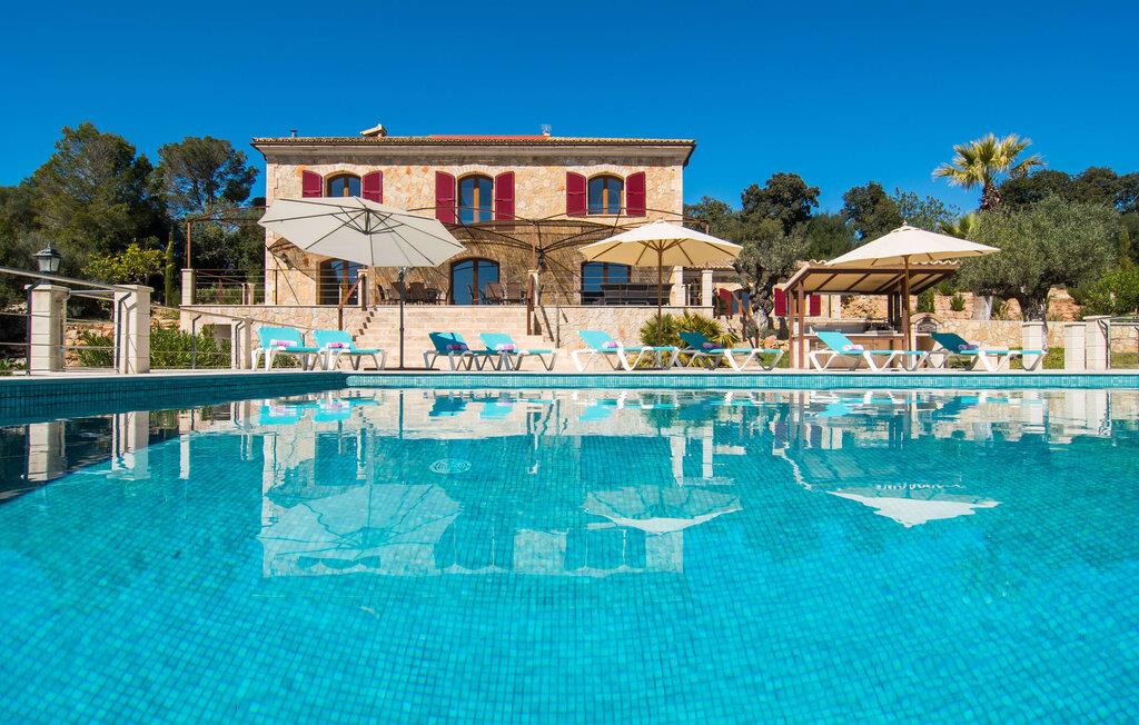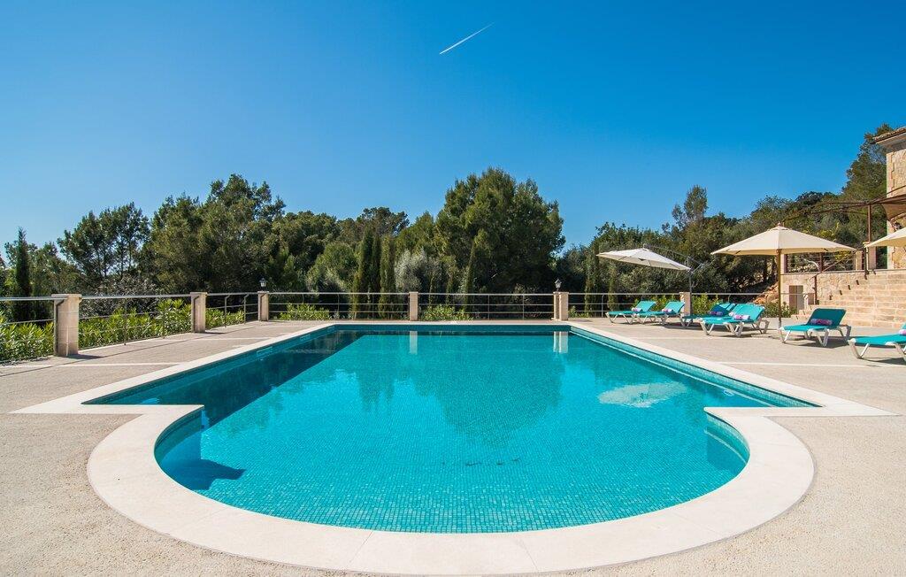 Velkommen til jeres udsøgte feriehus, Villa "Inka" - beliggende på det sydlige Mallorca i den lille kommune Porreres. Denne sublime, okkerfarvede juvel rejser sig over 28.000 m² af næsten uberørt natur, som var den hugget i sten. Den rummelige ejendom med en parklignende have byder på plads nok til store familier og rejsegrupper. En stærk træbestand, frodige palmer og store grønne græsplæner pryder ejendommen - Moder Natur var meget generøs her. At kigge ind i den tilsyneladende uendelige afstand tillader jeres tanker at vandre, og I glemmer alt, jeg mener alt, omkring jer - tro modtoet: fri hverdag, ferie på! I krydser indgangen til villaen via en landevej typisk for Mallorca og parkerer på grusparkeringspladsen, som har ti parkeringspladser. Nu er det tid til at komme ind! Når I er ankommet, giver den overdækkede terrasse med en enestående udsigt over poolen skygge til jeres daglige samvær og grill - og der er endda en pizzaovn i udekøkkenet! Få skridt fra den smukke villa tager jer direkte til den azurblå pool med panoramaudsigt, som allerede venter jer under den mallorcanske sol. Omkring poolen inviterer komfortable liggestole og en udendørs dagseng af høj kvalitet jer til at tage en eftermiddagslur eller læse jeres yndlingsbog. Majestætisk boligareal på utrolige 600 m². De store vinduer, nogle med smukke røde skodder, tjener som privatliv og solafskærmning og dekorerer den detaljerede udvendige facade. Den harmonisk koordinerede farvepalet fra sand til røde toner løber gennem villaens elegante interiør. På øverste etage er der fem lyse og klimatiserede soveoaser, hver med en dobbeltseng. Elegante stoffer omslutter jeres himmelske soveområde og garanterer søde drømme og afslappende søvn. Udover tv, loftsventilatorer og luksuriøse badeværelser kan I nyde komfort i topklasse. Det sjette soveværelse med en luksuriøs dobbeltseng (1,40 x 1,90 m) og et tilstødende badeværelse er i stueetagen. Hvert soveværelse har nok opbevaringsplads til jeres ejendele, og I kan trygt opbevare jeres værdigenstande i pengeskabet. Den storslåede og førsteklasses stue-spisestue udgør hjertet i drømmevillaen. Det er her I mødes og har sjove stunder som en stor gruppe eller familie. Det rustikke chikke i det luksuriøse lædersofa- og lænestollandskab af høj kvalitet er bevis på perfekt smag med en garanteret behagelig atmosfære. Det kolde-varme klimaanlæg garanterer en perfekt rumtemperatur. Det åbne luksuskøkken med kogeø byder på scene til show cooking. Alle kan frit vælge deres plads på de elegante barstole eller ved det lange spisebord. Villaen "Inka" har endnu flere ekstraudstyr i vente til dig: Det absolutte højdepunkt er det separate, moderne billardrum. Elsker I lidt mere action? Hvert spil ved bordfodboldbordet gør jer i godt humør og har en masse sjov. Hvis I kan lide at holde jer i form med fitnessudstyr, kan I gøre det i fitnessrummet. Om tirsdagen kan I køre til det ugentlige marked i den rolige by Porreres via den nærliggende landevej, som let kan høres afhængig af vindforholdene. I kan finde alt her: solmodnet frugt og grønt, god vin, men også husholdningsartikler og tøj. Oplev markedets travlhed i de små gader og nyd de lokales varme gæstfrihed på de mange restauranter og caféer. Turistattraktioner, der er værd at se, omfatter sognekirken Senyora de Cosolació, bygget i 1600-tallet, og Santuari di Monti-Sion-klosteret, omkring 4 km væk. I kan nå klosteret til fods eller i bil. Der kan I få en uforglemmelig udsigt over øen. Og vi har også noget at byde på til alle dem, der elsker havet – nemlig en anbefaling til en forlænget strandtur. I vil hurtigt finde lettelse: mange smukke strande kan nås på cirka 10 minutter. 20 minutter i bil. Den fantastiske villa "Inka" med pool er beliggende i den sydlige del af Mallorca - i den rolige kommune Porreres. Ejendommen strækker sig over hele 28.000 m² med panoramaudsigt over det idylliske landskab. Landevejen fører jer direkte til det ugentlige marked i Porreres, supermarkeder er i umiddelbar nærhed og de smukkeste strande på denne populære ø kan nås på cirka 10 minutter. 20 minutter i bil.