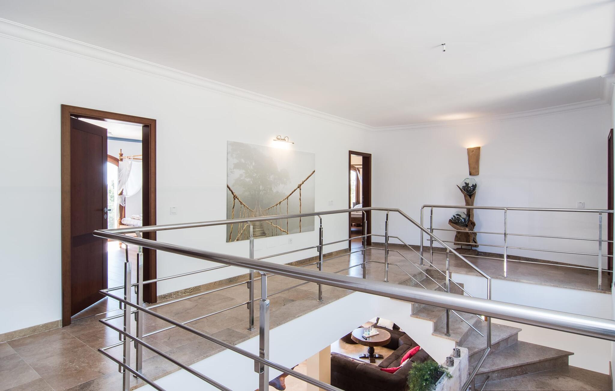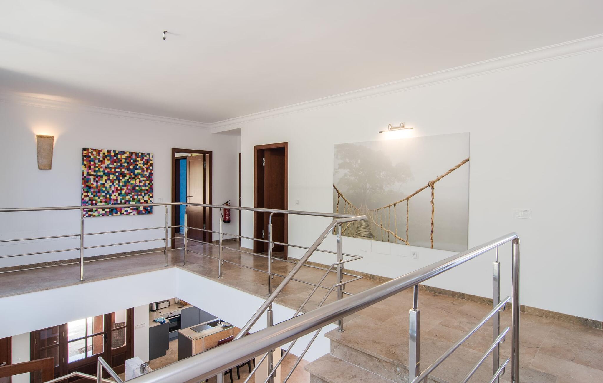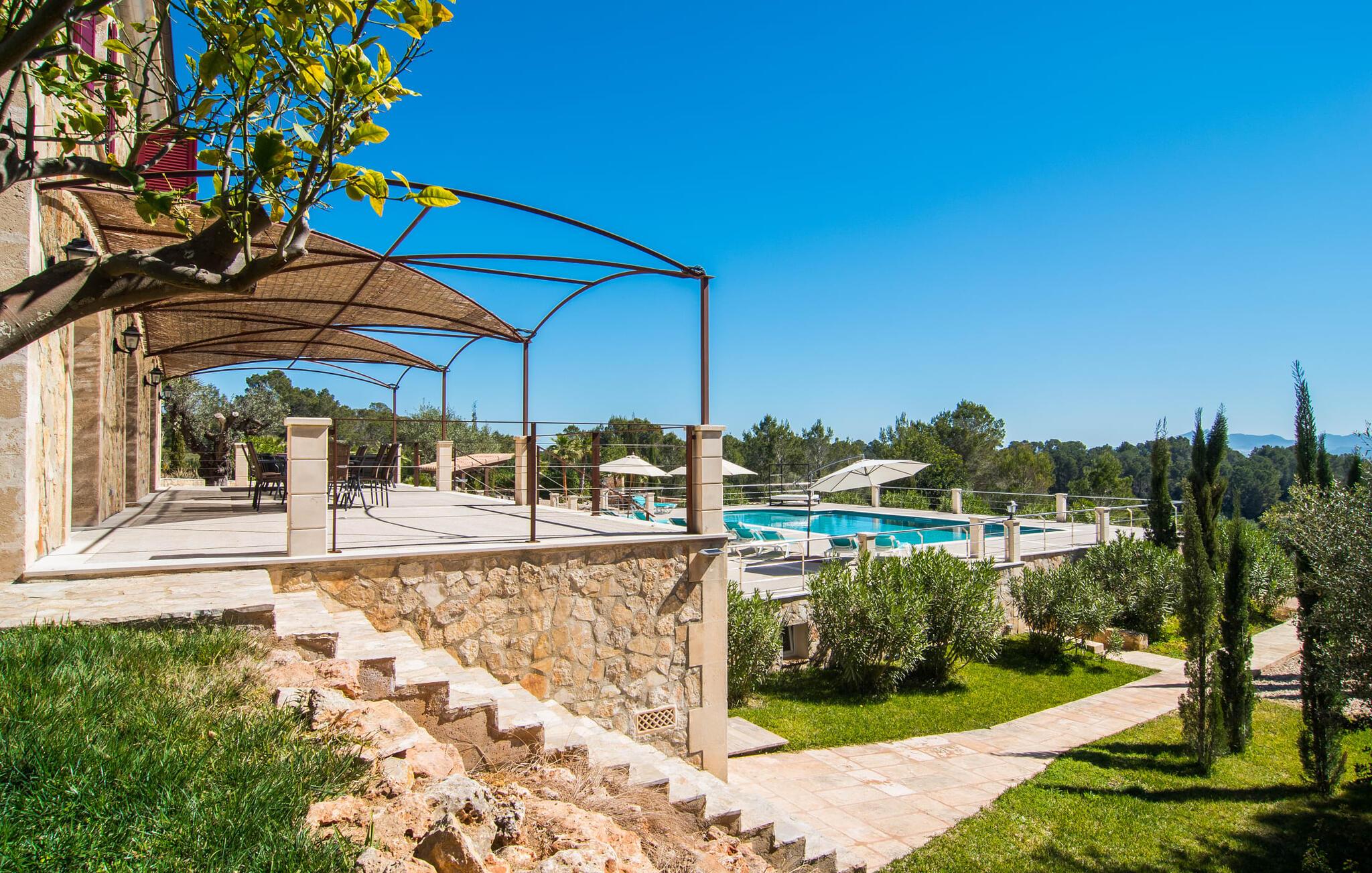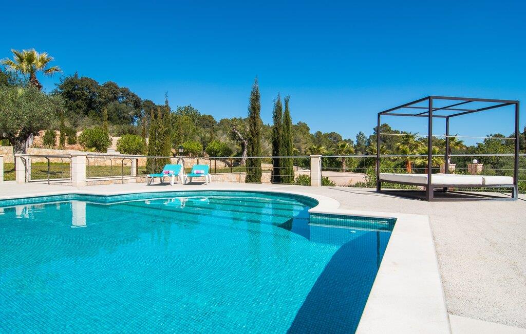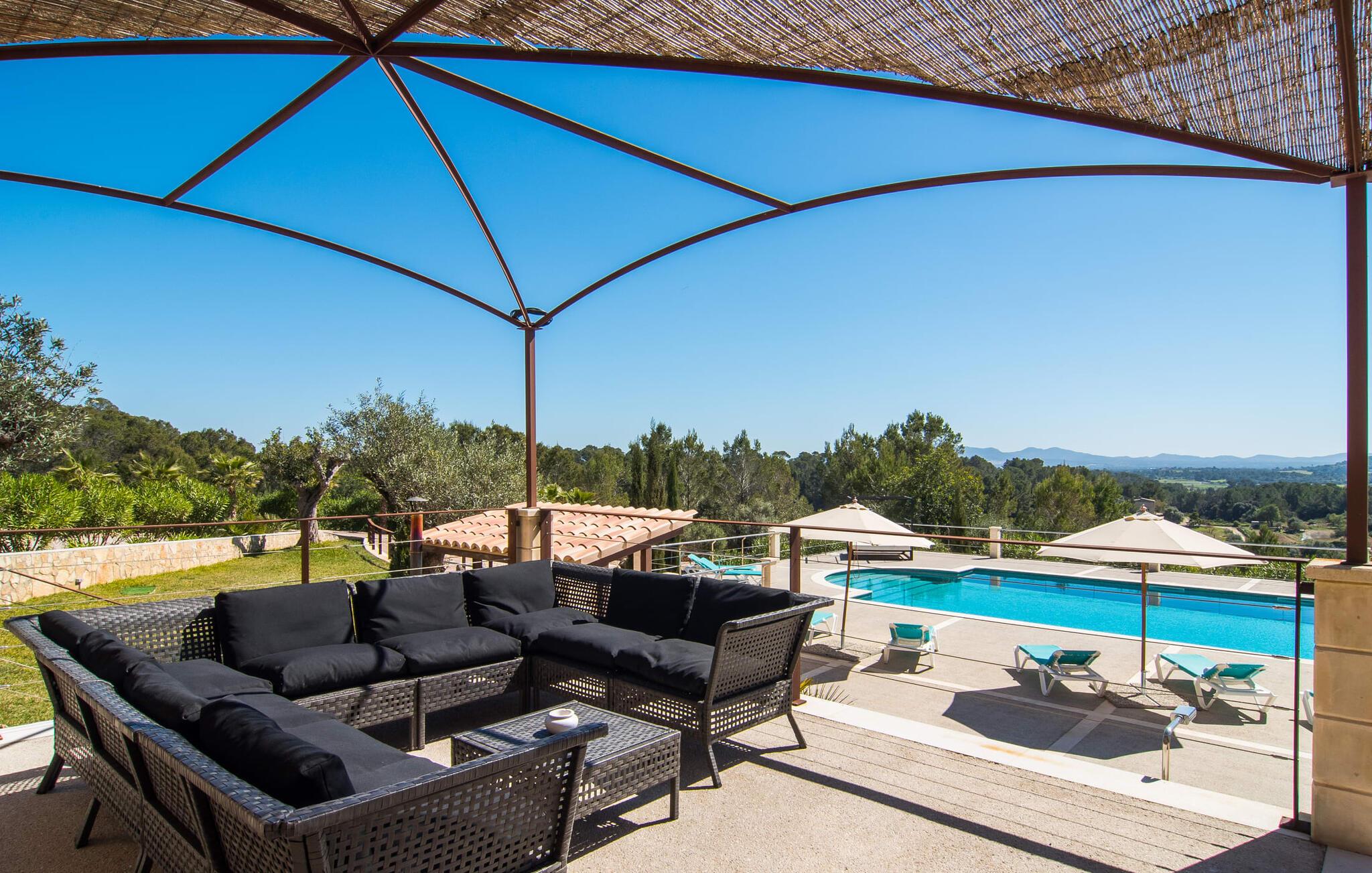 Velkommen til jeres udsøgte feriehus, Villa "Inka" - beliggende på det sydlige Mallorca i den lille kommune Porreres. Denne sublime, okkerfarvede juvel rejser sig over 28.000 m² af næsten uberørt natur, som var den hugget i sten. Den rummelige ejendom med en parklignende have byder på plads nok til store familier og rejsegrupper. En stærk træbestand, frodige palmer og store grønne græsplæner pryder ejendommen - Moder Natur var meget generøs her. At kigge ind i den tilsyneladende uendelige afstand tillader jeres tanker at vandre, og I glemmer alt, jeg mener alt, omkring jer - tro modtoet: fri hverdag, ferie på! I krydser indgangen til villaen via en landevej typisk for Mallorca og parkerer på grusparkeringspladsen, som har ti parkeringspladser. Nu er det tid til at komme ind! Når I er ankommet, giver den overdækkede terrasse med en enestående udsigt over poolen skygge til jeres daglige samvær og grill - og der er endda en pizzaovn i udekøkkenet! Få skridt fra den smukke villa tager jer direkte til den azurblå pool med panoramaudsigt, som allerede venter jer under den mallorcanske sol. Omkring poolen inviterer komfortable liggestole og en udendørs dagseng af høj kvalitet jer til at tage en eftermiddagslur eller læse jeres yndlingsbog. Majestætisk boligareal på utrolige 600 m². De store vinduer, nogle med smukke røde skodder, tjener som privatliv og solafskærmning og dekorerer den detaljerede udvendige facade. Den harmonisk koordinerede farvepalet fra sand til røde toner løber gennem villaens elegante interiør. På øverste etage er der fem lyse og klimatiserede soveoaser, hver med en dobbeltseng. Elegante stoffer omslutter jeres himmelske soveområde og garanterer søde drømme og afslappende søvn. Udover tv, loftsventilatorer og luksuriøse badeværelser kan I nyde komfort i topklasse. Det sjette soveværelse med en luksuriøs dobbeltseng (1,40 x 1,90 m) og et tilstødende badeværelse er i stueetagen. Hvert soveværelse har nok opbevaringsplads til jeres ejendele, og I kan trygt opbevare jeres værdigenstande i pengeskabet. Den storslåede og førsteklasses stue-spisestue udgør hjertet i drømmevillaen. Det er her I mødes og har sjove stunder som en stor gruppe eller familie. Det rustikke chikke i det luksuriøse lædersofa- og lænestollandskab af høj kvalitet er bevis på perfekt smag med en garanteret behagelig atmosfære. Det kolde-varme klimaanlæg garanterer en perfekt rumtemperatur. Det åbne luksuskøkken med kogeø byder på scene til show cooking. Alle kan frit vælge deres plads på de elegante barstole eller ved det lange spisebord. Villaen "Inka" har endnu flere ekstraudstyr i vente til dig: Det absolutte højdepunkt er det separate, moderne billardrum. Elsker I lidt mere action? Hvert spil ved bordfodboldbordet gør jer i godt humør og har en masse sjov. Hvis I kan lide at holde jer i form med fitnessudstyr, kan I gøre det i fitnessrummet. Om tirsdagen kan I køre til det ugentlige marked i den rolige by Porreres via den nærliggende landevej, som let kan høres afhængig af vindforholdene. I kan finde alt her: solmodnet frugt og grønt, god vin, men også husholdningsartikler og tøj. Oplev markedets travlhed i de små gader og nyd de lokales varme gæstfrihed på de mange restauranter og caféer. Turistattraktioner, der er værd at se, omfatter sognekirken Senyora de Cosolació, bygget i 1600-tallet, og Santuari di Monti-Sion-klosteret, omkring 4 km væk. I kan nå klosteret til fods eller i bil. Der kan I få en uforglemmelig udsigt over øen. Og vi har også noget at byde på til alle dem, der elsker havet – nemlig en anbefaling til en forlænget strandtur. I vil hurtigt finde lettelse: mange smukke strande kan nås på cirka 10 minutter. 20 minutter i bil. Den fantastiske villa "Inka" med pool er beliggende i den sydlige del af Mallorca - i den rolige kommune Porreres. Ejendommen strækker sig over hele 28.000 m² med panoramaudsigt over det idylliske landskab. Landevejen fører jer direkte til det ugentlige marked i Porreres, supermarkeder er i umiddelbar nærhed og de smukkeste strande på denne populære ø kan nås på cirka 10 minutter. 20 minutter i bil.