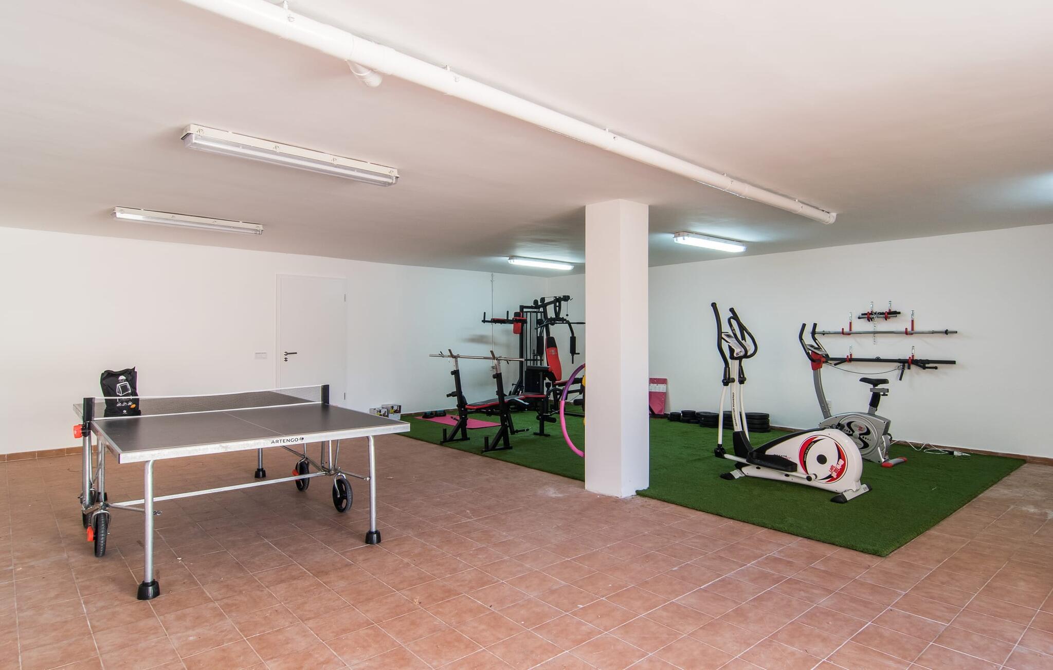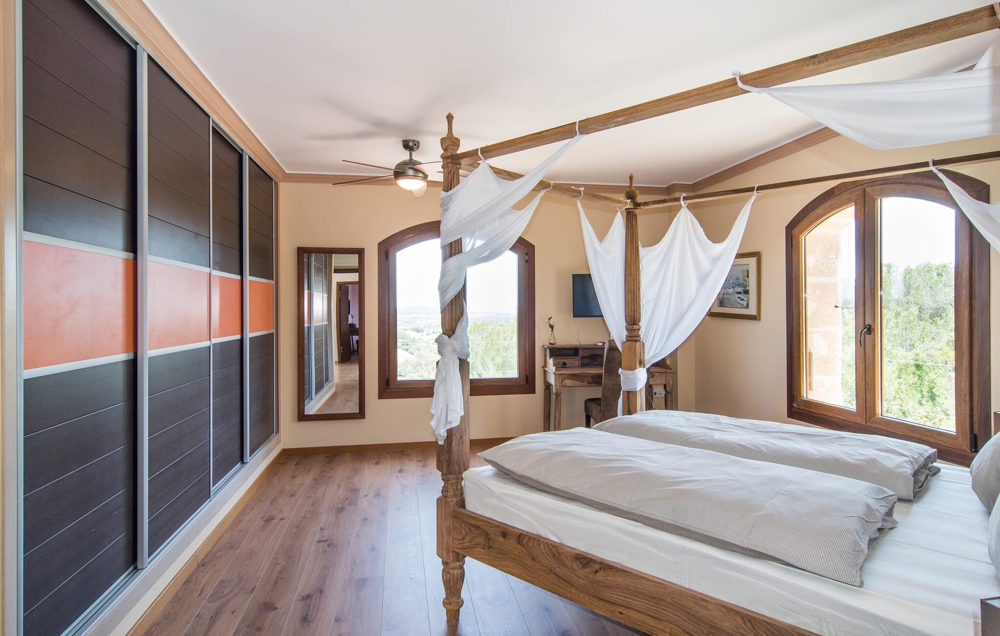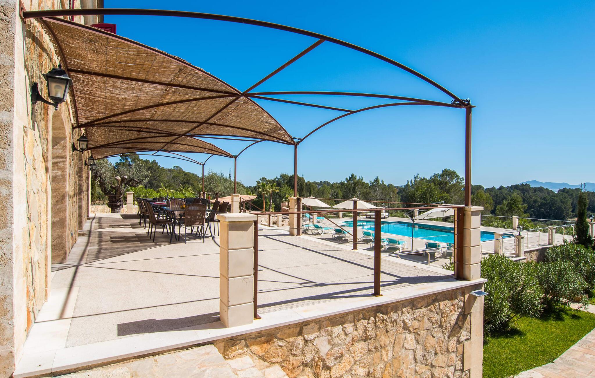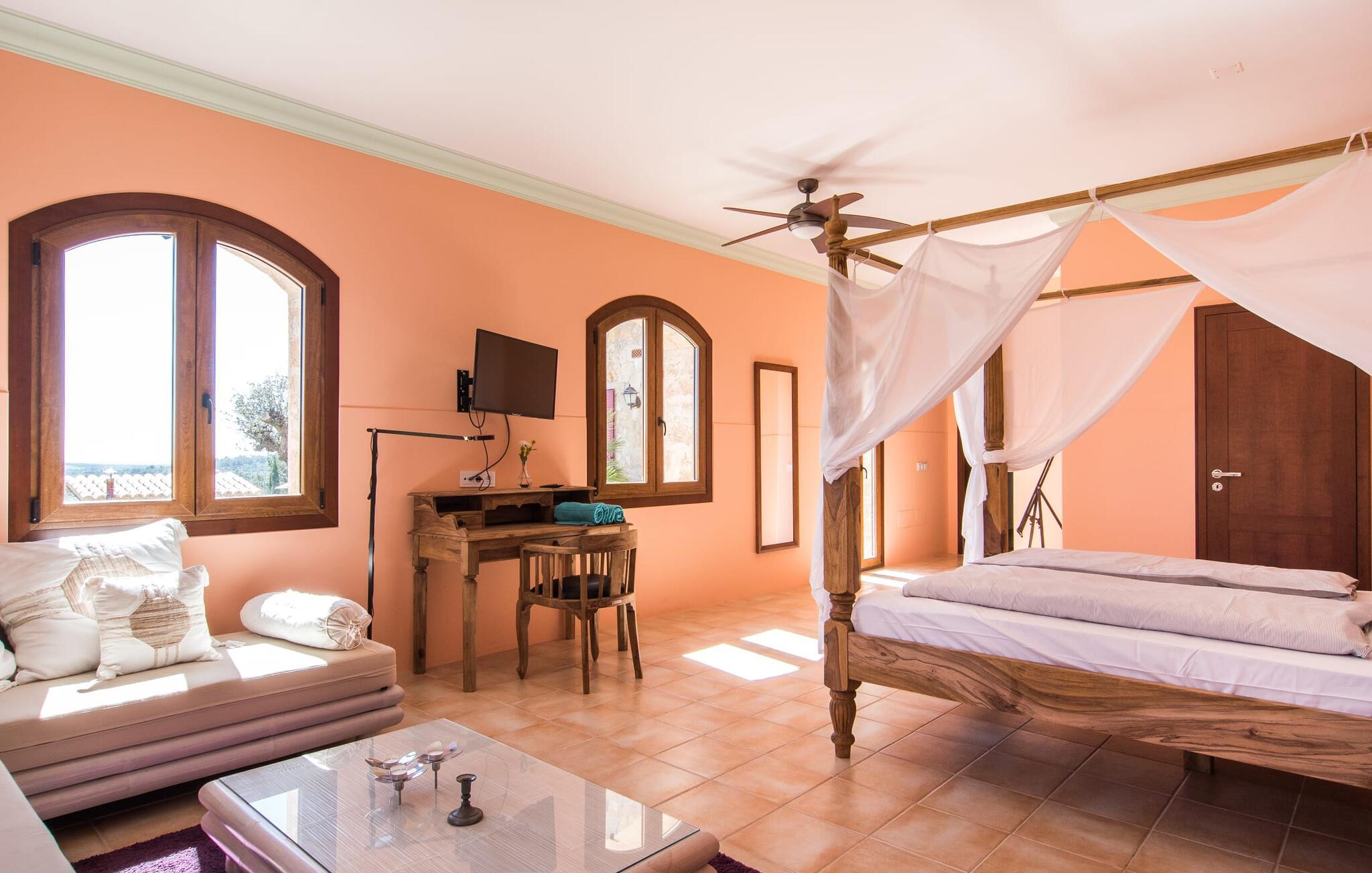Velkommen til jeres udsøgte feriehus, Villa "Inka" - beliggende på det sydlige Mallorca i den lille kommune Porreres. Denne sublime, okkerfarvede juvel rejser sig over 28.000 m² af næsten uberørt natur, som var den hugget i sten. Den rummelige ejendom med en parklignende have byder på plads nok til store familier og rejsegrupper. En stærk træbestand, frodige palmer og store grønne græsplæner pryder ejendommen - Moder Natur var meget generøs her. At kigge ind i den tilsyneladende uendelige afstand tillader jeres tanker at vandre, og I glemmer alt, jeg mener alt, omkring jer - tro modtoet: fri hverdag, ferie på! I krydser indgangen til villaen via en landevej typisk for Mallorca og parkerer på grusparkeringspladsen, som har ti parkeringspladser. Nu er det tid til at komme ind! Når I er ankommet, giver den overdækkede terrasse med en enestående udsigt over poolen skygge til jeres daglige samvær og grill - og der er endda en pizzaovn i udekøkkenet! Få skridt fra den smukke villa tager jer direkte til den azurblå pool med panoramaudsigt, som allerede venter jer under den mallorcanske sol. Omkring poolen inviterer komfortable liggestole og en udendørs dagseng af høj kvalitet jer til at tage en eftermiddagslur eller læse jeres yndlingsbog. Majestætisk boligareal på utrolige 600 m². De store vinduer, nogle med smukke røde skodder, tjener som privatliv og solafskærmning og dekorerer den detaljerede udvendige facade. Den harmonisk koordinerede farvepalet fra sand til røde toner løber gennem villaens elegante interiør. På øverste etage er der fem lyse og klimatiserede soveoaser, hver med en dobbeltseng. Elegante stoffer omslutter jeres himmelske soveområde og garanterer søde drømme og afslappende søvn. Udover tv, loftsventilatorer og luksuriøse badeværelser kan I nyde komfort i topklasse. Det sjette soveværelse med en luksuriøs dobbeltseng (1,40 x 1,90 m) og et tilstødende badeværelse er i stueetagen. Hvert soveværelse har nok opbevaringsplads til jeres ejendele, og I kan trygt opbevare jeres værdigenstande i pengeskabet. Den storslåede og førsteklasses stue-spisestue udgør hjertet i drømmevillaen. Det er her I mødes og har sjove stunder som en stor gruppe eller familie. Det rustikke chikke i det luksuriøse lædersofa- og lænestollandskab af høj kvalitet er bevis på perfekt smag med en garanteret behagelig atmosfære. Det kolde-varme klimaanlæg garanterer en perfekt rumtemperatur. Det åbne luksuskøkken med kogeø byder på scene til show cooking. Alle kan frit vælge deres plads på de elegante barstole eller ved det lange spisebord. Villaen "Inka" har endnu flere ekstraudstyr i vente til dig: Det absolutte højdepunkt er det separate, moderne billardrum. Elsker I lidt mere action? Hvert spil ved bordfodboldbordet gør jer i godt humør og har en masse sjov. Hvis I kan lide at holde jer i form med fitnessudstyr, kan I gøre det i fitnessrummet. Om tirsdagen kan I køre til det ugentlige marked i den rolige by Porreres via den nærliggende landevej, som let kan høres afhængig af vindforholdene. I kan finde alt her: solmodnet frugt og grønt, god vin, men også husholdningsartikler og tøj. Oplev markedets travlhed i de små gader og nyd de lokales varme gæstfrihed på de mange restauranter og caféer. Turistattraktioner, der er værd at se, omfatter sognekirken Senyora de Cosolació, bygget i 1600-tallet, og Santuari di Monti-Sion-klosteret, omkring 4 km væk. I kan nå klosteret til fods eller i bil. Der kan I få en uforglemmelig udsigt over øen. Og vi har også noget at byde på til alle dem, der elsker havet – nemlig en anbefaling til en forlænget strandtur. I vil hurtigt finde lettelse: mange smukke strande kan nås på cirka 10 minutter. 20 minutter i bil. Den fantastiske villa "Inka" med pool er beliggende i den sydlige del af Mallorca - i den rolige kommune Porreres. Ejendommen strækker sig over hele 28.000 m² med panoramaudsigt over det idylliske landskab. Landevejen fører jer direkte til det ugentlige marked i Porreres, supermarkeder er i umiddelbar nærhed og de smukkeste strande på denne populære ø kan nås på cirka 10 minutter. 20 minutter i bil.