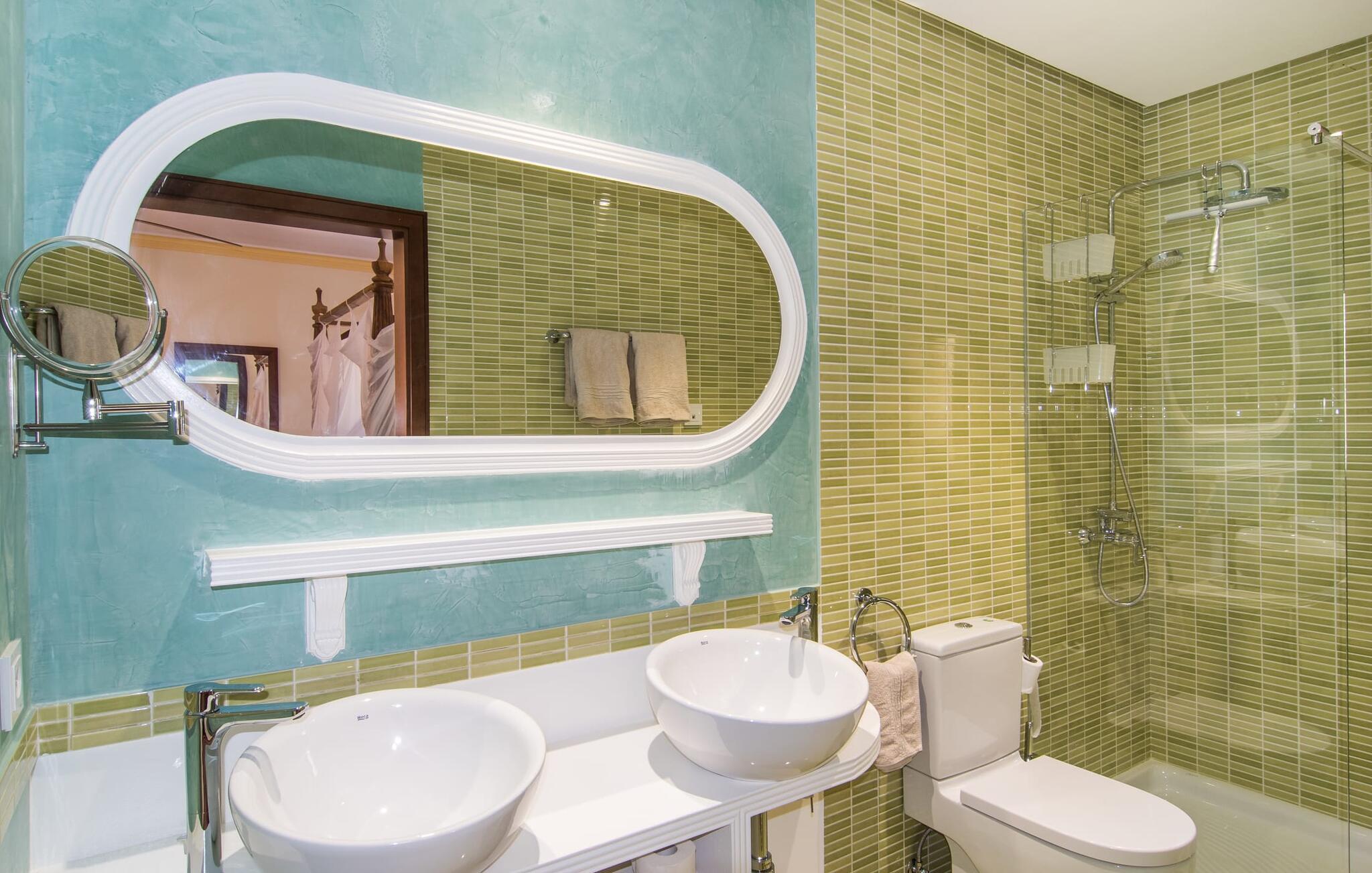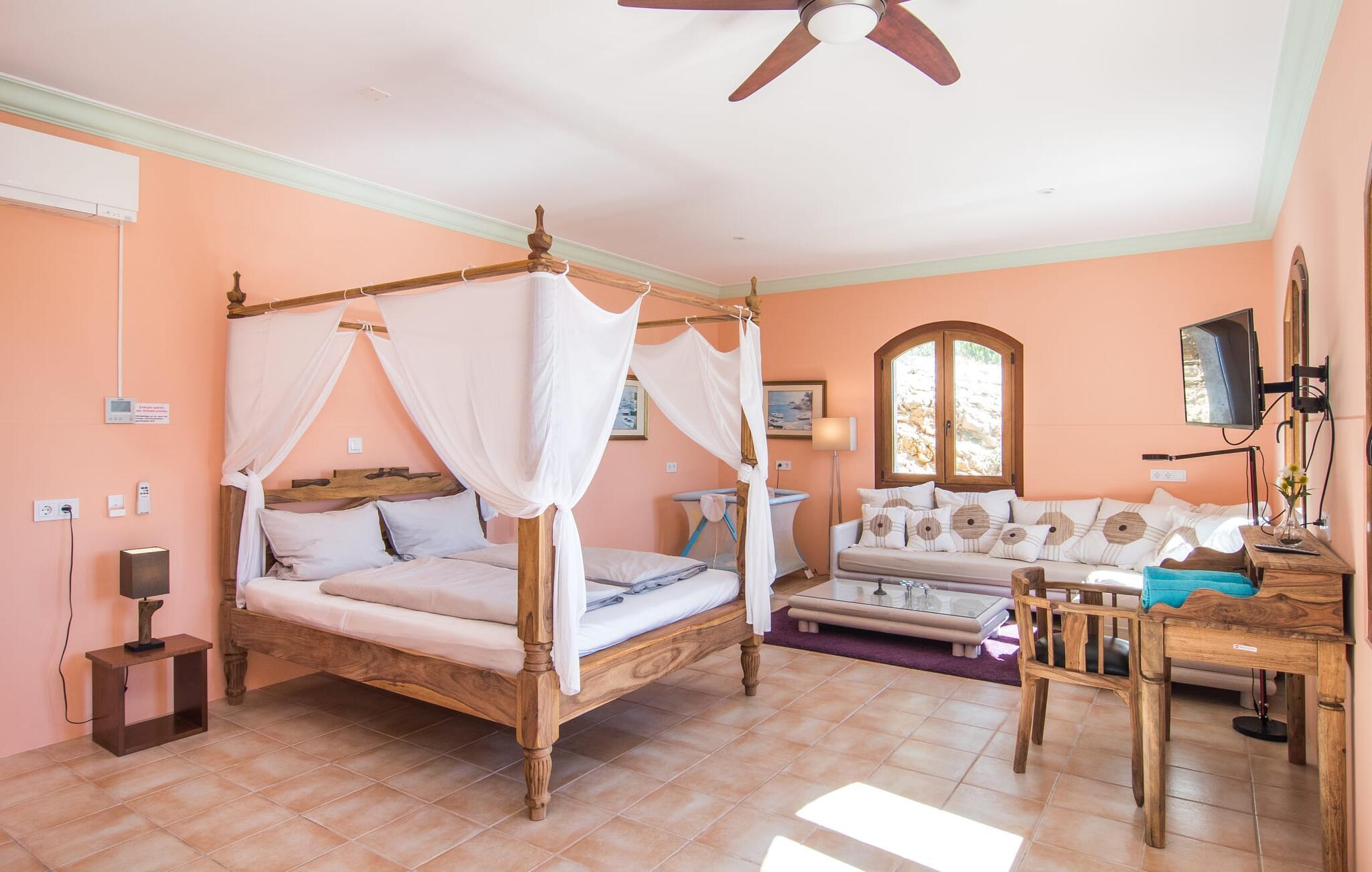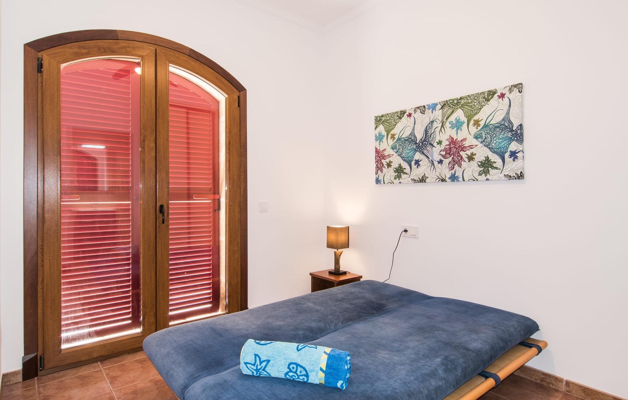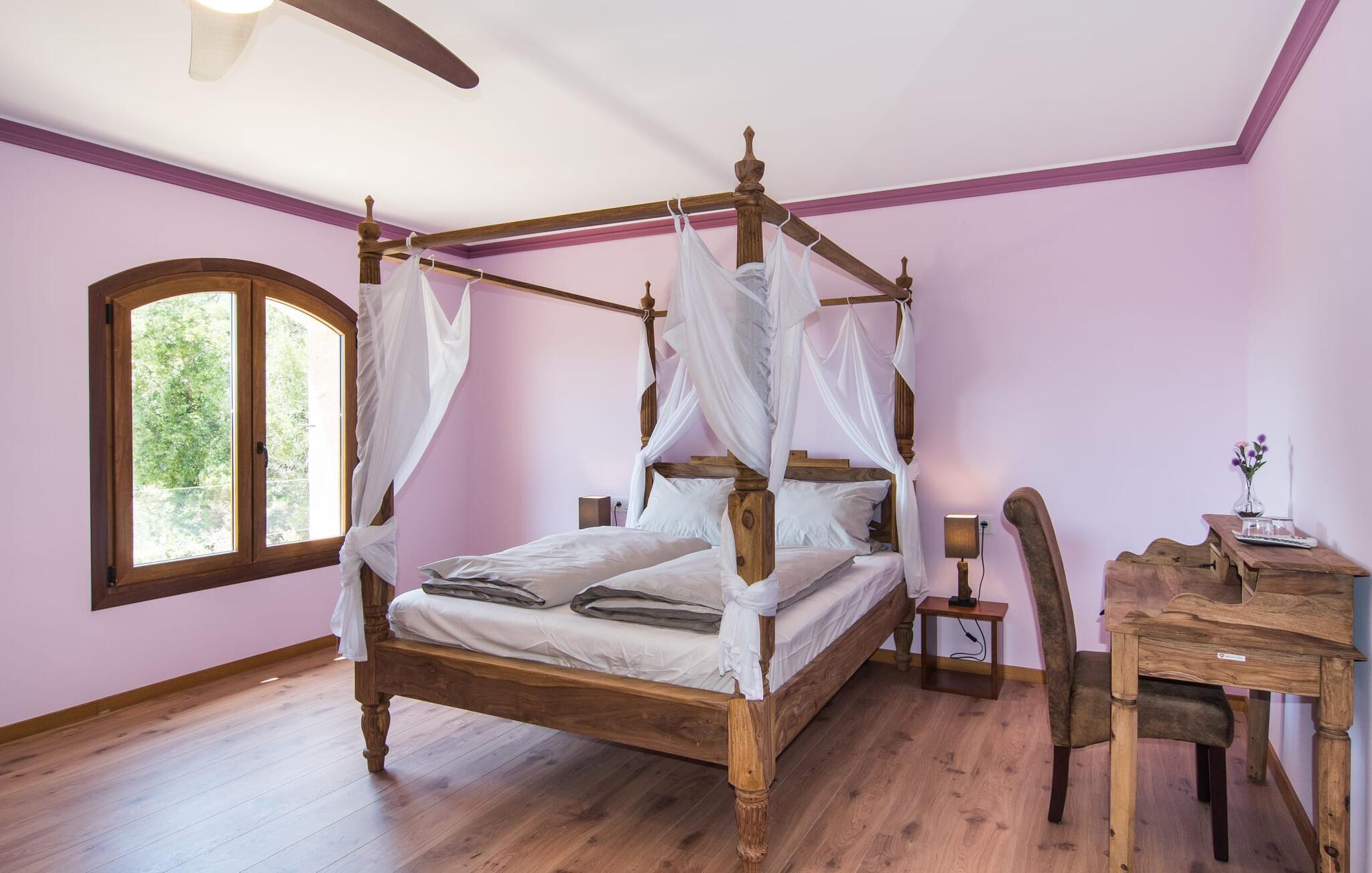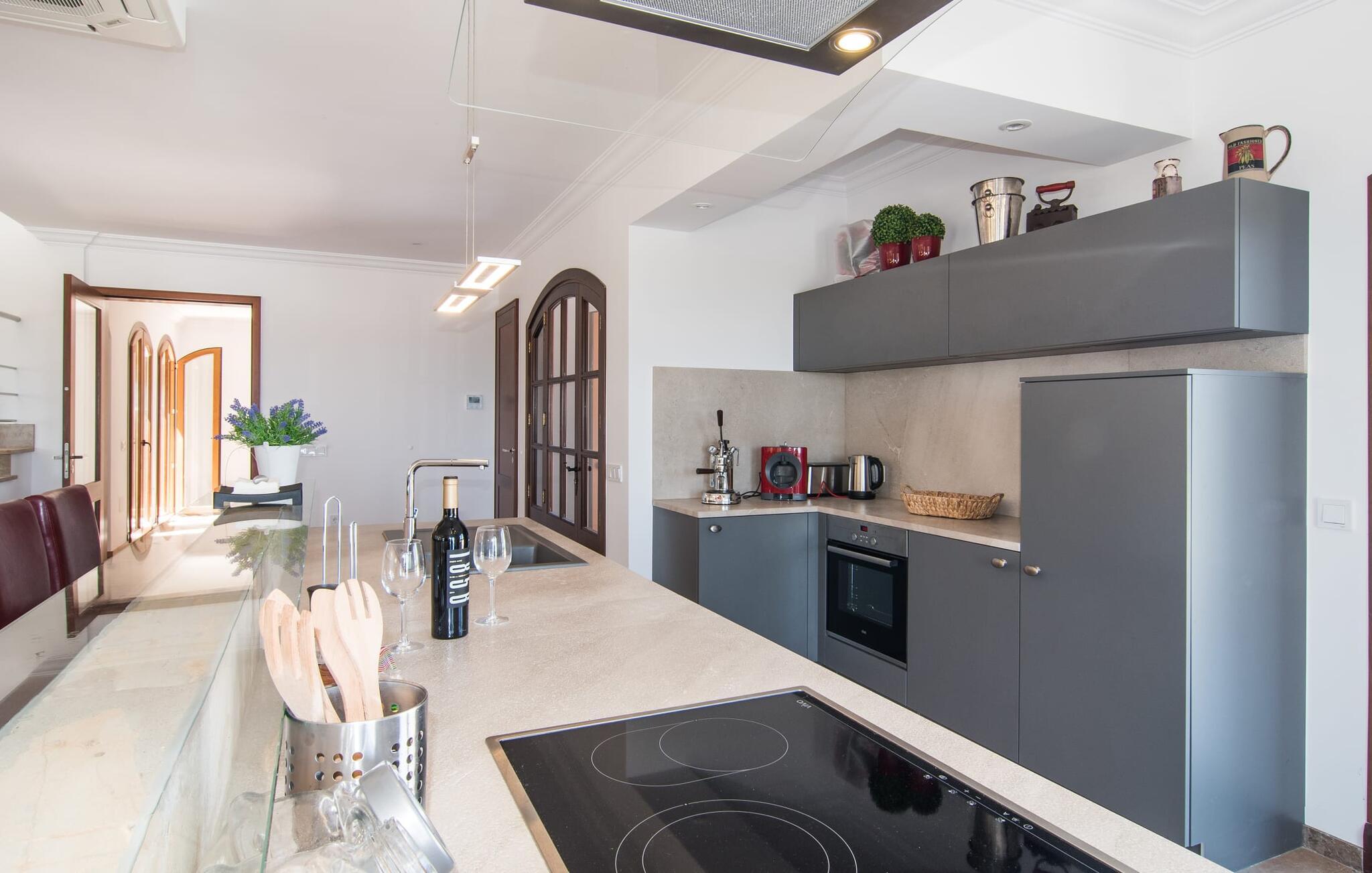 Velkommen til jeres udsøgte feriehus, Villa "Inka" - beliggende på det sydlige Mallorca i den lille kommune Porreres. Denne sublime, okkerfarvede juvel rejser sig over 28.000 m² af næsten uberørt natur, som var den hugget i sten. Den rummelige ejendom med en parklignende have byder på plads nok til store familier og rejsegrupper. En stærk træbestand, frodige palmer og store grønne græsplæner pryder ejendommen - Moder Natur var meget generøs her. At kigge ind i den tilsyneladende uendelige afstand tillader jeres tanker at vandre, og I glemmer alt, jeg mener alt, omkring jer - tro modtoet: fri hverdag, ferie på! I krydser indgangen til villaen via en landevej typisk for Mallorca og parkerer på grusparkeringspladsen, som har ti parkeringspladser. Nu er det tid til at komme ind! Når I er ankommet, giver den overdækkede terrasse med en enestående udsigt over poolen skygge til jeres daglige samvær og grill - og der er endda en pizzaovn i udekøkkenet! Få skridt fra den smukke villa tager jer direkte til den azurblå pool med panoramaudsigt, som allerede venter jer under den mallorcanske sol. Omkring poolen inviterer komfortable liggestole og en udendørs dagseng af høj kvalitet jer til at tage en eftermiddagslur eller læse jeres yndlingsbog. Majestætisk boligareal på utrolige 600 m². De store vinduer, nogle med smukke røde skodder, tjener som privatliv og solafskærmning og dekorerer den detaljerede udvendige facade. Den harmonisk koordinerede farvepalet fra sand til røde toner løber gennem villaens elegante interiør. På øverste etage er der fem lyse og klimatiserede soveoaser, hver med en dobbeltseng. Elegante stoffer omslutter jeres himmelske soveområde og garanterer søde drømme og afslappende søvn. Udover tv, loftsventilatorer og luksuriøse badeværelser kan I nyde komfort i topklasse. Det sjette soveværelse med en luksuriøs dobbeltseng (1,40 x 1,90 m) og et tilstødende badeværelse er i stueetagen. Hvert soveværelse har nok opbevaringsplads til jeres ejendele, og I kan trygt opbevare jeres værdigenstande i pengeskabet. Den storslåede og førsteklasses stue-spisestue udgør hjertet i drømmevillaen. Det er her I mødes og har sjove stunder som en stor gruppe eller familie. Det rustikke chikke i det luksuriøse lædersofa- og lænestollandskab af høj kvalitet er bevis på perfekt smag med en garanteret behagelig atmosfære. Det kolde-varme klimaanlæg garanterer en perfekt rumtemperatur. Det åbne luksuskøkken med kogeø byder på scene til show cooking. Alle kan frit vælge deres plads på de elegante barstole eller ved det lange spisebord. Villaen "Inka" har endnu flere ekstraudstyr i vente til dig: Det absolutte højdepunkt er det separate, moderne billardrum. Elsker I lidt mere action? Hvert spil ved bordfodboldbordet gør jer i godt humør og har en masse sjov. Hvis I kan lide at holde jer i form med fitnessudstyr, kan I gøre det i fitnessrummet. Om tirsdagen kan I køre til det ugentlige marked i den rolige by Porreres via den nærliggende landevej, som let kan høres afhængig af vindforholdene. I kan finde alt her: solmodnet frugt og grønt, god vin, men også husholdningsartikler og tøj. Oplev markedets travlhed i de små gader og nyd de lokales varme gæstfrihed på de mange restauranter og caféer. Turistattraktioner, der er værd at se, omfatter sognekirken Senyora de Cosolació, bygget i 1600-tallet, og Santuari di Monti-Sion-klosteret, omkring 4 km væk. I kan nå klosteret til fods eller i bil. Der kan I få en uforglemmelig udsigt over øen. Og vi har også noget at byde på til alle dem, der elsker havet – nemlig en anbefaling til en forlænget strandtur. I vil hurtigt finde lettelse: mange smukke strande kan nås på cirka 10 minutter. 20 minutter i bil. Den fantastiske villa "Inka" med pool er beliggende i den sydlige del af Mallorca - i den rolige kommune Porreres. Ejendommen strækker sig over hele 28.000 m² med panoramaudsigt over det idylliske landskab. Landevejen fører jer direkte til det ugentlige marked i Porreres, supermarkeder er i umiddelbar nærhed og de smukkeste strande på denne populære ø kan nås på cirka 10 minutter. 20 minutter i bil.