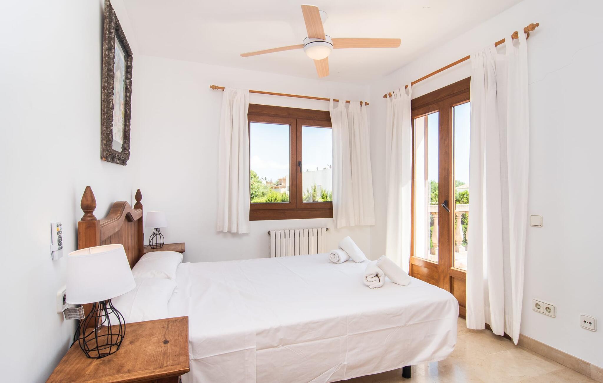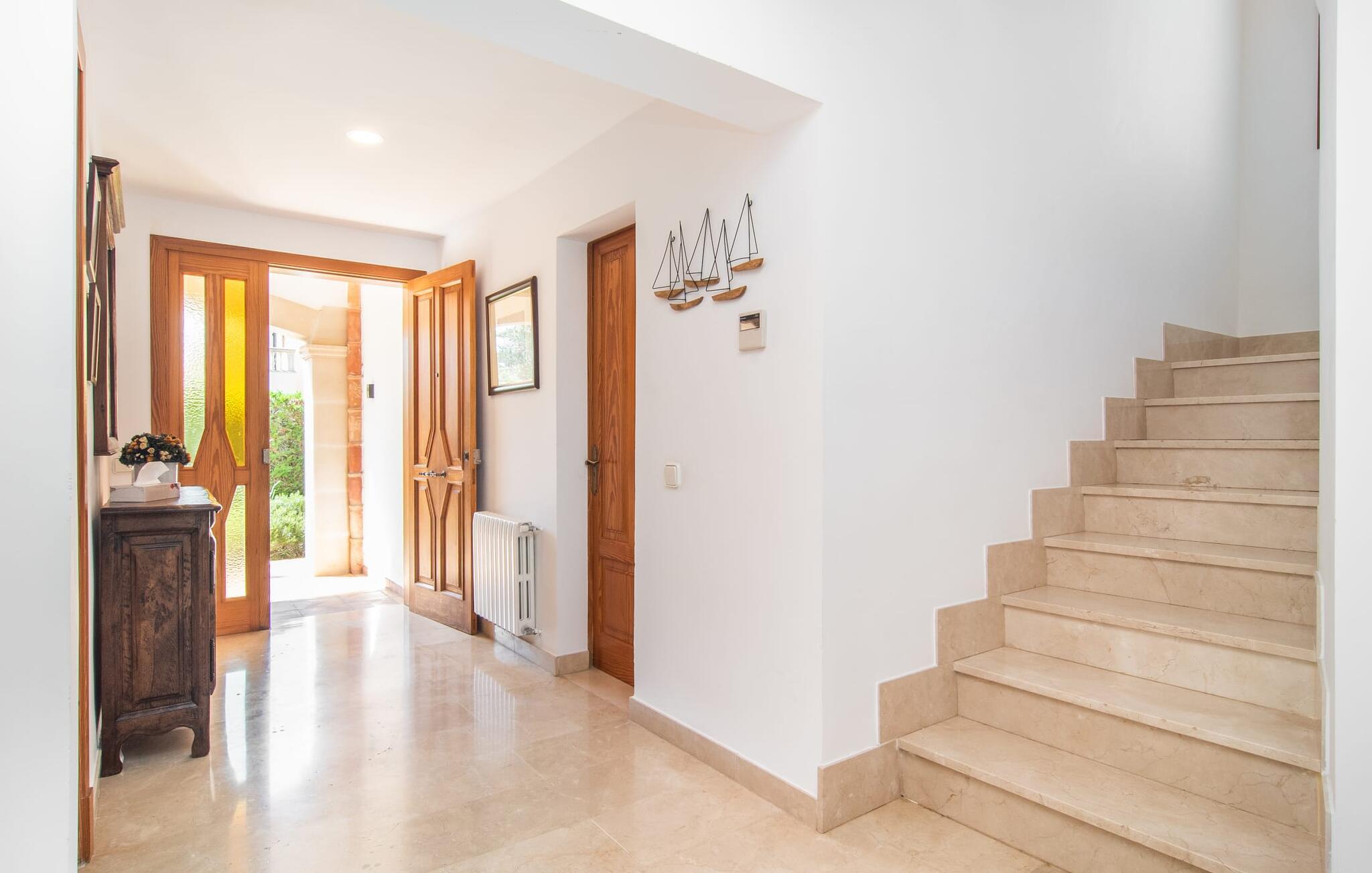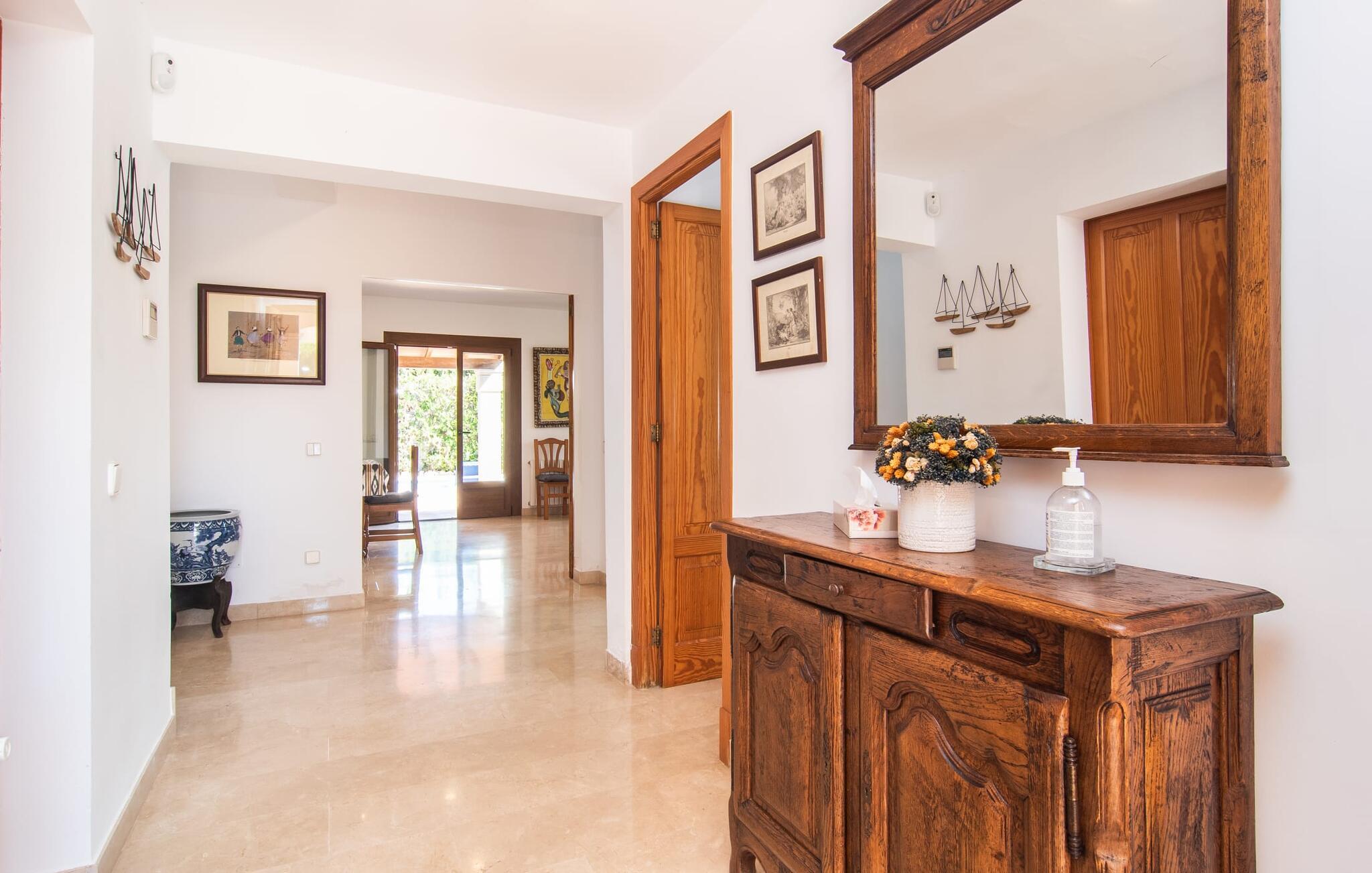 Den moderne villa "Isabel" ligger på en velholdt ejendom omgivet af hække nær Mallorcas sydkyst. Herfra kan I nemt nå de smukke sandstrande i Sa Rápita på cykel, som I kan parkere sikkert på stedet eller leje på stedet. Udover veludviklede cykelstier ved havet ligger villaen på en anvist cykelrute, så I kan kombinere jeres badeferie med afslappende cykelture i de smukke omgivelser. Bag huset er der en skøn pool med liggestole og parasoller. En overdækket terrasse med udendørs spiseplads er perfekt til grill og udendørs spisning. På øverste etage er der to altanterrasser med smuk udsigt over poolen og de omkringliggende villaer. Indenfor løber den lyse stue med pejs og udgang til poolterrassen ud i spiseplads og køkken. På dette niveau er der et soveværelse med dobbeltseng og et separat badeværelse. En trappe i indgangspartiet fører til øverste etage. Her finder I afslappende søvn i et af de tre dobbeltværelser. En af dem har eget badeværelse. To af dem har adgang til egen altanterrasse. Der er også et andet separat badeværelse ovenpå. Hele huset er udstyret med radiatorer, hvilket gør villaen til en behagelig mulighed selv uden for højsæsonen på Mallorca. Villaen ligger i den rolige havneby Sa Rápita på Mallorcas sydkyst. Der er et lille supermarked i landsbyen; For større indkøb ligger Campos 15 minutters kørsel derfra. Den lange naturlige strand Sa Rápita kan nås i bil på 6 minutter, men også nemt på cykel på 8 minutter.
