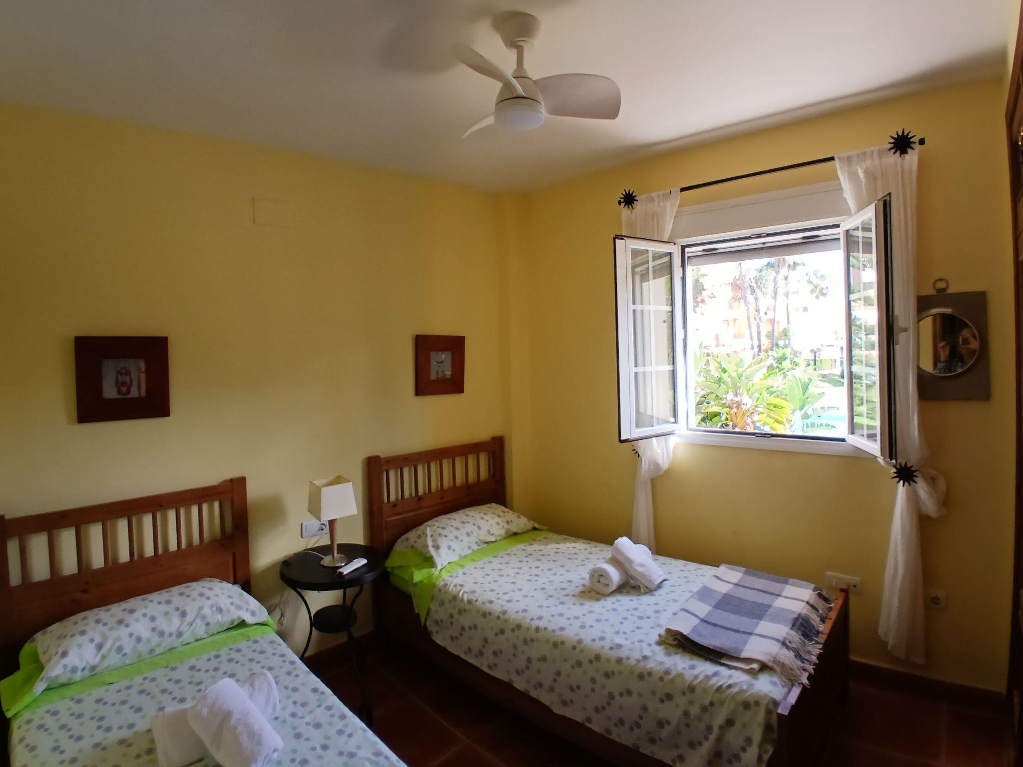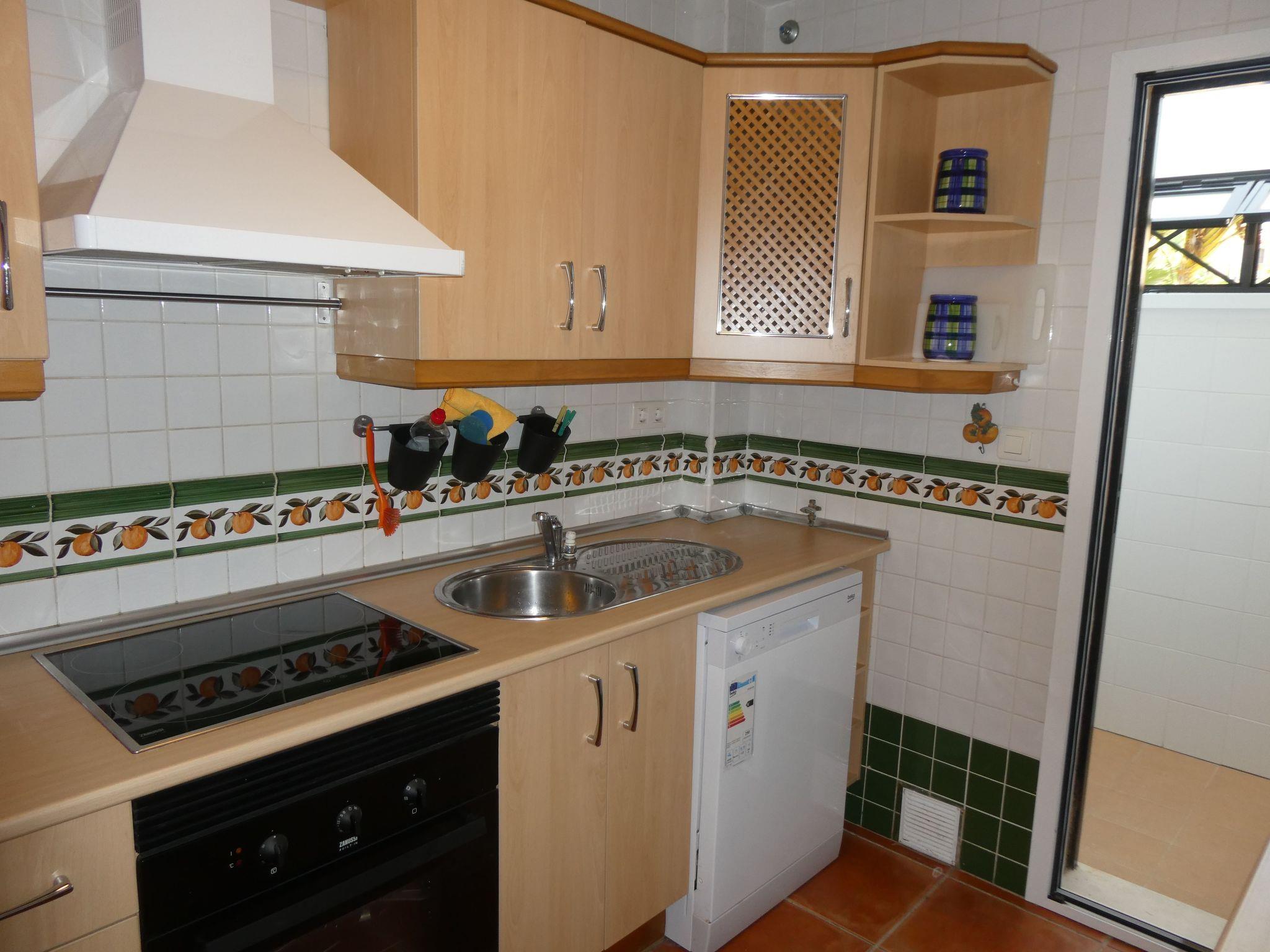 The beautiful holiday home is distributed over two floors and has two bedrooms. One bedroom has a double bed overlooking the lake in hole 1 and the other has two single beds overlooking the gardens and pools. There is a full bathroom and a toilet. The kitchen is fully equipped. The living room also offers views of the golf course. There is a cot available free of charge on request.