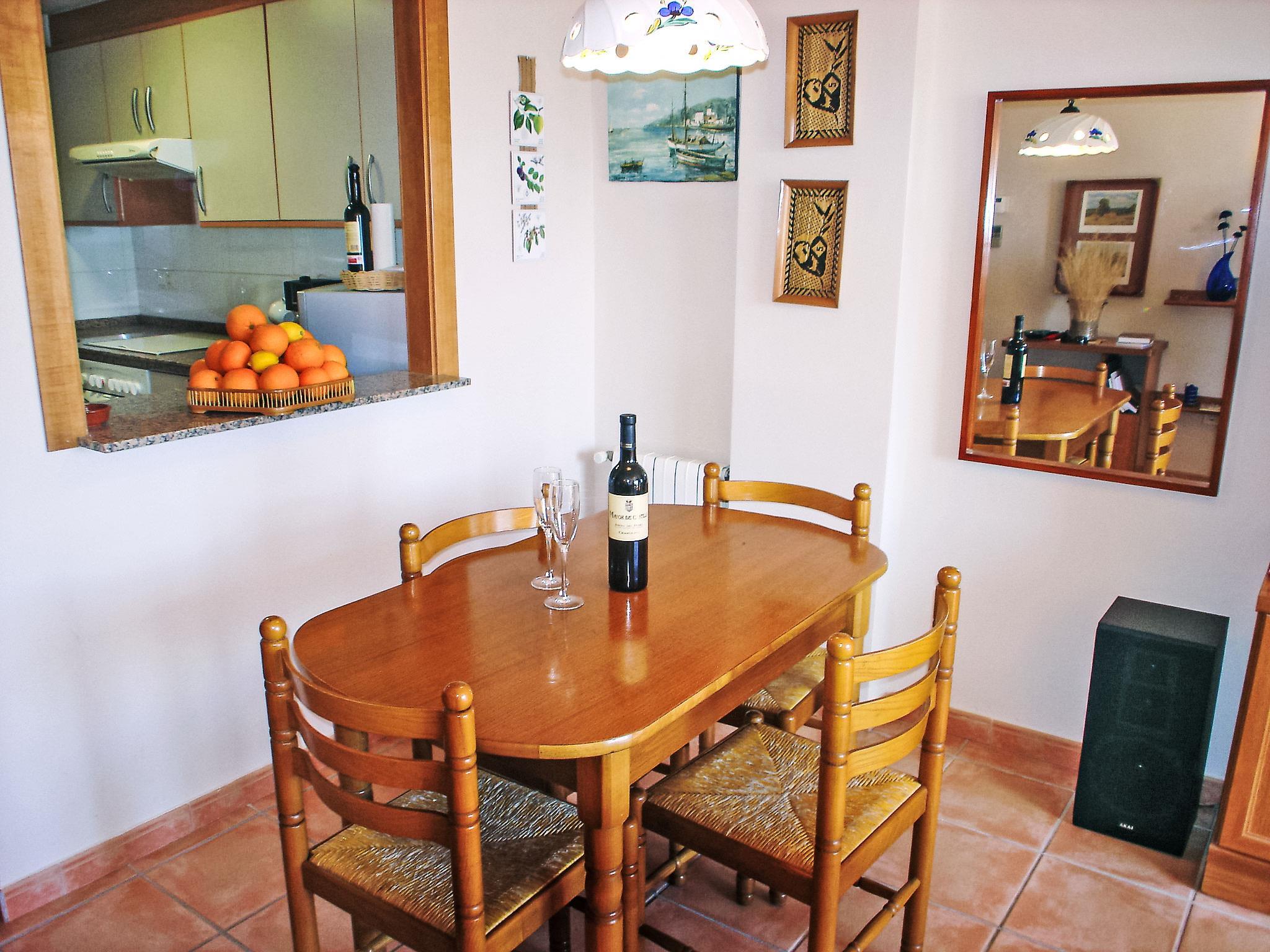 2-room apartment 50 m2 on 2nd floor. Beautiful furnishings: living/dining room with 1 sofabed, digital TV, video and hi-fi system. Exit to the balcony. 1 room with 1 french bed (150 cm, length 190 cm). Exit to the balcony. Open kitchen (oven, microwave, freezer, electric coffee machine) with air conditioning. Shower/bidet/WC. No heating option. Balcony 15 m2. Terrace furniture. View of the swimming pool. Facilities: washing machine. Internet (WiFi, free). Garage. Please note: maximum 1 pet/ dog allowed. TV only ES. AT-424725-A // Reg. Nr.: ESFCTU00000307100050654700000000000000000AT-424725-A2