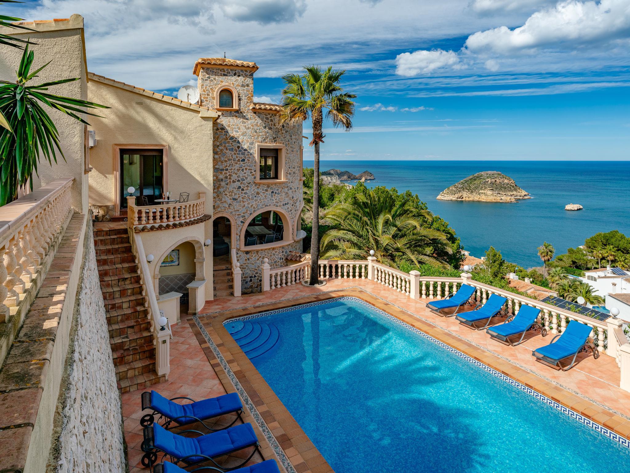 "Villa Castillo al Mar", 5-room villa 225 m2 on 2 levels. Spacious and bright, comfortable furnishings: living/dining room with satellite TV. 1 room with 1 double bed (2 x 80 cm, length 200 cm), air conditioning and forced-air heating. 1 room with 1 double bed (2 x 80 cm, length 200 cm), air conditioning, fan and forced-air heating. Exit to the terrace, to the swimming pool. Open kitchen (oven, dishwasher, 3 ceramic glass hob hotplates, toaster, kettle, microwave, freezer, electric coffee machine). Sep. WC, bath/shower/WC. On the lower ground floor: 1 room with 1 double bed (2 x 80 cm, length 200 cm), air conditioning and forced-air heating. 1 room with 1 double bed (2 x 80 cm, length 200 cm), air conditioning and forced-air heating. Bath/WC. Large terrace. Terrace furniture, barbecue, deck chairs (8), covered balcony, sitting area, box-room. Marvellous view of the sea. Facilities: washing machine, iron, hair dryer. Internet (WiFi, free). Please note: TV only DE. VT-445170-A