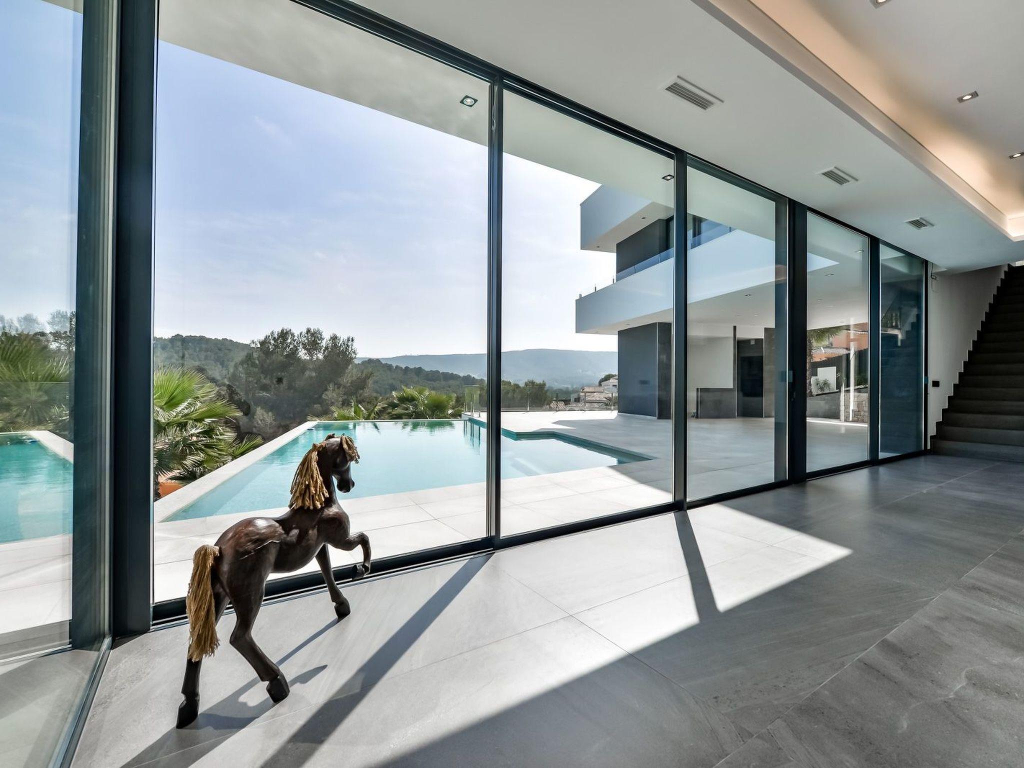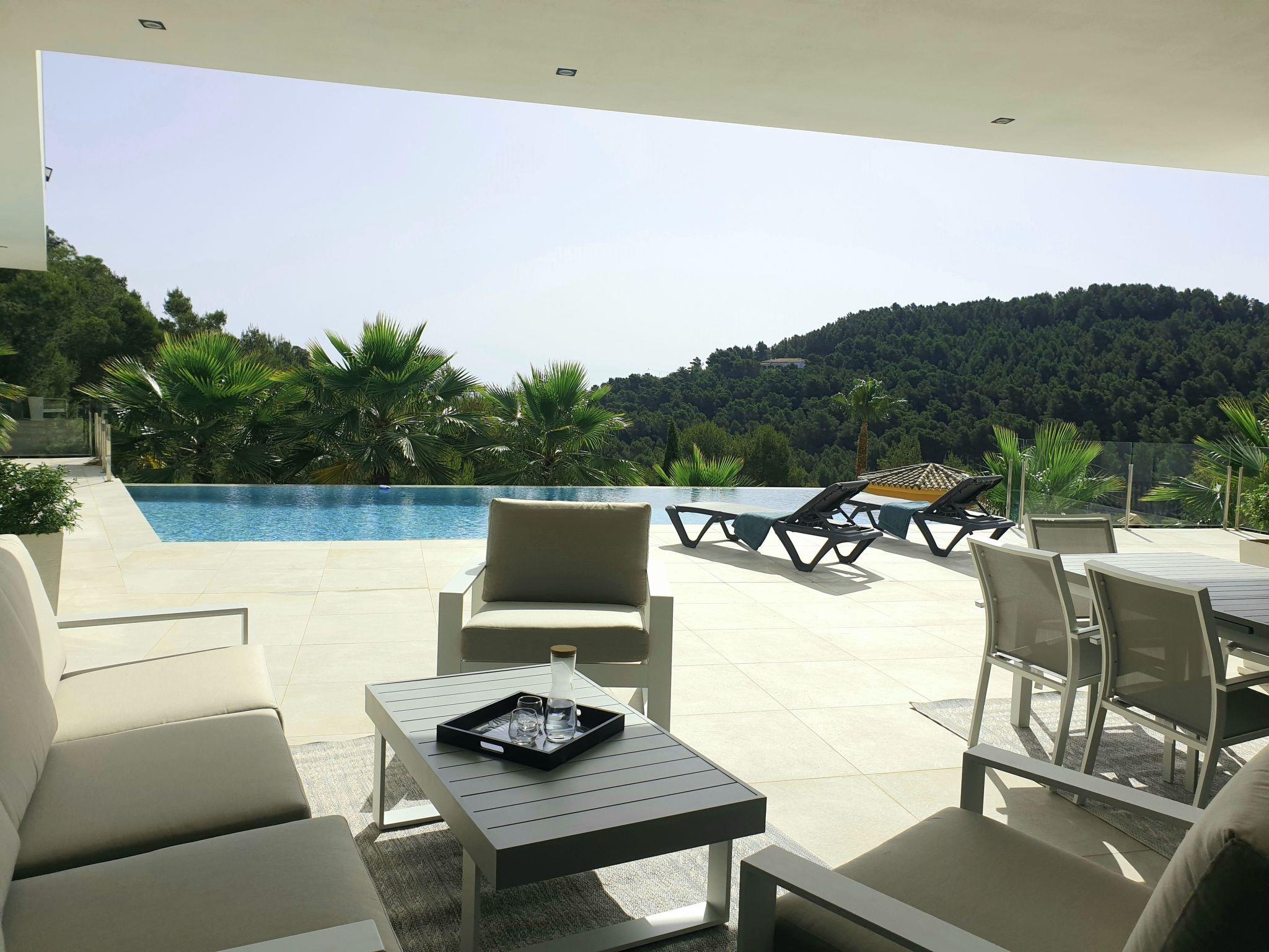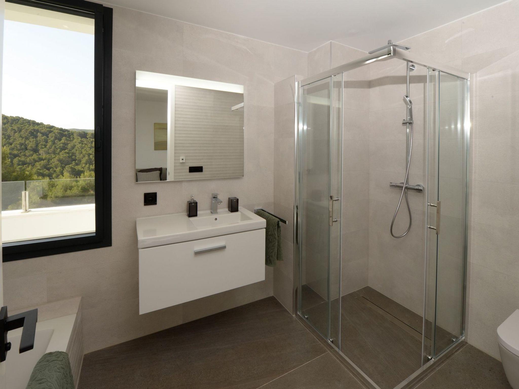 In front of the living room there is a covered terrace and an area with a pergola to have a shady place in the summer months from where you can enjoy the views of the Mediterranean Sea. In the same area there is a BBQ area. On the open pool terrace there is a large pool with an "infinity" effect, wide steps and underwater lighting. On the upper floor there are 3 spacious bedrooms and 2 bathrooms. The master bedroom has an en suite bathroom. All bedrooms have access to the large roof terrace. In the basement there is a double garage with automatic door (of which one garage space is also rented) and a spacious cellar area, as well as the building services. The ground floor is divided into a large living/dining area, American kitchen with adjoining utility room and a guest toilet.