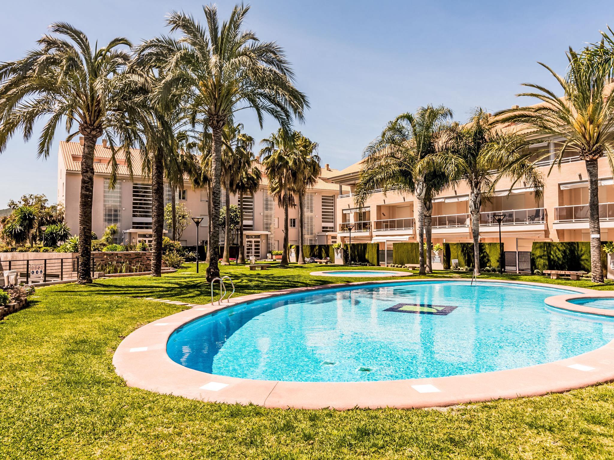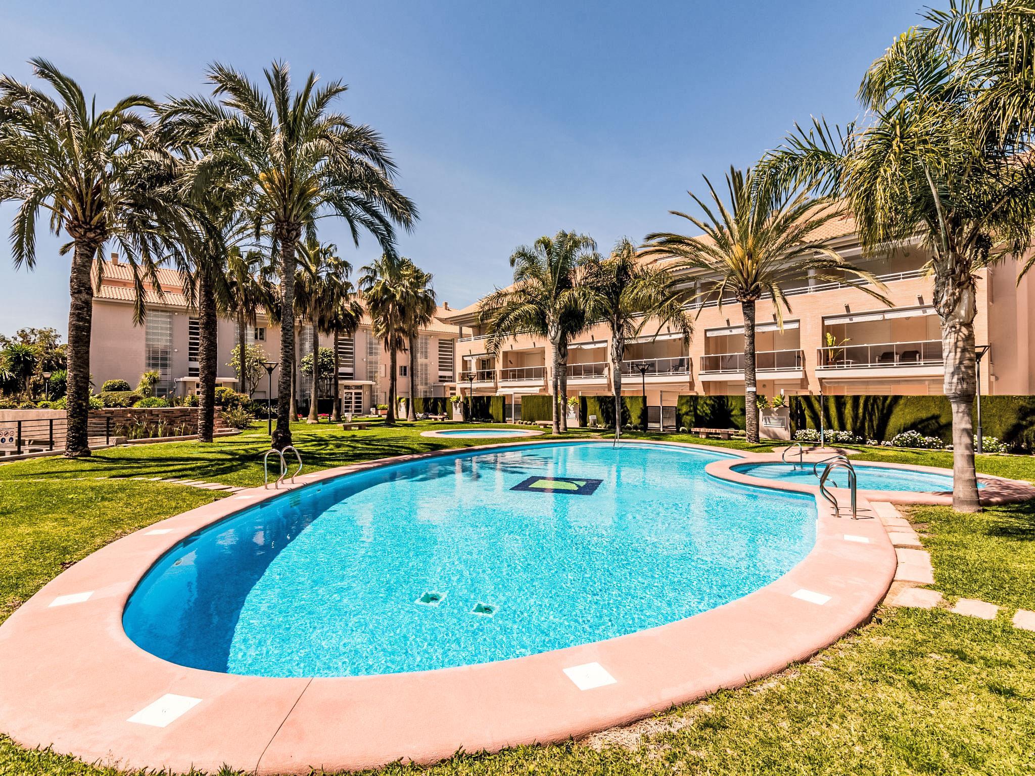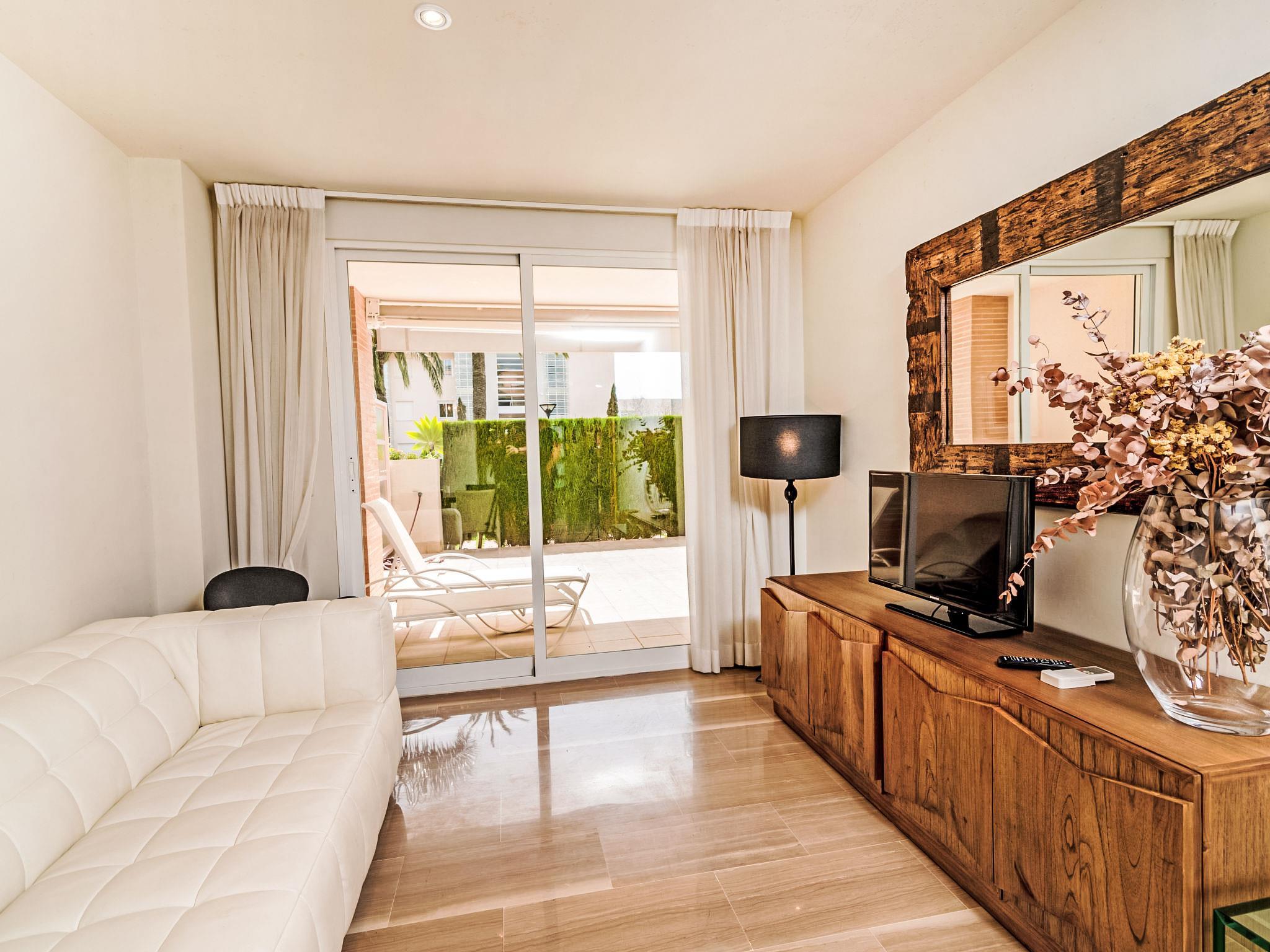 "Golde Gardens", 3-room apartment 65 m2, on the ground floor. Bright, comfortable and tasteful furnishings: living/dining room with digital TV and air conditioning. Exit to the terrace. 1 room with 2 beds and air conditioning. 1 room with 1 french bed (160 cm, length 200 cm), shower/WC and air conditioning. Exit to the terrace. Kitchen (oven, dishwasher, 4 ceramic glass hob hotplates, microwave, freezer). Shower/bidet/WC. Air-conditioning, forced-air heating. Large terrace 20 m2. Terrace furniture, deck chairs (2). View of the swimming pool. Facilities: washing machine, iron, hair dryer. Internet (WiFi, free). Parking space n 83 (roofed). Please note: non-smokers only. AT-465318-A // Reg. Nr.: ESFCTU00000307100091473100000000000000000AT-465318-A1