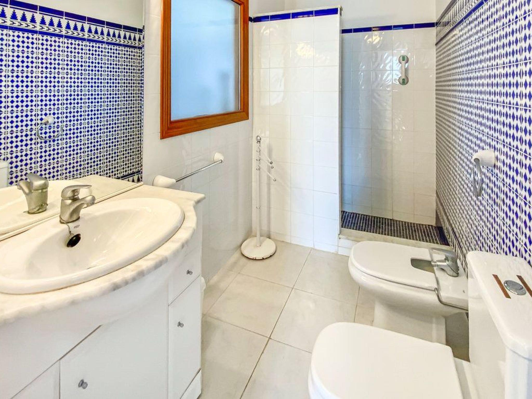Villa La Galesa in Javea. This villa is unique. A large detached villa, built on an exclusive estate 9km outside Javea (Xabia in the local dialect) towards the Cabo de la Nao, and was designed by the owner. One of only five frontline properties here, there are only pine trees and the Mediterranean sea between you and a view of Ibiza. It is surrounded by well kept mature gardens and maintained to a high standard internally and externally, as you would expect for a villa of this quality and location.The villa has been designed around an enclosed and totally private courtyard with blue and white Moorish tiles and a square central fountain. One bedroom overlooks the Mediterranean, and is reached from one end of the cloistered walk, the second opens directly onto the courtyard. The third bedroom faces West, and opens from an inside corridor and has two ensuite bathrooms. All bedrooms have Kingsize beds (not doubles), are ensuite, and have very large ceiling fans the house was designed to take account of the natural movement of air to keep the rooms cool but there is air-conditioning (charged extra upon meter usage). In the living room there is a large flat screen television and a DVD player. The kitchen is fully equipped with enough cookware and crockery to please the most enthusiastic cook. There is an electric eyelevel oven, gas hob, microwave/convection oven with grill, dishwasher, fridge/deepfreeze coffee makers etc.