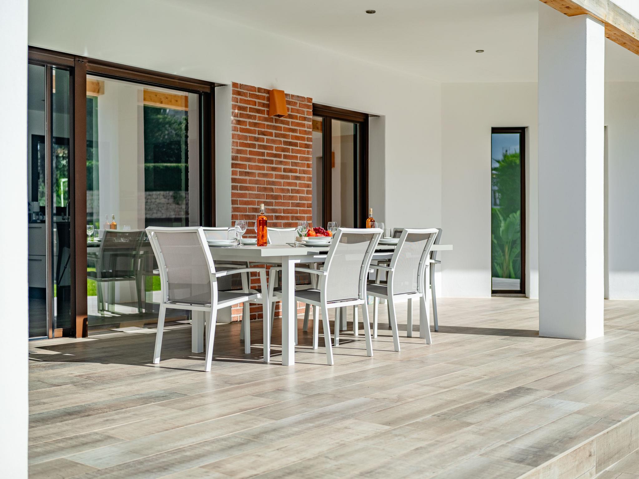 "Villa Can Calablanca", 4-room villa 250 m2 on 2 levels. Spacious and bright, very comfortable and cosy furnishings: living/dining room with satellite TV, air conditioning and forced-air heating. Exit to the patio, to the swimming pool. 1 room with 1 french bed (180 cm, length 200 cm), air conditioning and forced-air heating. 1 room with 1 bed (90 cm, length 190 cm), shower/WC, double hand-basin, air conditioning and forced-air heating. Exit to the terrace. Open kitchen (oven, dishwasher, 3 induction hot plates, toaster, kettle, microwave, freezer, electric coffee machine, Capsules for coffee machine (Senseo. Not incl)). Shower/WC. Upper floor: 1 room with 1 french bed (180 cm, length 200 cm), shower/WC, air conditioning and forced-air heating. Exit to the terrace. Large terrace, patio. Terrace furniture, barbecue, deck chairs (6), covered balcony, sitting area. Facilities: washing machine, iron, hair dryer. Internet (WiFi, free). Parking. Please note: TV only DE. R00000001