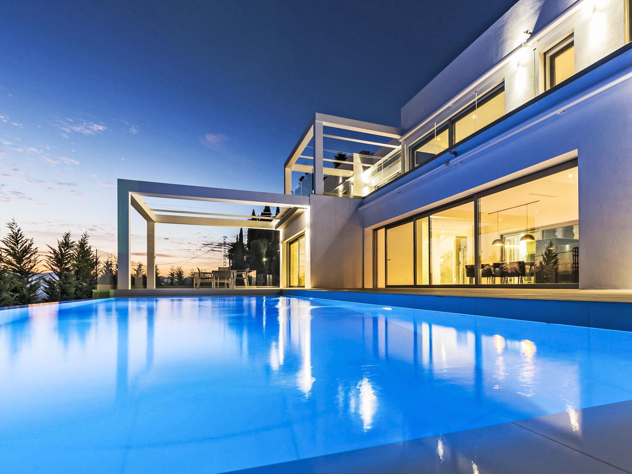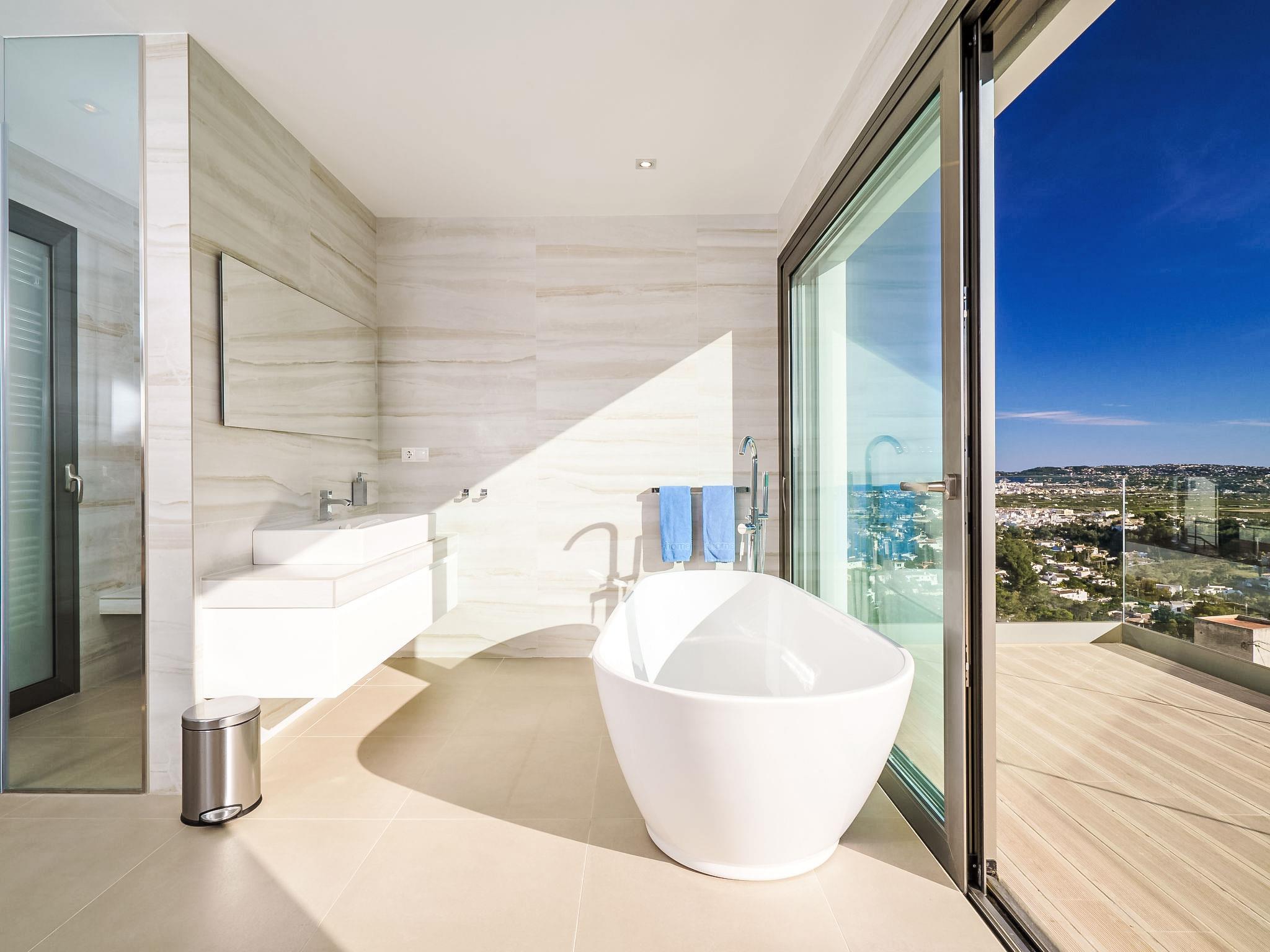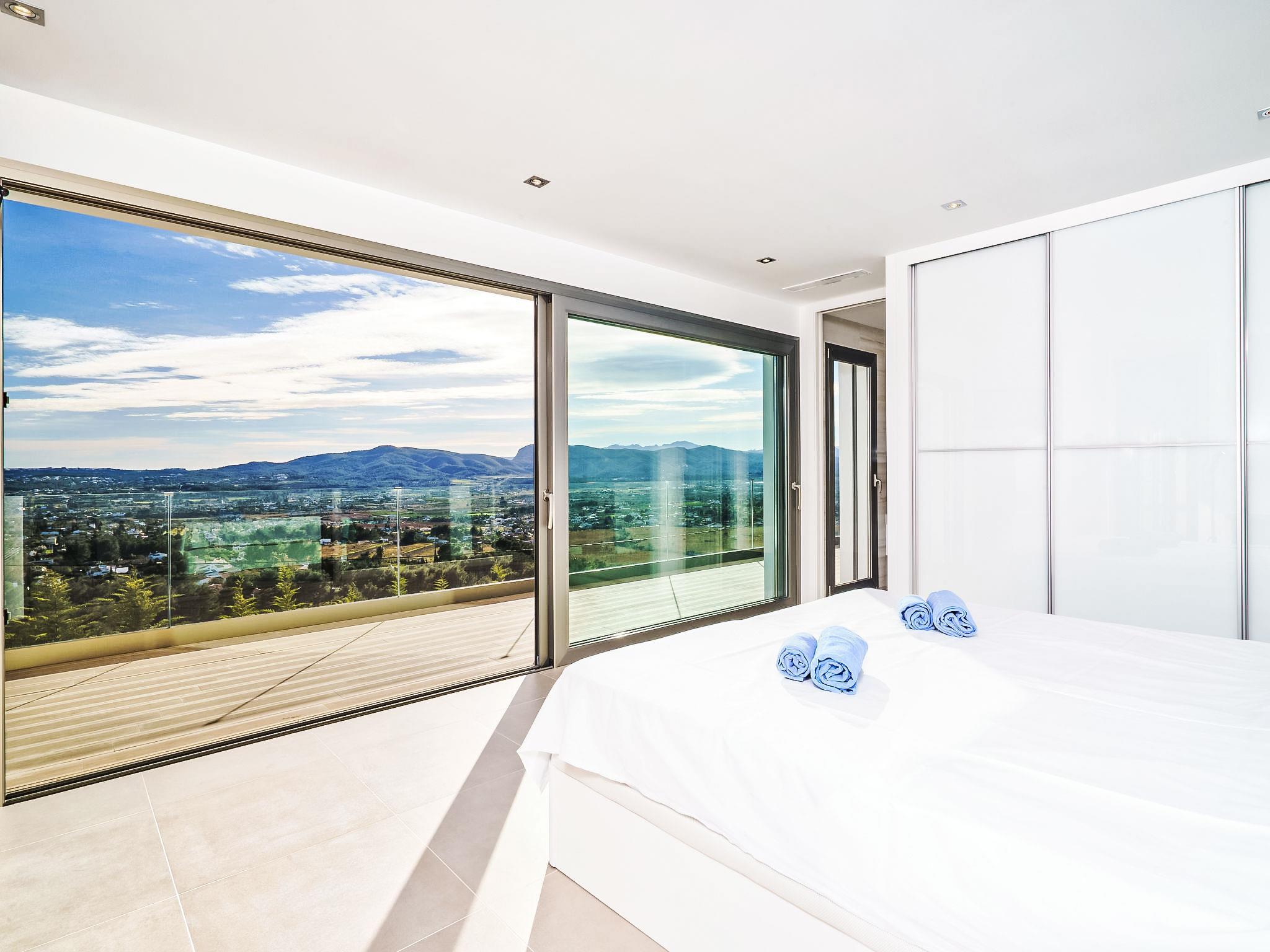 Very modern, beautiful, luxurious villa "Exorbo", 3 storeys, built in 2016. In a quiet, sunny, elevated position on a slope, 3 km from the sea. Private: garden 1'850 m2 (fenced) with wildlife garden, swimming pool heated, with privacy (4 x 10 m, seasonal availability: 01.Jan. - 31.Dec.) with internal staircase and salt-electrolysis pool-cleaning system. Outdoor shower. In the house: lift, air conditioning, burglar alarm system. Supermarket 3 km, restaurant 2 km, bus stop "Estacion de autobuses Javea" 2.4 km, sandy beach "Arenal" 7 km pebble beach "De la Grava" 3 km. Golf course (9 hole) 5 km. Groups of teenagers on request only. Pool heating (extra), on request.