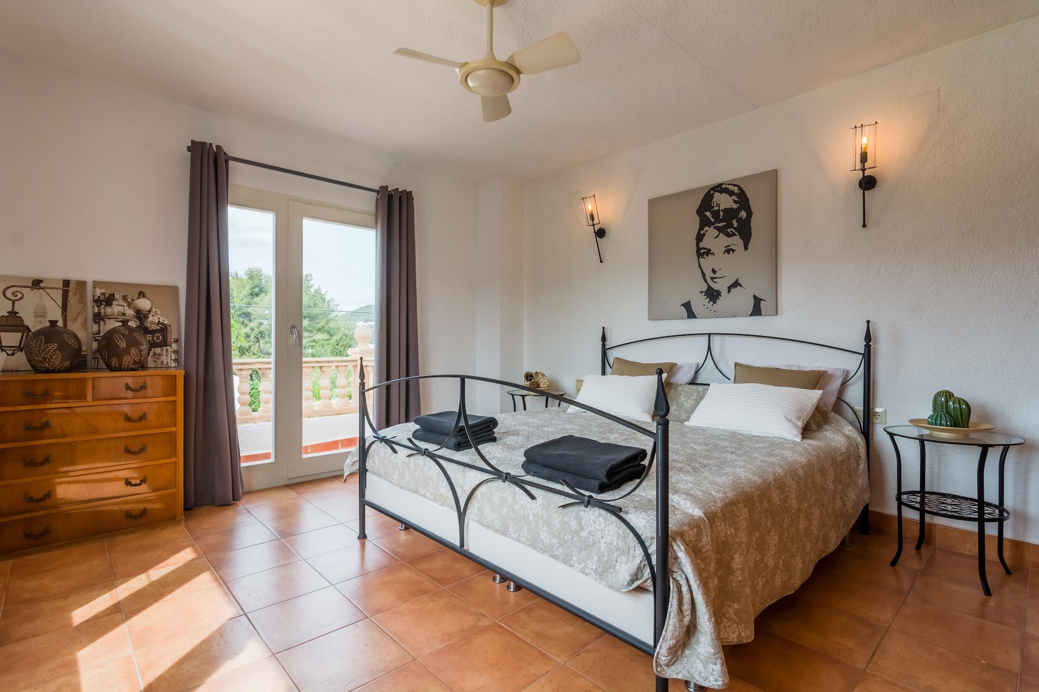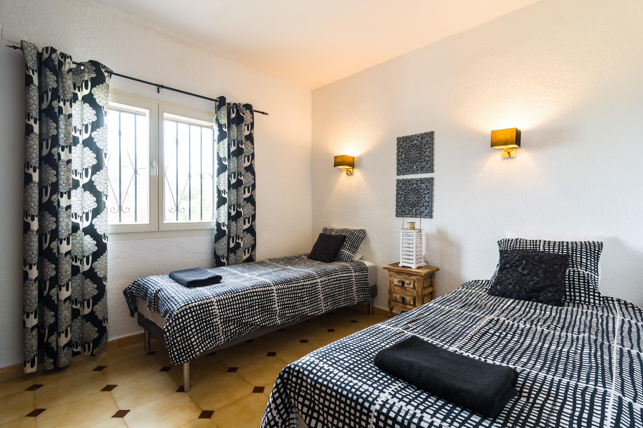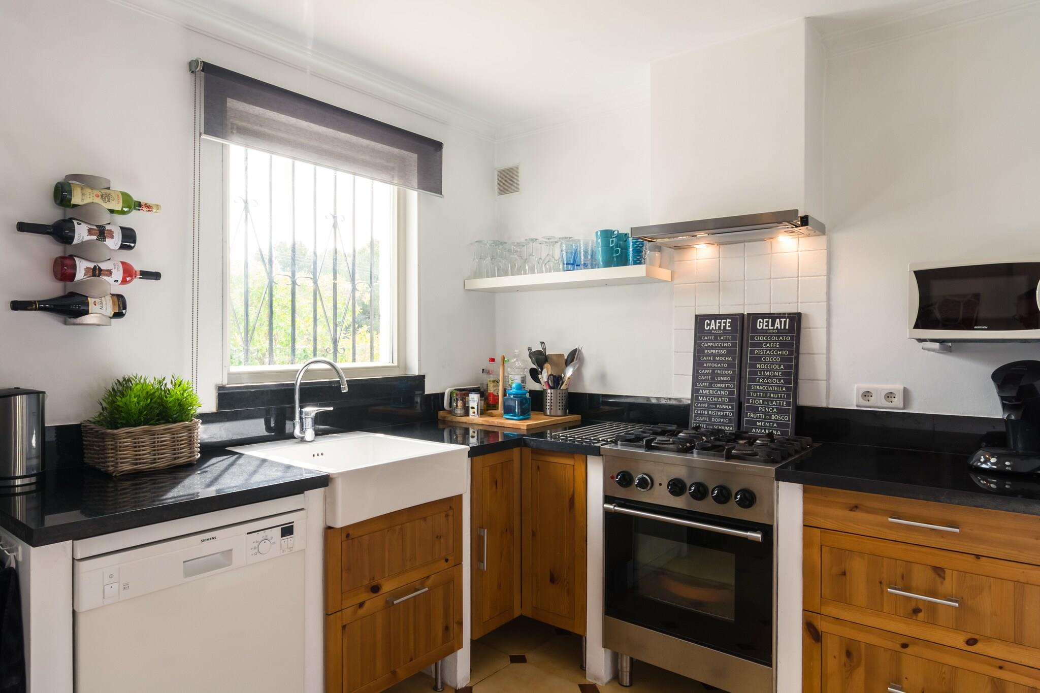 Dejlig villa med privat pool med udendørs bruser og græsplæne, Villa har alle de bekvemmeligheder og flot screenet med nice siddepladser områder i haven. Villaen ligger i et roligt kvarter i gåafstand fra en skovklædt park. Her børnene leger i den smukt anlagte legeplads, mens du nyder skyggen af ??træerne i fred og natur. Gennemført? De kan også svømme i den private pool med udendørs bruser og græsplæne. Hvis du ønsker at solbade du kan vælge mellem to terrasser; en overdækket terrasse med komfortable siddepladser og poolen og en fantastisk side terrasse, hvor du sidder i skyggen af ??figentræet i den hyggelige træ spisebord. Du har en fantastisk udsigt over bjerget Montgó. Baglandet er rigt på gamle slotte og søvnige landsbyer, hvor tiden synes at stå stille. Også bemærkelsesværdig er fyret af Cap de la Nau. Denne fyr tjener den dag i dag som et fyrtårn for både på havet.