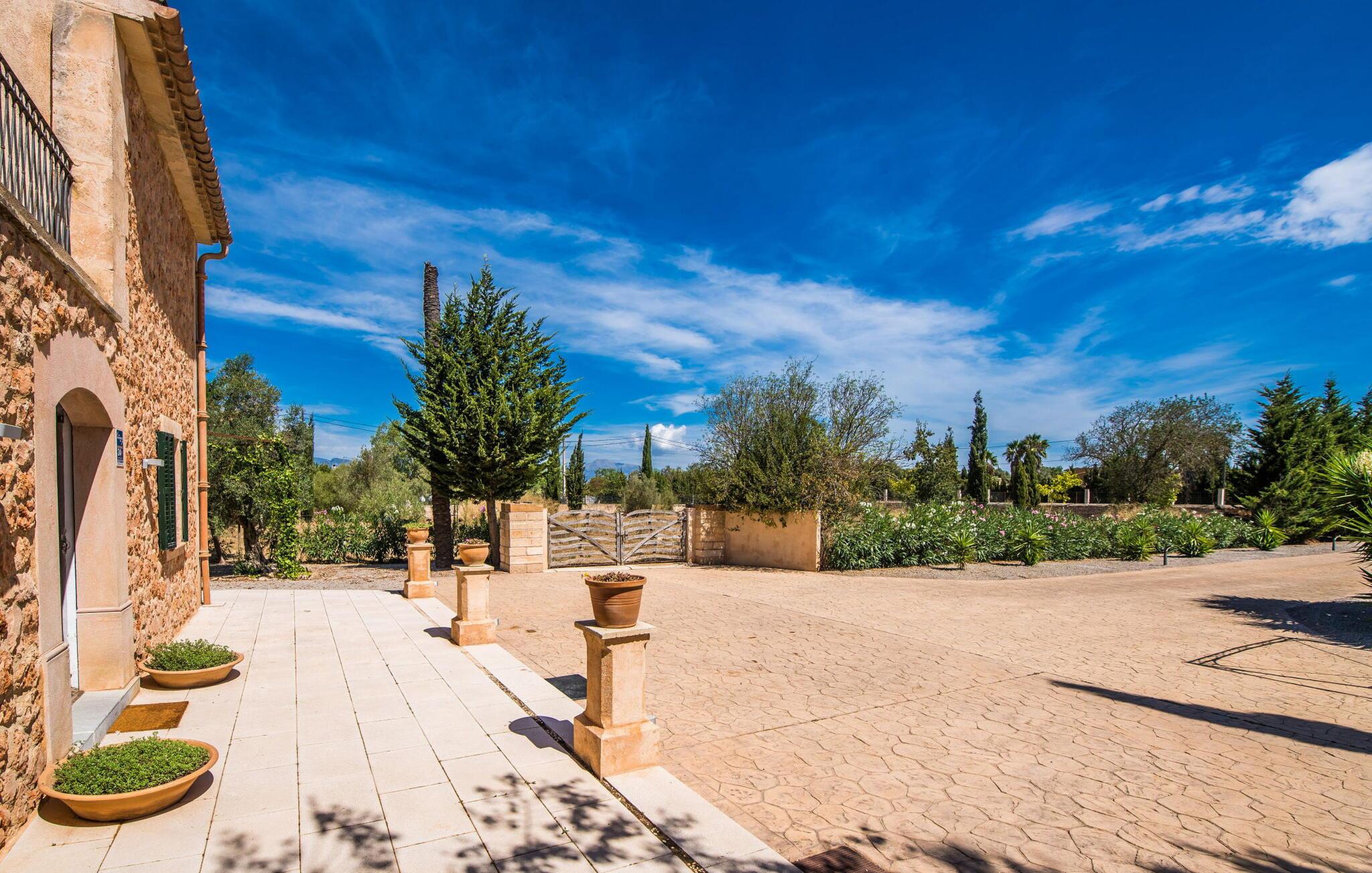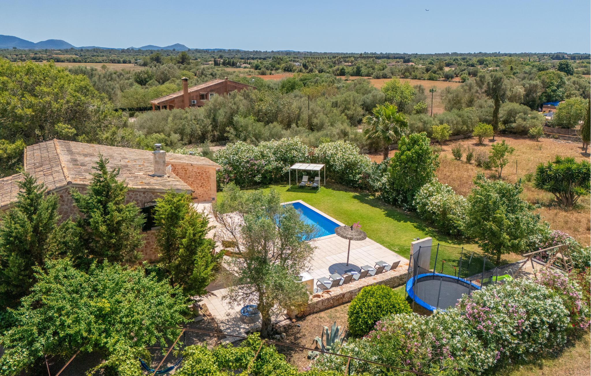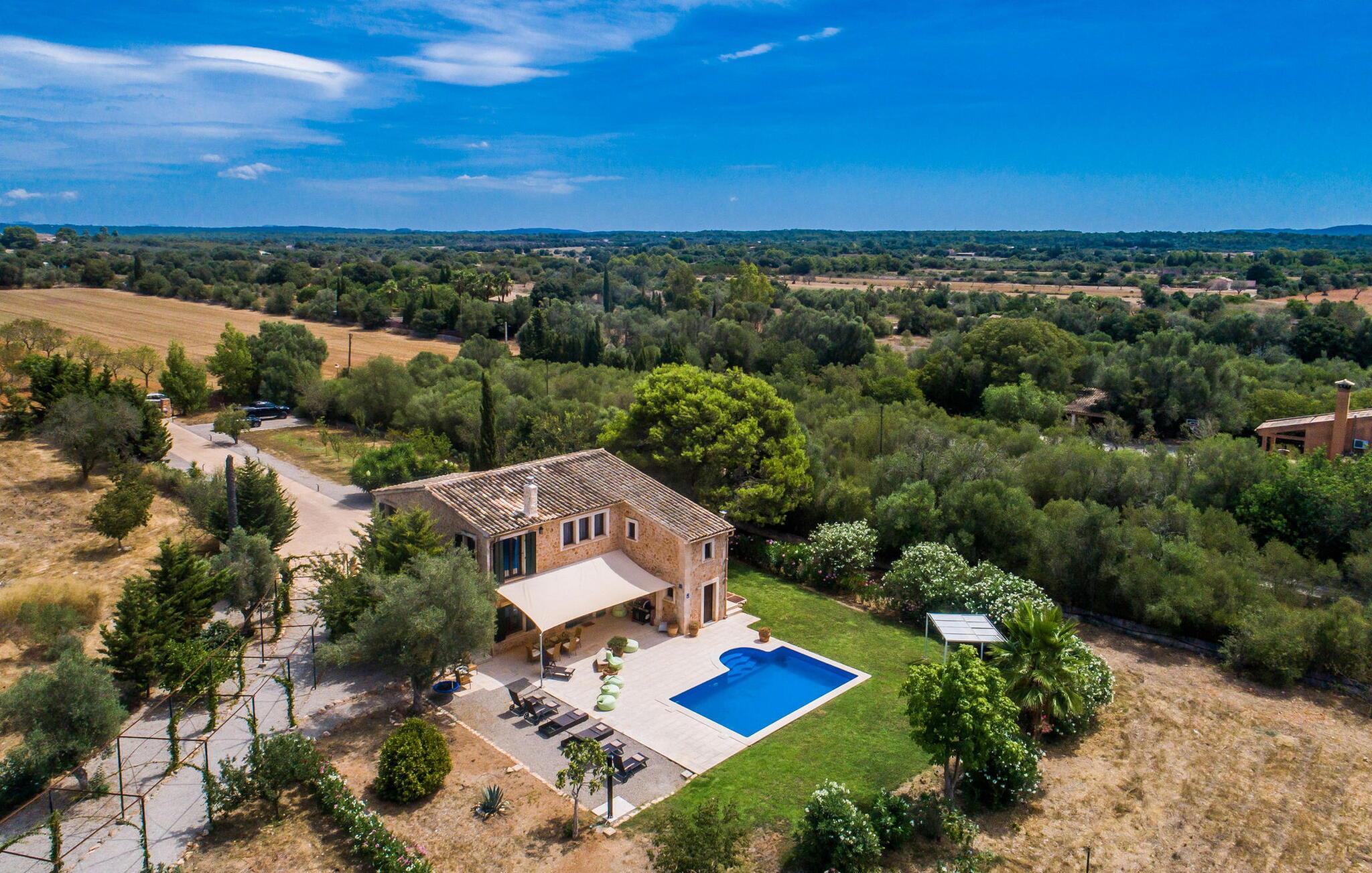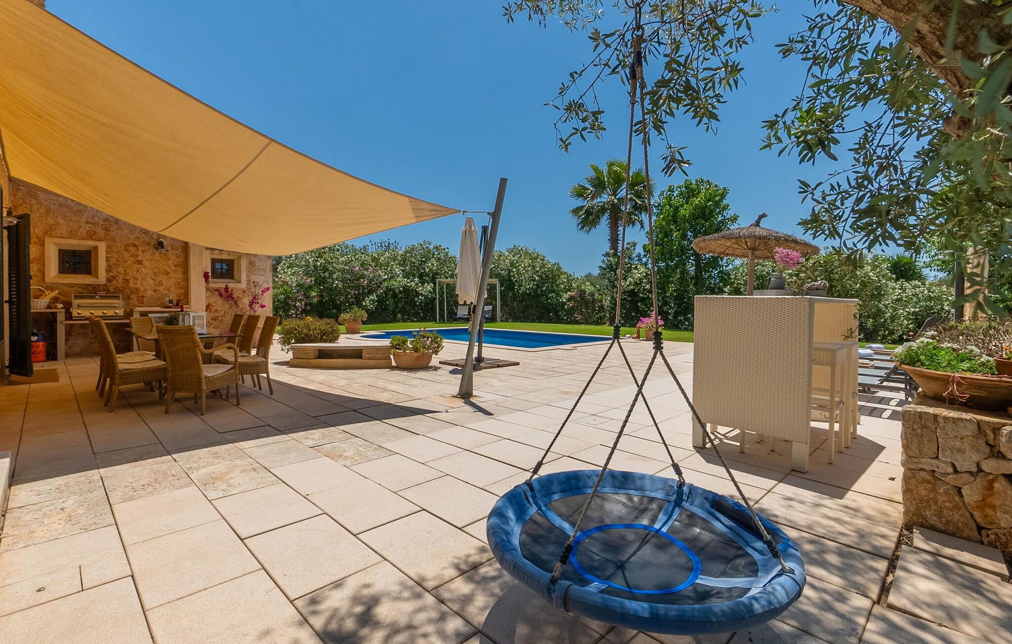 Den inspirerende finca "Kiana" repræsenterer det klassiske Mallorca. Ikke kun fordi den charmerende, fritliggende ejendom ligger i øens stadig landbrugsmæssige centrum. Tværtimod forstår huset, med sin stenbrudsfacade og lyse vinduer, at kombinere mallorcanske traditioner med et moderne udtryk og komfort – både inde og ude. Murstensbassinet med romerske trin, indlejret i en stor græsplæne, er et bevis på dette. Oplyst om aftenen skaber det en vidunderlig atmosfære i haven i middelhavsstil, som ikke mangler noget, inklusive palmer, cypresser, oliven-, figen- og citrontræer. Svømmehallen er indlejret i en stor græsplæne, hvor liggestole kan placeres efter ønske. Med legepladser, gynge og bordtennisbord er dette ekstraordinære feriehus også kendetegnet ved sit børnevenlige design. Udover et sted at sidde i skyggen af træerne, er verandaen ud mod poolen også værd at nævne, som giver plads nok til et måltid sammen (som også kan arrangeres med en grill). Om dagen kan I slappe af i skyggen og om aftenen under beskyttelse af det enorme fortelt, der dækker dette hyggelige område. Interiøret afspejler især den perfekte symbiose af mallorcanske attributter og den nuværende landstedstrend. Varme terracottagulvfliser, solide træbjælker og synlige brudsten fra lang tid siden skaber en indbydende atmosfære, hvor I kan bevæge jer helt naturligt. Med talrige udgange til haven smelter indendørs- og udendørsarealerne sammen til ét - som det er tilfældet i den rustikke pejsestue og køkkenet med åben spiseplads, der er tilbagetrukket et par trin. Det smarte køkken med kogeø tilbyder al den komfort, I kan ønske jer til ukompliceret selvforplejning, især på ferien - alt er der, og I kan føle jer helt hjemme. I den harmoniske Mallorca finca finder I masser af plads både med venner (og børn) og med flere generationer - op til otte personer. I vil helt sikkert finde masser af plads i de fire dobbeltværelser med aircondition (et i stueetagen, de tre andre på øverste etage) med tre badeværelser i moderne design. Hvile og afslapning i en familievenlig atmosfære er mulig hele året rundt i den hyggelige lejefinca "Kiana". Den indbydende stenbrudsfinca "Kiana" med have og pool emmer af behagelig charme. Ejendommen er centralt beliggende midt på øen, og kørestøj fra landevejen er kun hørbar, når der er en vis mængde vind. Der må påregnes flystøj. I kan gøre jeres indkøb i de omkringliggende landsbyer, herunder familielandsbyen Santa Eugènia eller Sencelles. Den smarte ø-hovedstad Palma byder jer velkommen til shopping og kultur. I samme retning er der nogle skønne sandstrande med promenader, bademuligheder og restauranter som Cuidad Jardin.