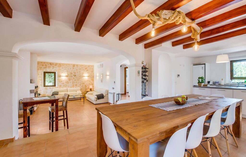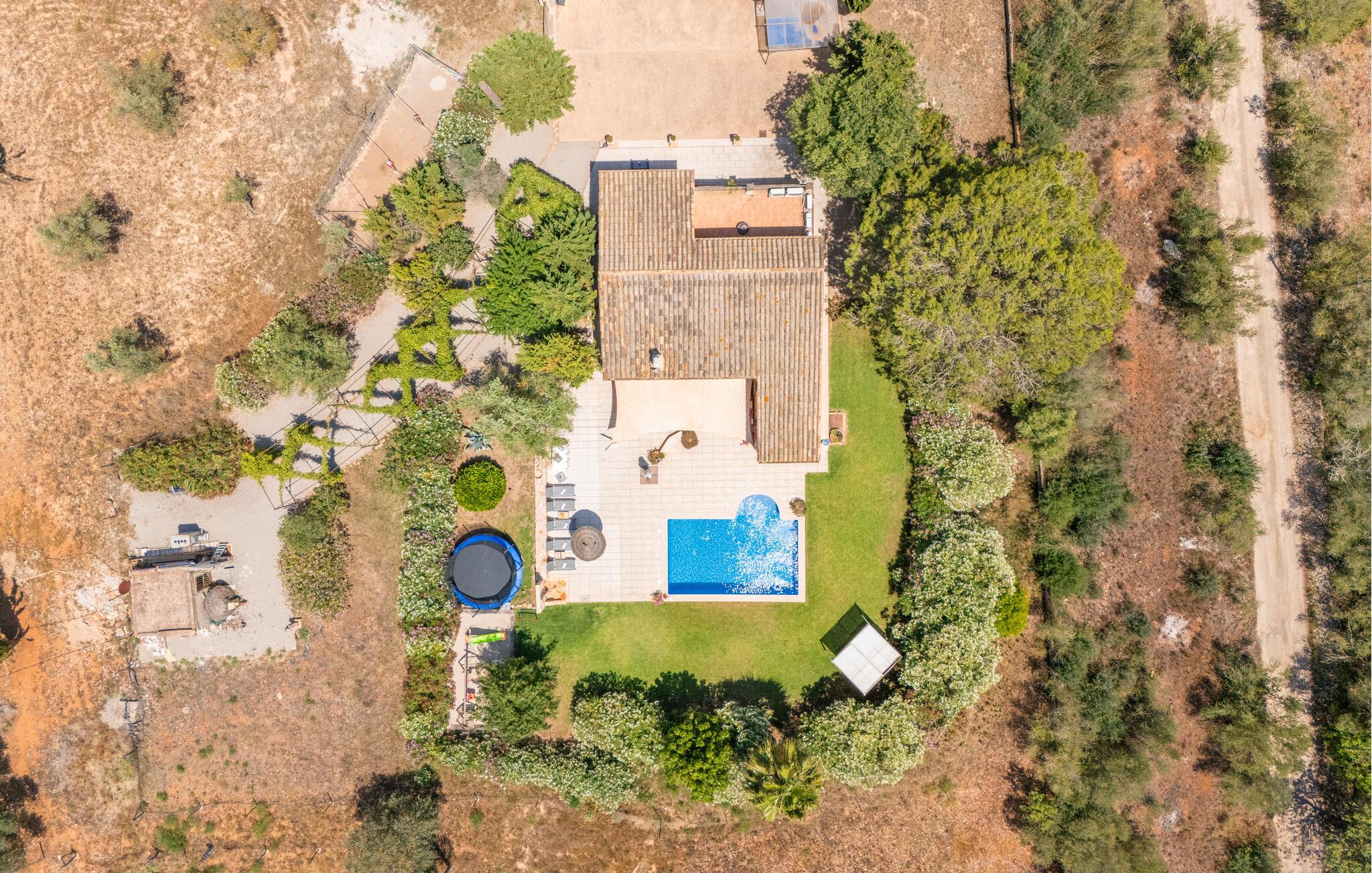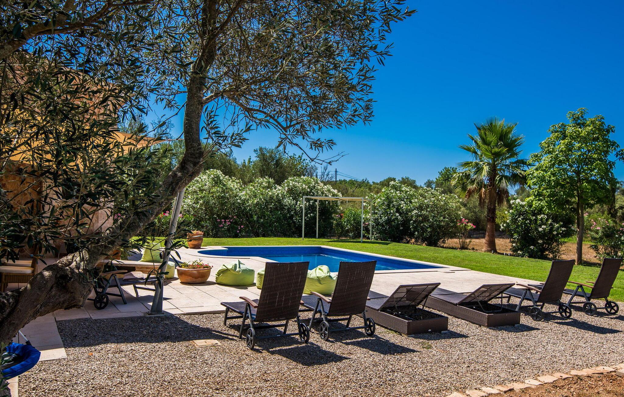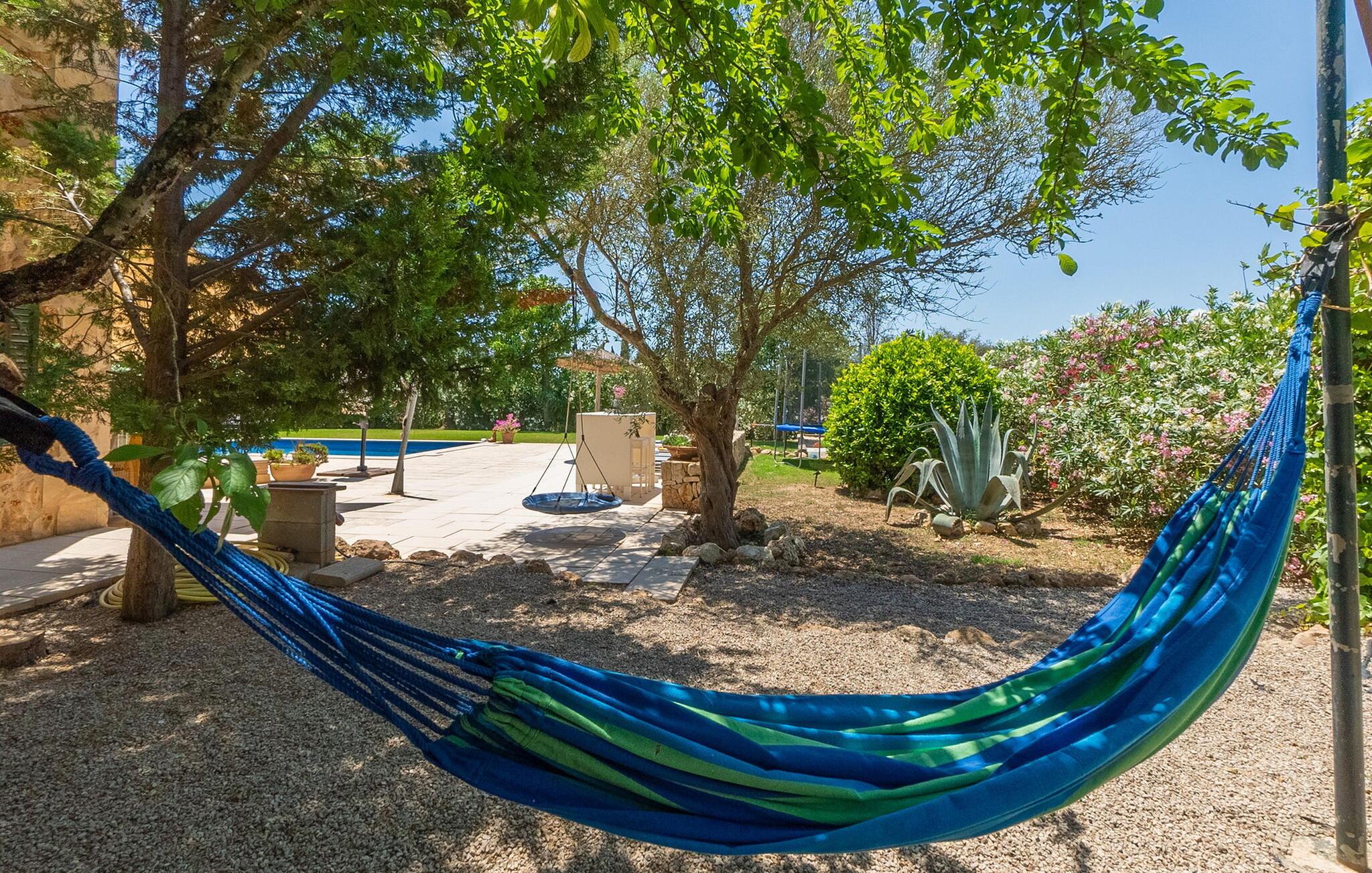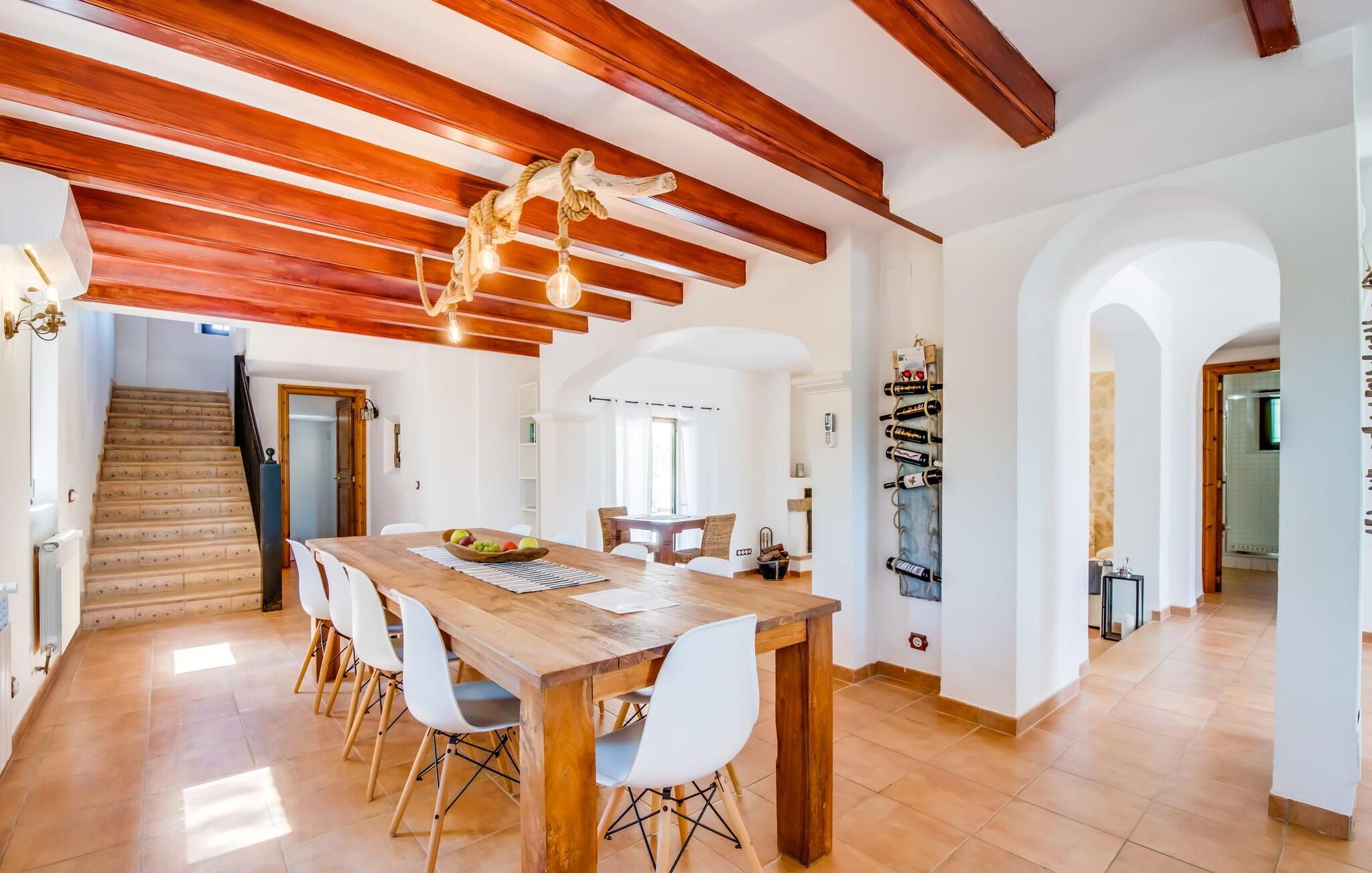Den inspirerende finca "Kiana" repræsenterer det klassiske Mallorca. Ikke kun fordi den charmerende, fritliggende ejendom ligger i øens stadig landbrugsmæssige centrum. Tværtimod forstår huset, med sin stenbrudsfacade og lyse vinduer, at kombinere mallorcanske traditioner med et moderne udtryk og komfort – både inde og ude. Murstensbassinet med romerske trin, indlejret i en stor græsplæne, er et bevis på dette. Oplyst om aftenen skaber det en vidunderlig atmosfære i haven i middelhavsstil, som ikke mangler noget, inklusive palmer, cypresser, oliven-, figen- og citrontræer. Svømmehallen er indlejret i en stor græsplæne, hvor liggestole kan placeres efter ønske. Med legepladser, gynge og bordtennisbord er dette ekstraordinære feriehus også kendetegnet ved sit børnevenlige design. Udover et sted at sidde i skyggen af træerne, er verandaen ud mod poolen også værd at nævne, som giver plads nok til et måltid sammen (som også kan arrangeres med en grill). Om dagen kan I slappe af i skyggen og om aftenen under beskyttelse af det enorme fortelt, der dækker dette hyggelige område. Interiøret afspejler især den perfekte symbiose af mallorcanske attributter og den nuværende landstedstrend. Varme terracottagulvfliser, solide træbjælker og synlige brudsten fra lang tid siden skaber en indbydende atmosfære, hvor I kan bevæge jer helt naturligt. Med talrige udgange til haven smelter indendørs- og udendørsarealerne sammen til ét - som det er tilfældet i den rustikke pejsestue og køkkenet med åben spiseplads, der er tilbagetrukket et par trin. Det smarte køkken med kogeø tilbyder al den komfort, I kan ønske jer til ukompliceret selvforplejning, især på ferien - alt er der, og I kan føle jer helt hjemme. I den harmoniske Mallorca finca finder I masser af plads både med venner (og børn) og med flere generationer - op til otte personer. I vil helt sikkert finde masser af plads i de fire dobbeltværelser med aircondition (et i stueetagen, de tre andre på øverste etage) med tre badeværelser i moderne design. Hvile og afslapning i en familievenlig atmosfære er mulig hele året rundt i den hyggelige lejefinca "Kiana". Den indbydende stenbrudsfinca "Kiana" med have og pool emmer af behagelig charme. Ejendommen er centralt beliggende midt på øen, og kørestøj fra landevejen er kun hørbar, når der er en vis mængde vind. Der må påregnes flystøj. I kan gøre jeres indkøb i de omkringliggende landsbyer, herunder familielandsbyen Santa Eugènia eller Sencelles. Den smarte ø-hovedstad Palma byder jer velkommen til shopping og kultur. I samme retning er der nogle skønne sandstrande med promenader, bademuligheder og restauranter som Cuidad Jardin.