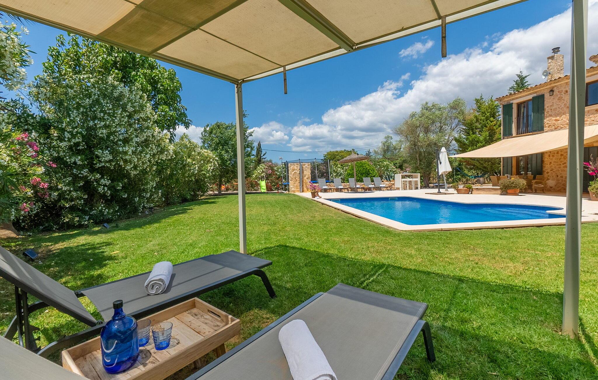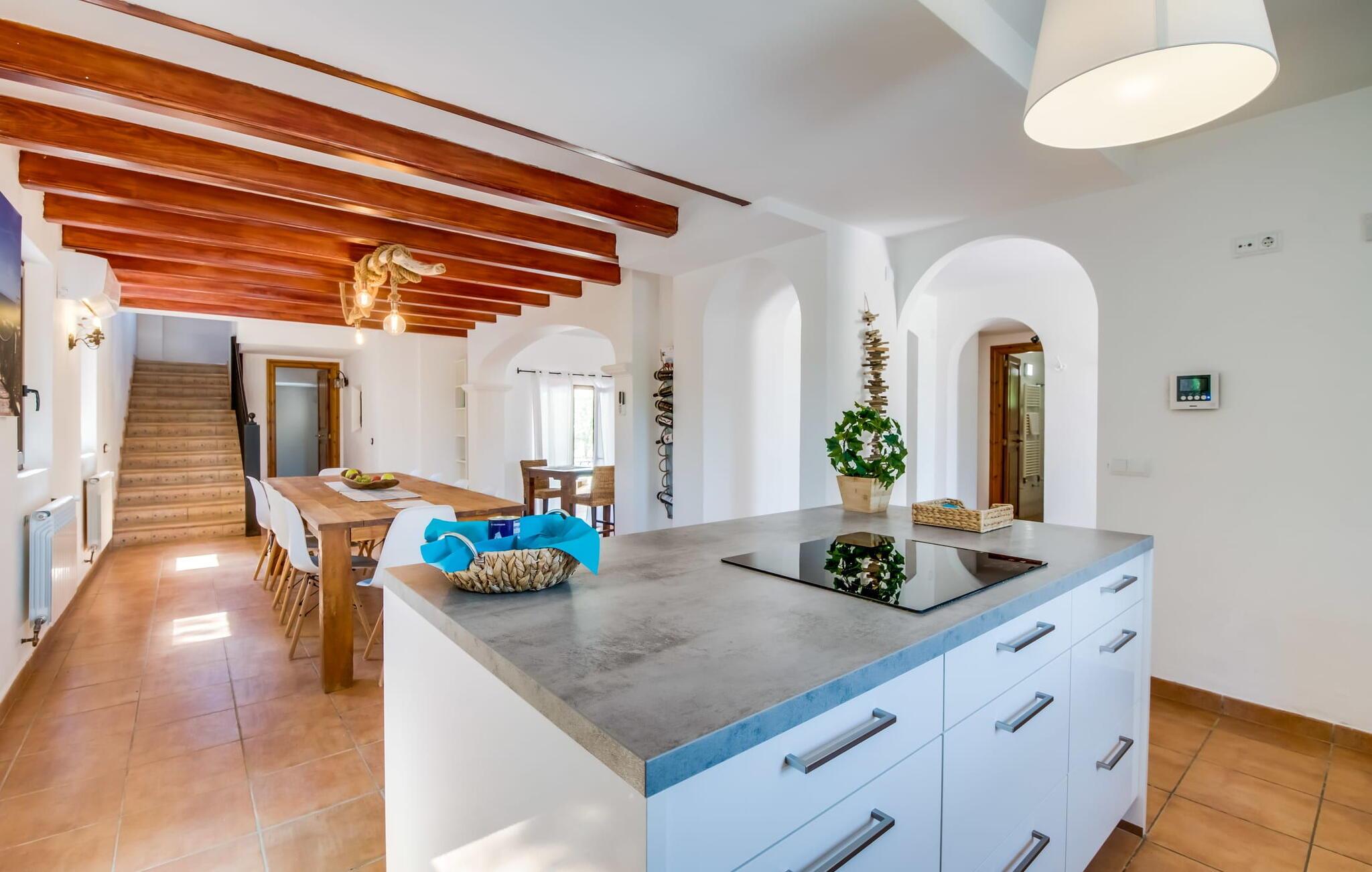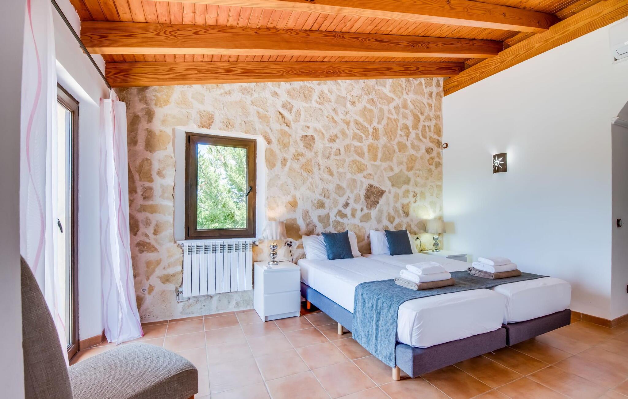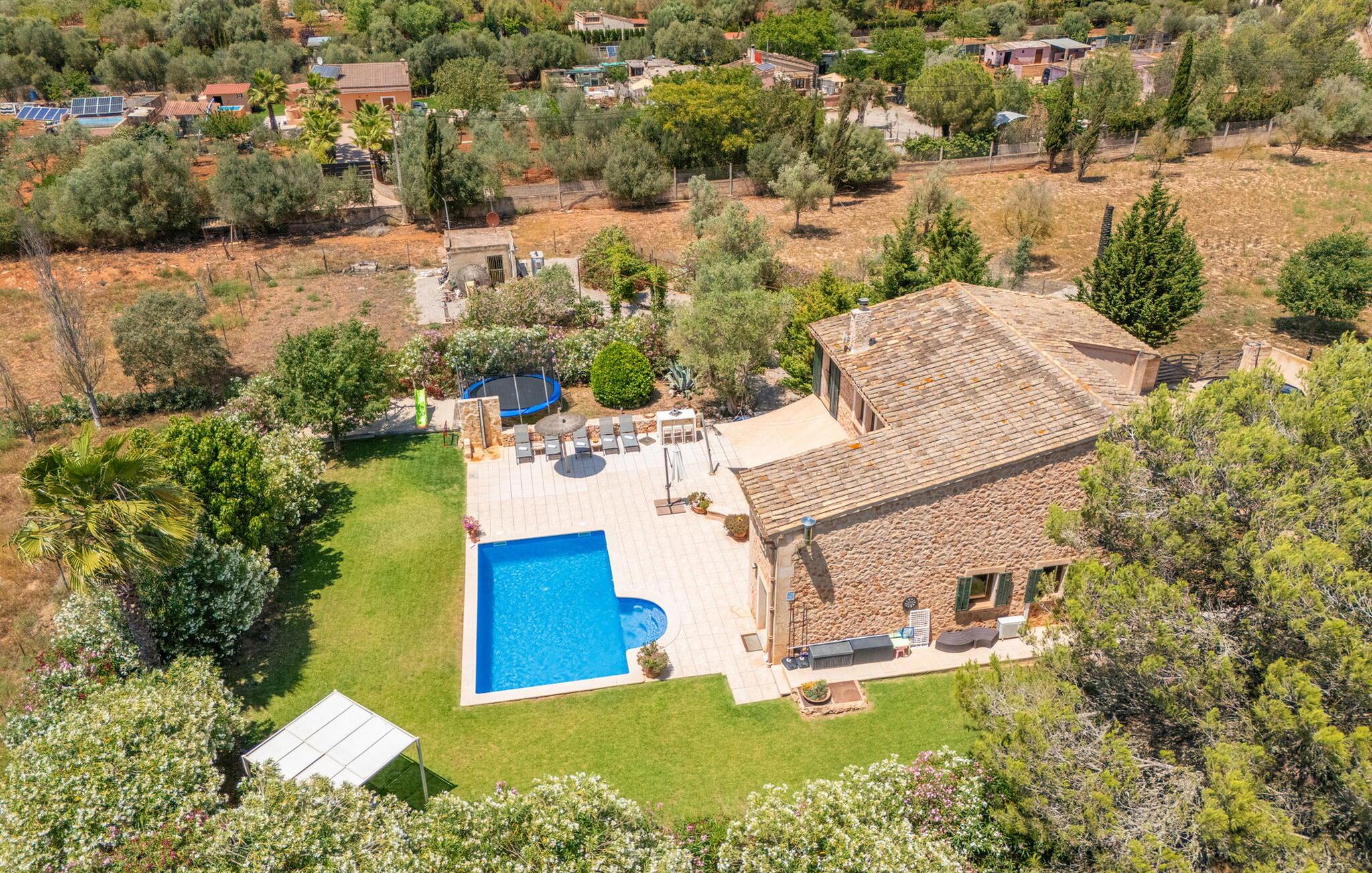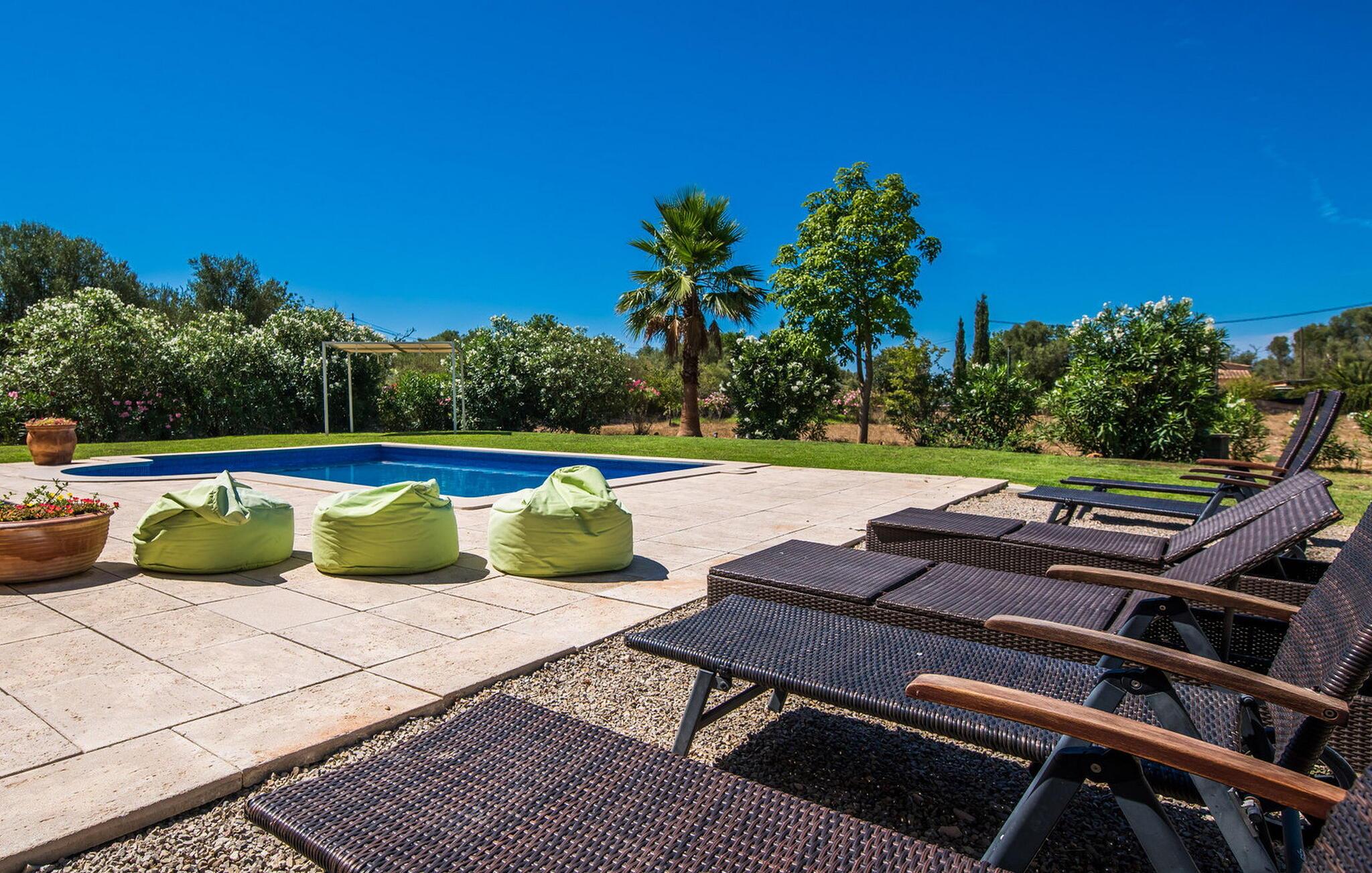 Den inspirerende finca "Kiana" repræsenterer det klassiske Mallorca. Ikke kun fordi den charmerende, fritliggende ejendom ligger i øens stadig landbrugsmæssige centrum. Tværtimod forstår huset, med sin stenbrudsfacade og lyse vinduer, at kombinere mallorcanske traditioner med et moderne udtryk og komfort – både inde og ude. Murstensbassinet med romerske trin, indlejret i en stor græsplæne, er et bevis på dette. Oplyst om aftenen skaber det en vidunderlig atmosfære i haven i middelhavsstil, som ikke mangler noget, inklusive palmer, cypresser, oliven-, figen- og citrontræer. Svømmehallen er indlejret i en stor græsplæne, hvor liggestole kan placeres efter ønske. Med legepladser, gynge og bordtennisbord er dette ekstraordinære feriehus også kendetegnet ved sit børnevenlige design. Udover et sted at sidde i skyggen af træerne, er verandaen ud mod poolen også værd at nævne, som giver plads nok til et måltid sammen (som også kan arrangeres med en grill). Om dagen kan I slappe af i skyggen og om aftenen under beskyttelse af det enorme fortelt, der dækker dette hyggelige område. Interiøret afspejler især den perfekte symbiose af mallorcanske attributter og den nuværende landstedstrend. Varme terracottagulvfliser, solide træbjælker og synlige brudsten fra lang tid siden skaber en indbydende atmosfære, hvor I kan bevæge jer helt naturligt. Med talrige udgange til haven smelter indendørs- og udendørsarealerne sammen til ét - som det er tilfældet i den rustikke pejsestue og køkkenet med åben spiseplads, der er tilbagetrukket et par trin. Det smarte køkken med kogeø tilbyder al den komfort, I kan ønske jer til ukompliceret selvforplejning, især på ferien - alt er der, og I kan føle jer helt hjemme. I den harmoniske Mallorca finca finder I masser af plads både med venner (og børn) og med flere generationer - op til otte personer. I vil helt sikkert finde masser af plads i de fire dobbeltværelser med aircondition (et i stueetagen, de tre andre på øverste etage) med tre badeværelser i moderne design. Hvile og afslapning i en familievenlig atmosfære er mulig hele året rundt i den hyggelige lejefinca "Kiana". Den indbydende stenbrudsfinca "Kiana" med have og pool emmer af behagelig charme. Ejendommen er centralt beliggende midt på øen, og kørestøj fra landevejen er kun hørbar, når der er en vis mængde vind. Der må påregnes flystøj. I kan gøre jeres indkøb i de omkringliggende landsbyer, herunder familielandsbyen Santa Eugènia eller Sencelles. Den smarte ø-hovedstad Palma byder jer velkommen til shopping og kultur. I samme retning er der nogle skønne sandstrande med promenader, bademuligheder og restauranter som Cuidad Jardin.