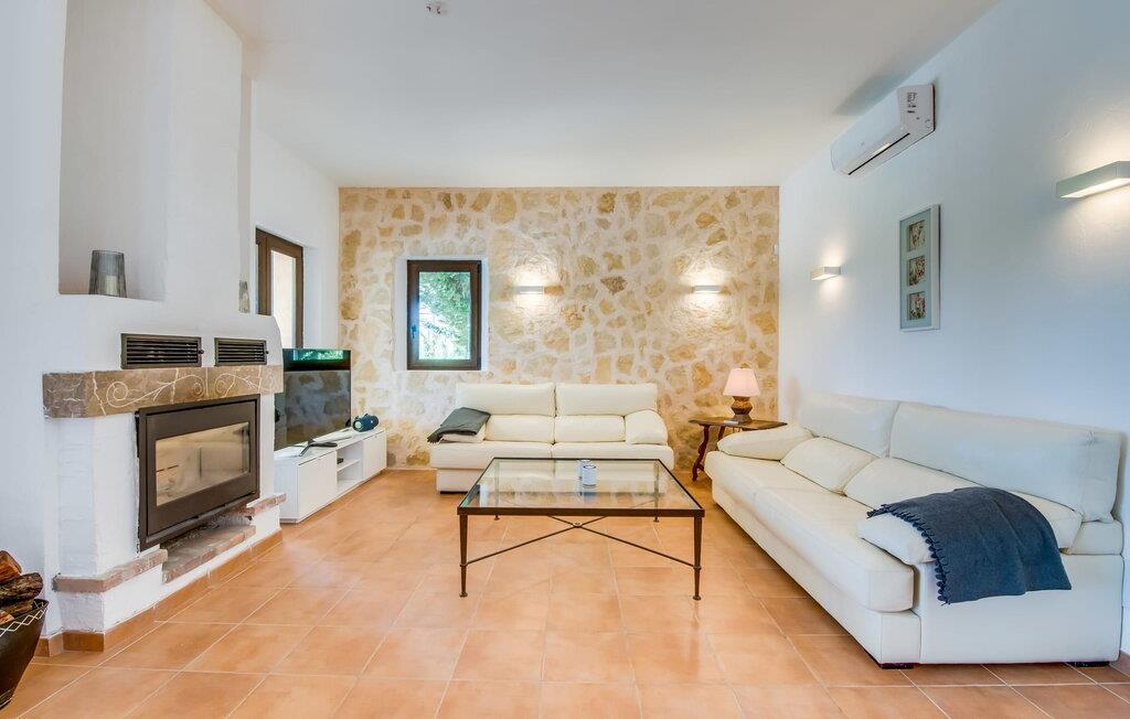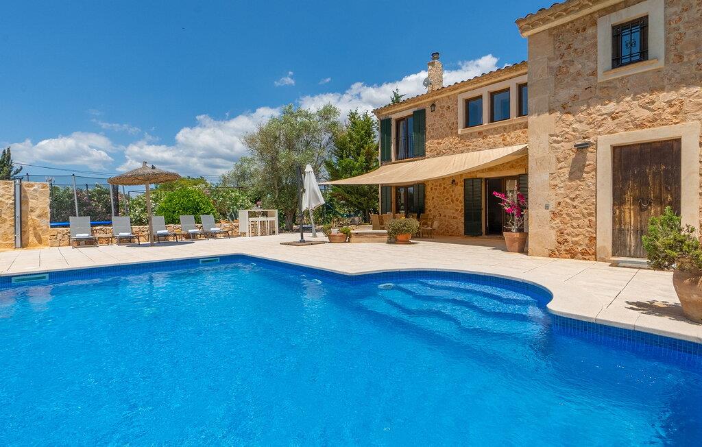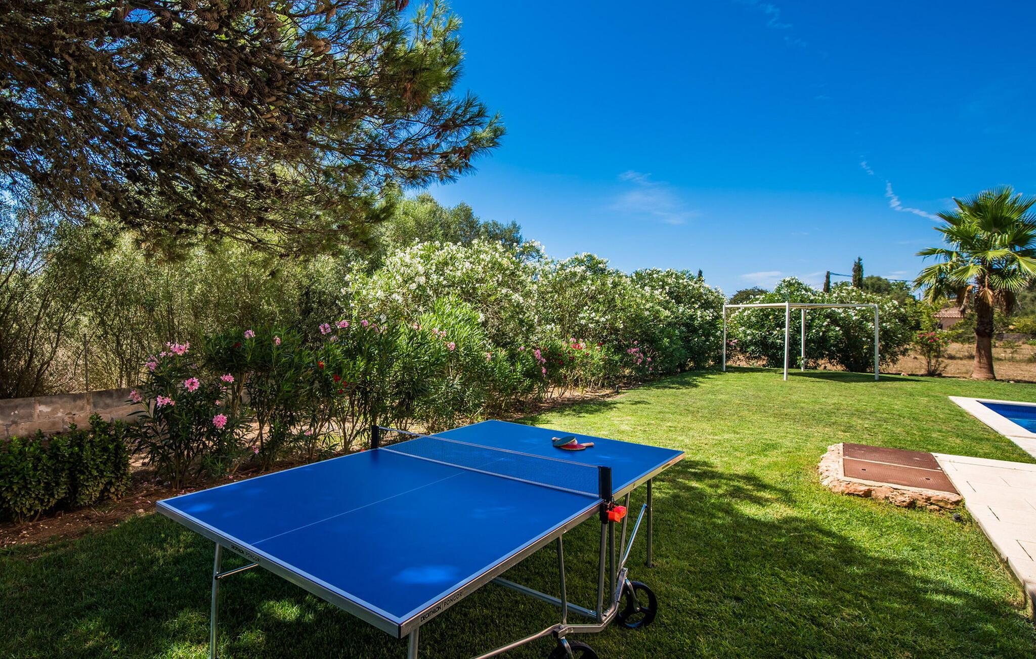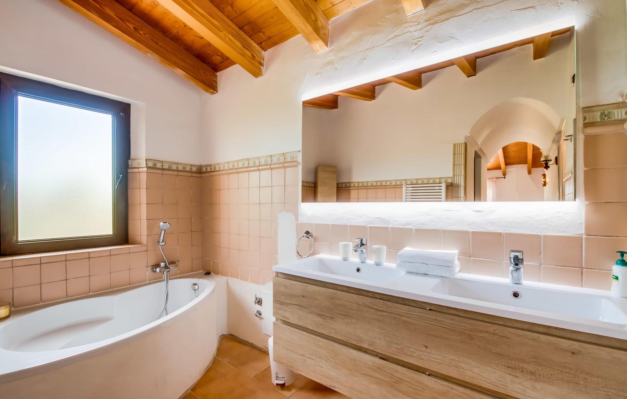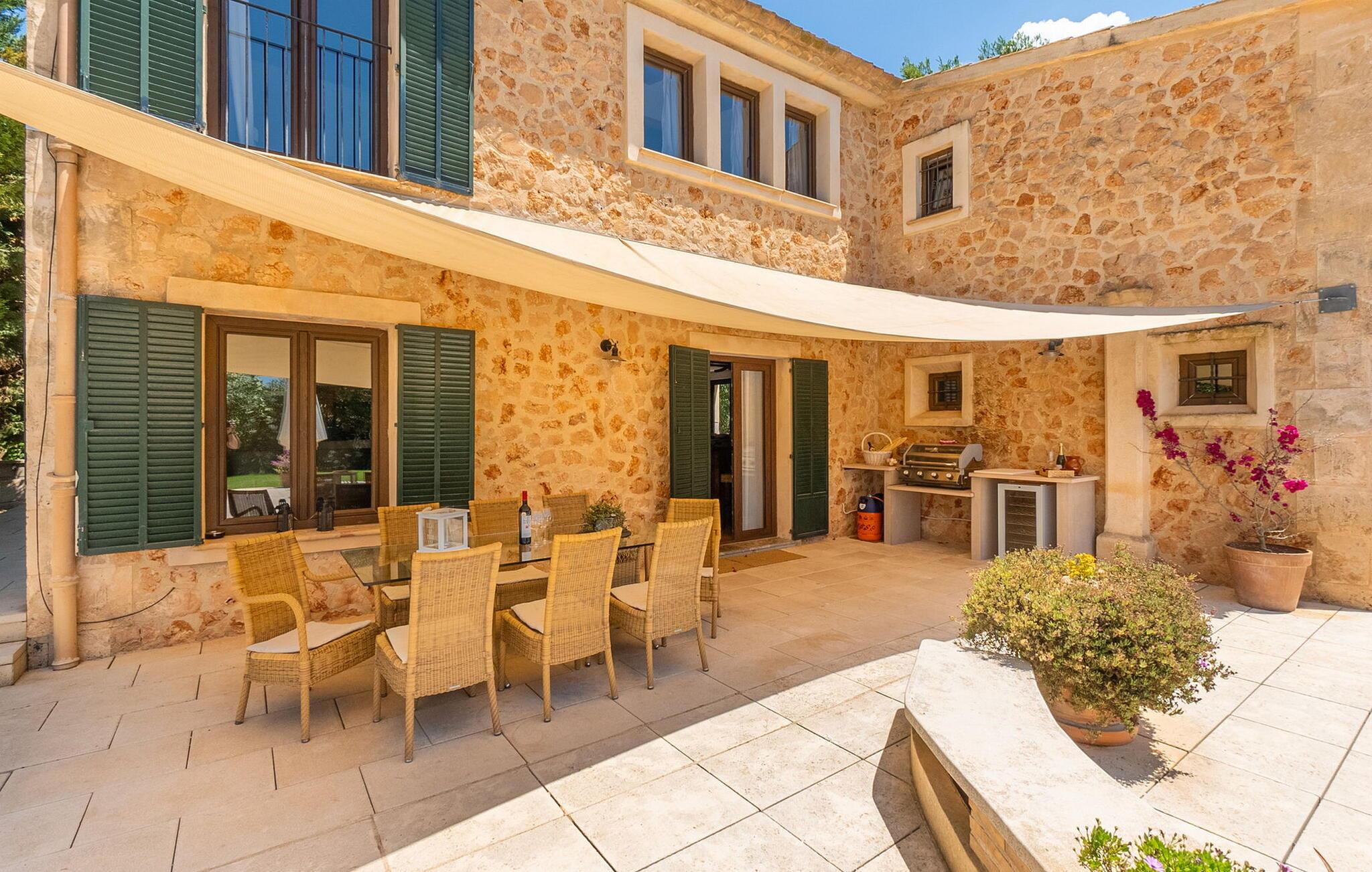 Den inspirerende finca "Kiana" repræsenterer det klassiske Mallorca. Ikke kun fordi den charmerende, fritliggende ejendom ligger i øens stadig landbrugsmæssige centrum. Tværtimod forstår huset, med sin stenbrudsfacade og lyse vinduer, at kombinere mallorcanske traditioner med et moderne udtryk og komfort – både inde og ude. Murstensbassinet med romerske trin, indlejret i en stor græsplæne, er et bevis på dette. Oplyst om aftenen skaber det en vidunderlig atmosfære i haven i middelhavsstil, som ikke mangler noget, inklusive palmer, cypresser, oliven-, figen- og citrontræer. Svømmehallen er indlejret i en stor græsplæne, hvor liggestole kan placeres efter ønske. Med legepladser, gynge og bordtennisbord er dette ekstraordinære feriehus også kendetegnet ved sit børnevenlige design. Udover et sted at sidde i skyggen af træerne, er verandaen ud mod poolen også værd at nævne, som giver plads nok til et måltid sammen (som også kan arrangeres med en grill). Om dagen kan I slappe af i skyggen og om aftenen under beskyttelse af det enorme fortelt, der dækker dette hyggelige område. Interiøret afspejler især den perfekte symbiose af mallorcanske attributter og den nuværende landstedstrend. Varme terracottagulvfliser, solide træbjælker og synlige brudsten fra lang tid siden skaber en indbydende atmosfære, hvor I kan bevæge jer helt naturligt. Med talrige udgange til haven smelter indendørs- og udendørsarealerne sammen til ét - som det er tilfældet i den rustikke pejsestue og køkkenet med åben spiseplads, der er tilbagetrukket et par trin. Det smarte køkken med kogeø tilbyder al den komfort, I kan ønske jer til ukompliceret selvforplejning, især på ferien - alt er der, og I kan føle jer helt hjemme. I den harmoniske Mallorca finca finder I masser af plads både med venner (og børn) og med flere generationer - op til otte personer. I vil helt sikkert finde masser af plads i de fire dobbeltværelser med aircondition (et i stueetagen, de tre andre på øverste etage) med tre badeværelser i moderne design. Hvile og afslapning i en familievenlig atmosfære er mulig hele året rundt i den hyggelige lejefinca "Kiana". Den indbydende stenbrudsfinca "Kiana" med have og pool emmer af behagelig charme. Ejendommen er centralt beliggende midt på øen, og kørestøj fra landevejen er kun hørbar, når der er en vis mængde vind. Der må påregnes flystøj. I kan gøre jeres indkøb i de omkringliggende landsbyer, herunder familielandsbyen Santa Eugènia eller Sencelles. Den smarte ø-hovedstad Palma byder jer velkommen til shopping og kultur. I samme retning er der nogle skønne sandstrande med promenader, bademuligheder og restauranter som Cuidad Jardin.