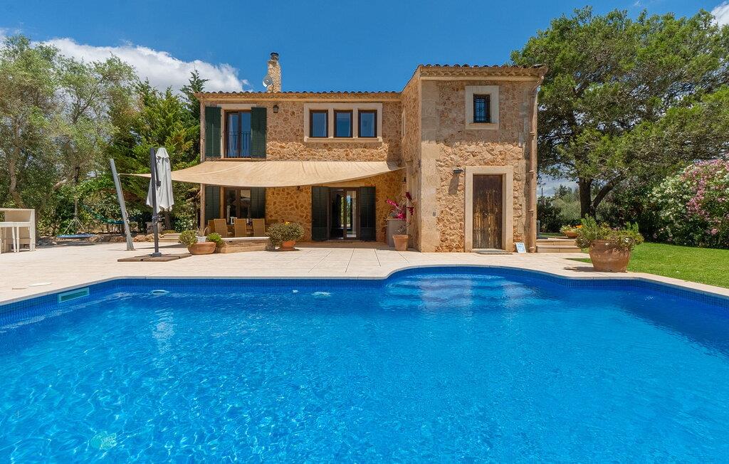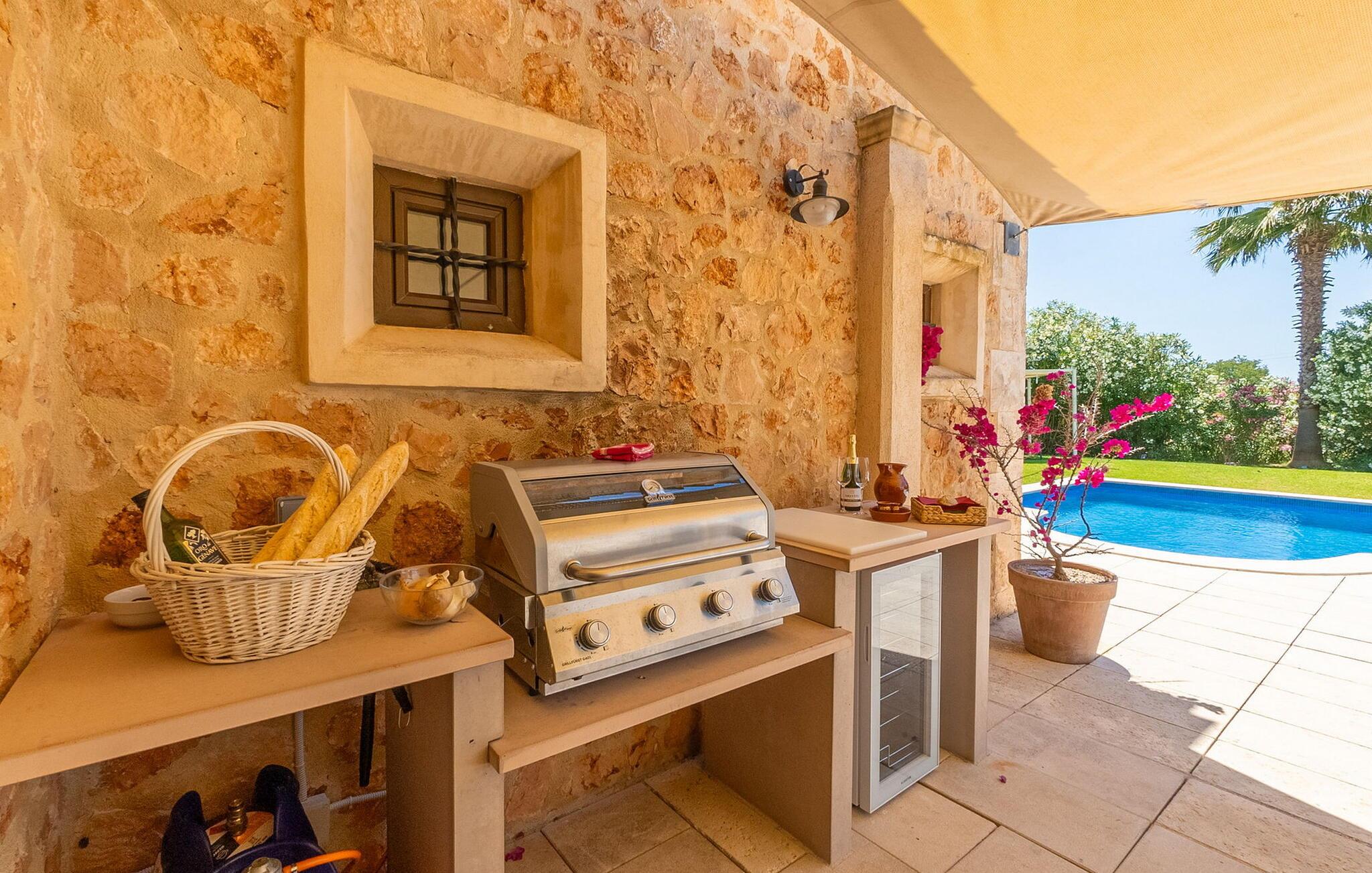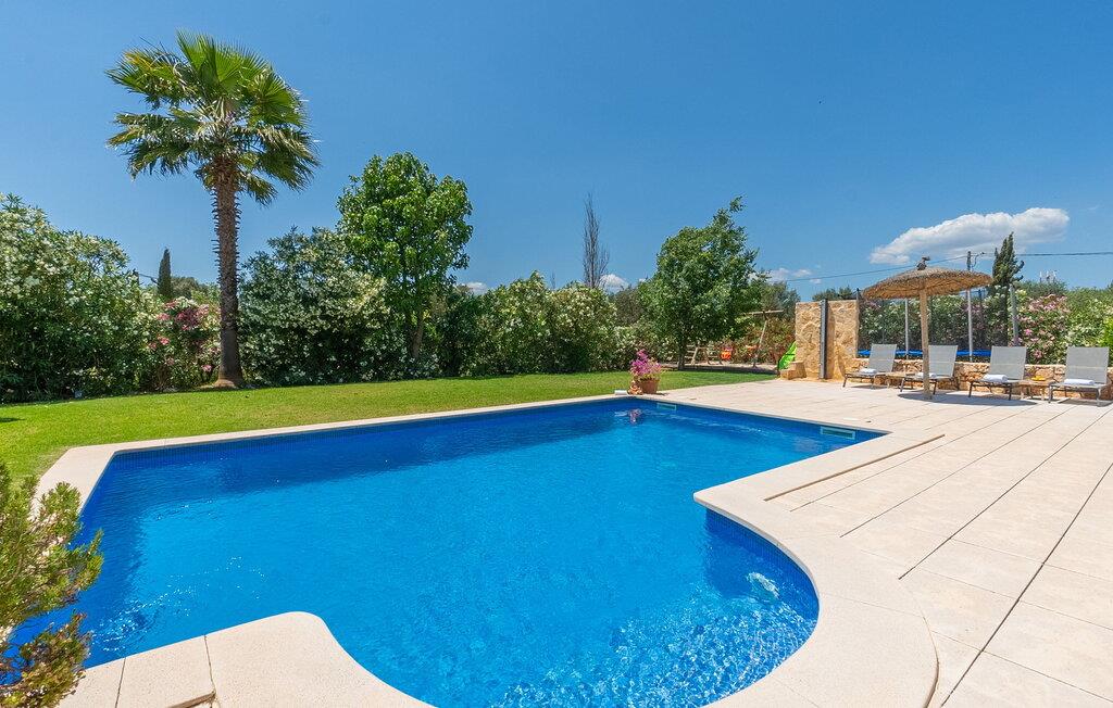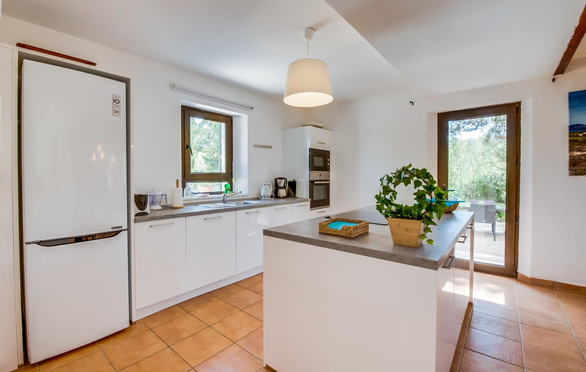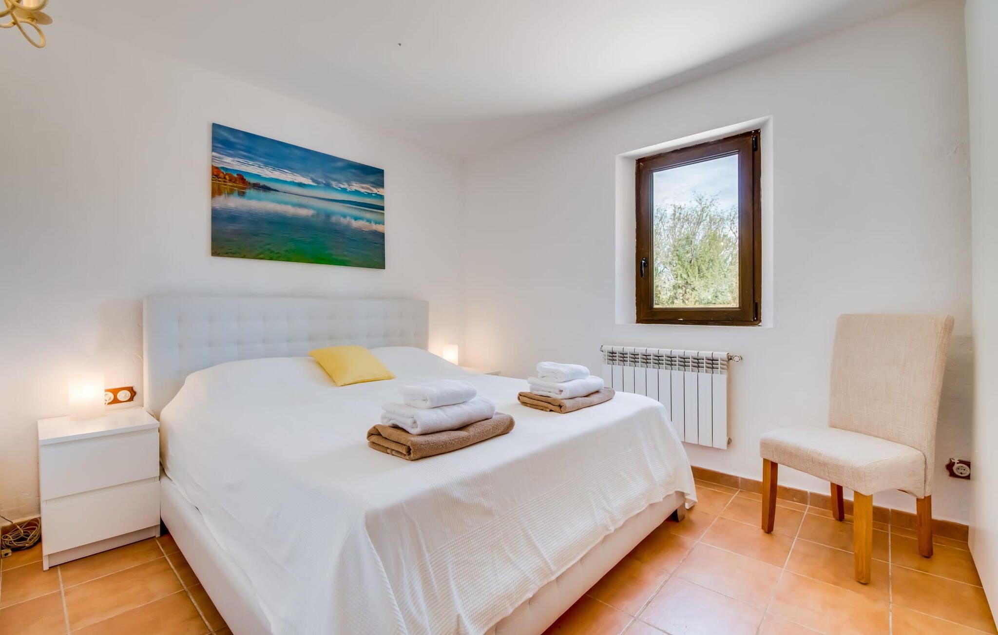 Den inspirerende finca "Kiana" repræsenterer det klassiske Mallorca. Ikke kun fordi den charmerende, fritliggende ejendom ligger i øens stadig landbrugsmæssige centrum. Tværtimod forstår huset, med sin stenbrudsfacade og lyse vinduer, at kombinere mallorcanske traditioner med et moderne udtryk og komfort – både inde og ude. Murstensbassinet med romerske trin, indlejret i en stor græsplæne, er et bevis på dette. Oplyst om aftenen skaber det en vidunderlig atmosfære i haven i middelhavsstil, som ikke mangler noget, inklusive palmer, cypresser, oliven-, figen- og citrontræer. Svømmehallen er indlejret i en stor græsplæne, hvor liggestole kan placeres efter ønske. Med legepladser, gynge og bordtennisbord er dette ekstraordinære feriehus også kendetegnet ved sit børnevenlige design. Udover et sted at sidde i skyggen af træerne, er verandaen ud mod poolen også værd at nævne, som giver plads nok til et måltid sammen (som også kan arrangeres med en grill). Om dagen kan I slappe af i skyggen og om aftenen under beskyttelse af det enorme fortelt, der dækker dette hyggelige område. Interiøret afspejler især den perfekte symbiose af mallorcanske attributter og den nuværende landstedstrend. Varme terracottagulvfliser, solide træbjælker og synlige brudsten fra lang tid siden skaber en indbydende atmosfære, hvor I kan bevæge jer helt naturligt. Med talrige udgange til haven smelter indendørs- og udendørsarealerne sammen til ét - som det er tilfældet i den rustikke pejsestue og køkkenet med åben spiseplads, der er tilbagetrukket et par trin. Det smarte køkken med kogeø tilbyder al den komfort, I kan ønske jer til ukompliceret selvforplejning, især på ferien - alt er der, og I kan føle jer helt hjemme. I den harmoniske Mallorca finca finder I masser af plads både med venner (og børn) og med flere generationer - op til otte personer. I vil helt sikkert finde masser af plads i de fire dobbeltværelser med aircondition (et i stueetagen, de tre andre på øverste etage) med tre badeværelser i moderne design. Hvile og afslapning i en familievenlig atmosfære er mulig hele året rundt i den hyggelige lejefinca "Kiana". Den indbydende stenbrudsfinca "Kiana" med have og pool emmer af behagelig charme. Ejendommen er centralt beliggende midt på øen, og kørestøj fra landevejen er kun hørbar, når der er en vis mængde vind. Der må påregnes flystøj. I kan gøre jeres indkøb i de omkringliggende landsbyer, herunder familielandsbyen Santa Eugènia eller Sencelles. Den smarte ø-hovedstad Palma byder jer velkommen til shopping og kultur. I samme retning er der nogle skønne sandstrande med promenader, bademuligheder og restauranter som Cuidad Jardin.