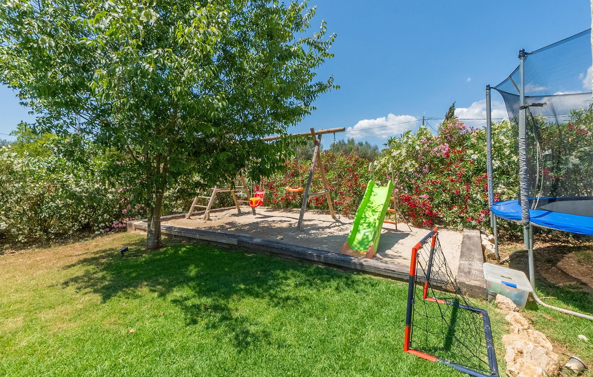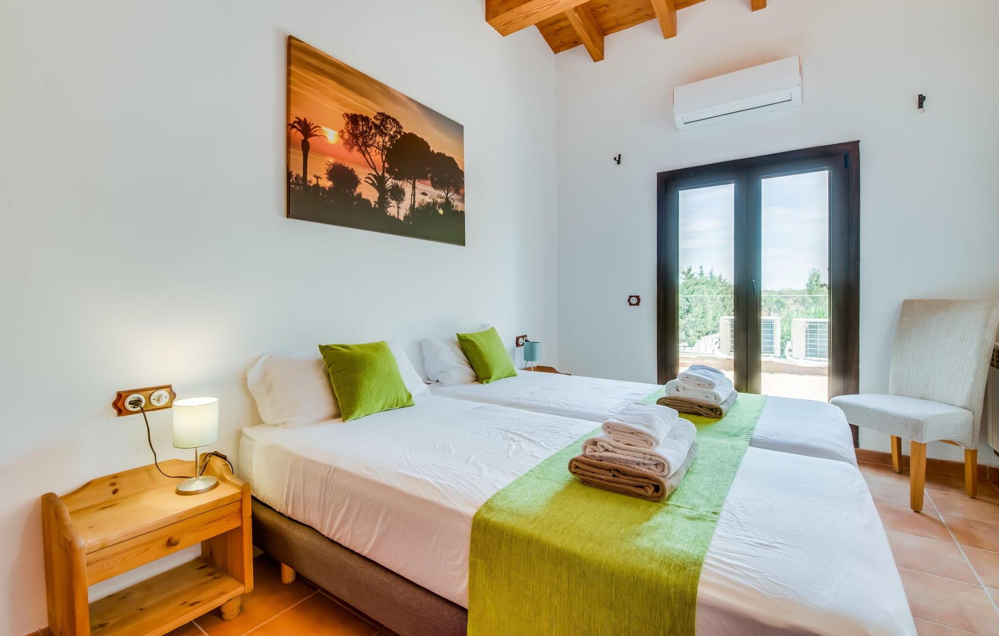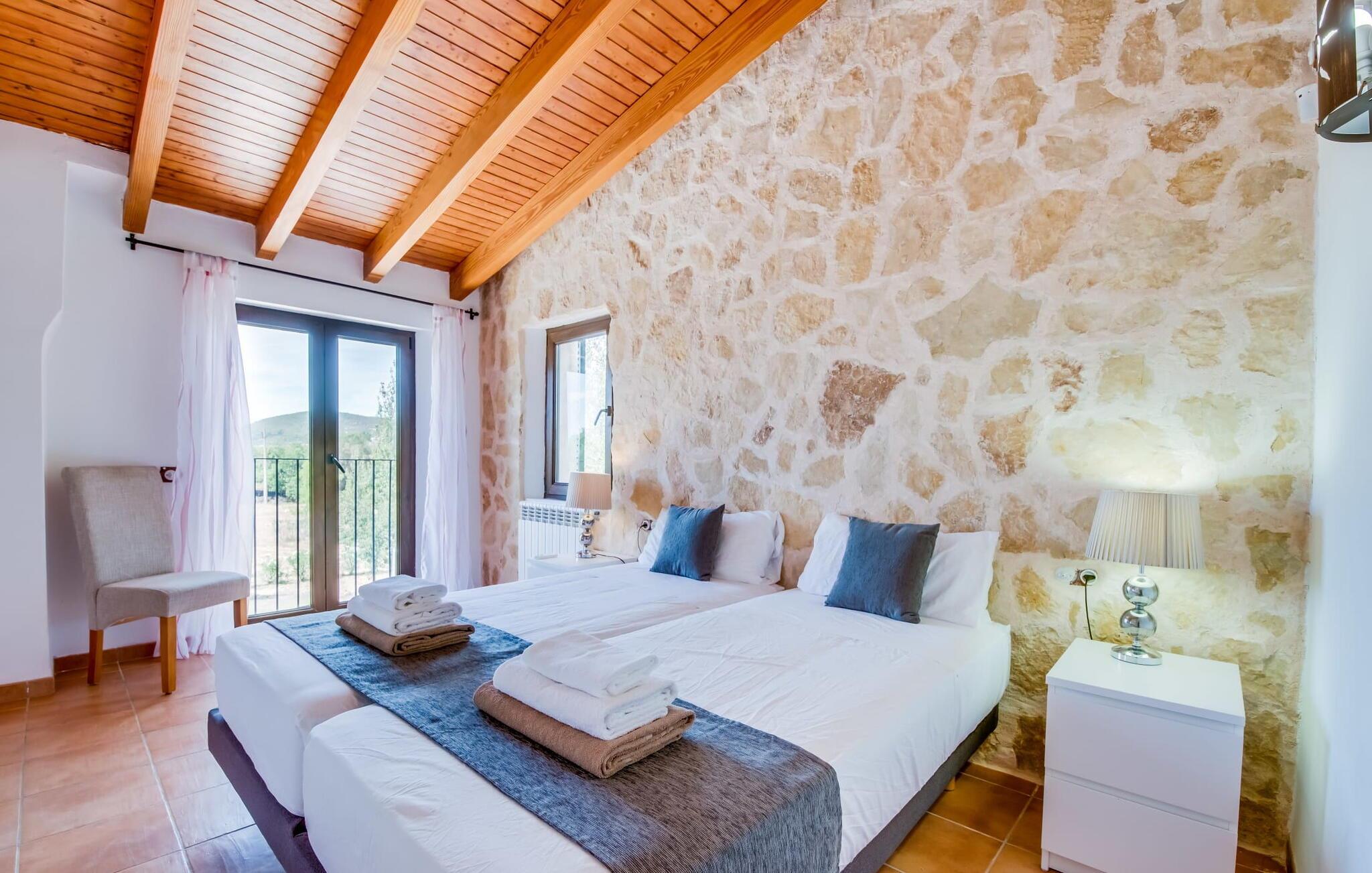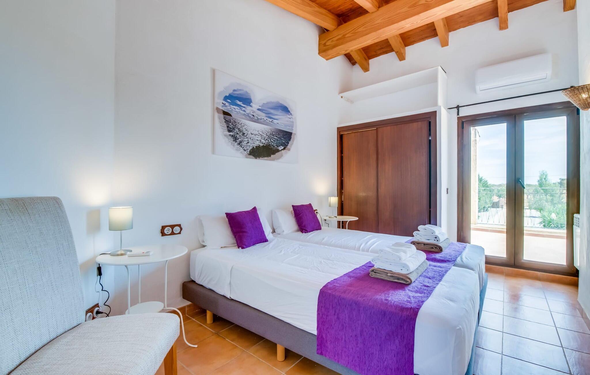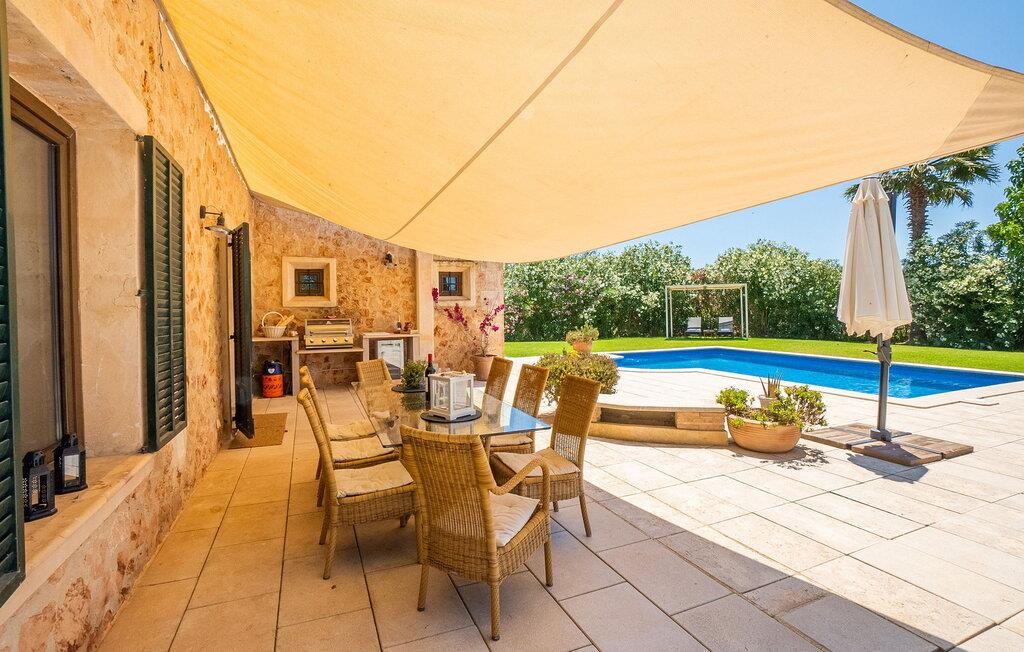 Den inspirerende finca "Kiana" repræsenterer det klassiske Mallorca. Ikke kun fordi den charmerende, fritliggende ejendom ligger i øens stadig landbrugsmæssige centrum. Tværtimod forstår huset, med sin stenbrudsfacade og lyse vinduer, at kombinere mallorcanske traditioner med et moderne udtryk og komfort – både inde og ude. Murstensbassinet med romerske trin, indlejret i en stor græsplæne, er et bevis på dette. Oplyst om aftenen skaber det en vidunderlig atmosfære i haven i middelhavsstil, som ikke mangler noget, inklusive palmer, cypresser, oliven-, figen- og citrontræer. Svømmehallen er indlejret i en stor græsplæne, hvor liggestole kan placeres efter ønske. Med legepladser, gynge og bordtennisbord er dette ekstraordinære feriehus også kendetegnet ved sit børnevenlige design. Udover et sted at sidde i skyggen af træerne, er verandaen ud mod poolen også værd at nævne, som giver plads nok til et måltid sammen (som også kan arrangeres med en grill). Om dagen kan I slappe af i skyggen og om aftenen under beskyttelse af det enorme fortelt, der dækker dette hyggelige område. Interiøret afspejler især den perfekte symbiose af mallorcanske attributter og den nuværende landstedstrend. Varme terracottagulvfliser, solide træbjælker og synlige brudsten fra lang tid siden skaber en indbydende atmosfære, hvor I kan bevæge jer helt naturligt. Med talrige udgange til haven smelter indendørs- og udendørsarealerne sammen til ét - som det er tilfældet i den rustikke pejsestue og køkkenet med åben spiseplads, der er tilbagetrukket et par trin. Det smarte køkken med kogeø tilbyder al den komfort, I kan ønske jer til ukompliceret selvforplejning, især på ferien - alt er der, og I kan føle jer helt hjemme. I den harmoniske Mallorca finca finder I masser af plads både med venner (og børn) og med flere generationer - op til otte personer. I vil helt sikkert finde masser af plads i de fire dobbeltværelser med aircondition (et i stueetagen, de tre andre på øverste etage) med tre badeværelser i moderne design. Hvile og afslapning i en familievenlig atmosfære er mulig hele året rundt i den hyggelige lejefinca "Kiana". Den indbydende stenbrudsfinca "Kiana" med have og pool emmer af behagelig charme. Ejendommen er centralt beliggende midt på øen, og kørestøj fra landevejen er kun hørbar, når der er en vis mængde vind. Der må påregnes flystøj. I kan gøre jeres indkøb i de omkringliggende landsbyer, herunder familielandsbyen Santa Eugènia eller Sencelles. Den smarte ø-hovedstad Palma byder jer velkommen til shopping og kultur. I samme retning er der nogle skønne sandstrande med promenader, bademuligheder og restauranter som Cuidad Jardin.