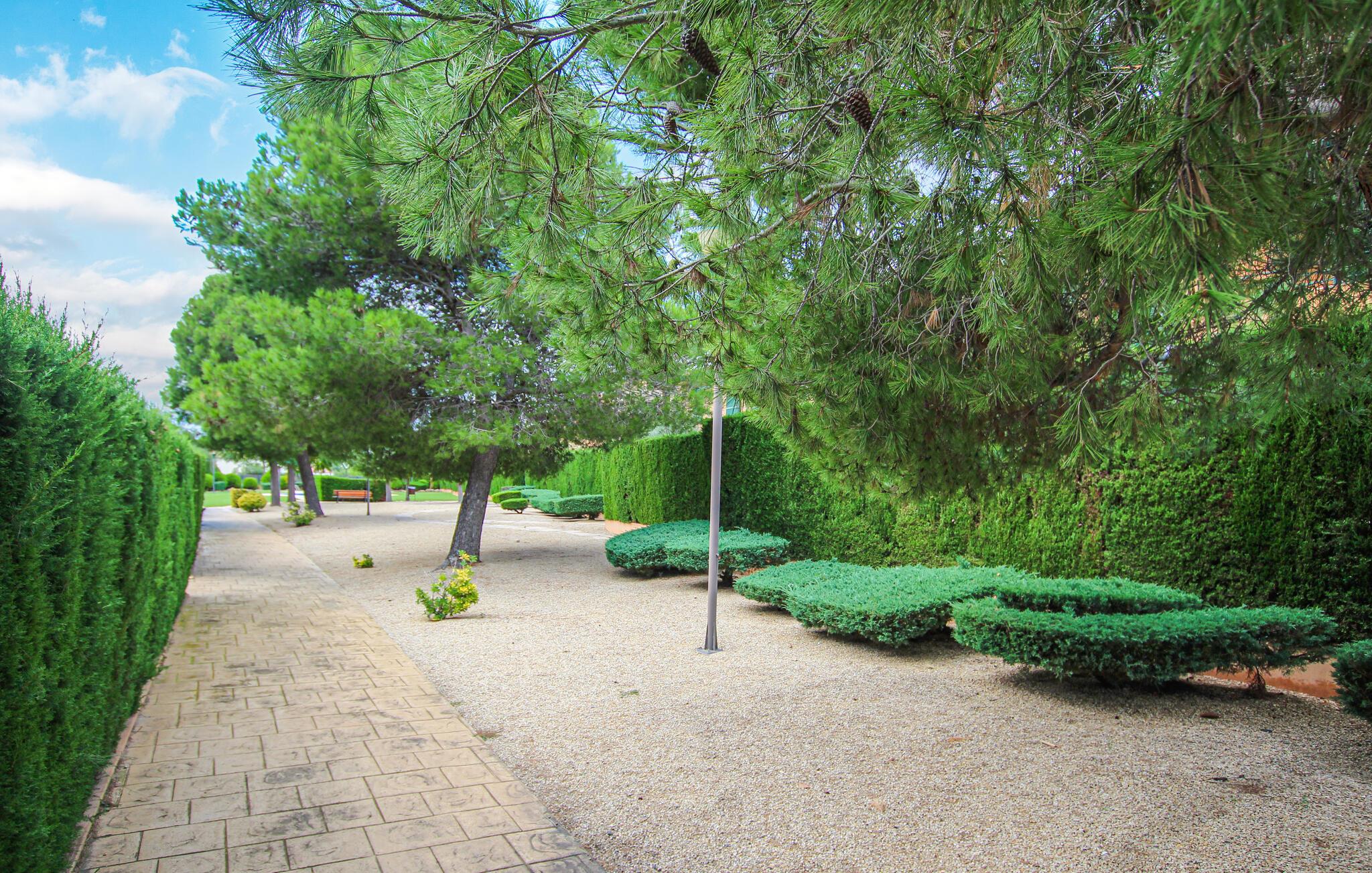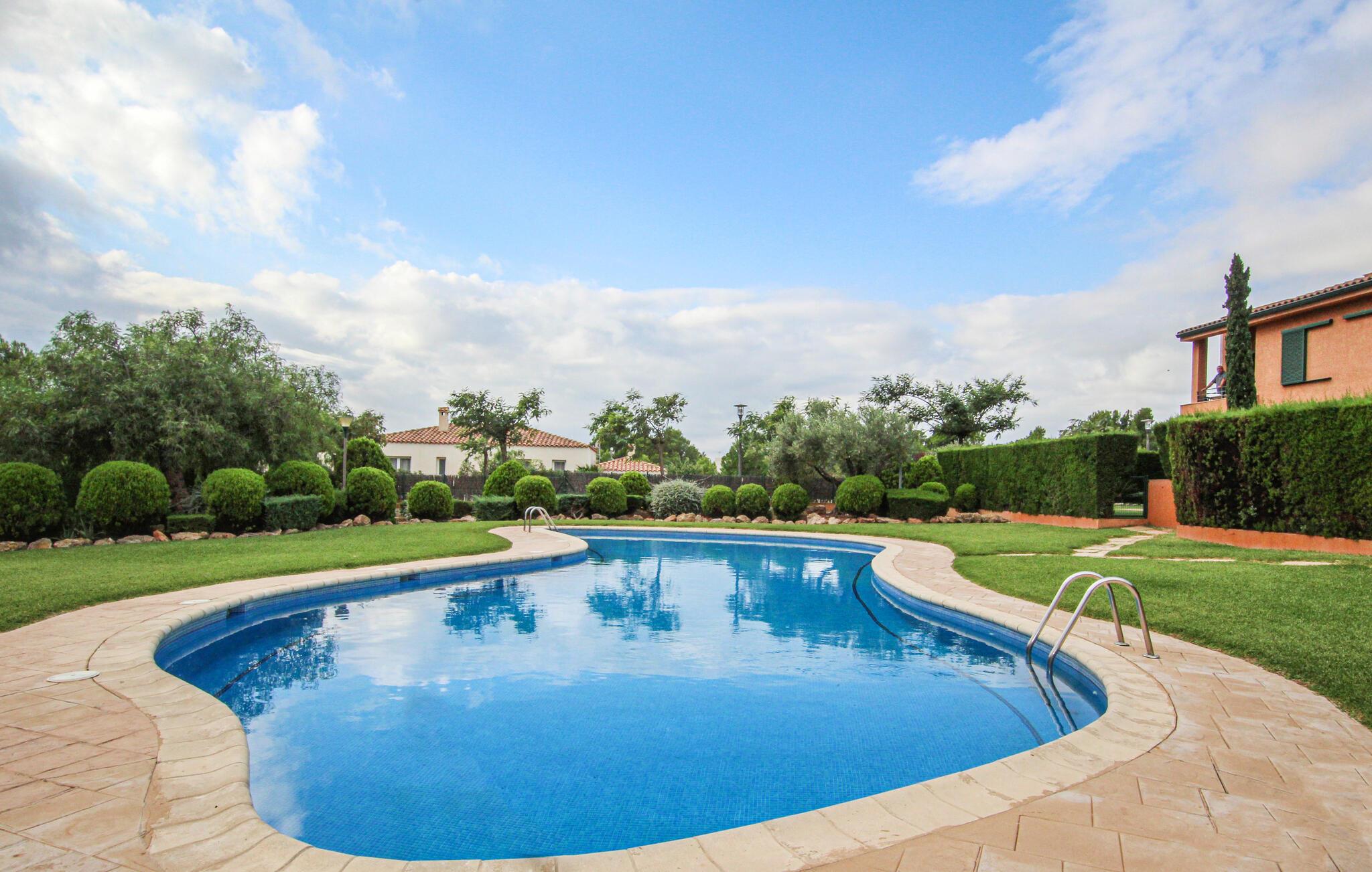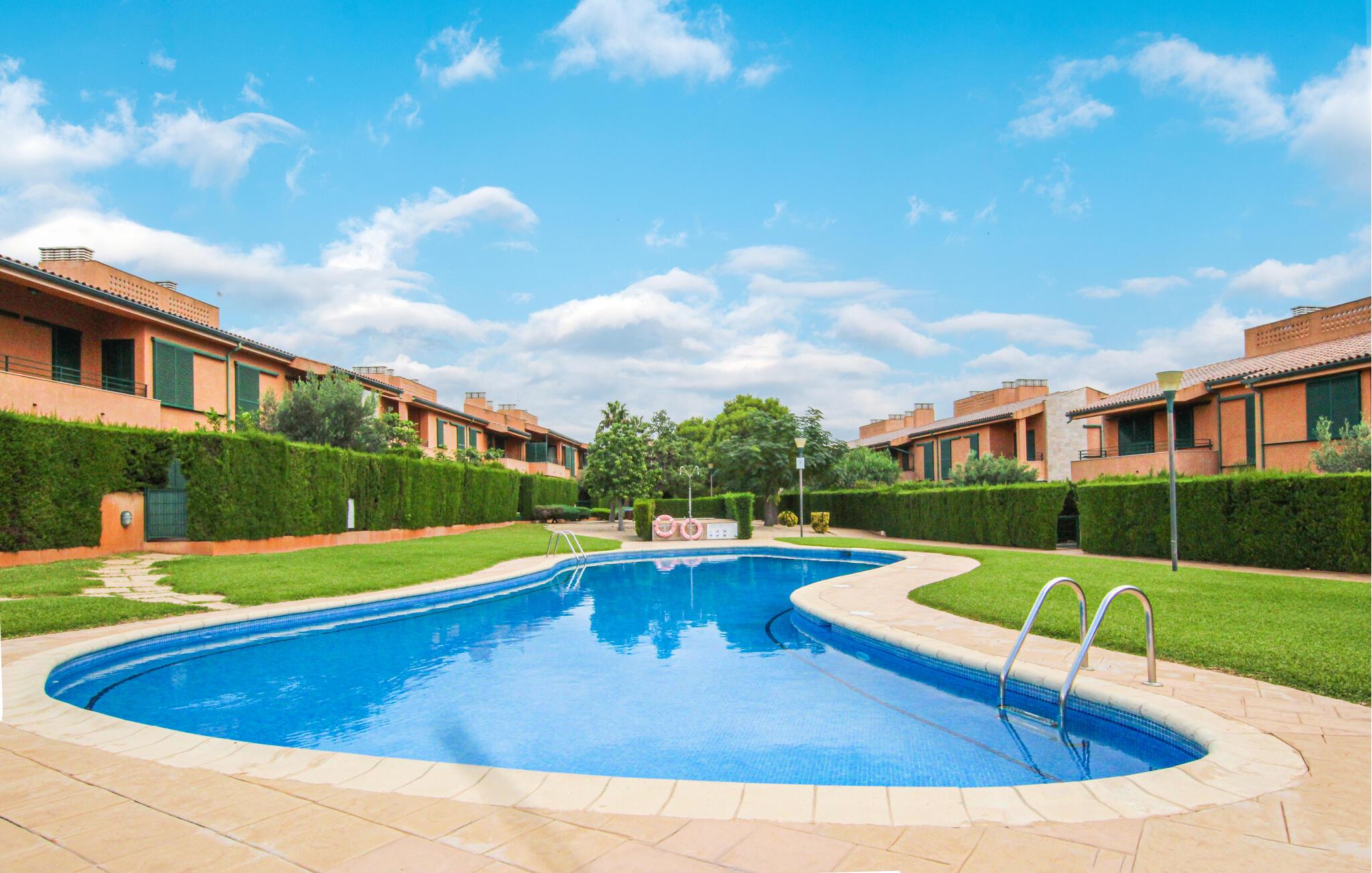 Slap af i en lys ferielejlighed med swimmingpool nær stranden.
